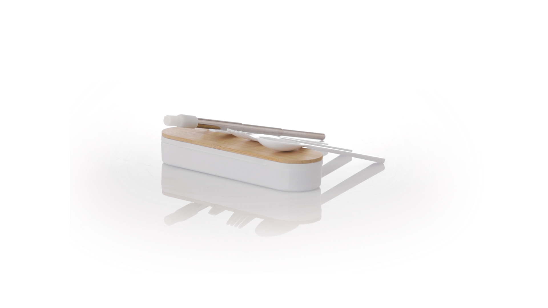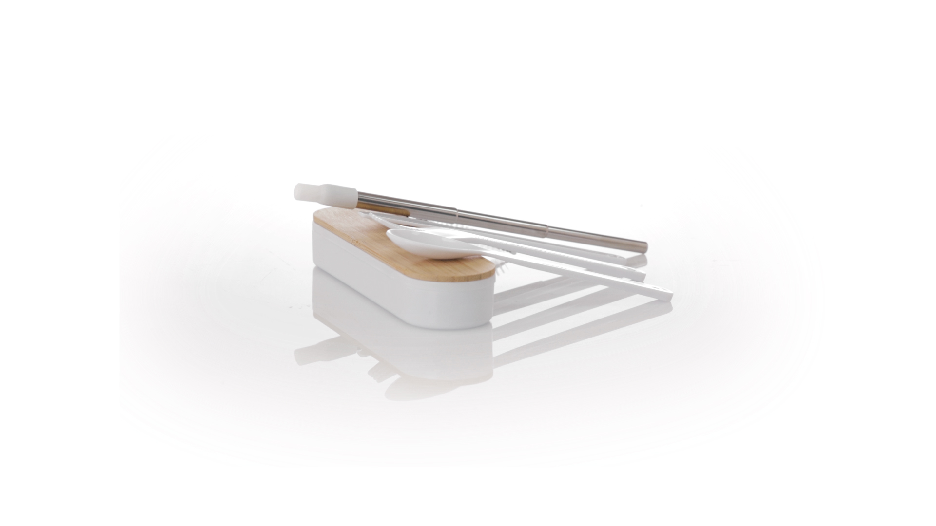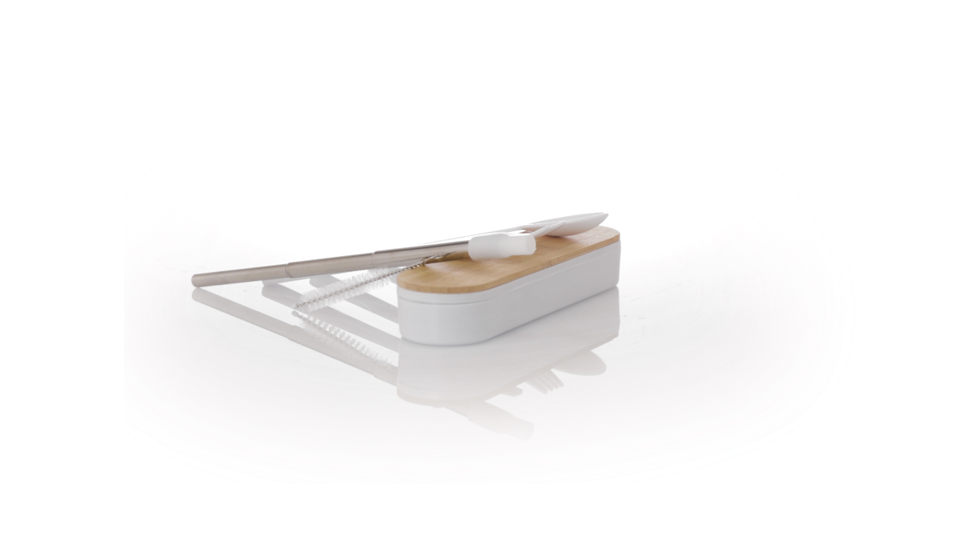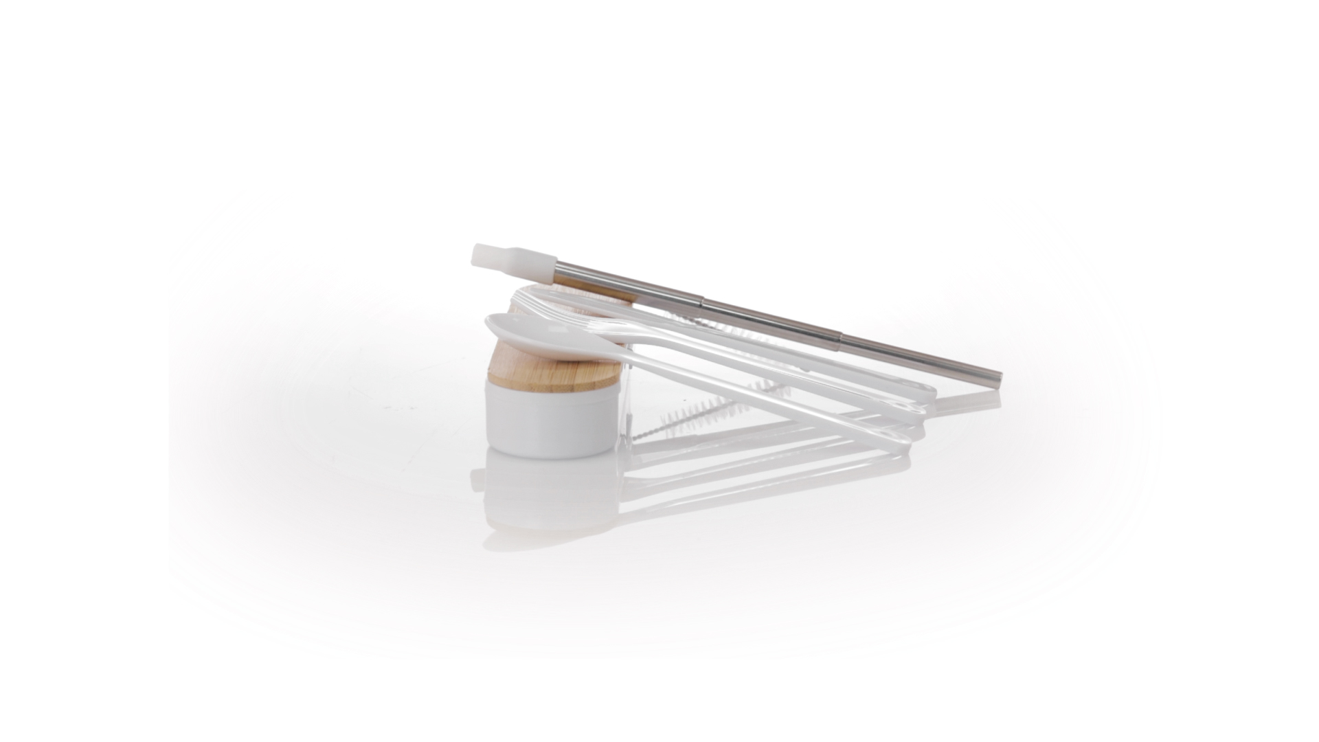 Besteckset aus PP und BPA-frei, mit passender Präsentationsbox und mit Bambusdeckel. Dieses Komplettset beinhaltet Löffel, Gabel, Messer und Faltstrohhalm mit Reiniger. Zertifiziert in Lebensmittelqualität, garantiert Sicherheit, wenn Lebensmittel mit dem zur Herstellung des Produkts verwendeten Material in Kontakt kommen. Präsentiert in einer einzelnen recycelten Tasche.