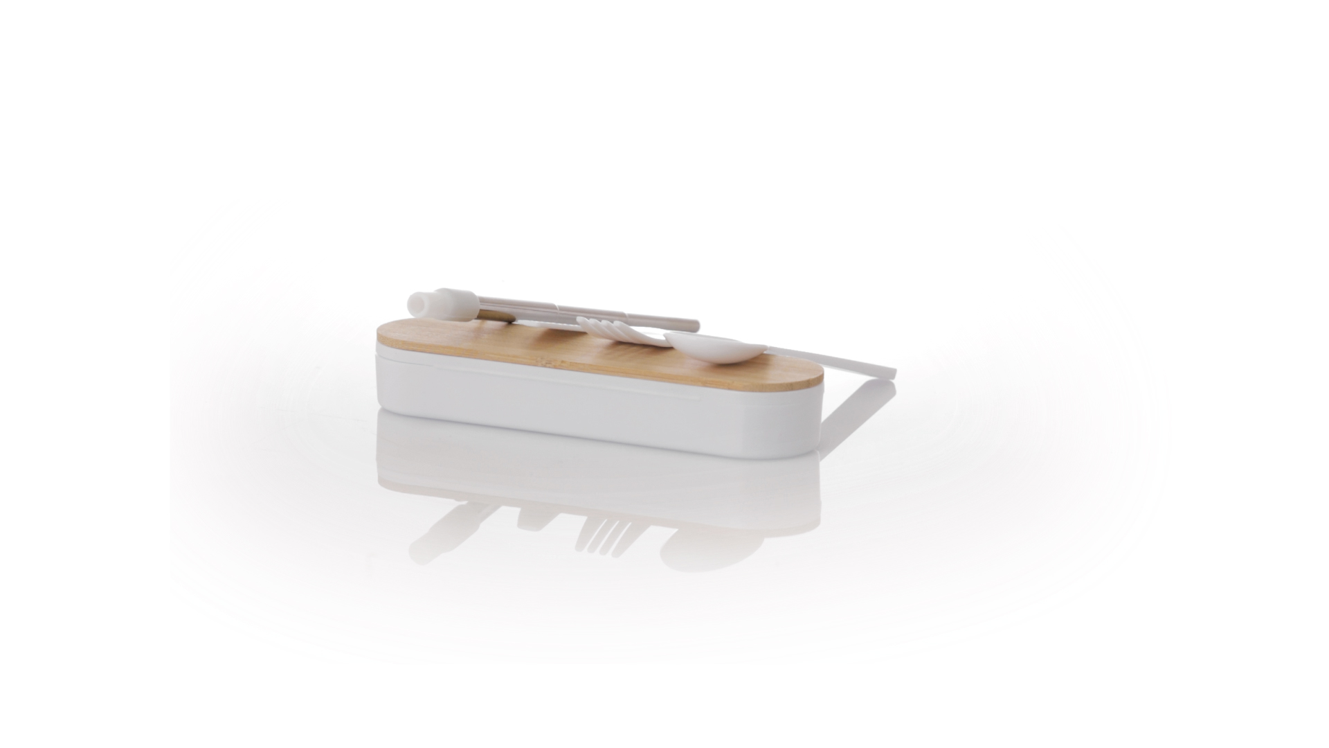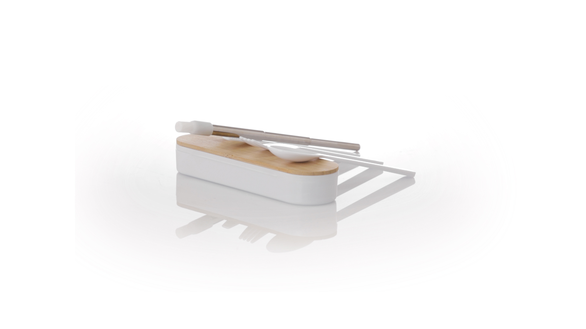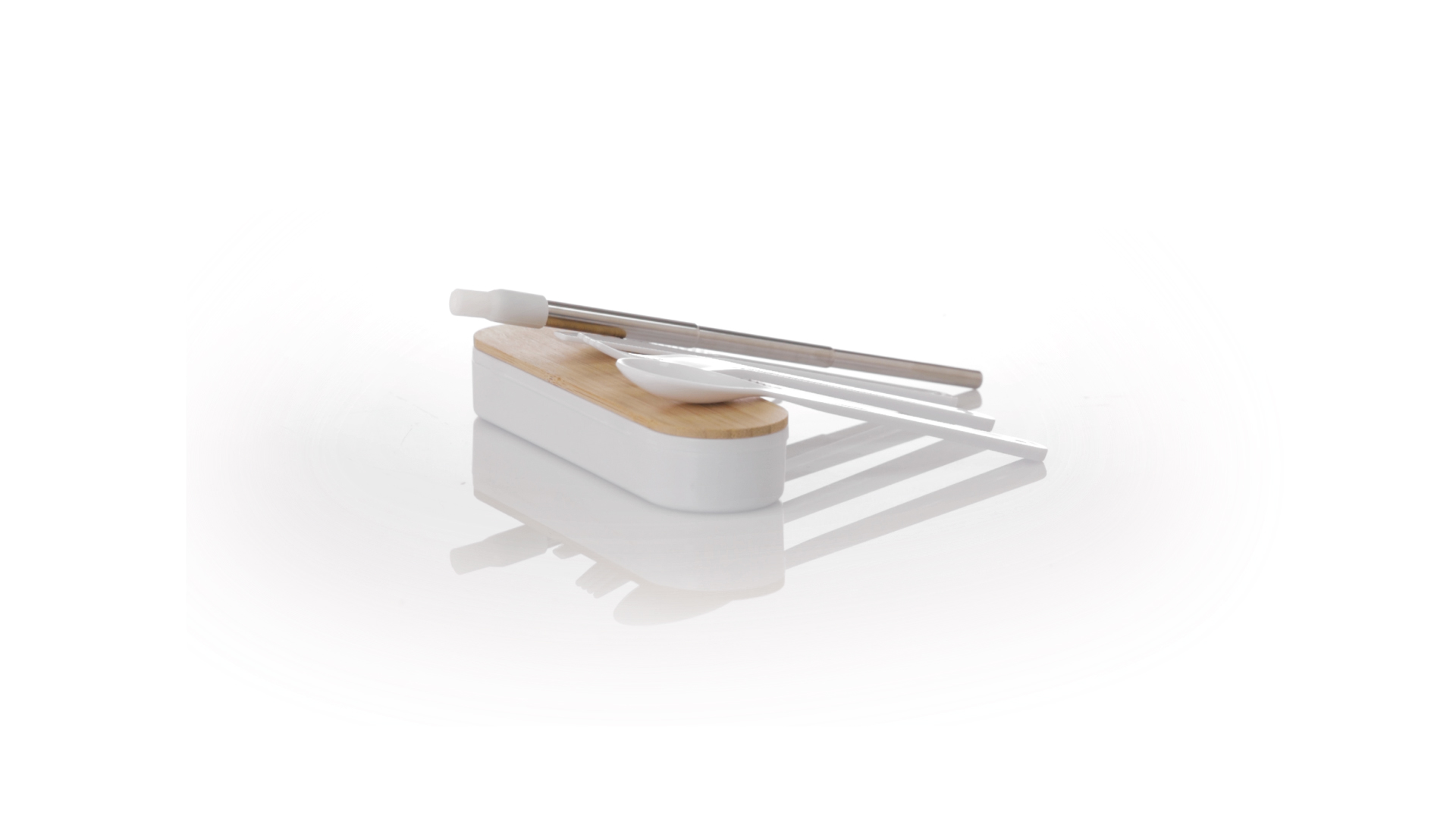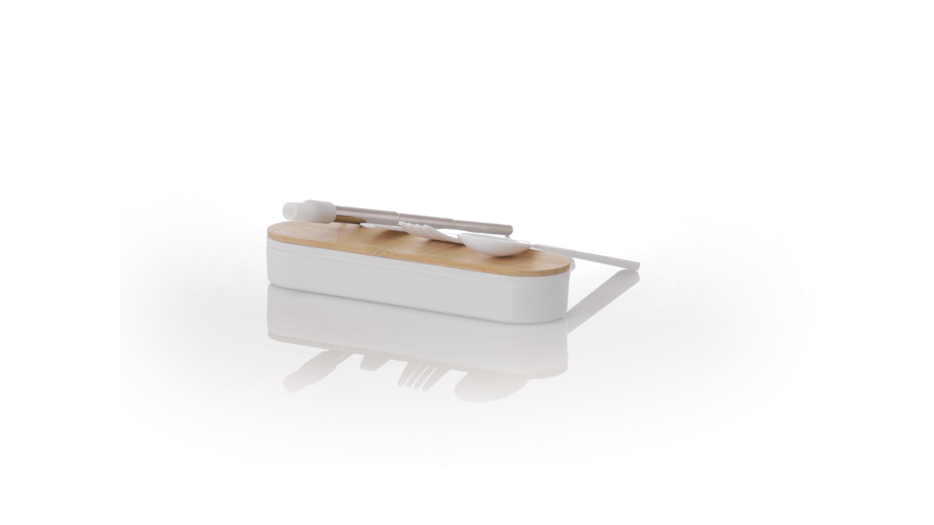Besteckset aus PP und BPA-frei, mit passender Präsentationsbox und mit Bambusdeckel. Dieses Komplettset beinhaltet Löffel, Gabel, Messer und Faltstrohhalm mit Reiniger. Zertifiziert in Lebensmittelqualität, garantiert Sicherheit, wenn Lebensmittel mit dem zur Herstellung des Produkts verwendeten Material in Kontakt kommen. Präsentiert in einer einzelnen recycelten Tasche.