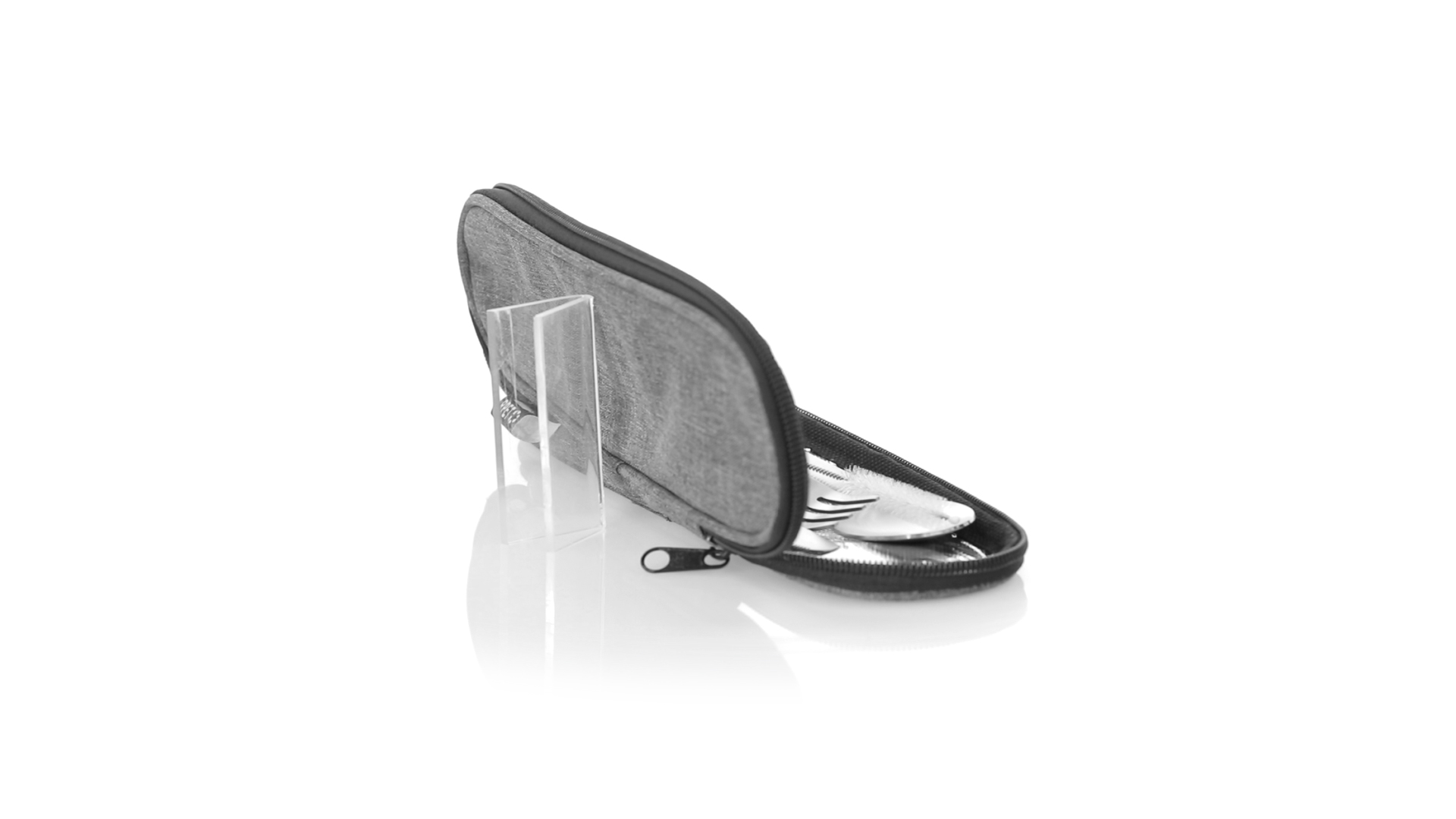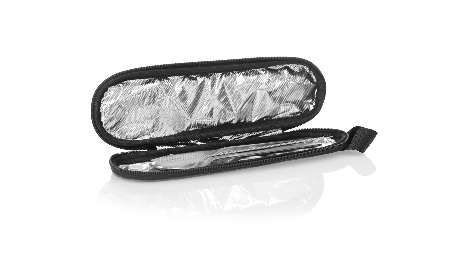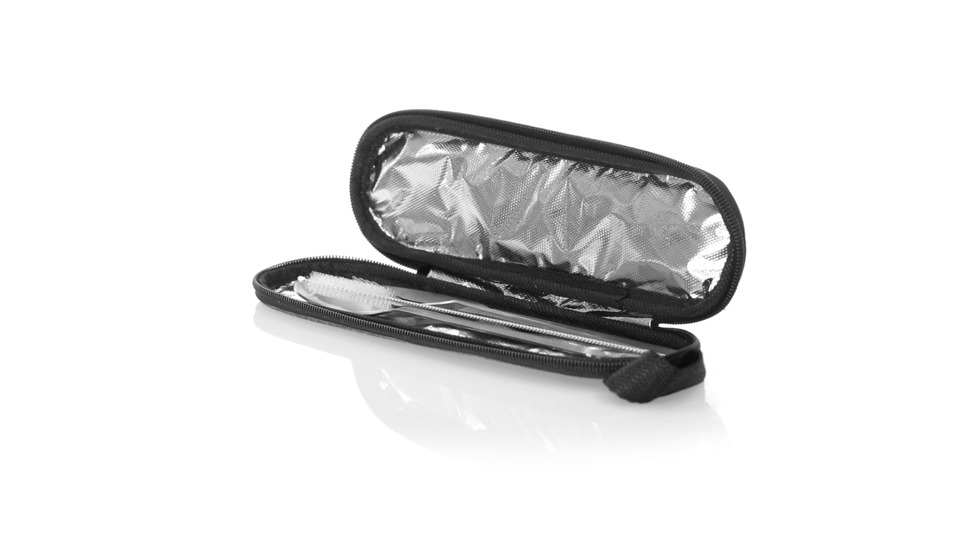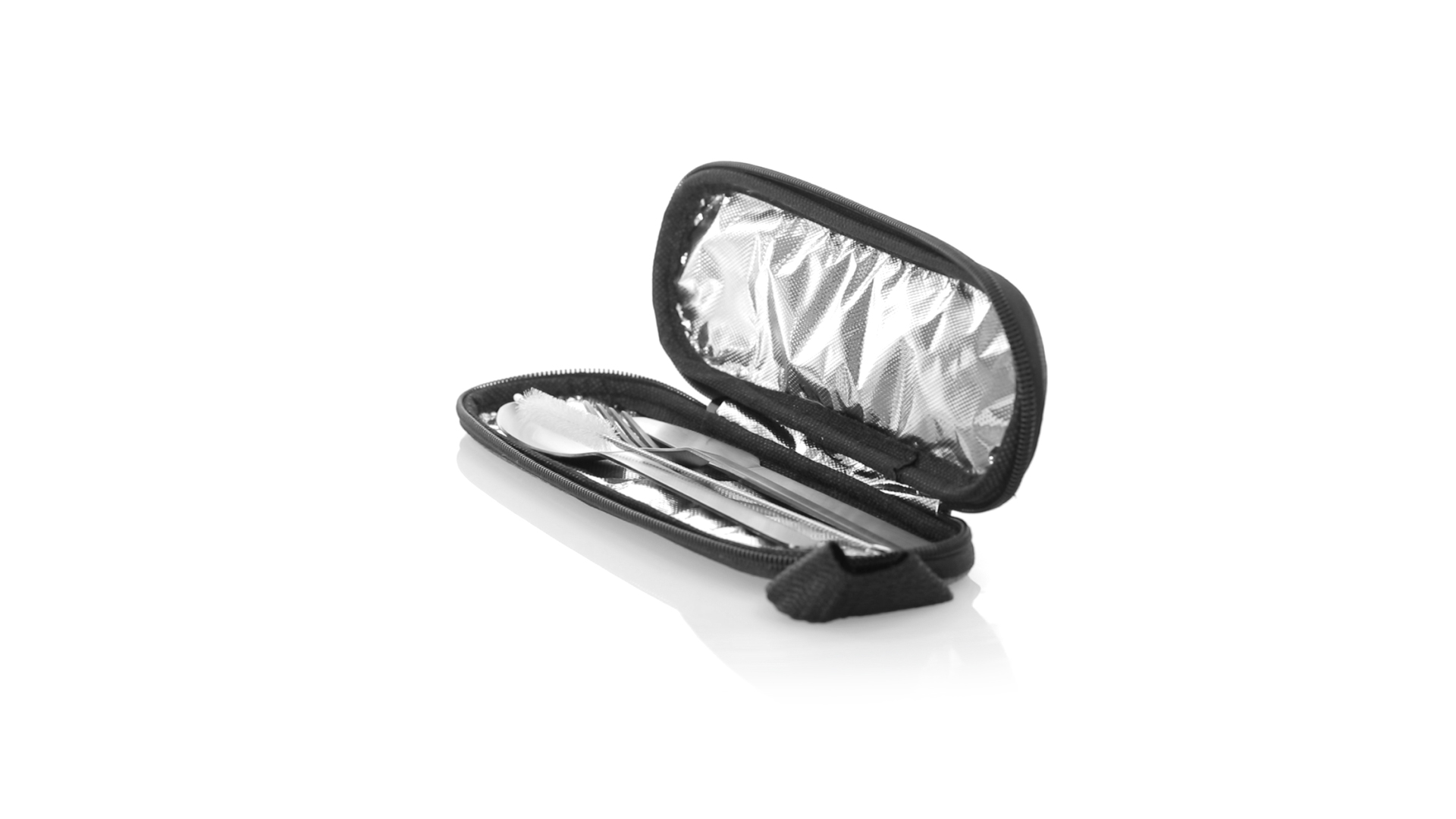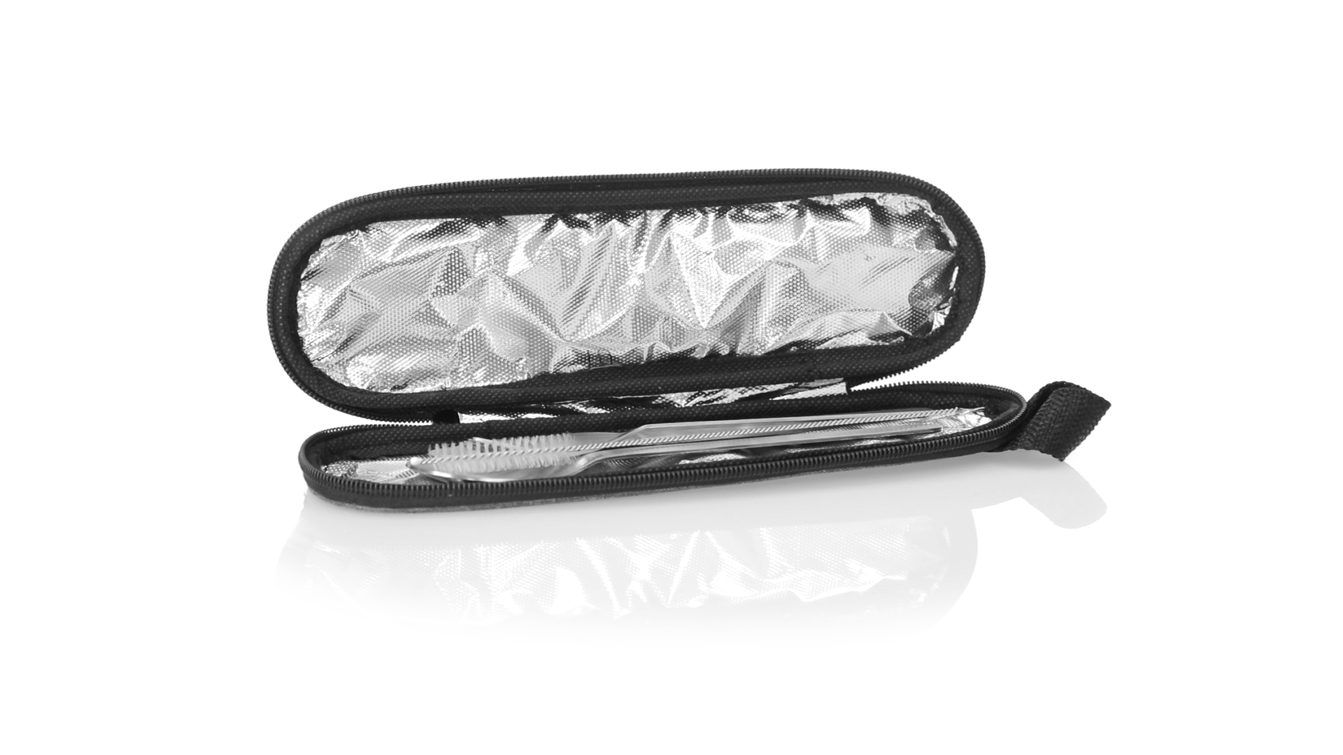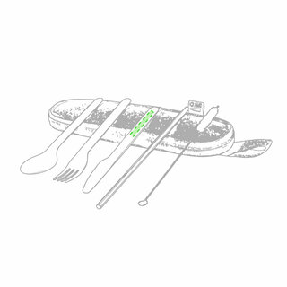 Wiederverwendbares Besteckset aus widerstandsfähigem und langlebigem Edelstahl. Inklusive Löffel, Messer, Gabel, Strohhalm und Reinigungszubehör. Präsentiert in einem eleganten 300D RPET-Polyester-Etui aus recyceltem Kunststoff, um die Wiederverwendung von Kunststoffabfällen zu fördern und die Nachhaltigkeit des Planeten zu unterstützen. Etui mit Trageriemen, Reissverschluss und RPET-Label auf dem Etikett.