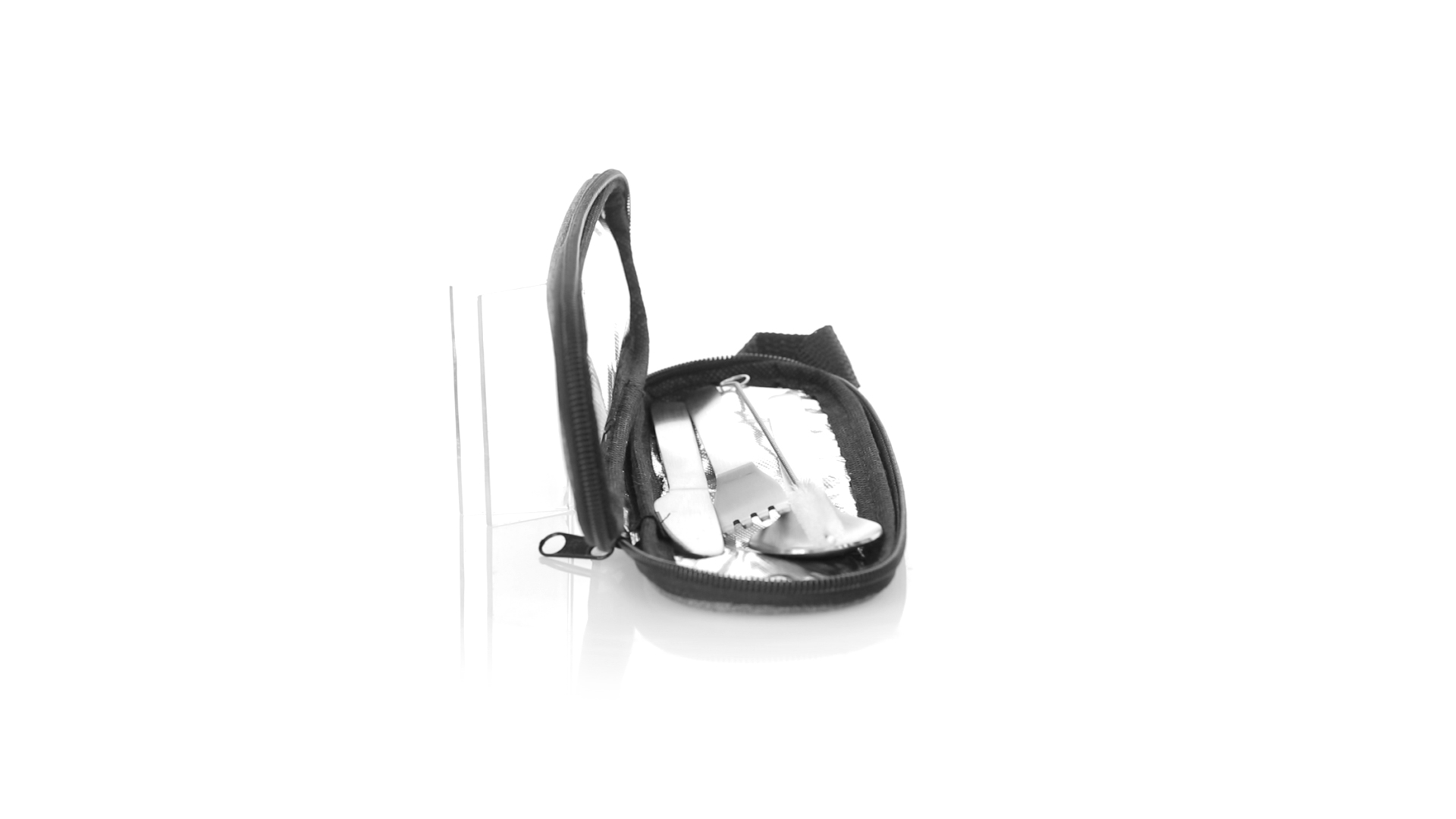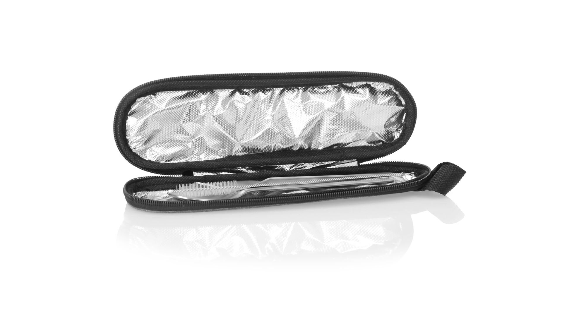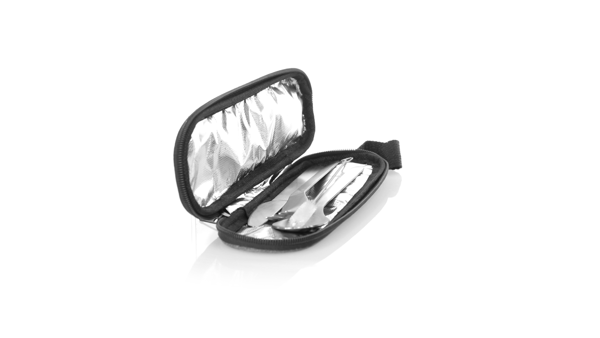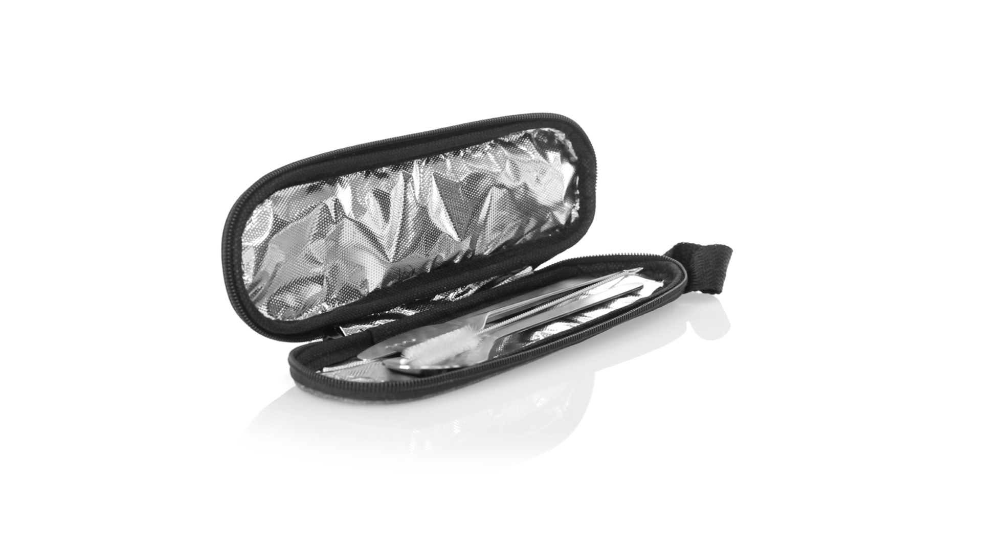 Wiederverwendbares Besteckset aus widerstandsfähigem und langlebigem Edelstahl. Inklusive Löffel, Messer, Gabel, Strohhalm und Reinigungszubehör. Präsentiert in einem eleganten 300D RPET-Polyester-Etui aus recyceltem Kunststoff, um die Wiederverwendung von Kunststoffabfällen zu fördern und die Nachhaltigkeit des Planeten zu unterstützen. Etui mit Trageriemen, Reissverschluss und RPET-Label auf dem Etikett.