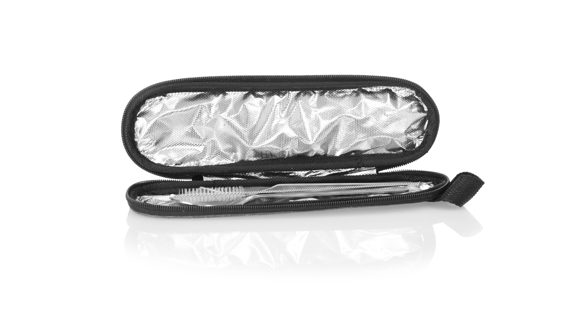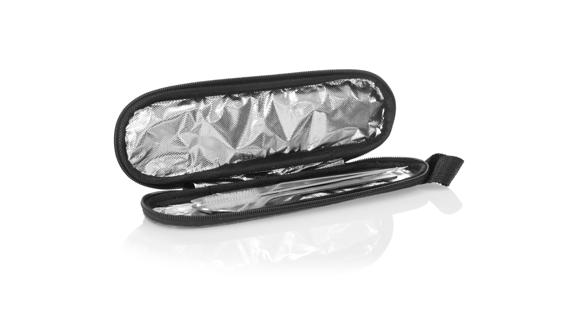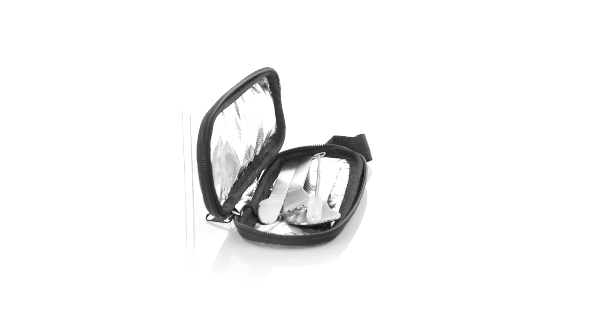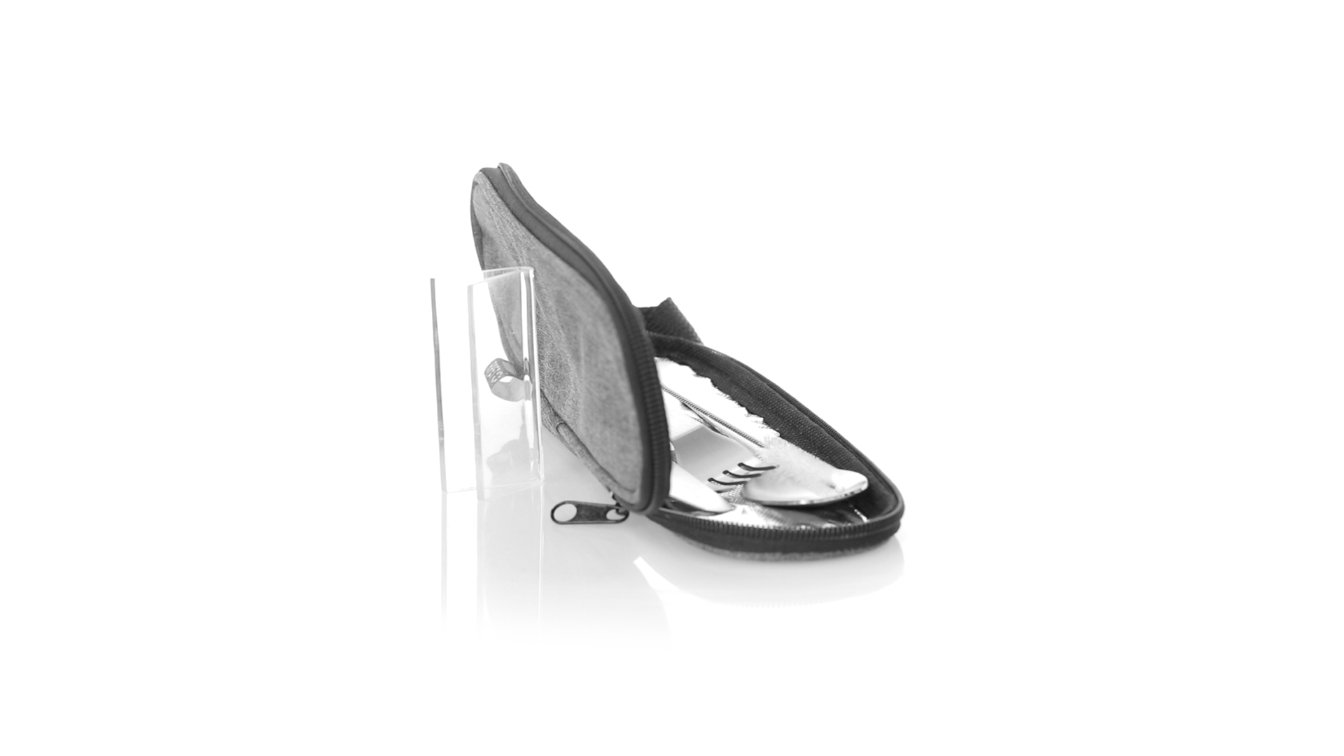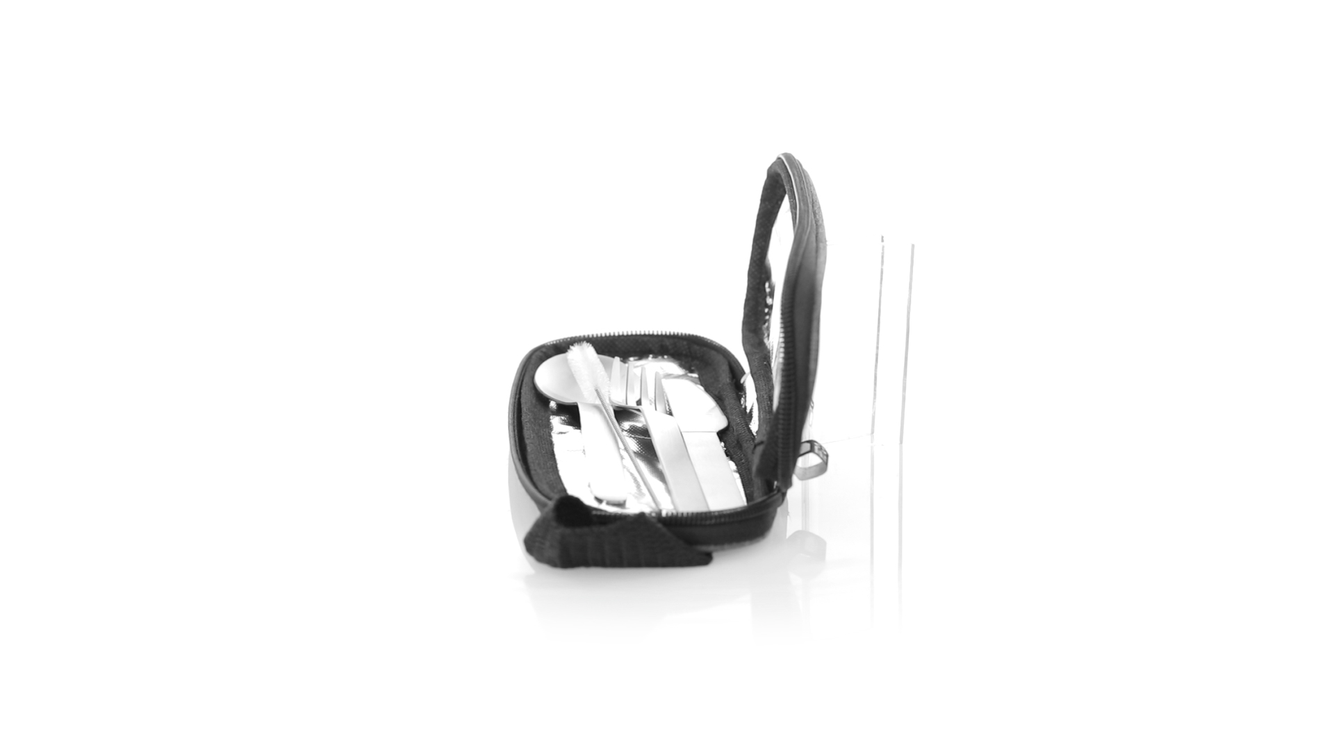 Wiederverwendbares Besteckset aus widerstandsfähigem und langlebigem Edelstahl. Inklusive Löffel, Messer, Gabel, Strohhalm und Reinigungszubehör. Präsentiert in einem eleganten 300D RPET-Polyester-Etui aus recyceltem Kunststoff, um die Wiederverwendung von Kunststoffabfällen zu fördern und die Nachhaltigkeit des Planeten zu unterstützen. Etui mit Trageriemen, Reissverschluss und RPET-Label auf dem Etikett.