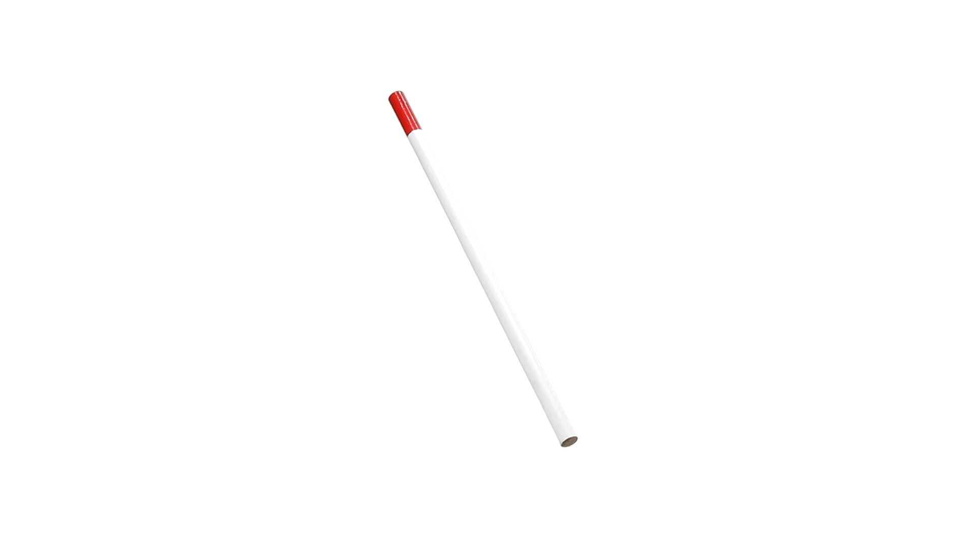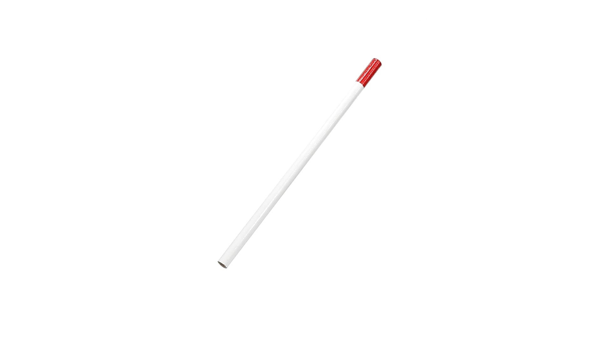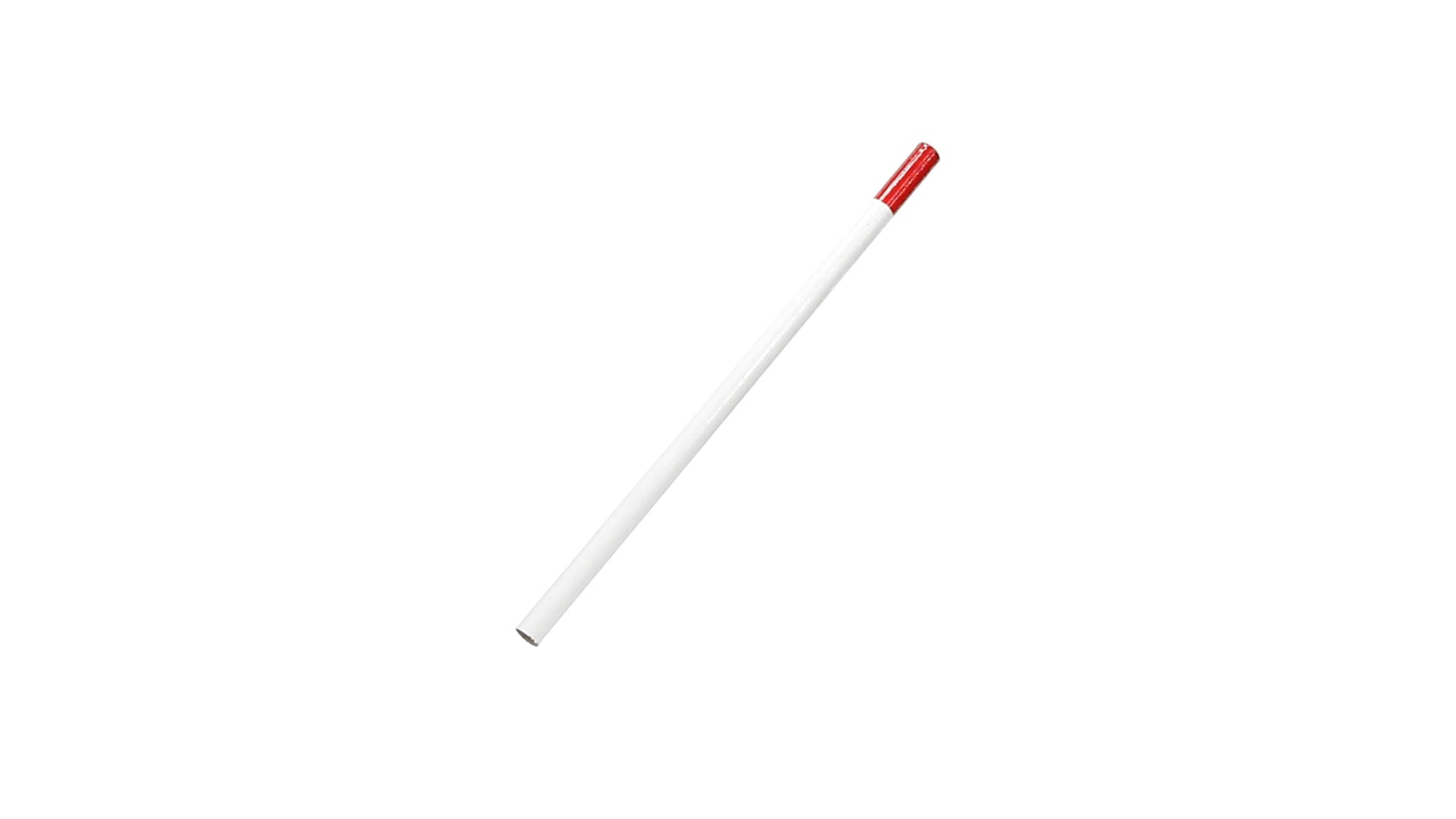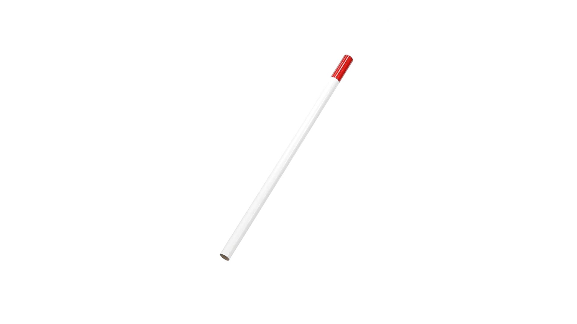 Hölzerner Bleistift mit rundem Körper in glänzendem Weiss mit Kontrastdetails in verschiedenen fröhlichen Farben.