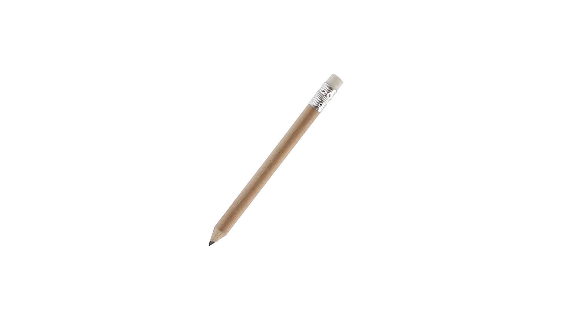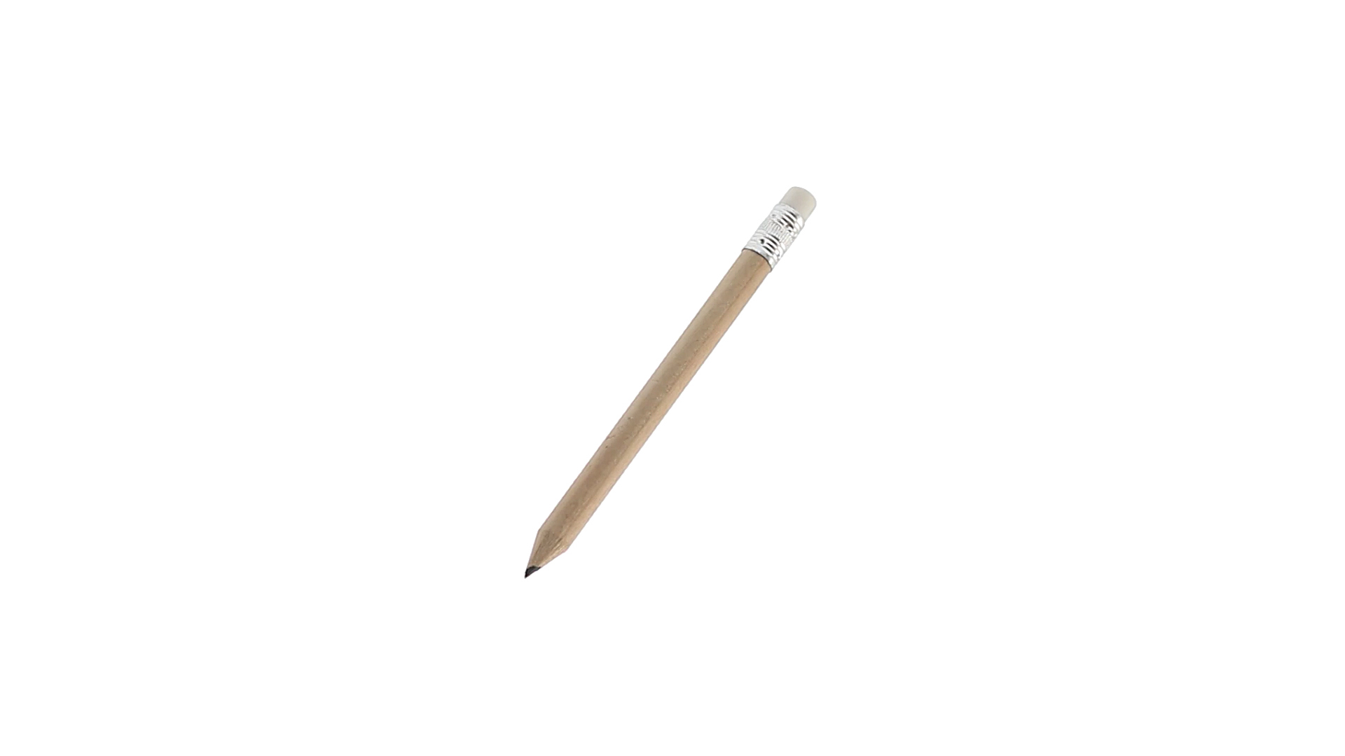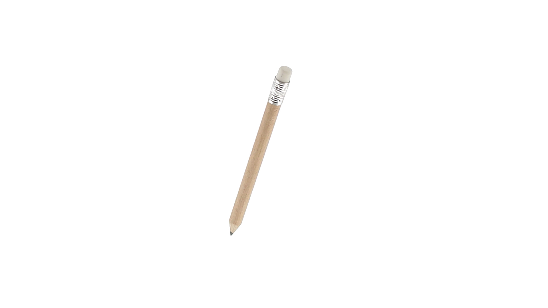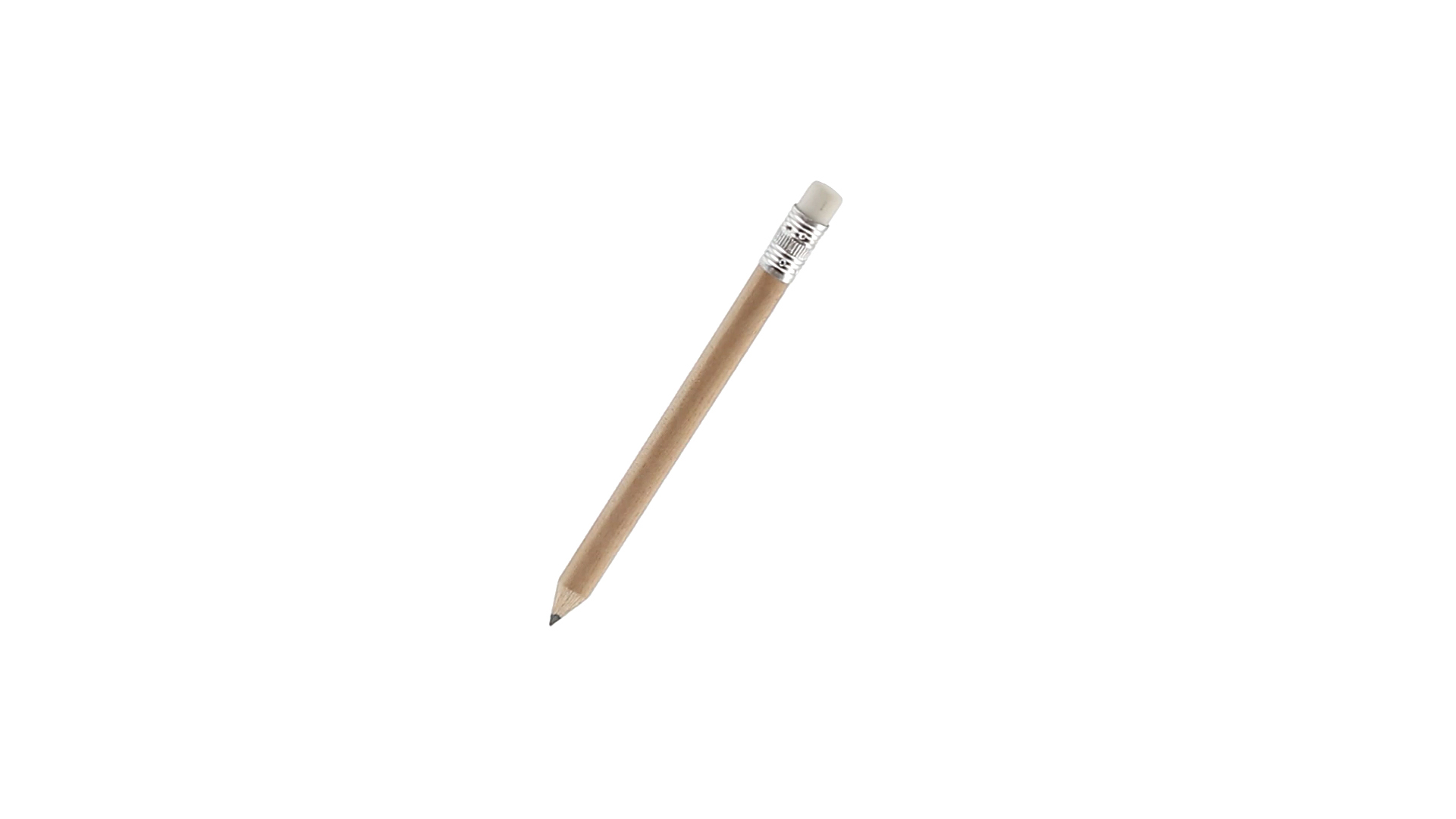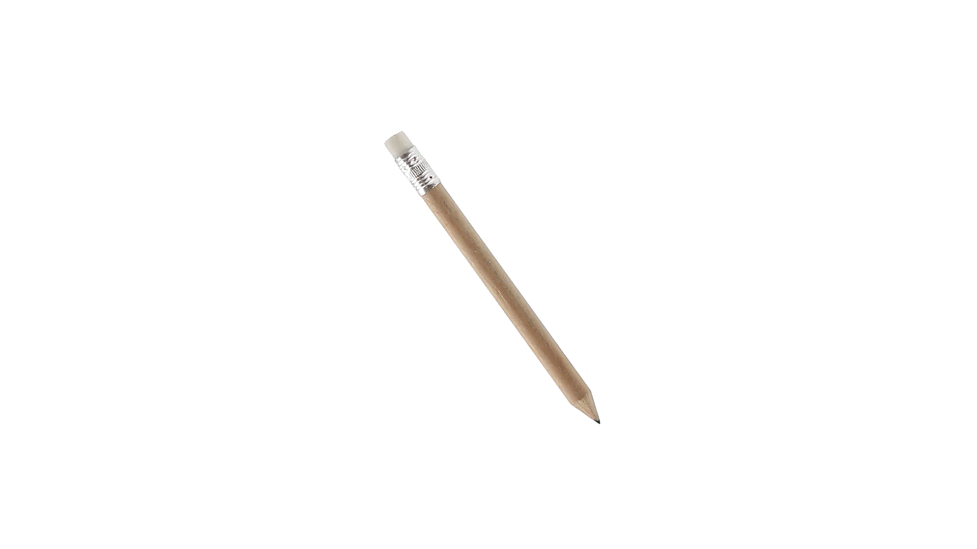 Mini-Holzbleistift mit Naturfinish. Mit rundem Schaft und weissem Radiergummi. Schwarze Mine und scharfe Spitze.