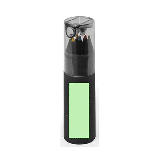 Set mit 6 Holzstiften in schwarzer Farbe, mit sechseckigem Schaft und Minen in verschiedenen Farben. Präsentiert in einer schwarzen Schachtel aus recyceltem Karton mit Klappverschluss.