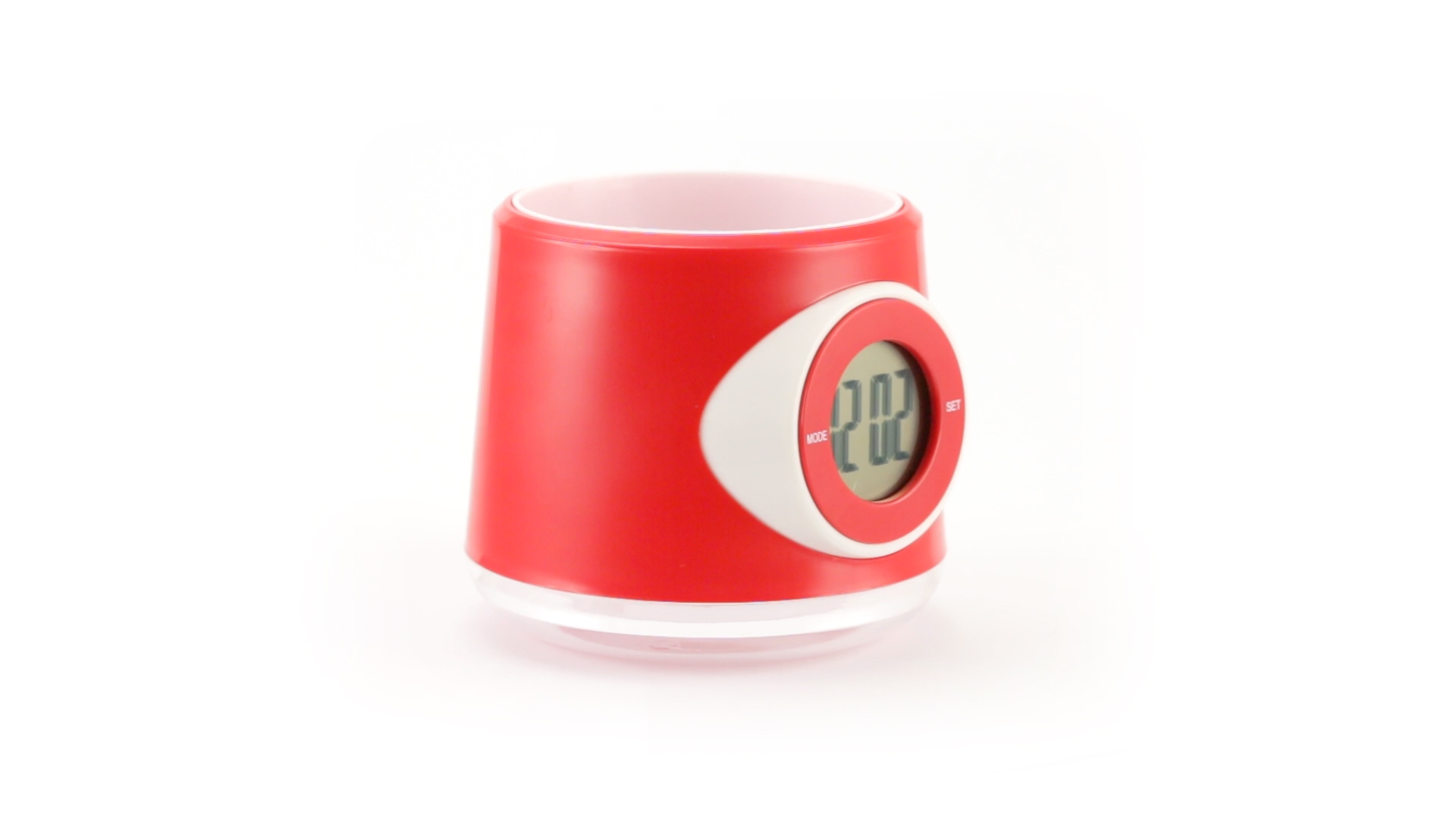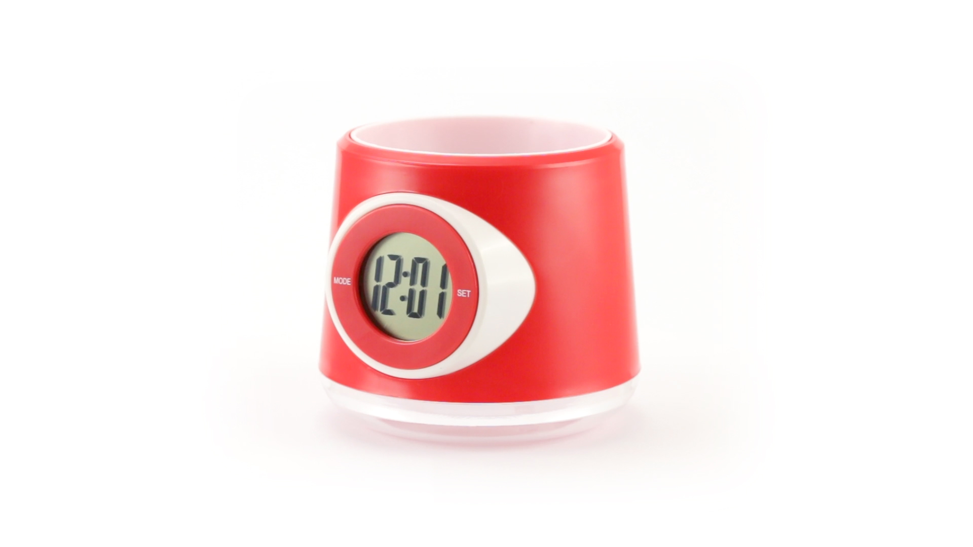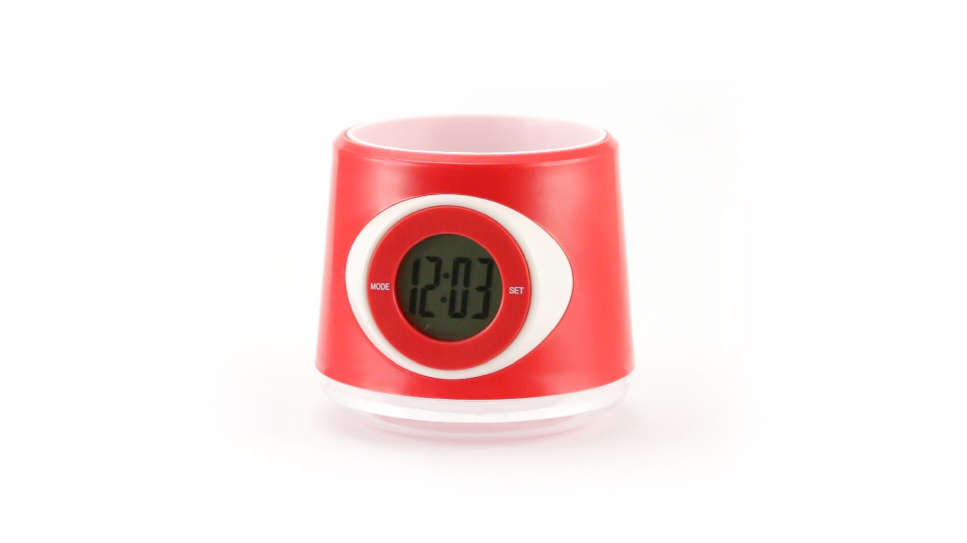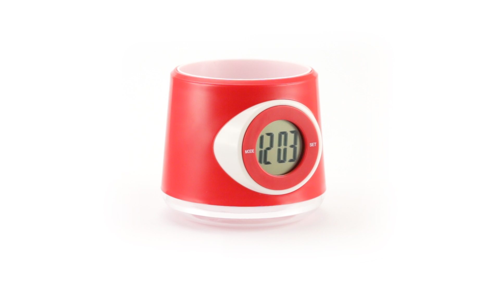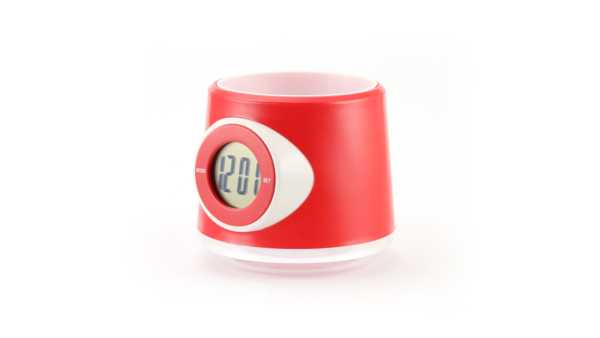 Digitale Tischuhr mit integriertem Blumentopf und originellem zweifarbigem Design. Knopfzellen mit Schutzfolie inklusive. Präsentiert in einer individuellen Box.
