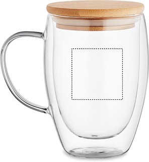 Doppelwandiges Borosilikatglas mit Henkel. Deckel aus Bambus. Füllmenge: 350 ml.