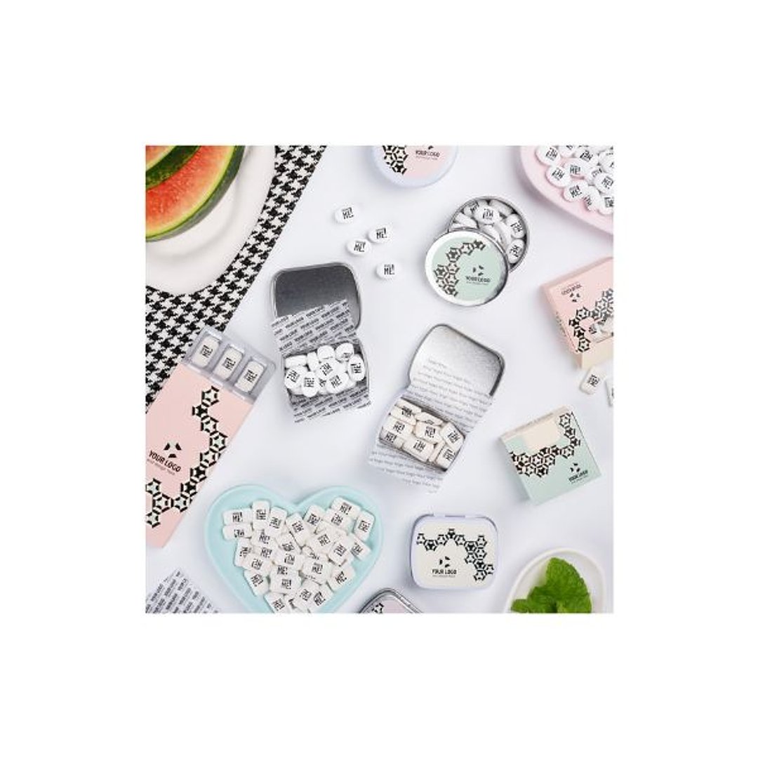 Du kannst die Verpackung mit einem beidseitigen Druck auf den Dragees in schwarzer Farbe personalisieren, um deine Marke oder Botschaft perfekt zur Geltung zu bringen. Dies macht ihn zu einem einzigartigen Werbegeschenk, das garantiert im Gedächtnis bleibt!