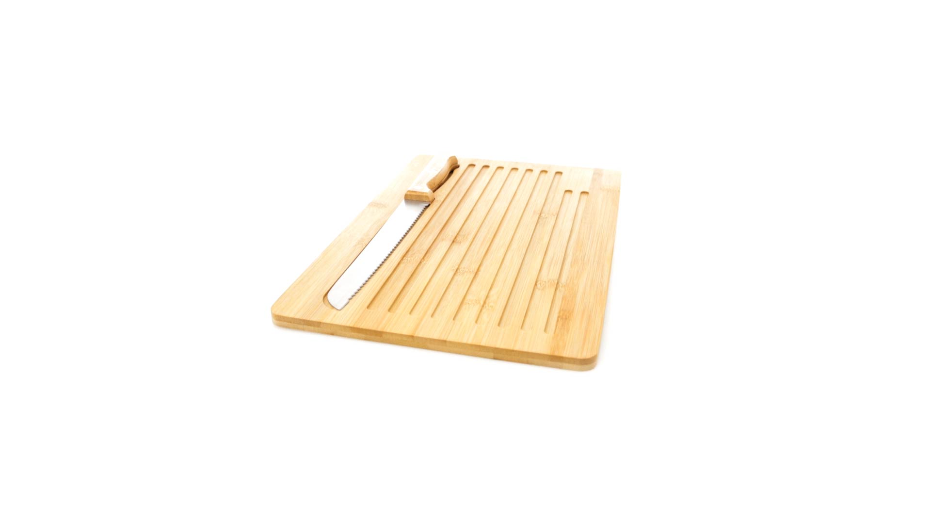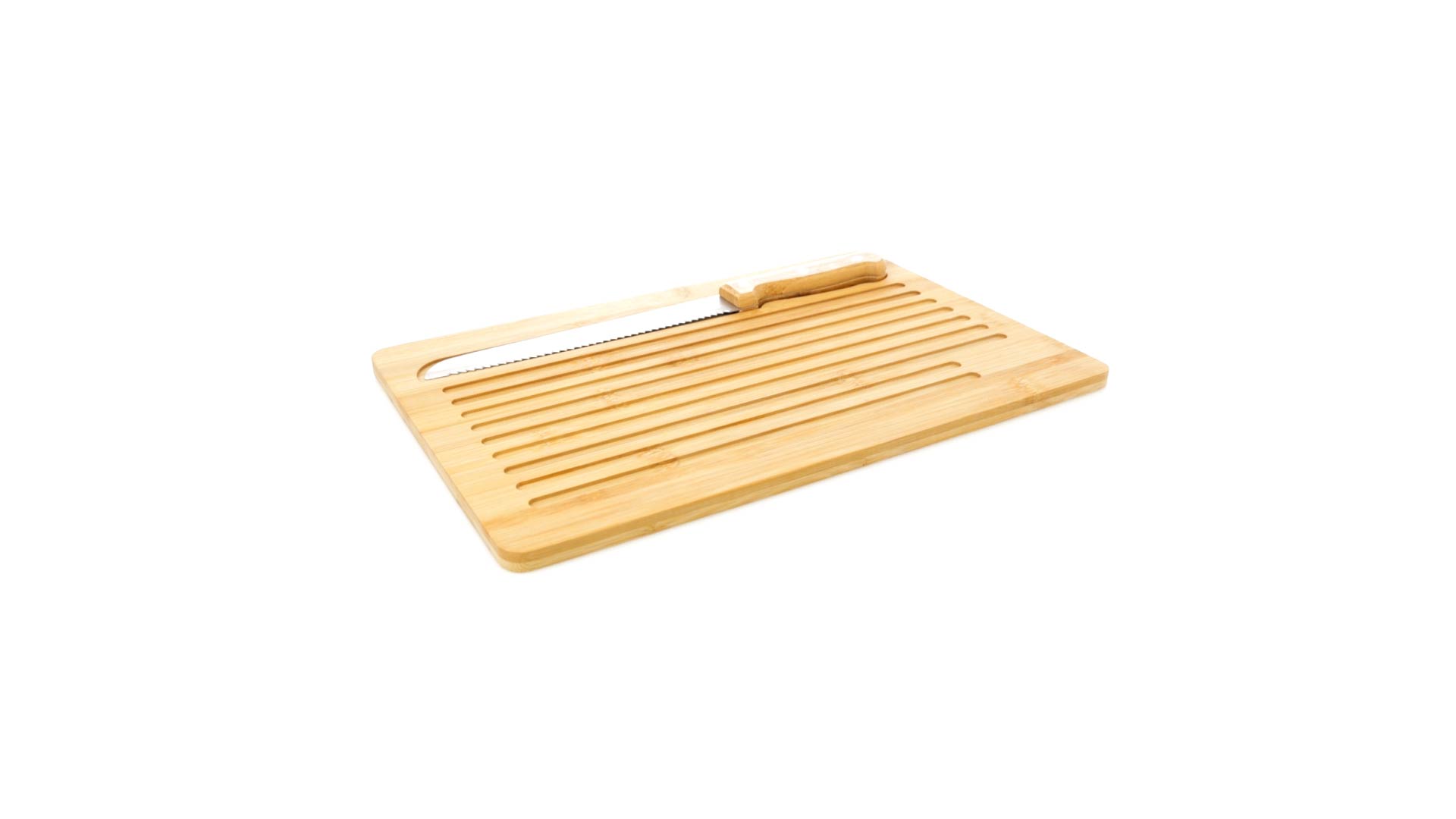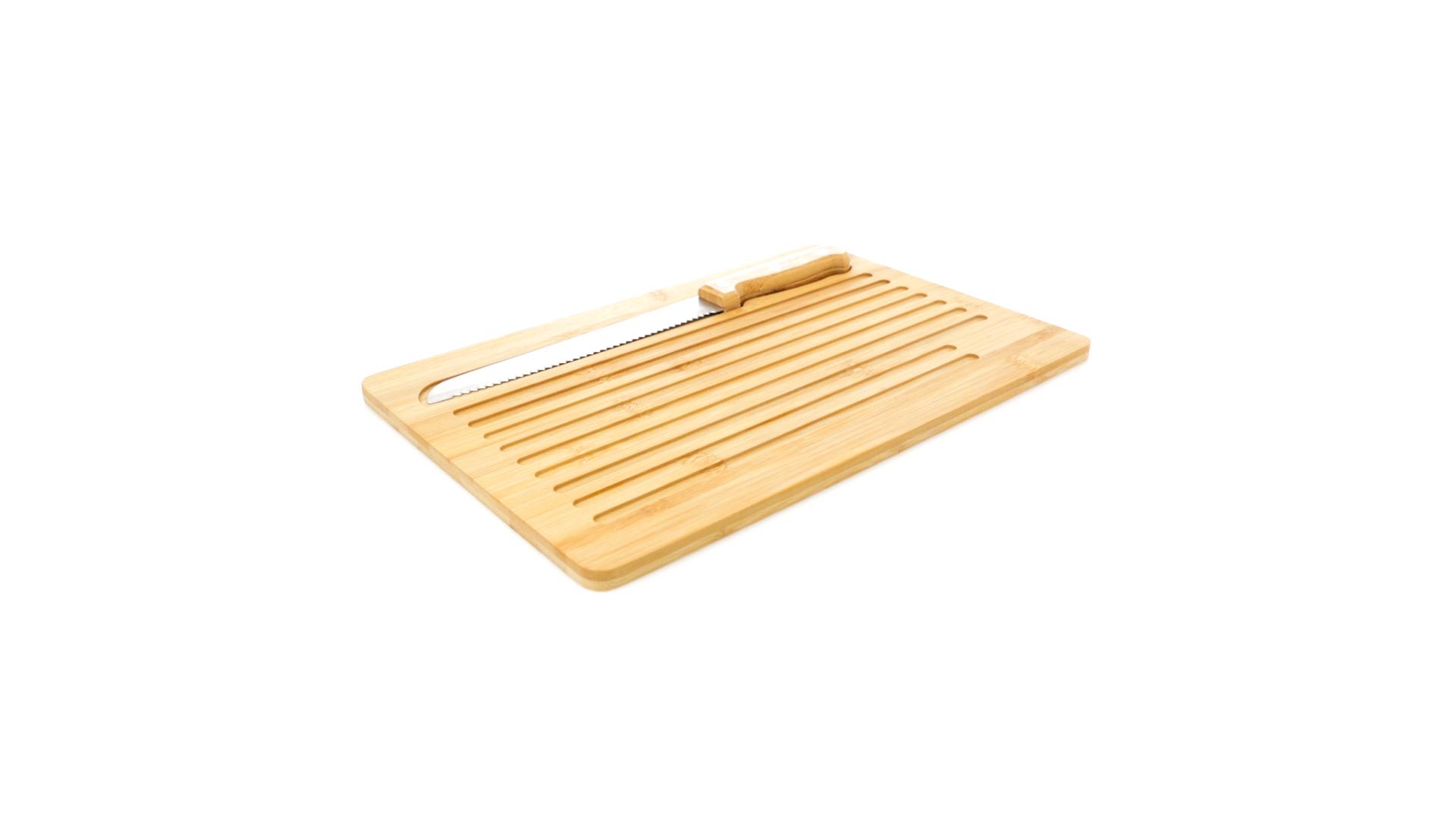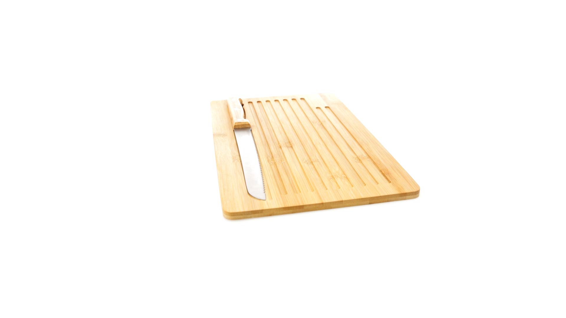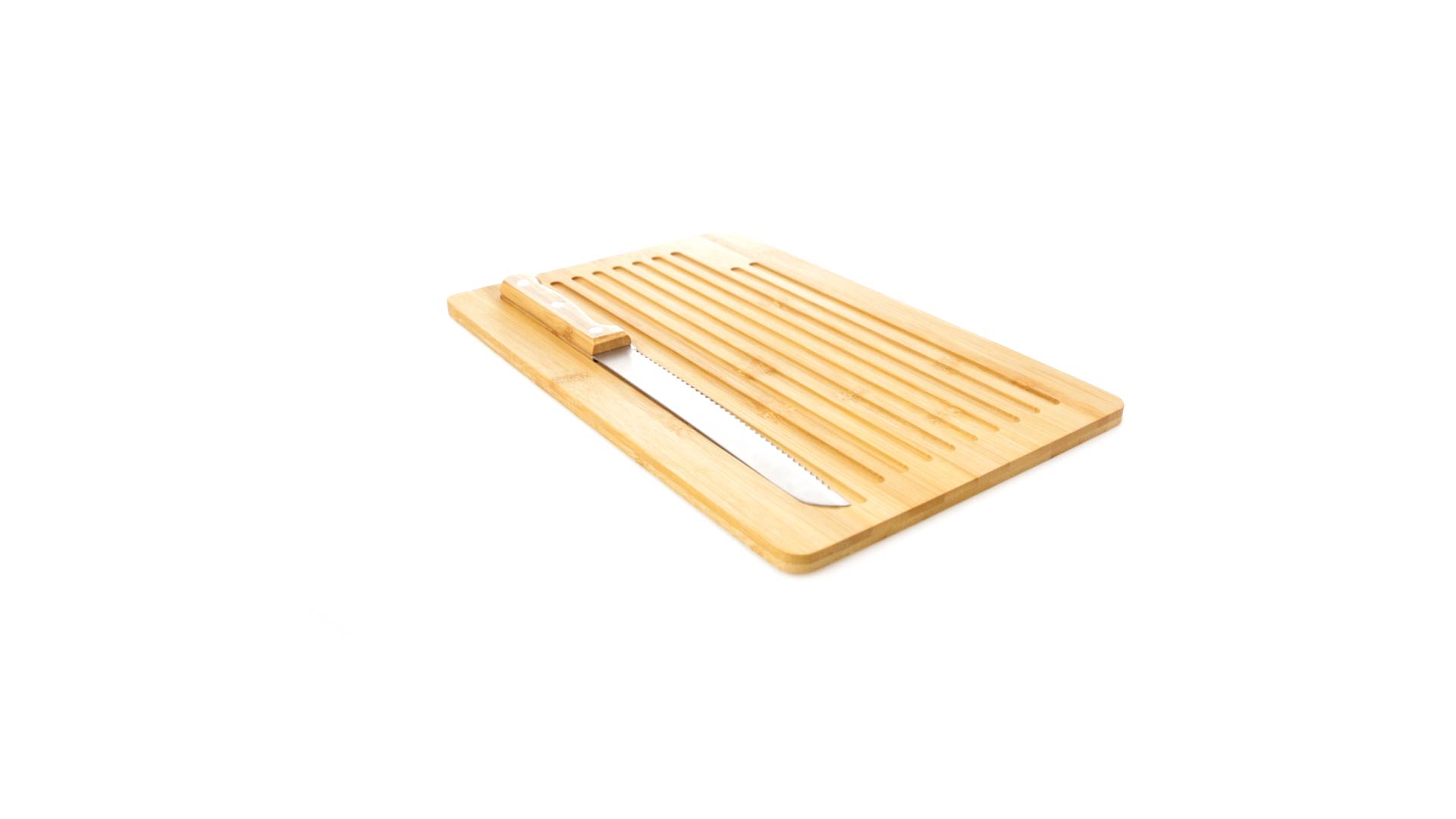 Küchenbrett aus Bambus, inklusive Messer. Mit einer glatten Seite, die für verschiedene Zwecke geeignet ist, und einer gestanzten Seite, ideal zum Schneiden von Brot oder saftigen Lebensmitteln. Inklusive Fach mit Messer darin (Sägestahlklinge und Bambusgriff).