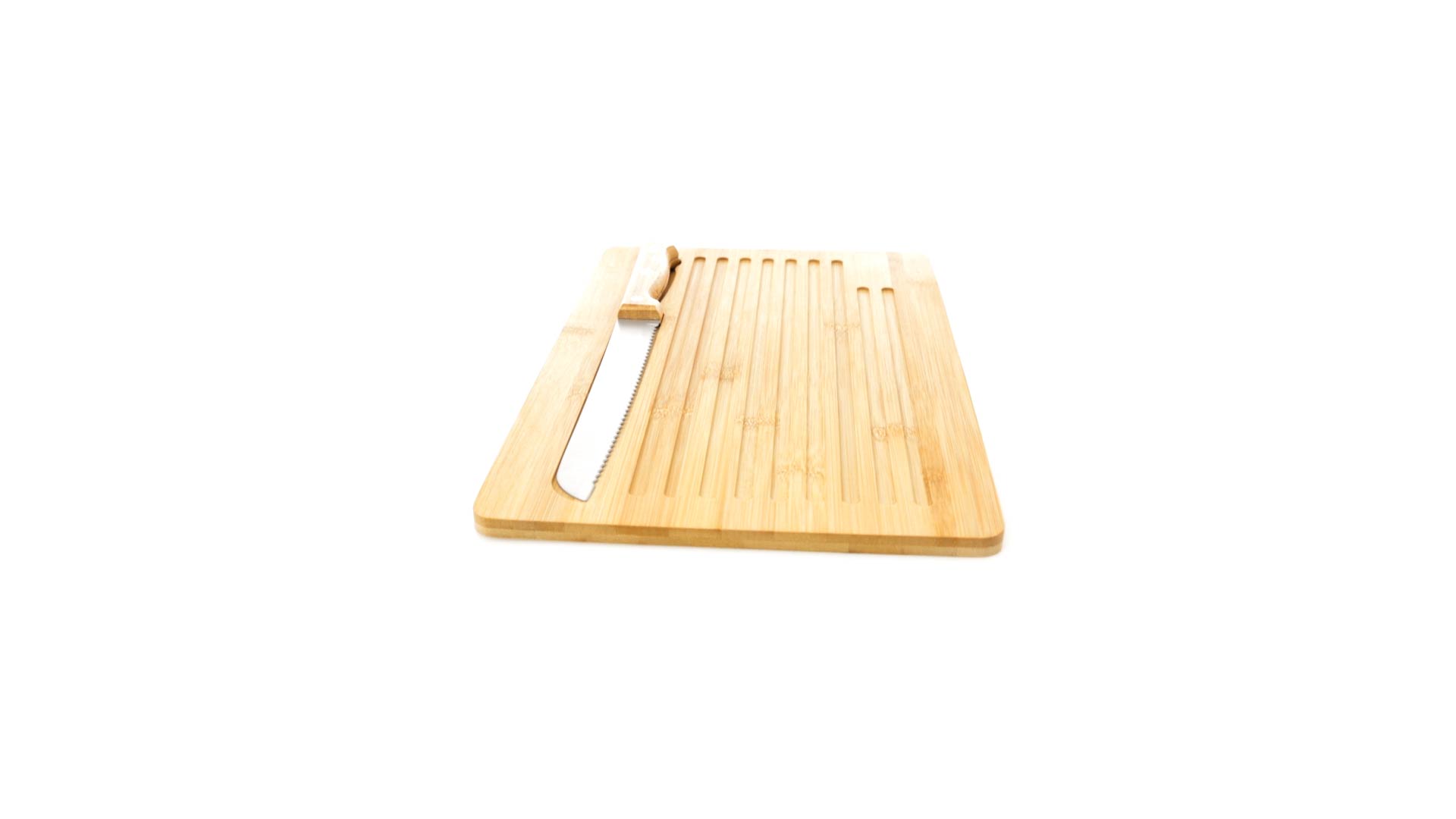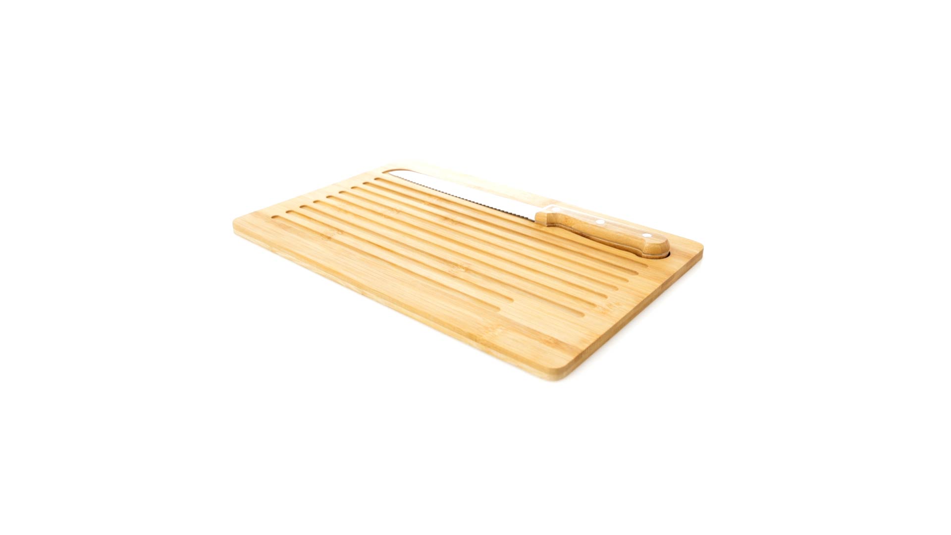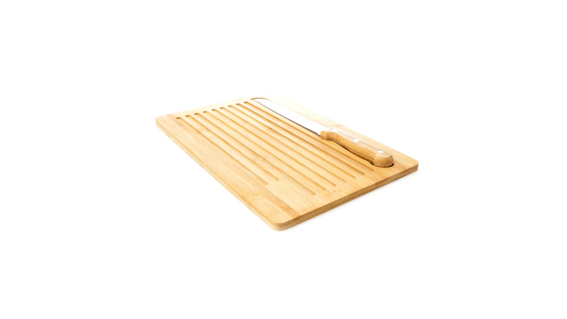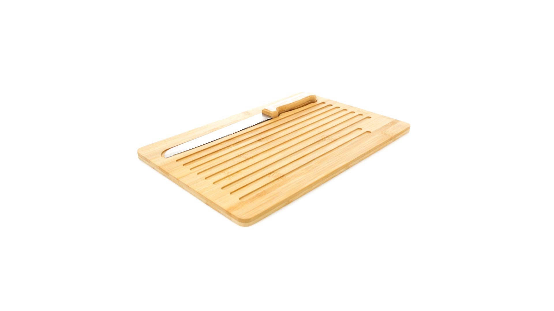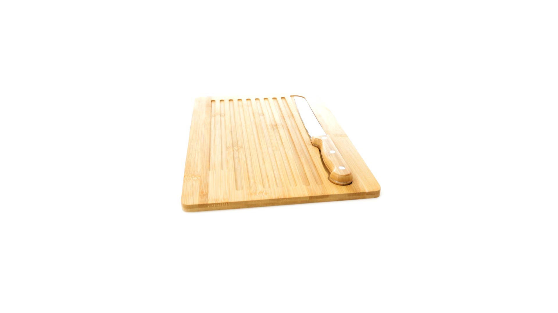 Küchenbrett aus Bambus, inklusive Messer. Mit einer glatten Seite, die für verschiedene Zwecke geeignet ist, und einer gestanzten Seite, ideal zum Schneiden von Brot oder saftigen Lebensmitteln. Inklusive Fach mit Messer darin (Sägestahlklinge und Bambusgriff).
