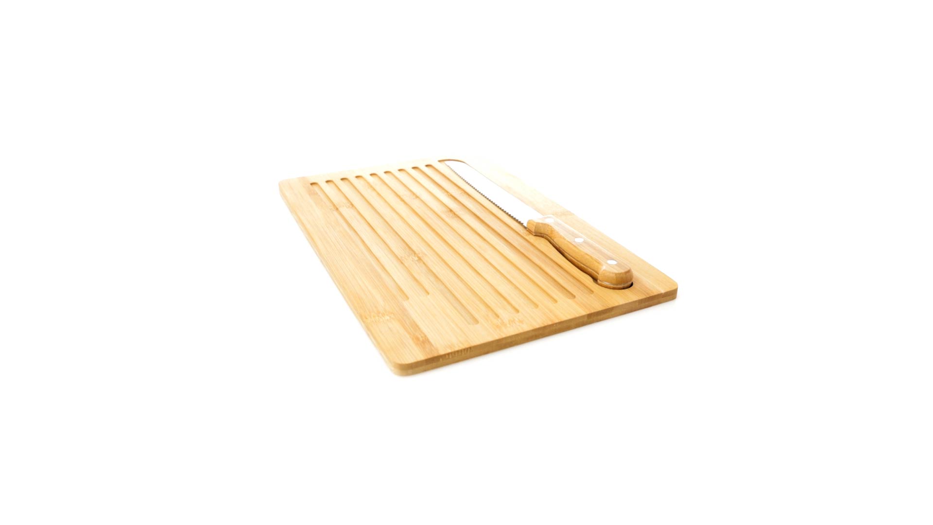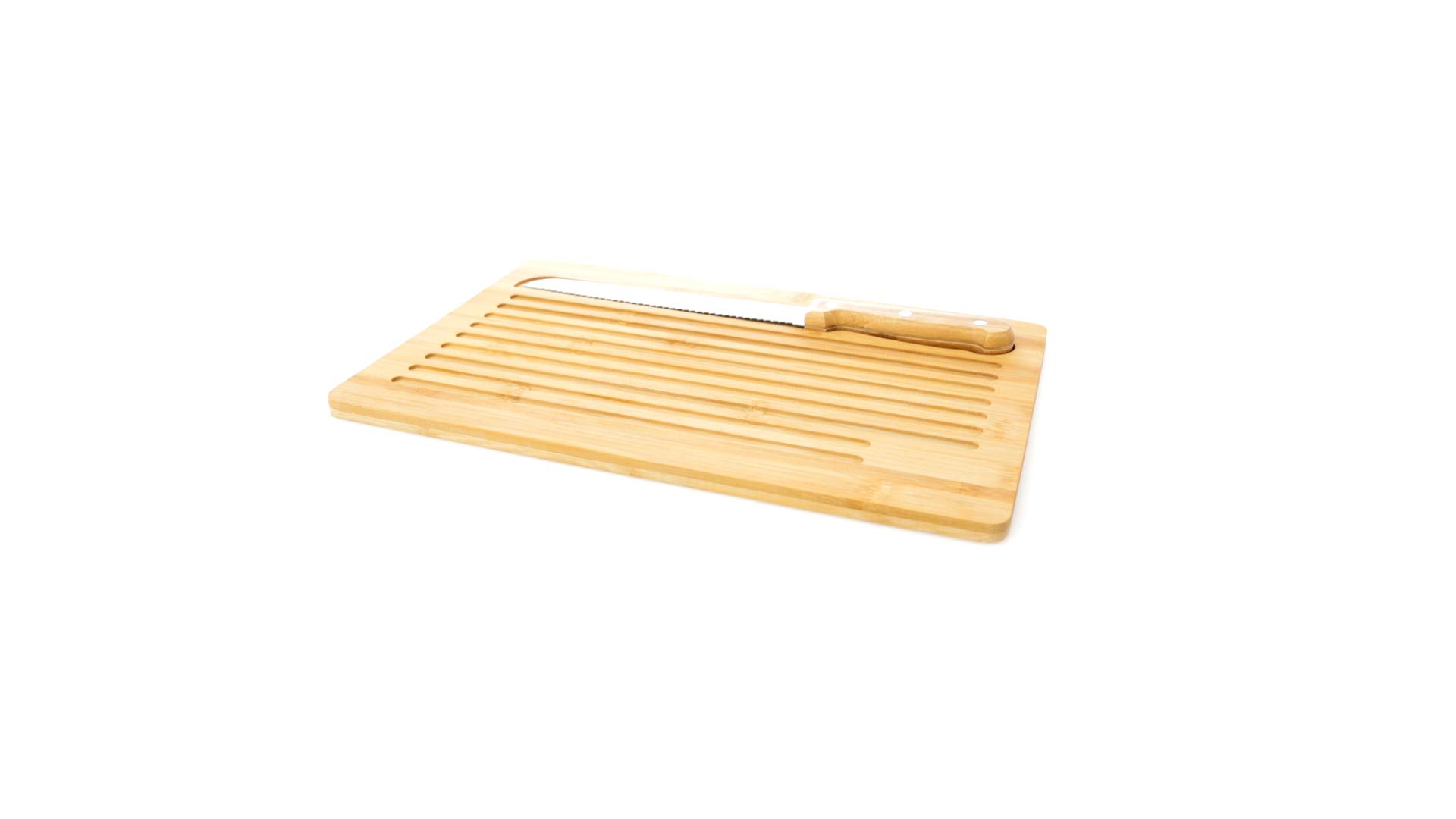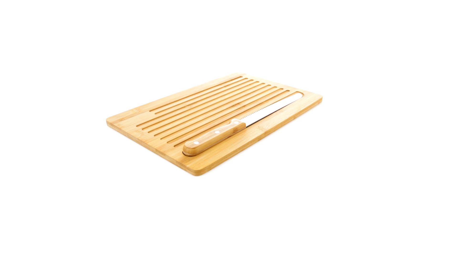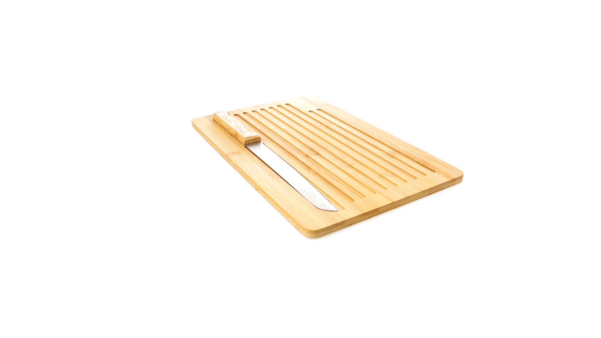 Küchenbrett aus Bambus, inklusive Messer. Mit einer glatten Seite, die für verschiedene Zwecke geeignet ist, und einer gestanzten Seite, ideal zum Schneiden von Brot oder saftigen Lebensmitteln. Inklusive Fach mit Messer darin (Sägestahlklinge und Bambusgriff).