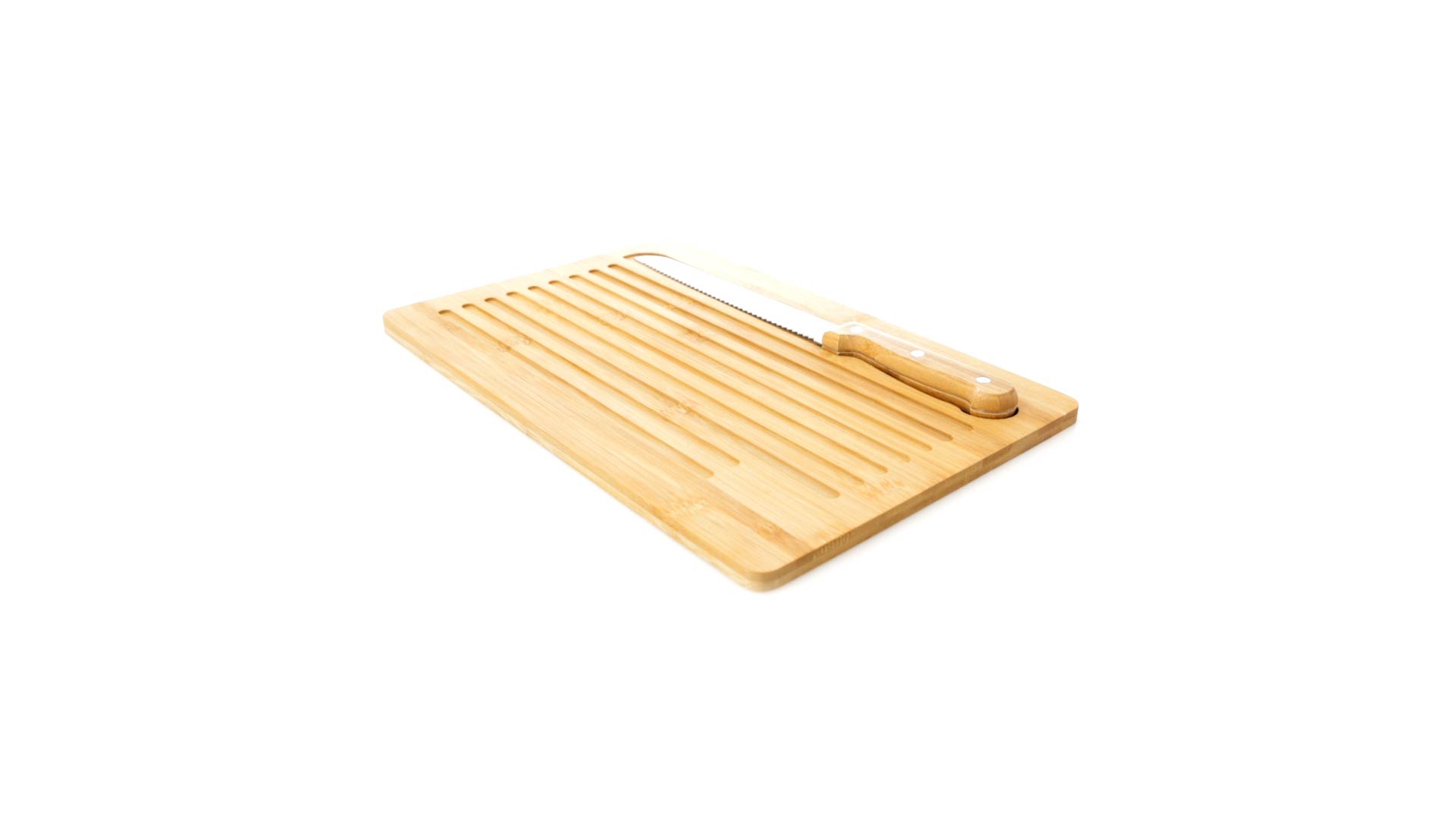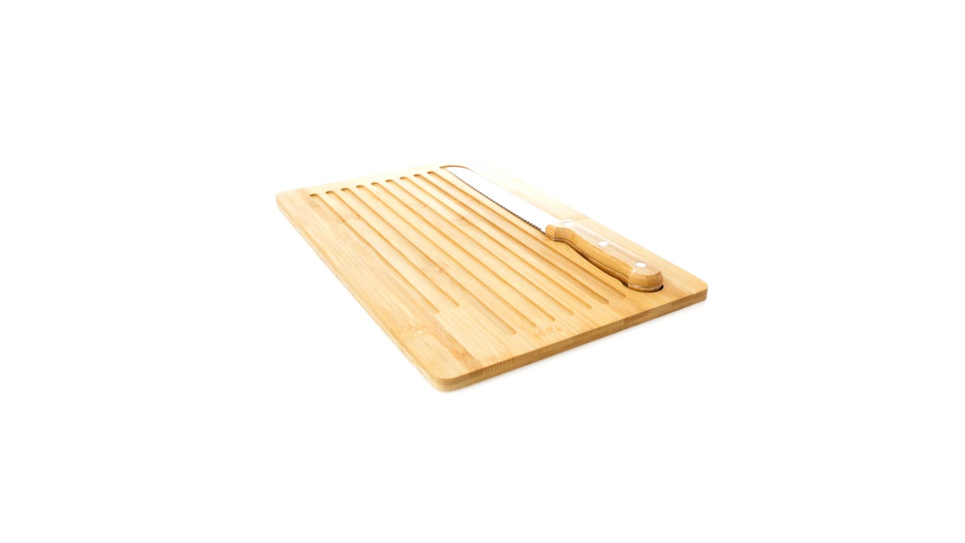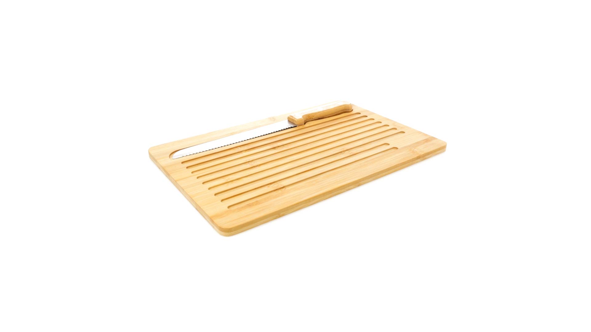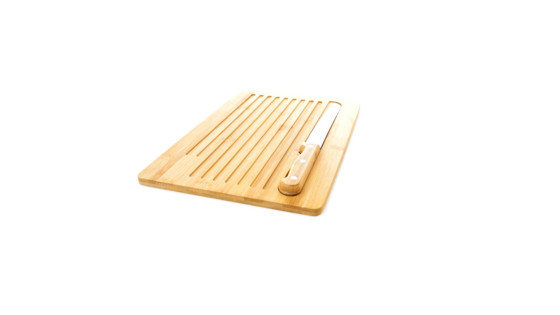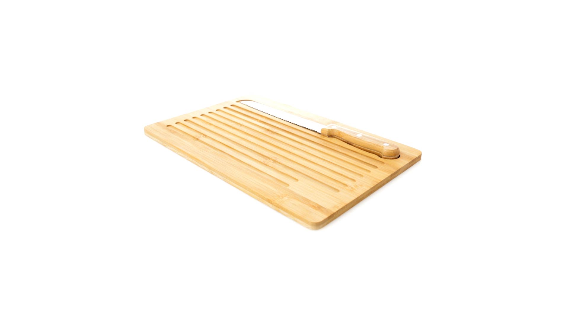 Küchenbrett aus Bambus, inklusive Messer. Mit einer glatten Seite, die für verschiedene Zwecke geeignet ist, und einer gestanzten Seite, ideal zum Schneiden von Brot oder saftigen Lebensmitteln. Inklusive Fach mit Messer darin (Sägestahlklinge und Bambusgriff).