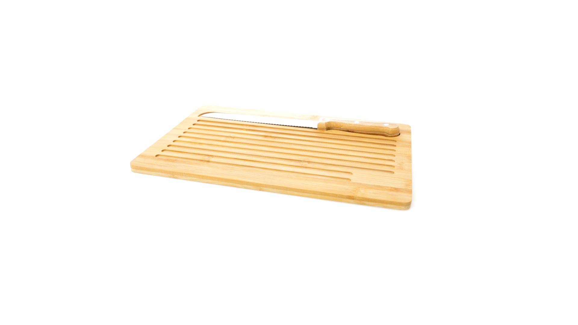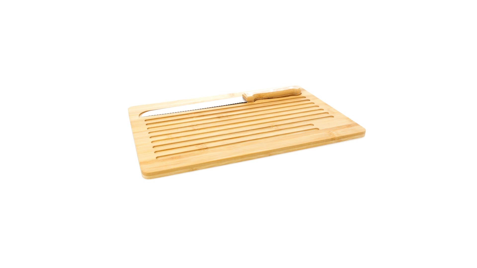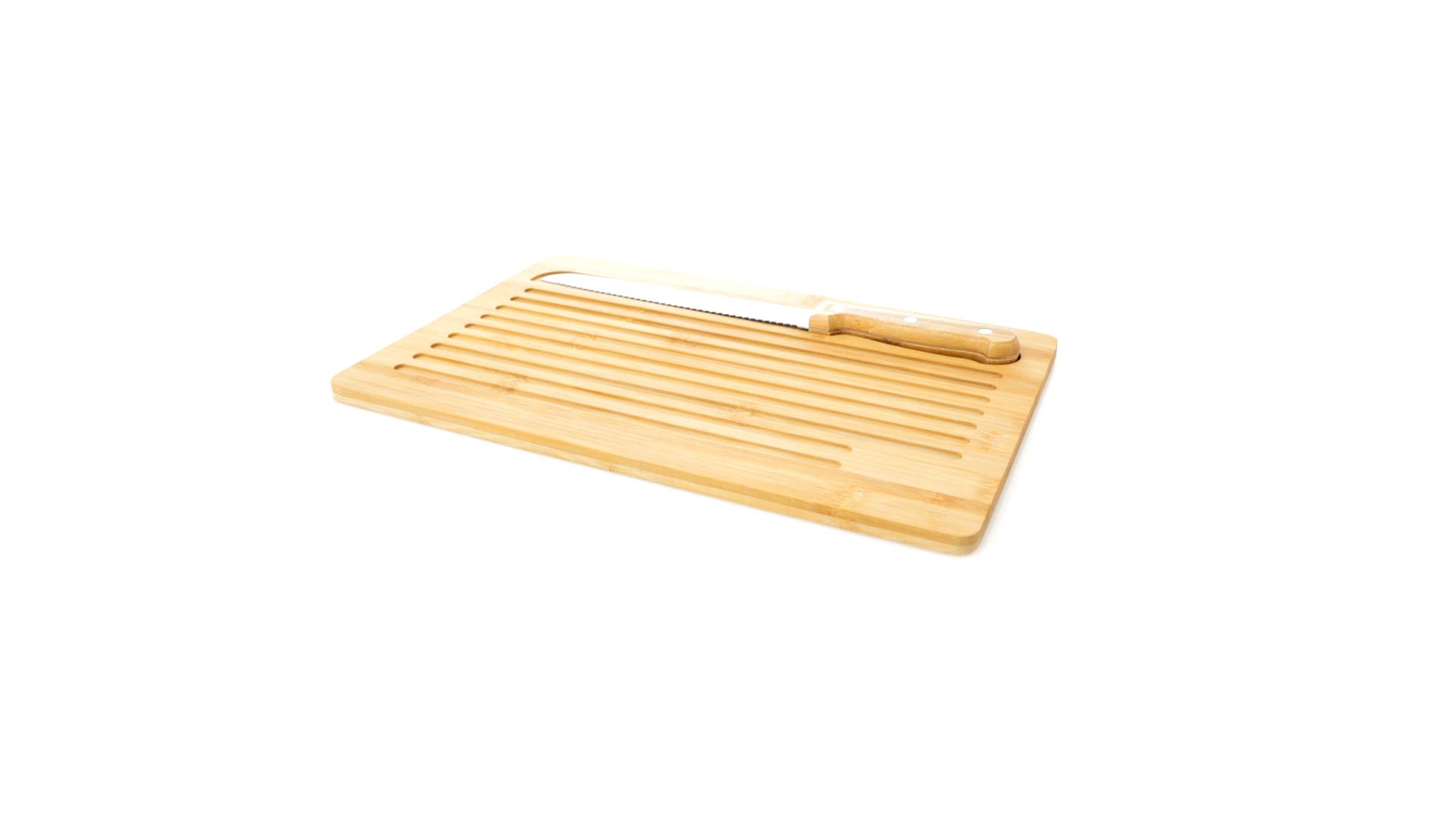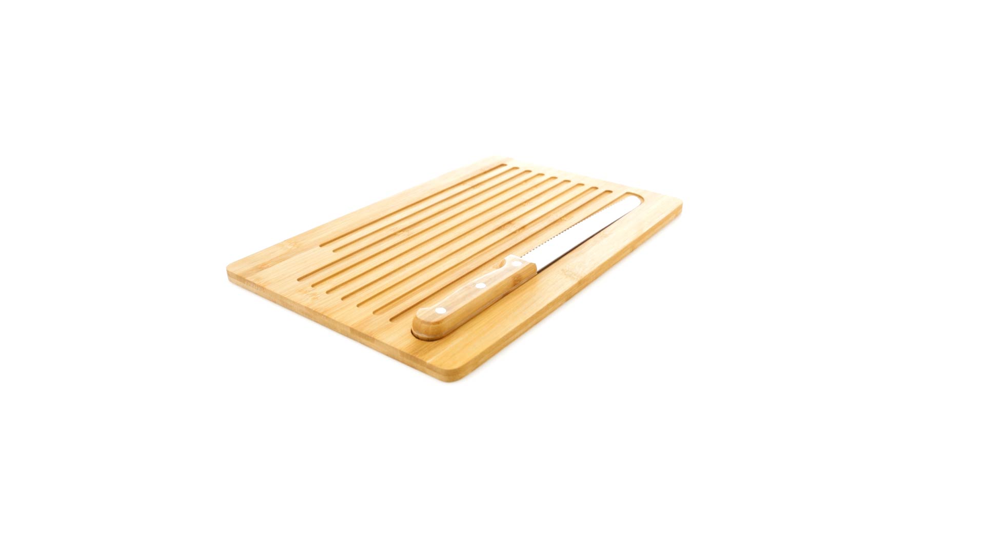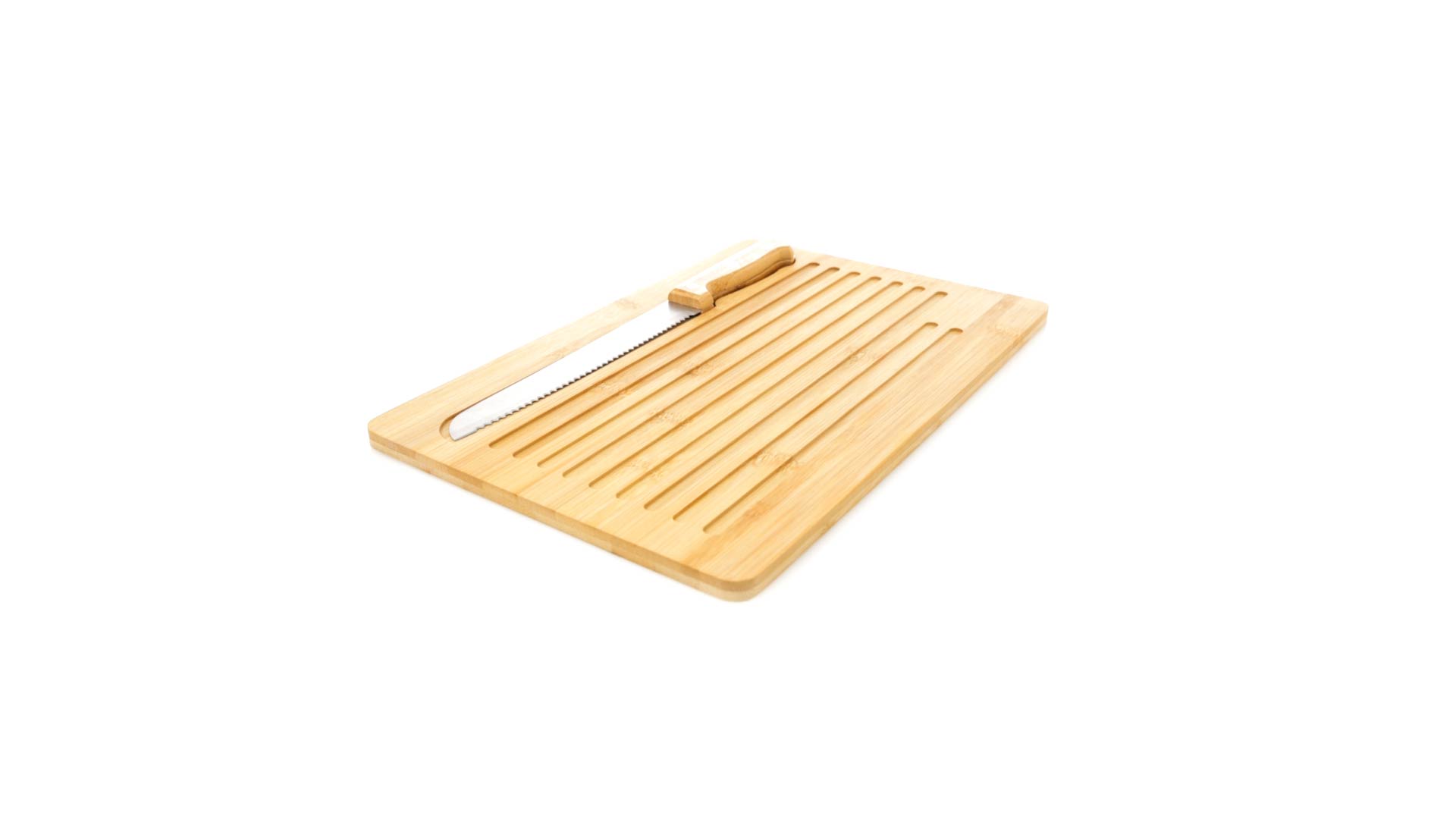 Küchenbrett aus Bambus, inklusive Messer. Mit einer glatten Seite, die für verschiedene Zwecke geeignet ist, und einer gestanzten Seite, ideal zum Schneiden von Brot oder saftigen Lebensmitteln. Inklusive Fach mit Messer darin (Sägestahlklinge und Bambusgriff).