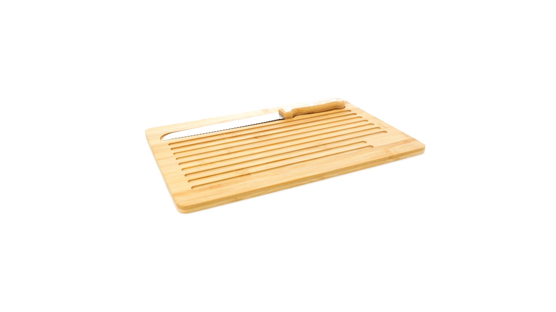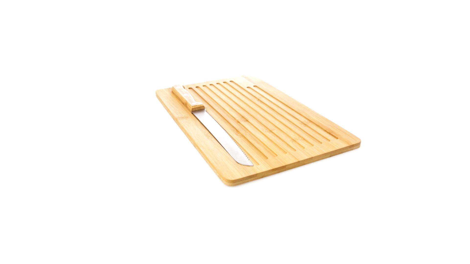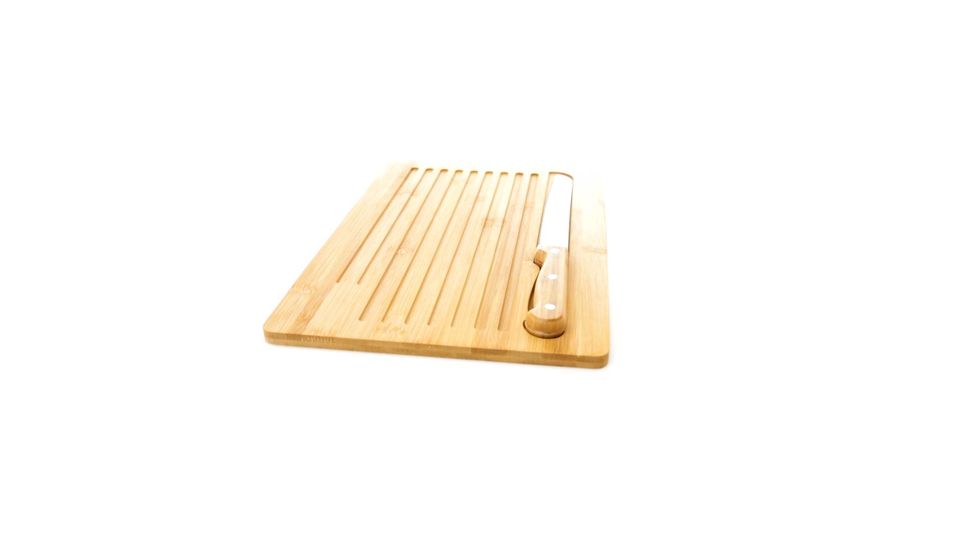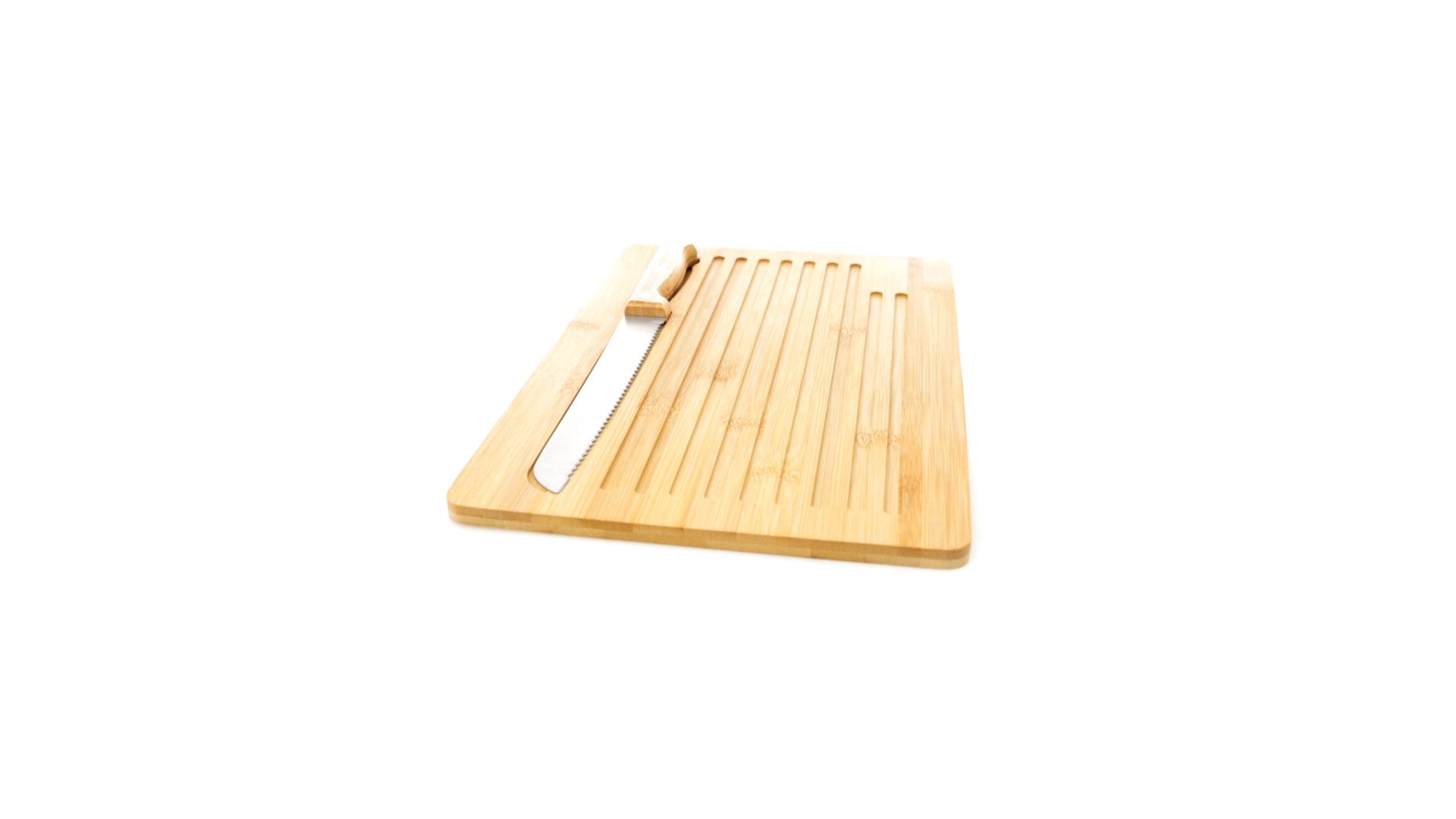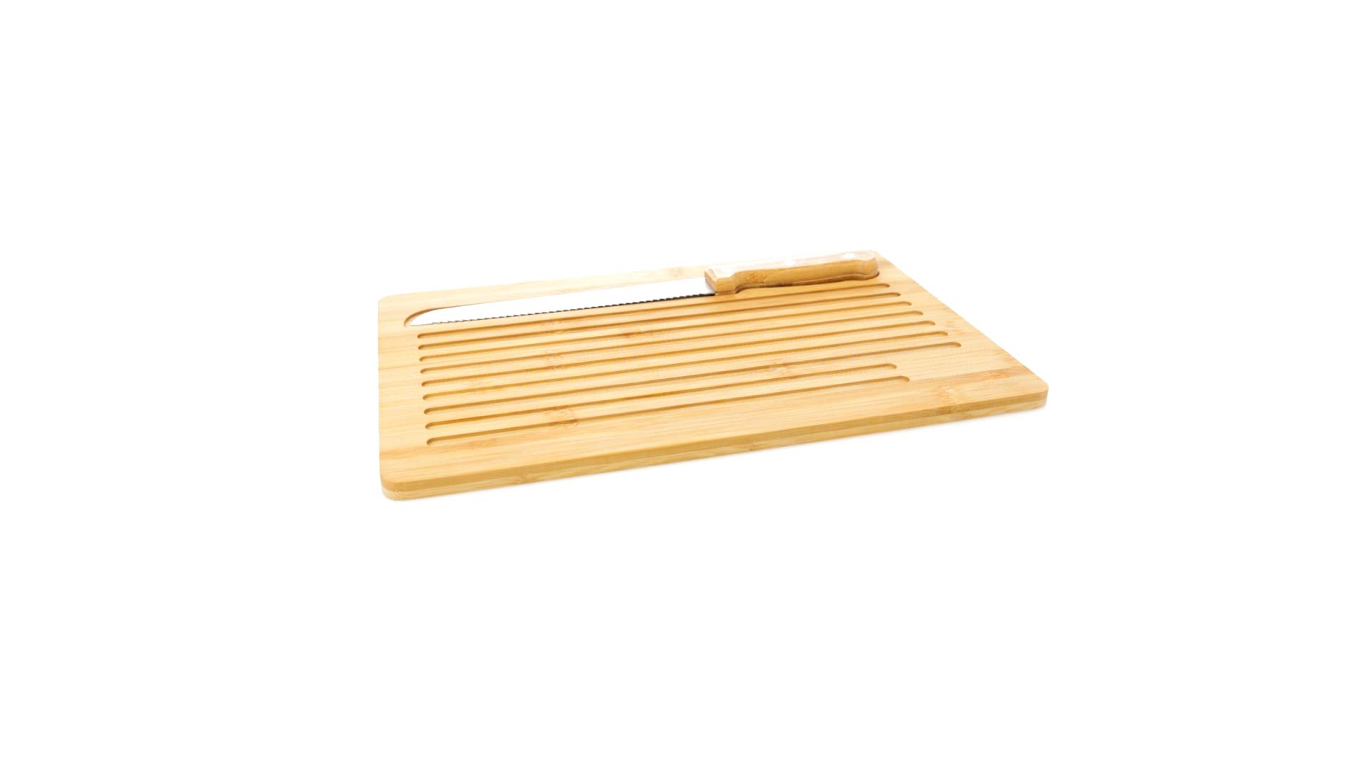Küchenbrett aus Bambus, inklusive Messer. Mit einer glatten Seite, die für verschiedene Zwecke geeignet ist, und einer gestanzten Seite, ideal zum Schneiden von Brot oder saftigen Lebensmitteln. Inklusive Fach mit Messer darin (Sägestahlklinge und Bambusgriff).