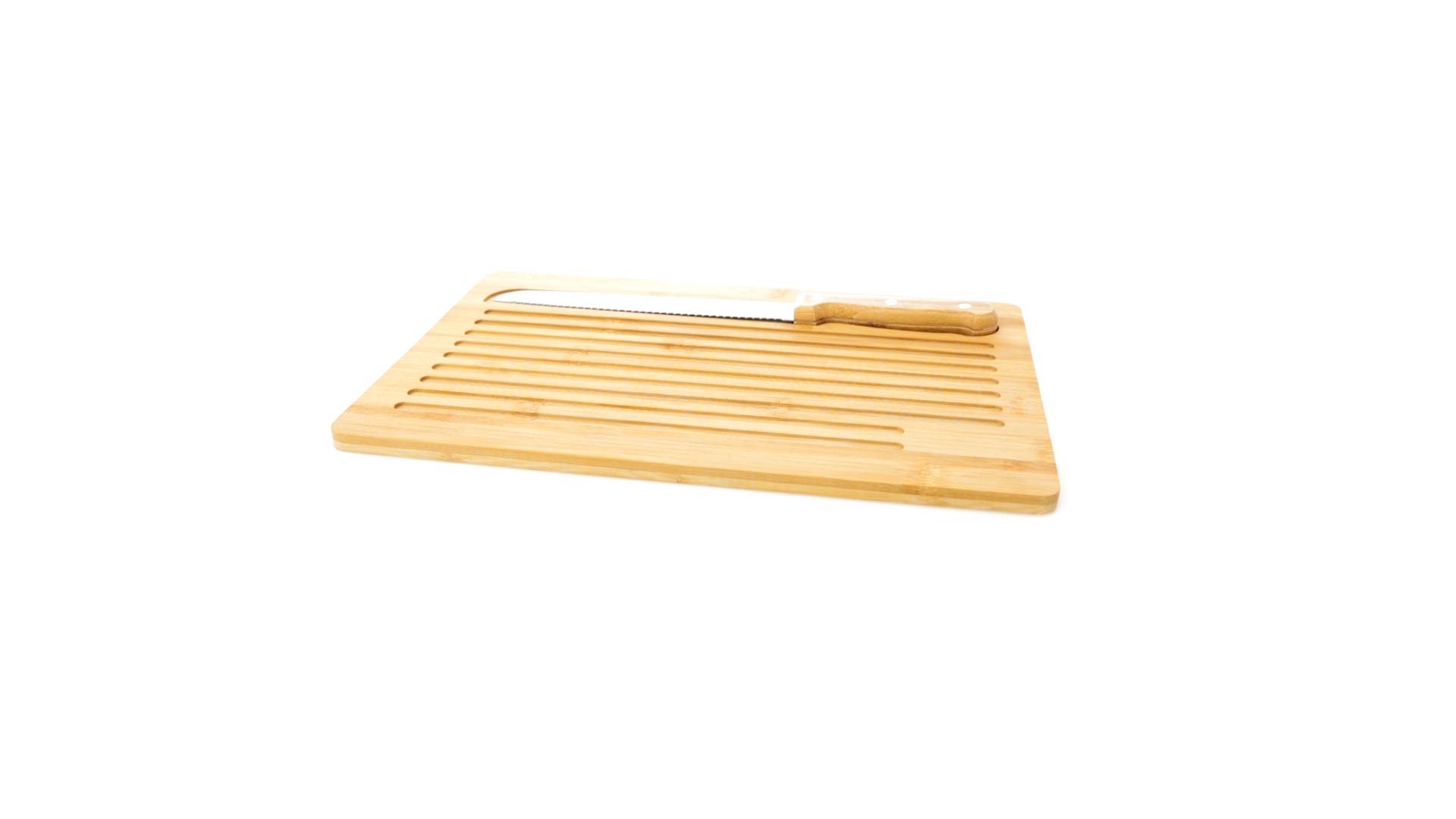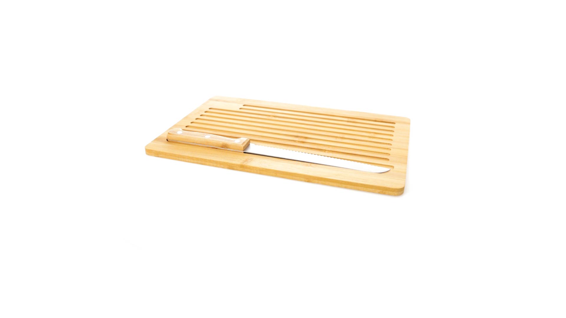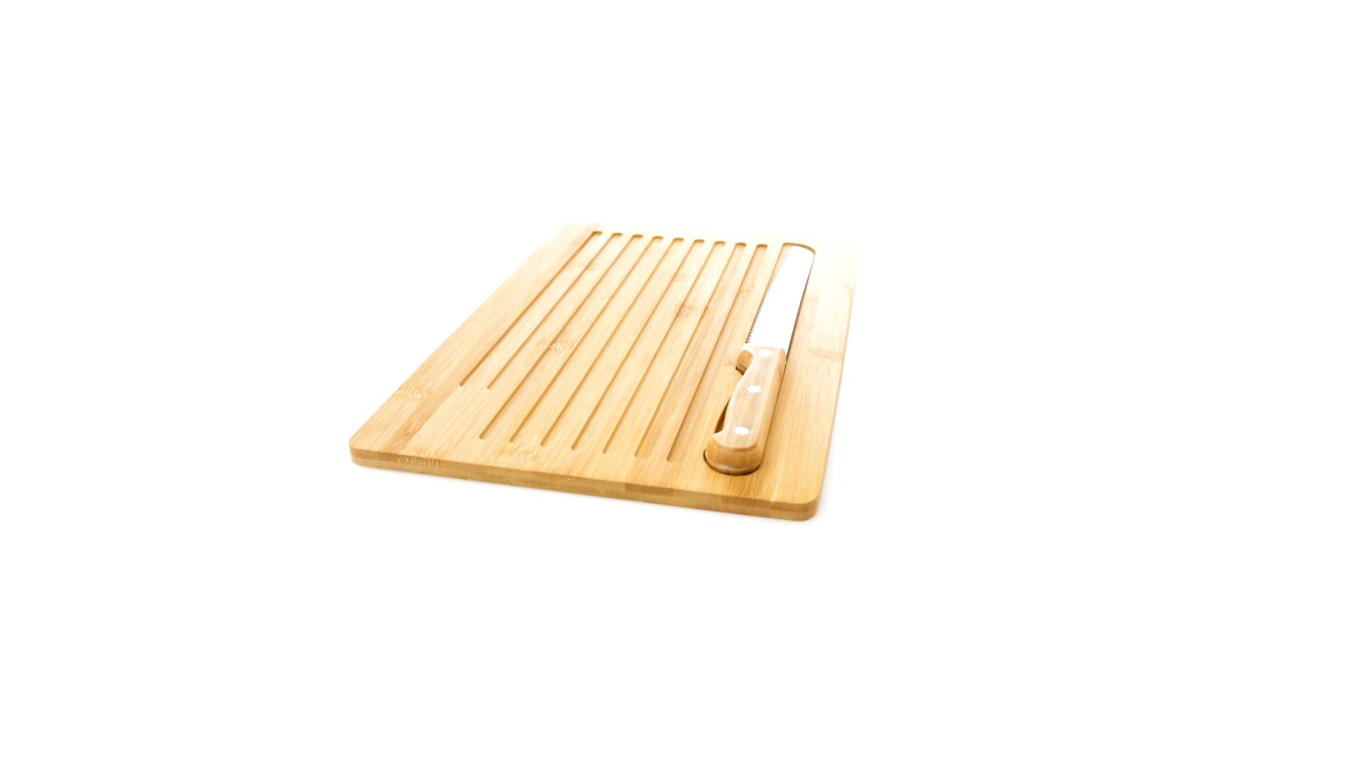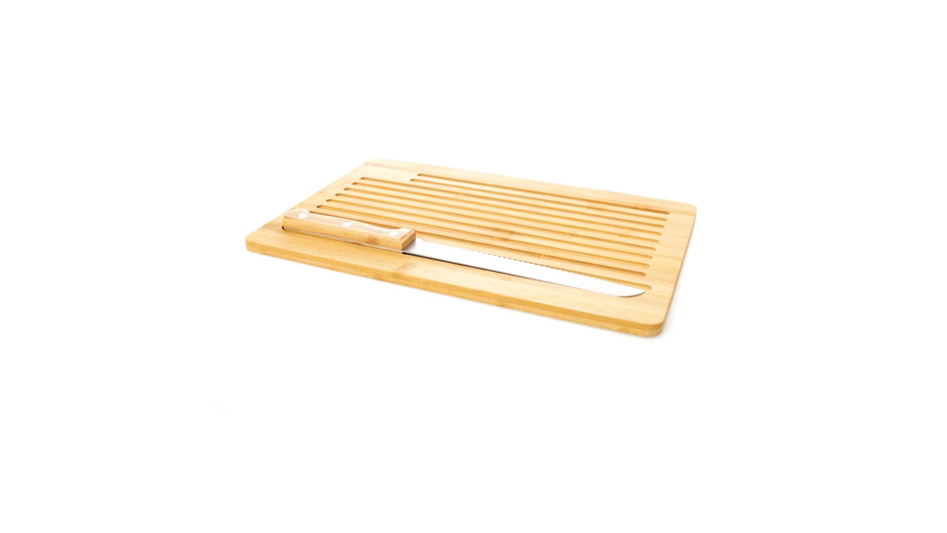Küchenbrett aus Bambus, inklusive Messer. Mit einer glatten Seite, die für verschiedene Zwecke geeignet ist, und einer gestanzten Seite, ideal zum Schneiden von Brot oder saftigen Lebensmitteln. Inklusive Fach mit Messer darin (Sägestahlklinge und Bambusgriff).