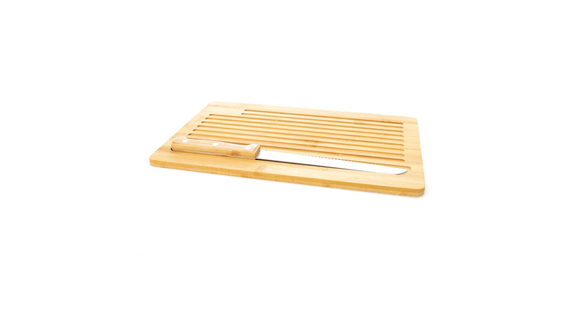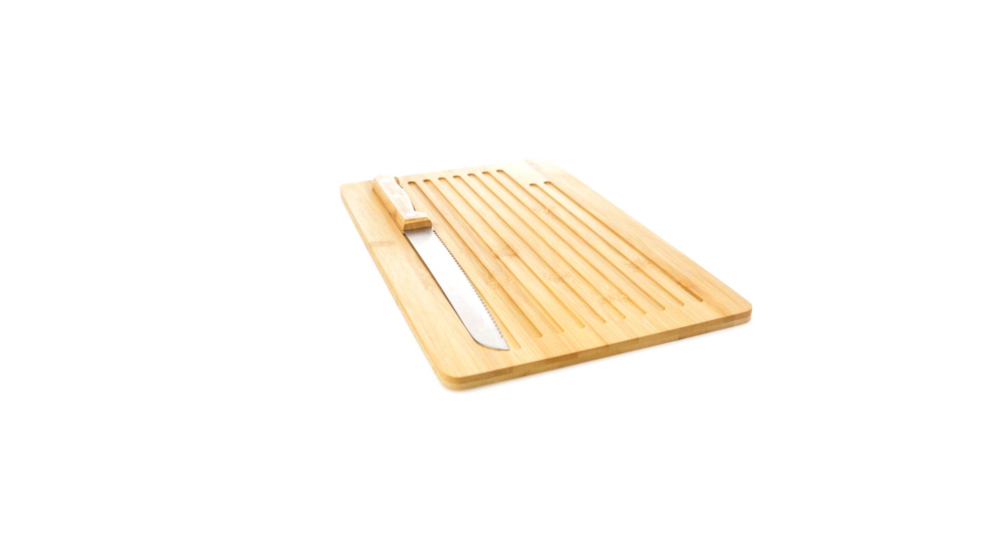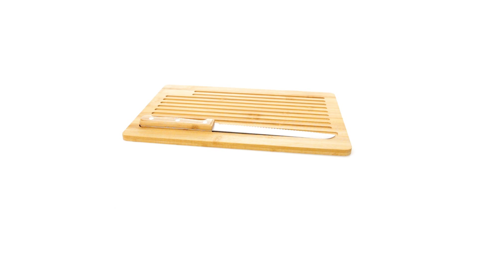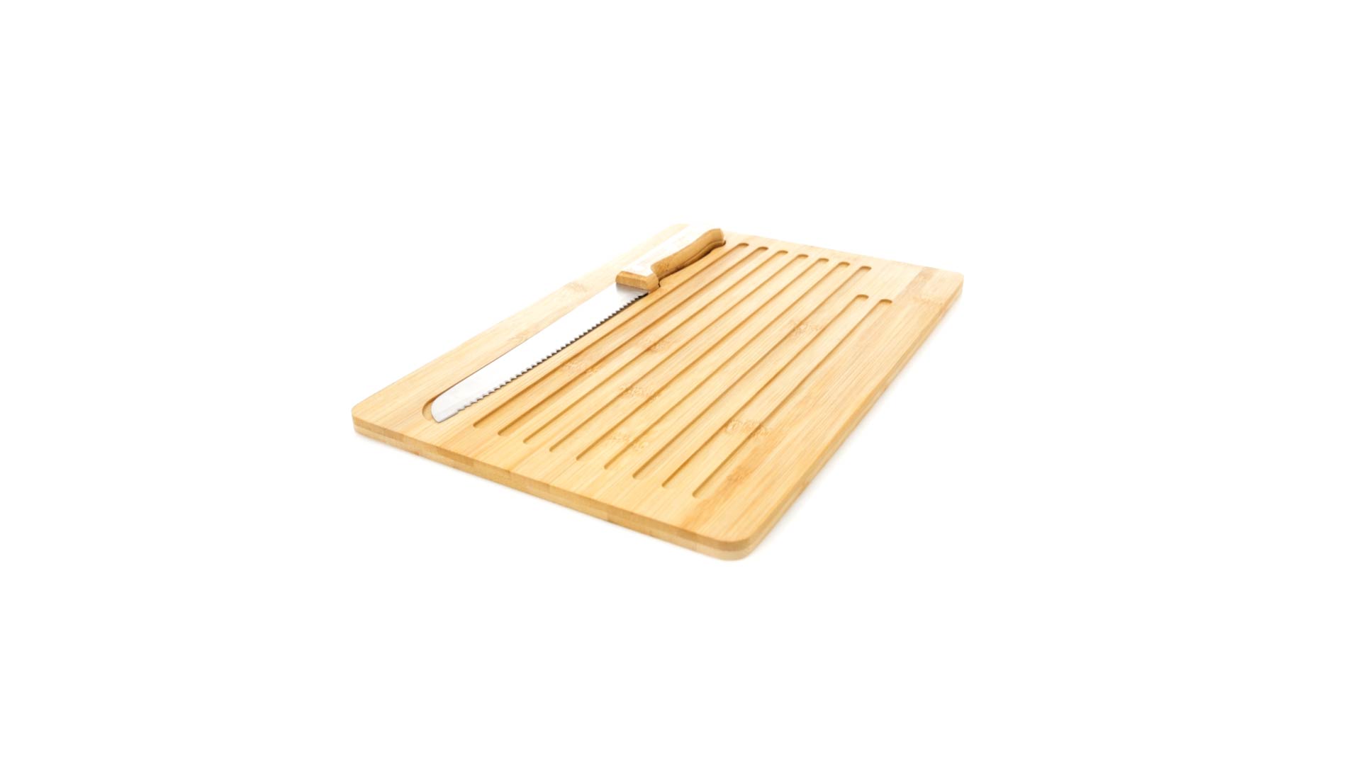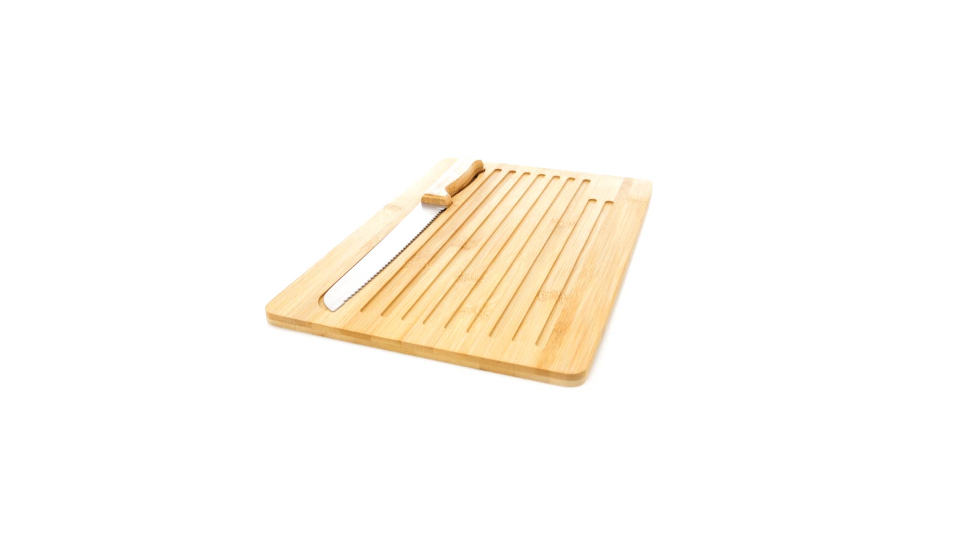 Küchenbrett aus Bambus, inklusive Messer. Mit einer glatten Seite, die für verschiedene Zwecke geeignet ist, und einer gestanzten Seite, ideal zum Schneiden von Brot oder saftigen Lebensmitteln. Inklusive Fach mit Messer darin (Sägestahlklinge und Bambusgriff).