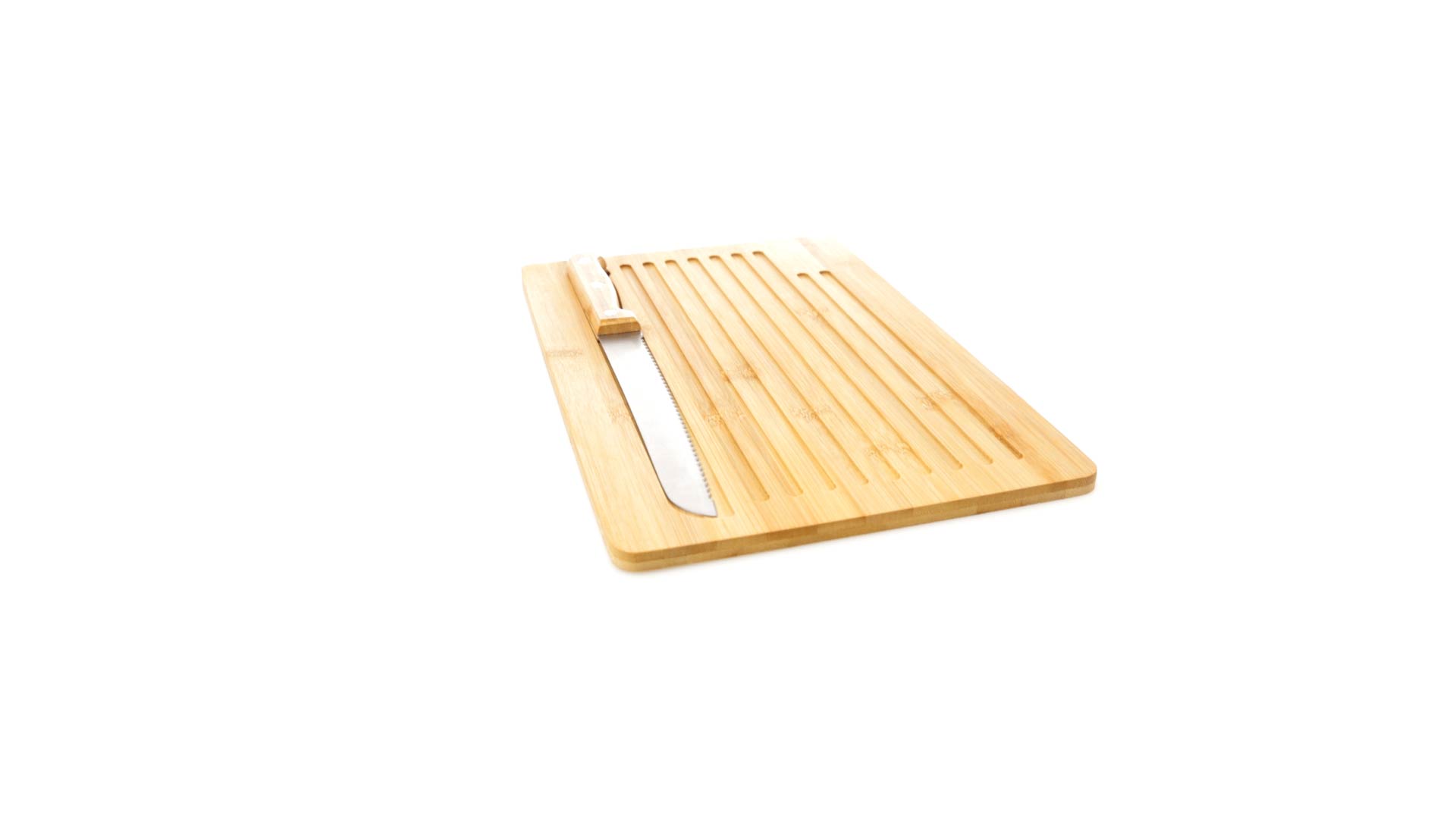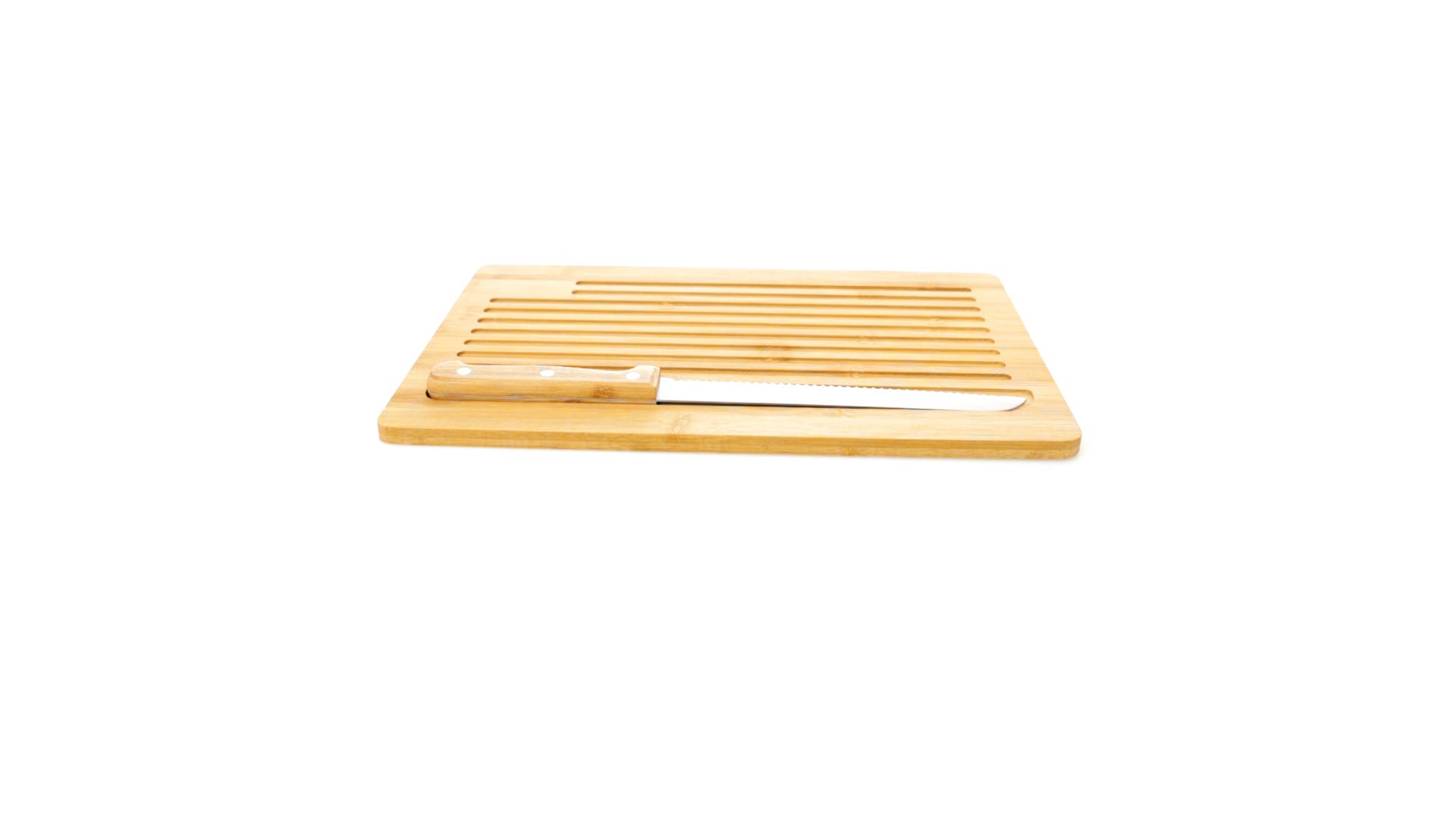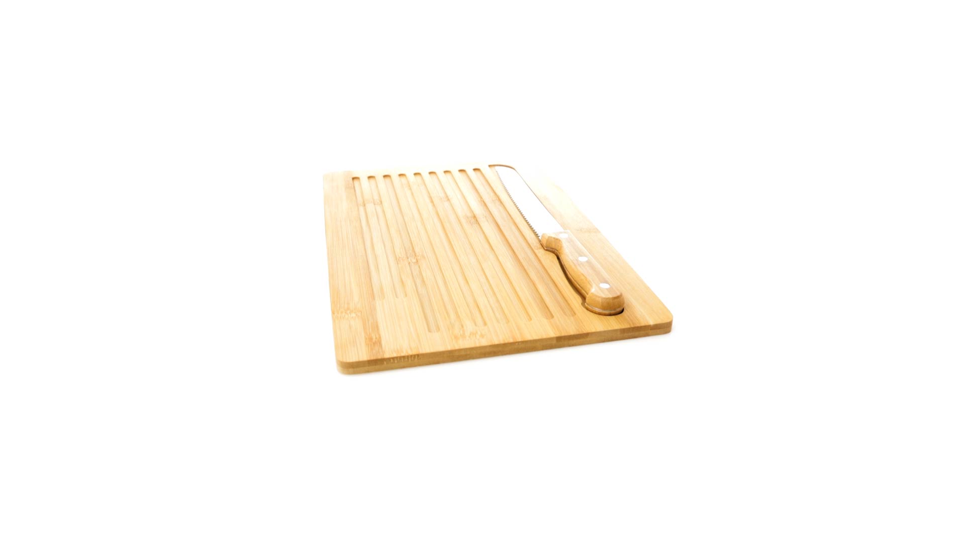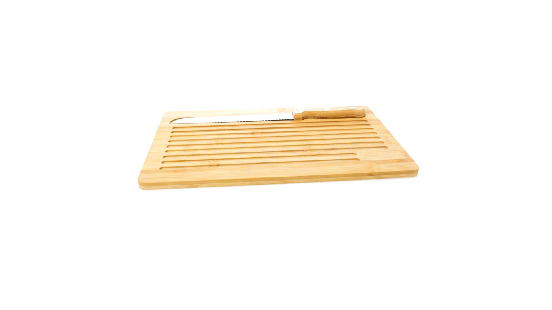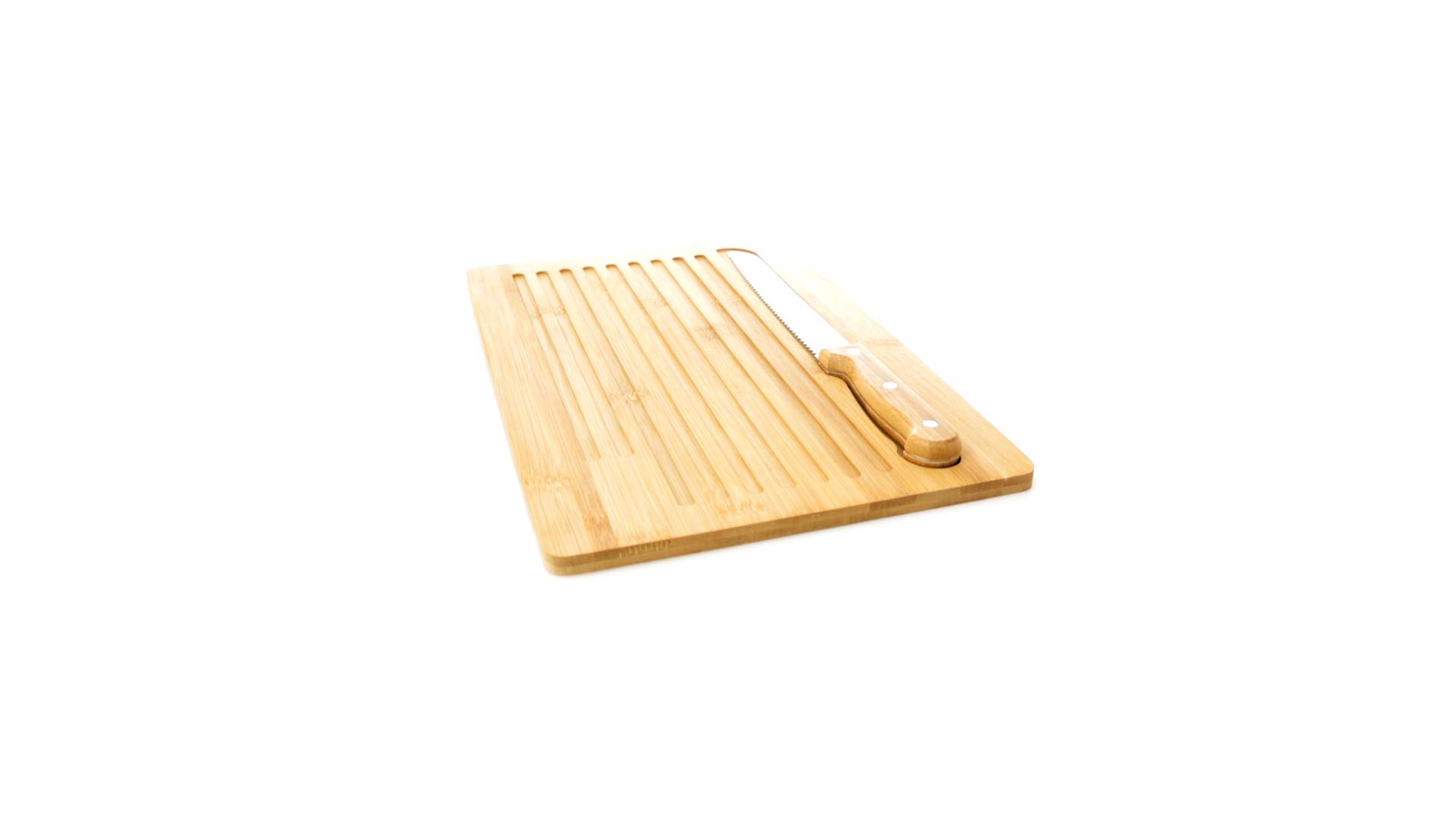 Küchenbrett aus Bambus, inklusive Messer. Mit einer glatten Seite, die für verschiedene Zwecke geeignet ist, und einer gestanzten Seite, ideal zum Schneiden von Brot oder saftigen Lebensmitteln. Inklusive Fach mit Messer darin (Sägestahlklinge und Bambusgriff).