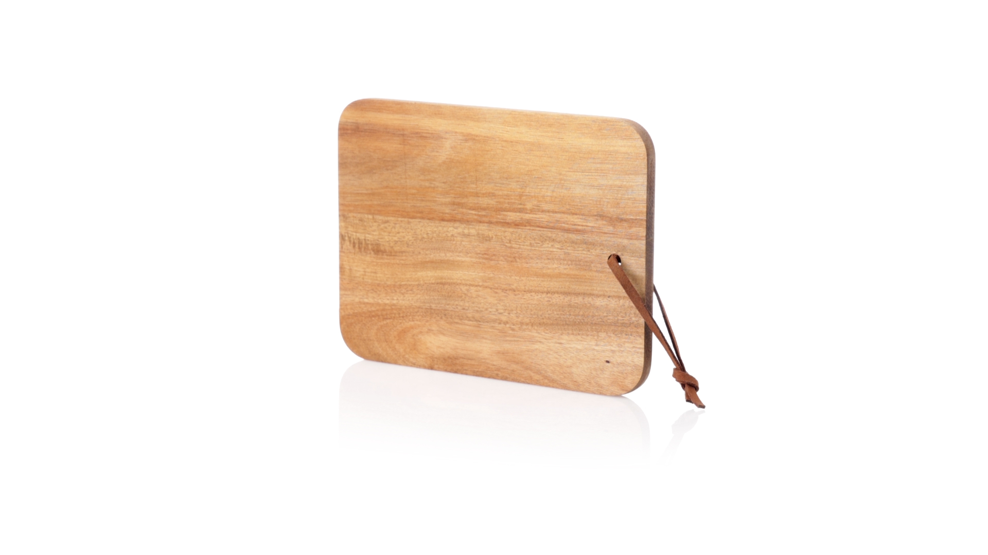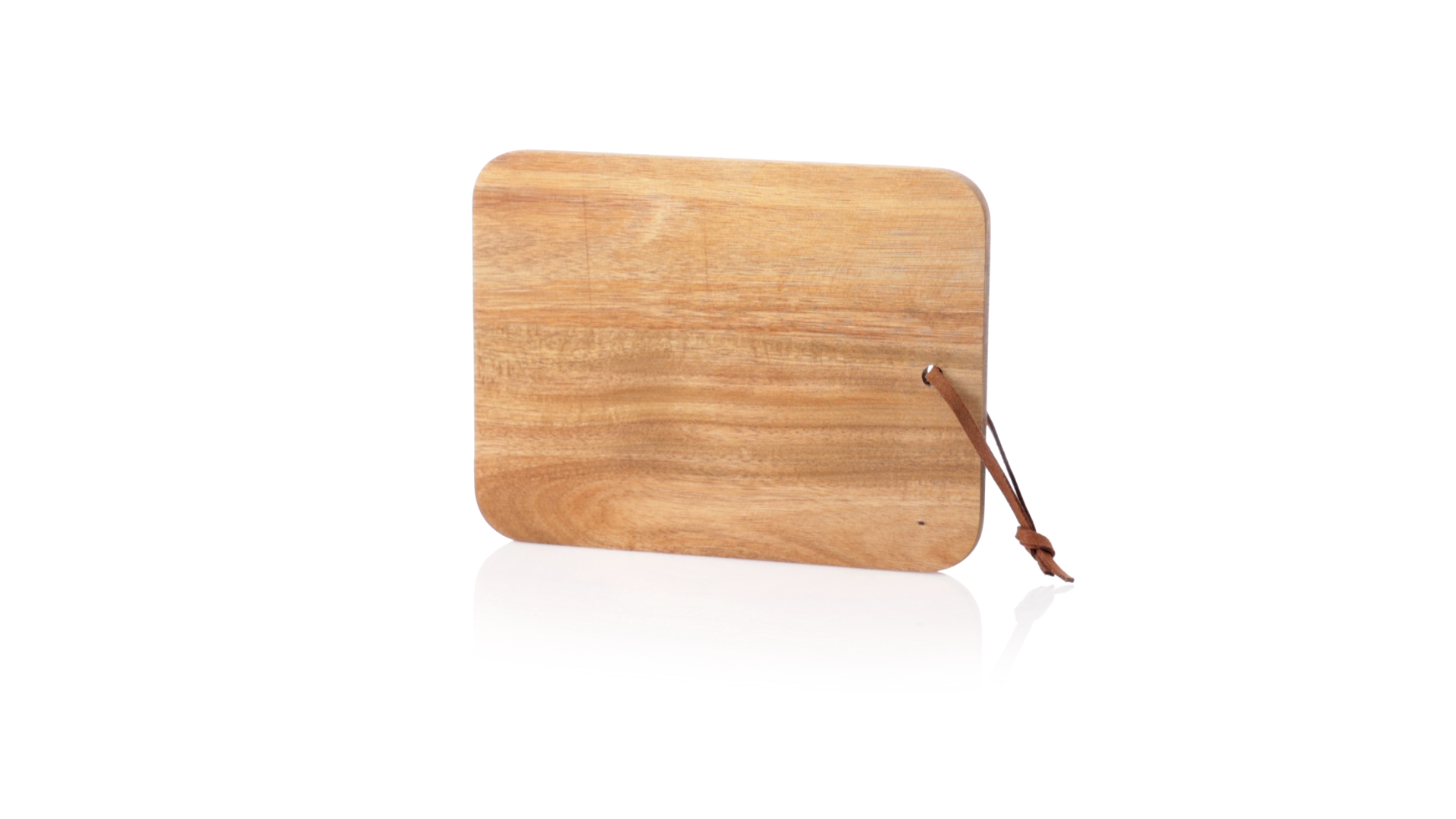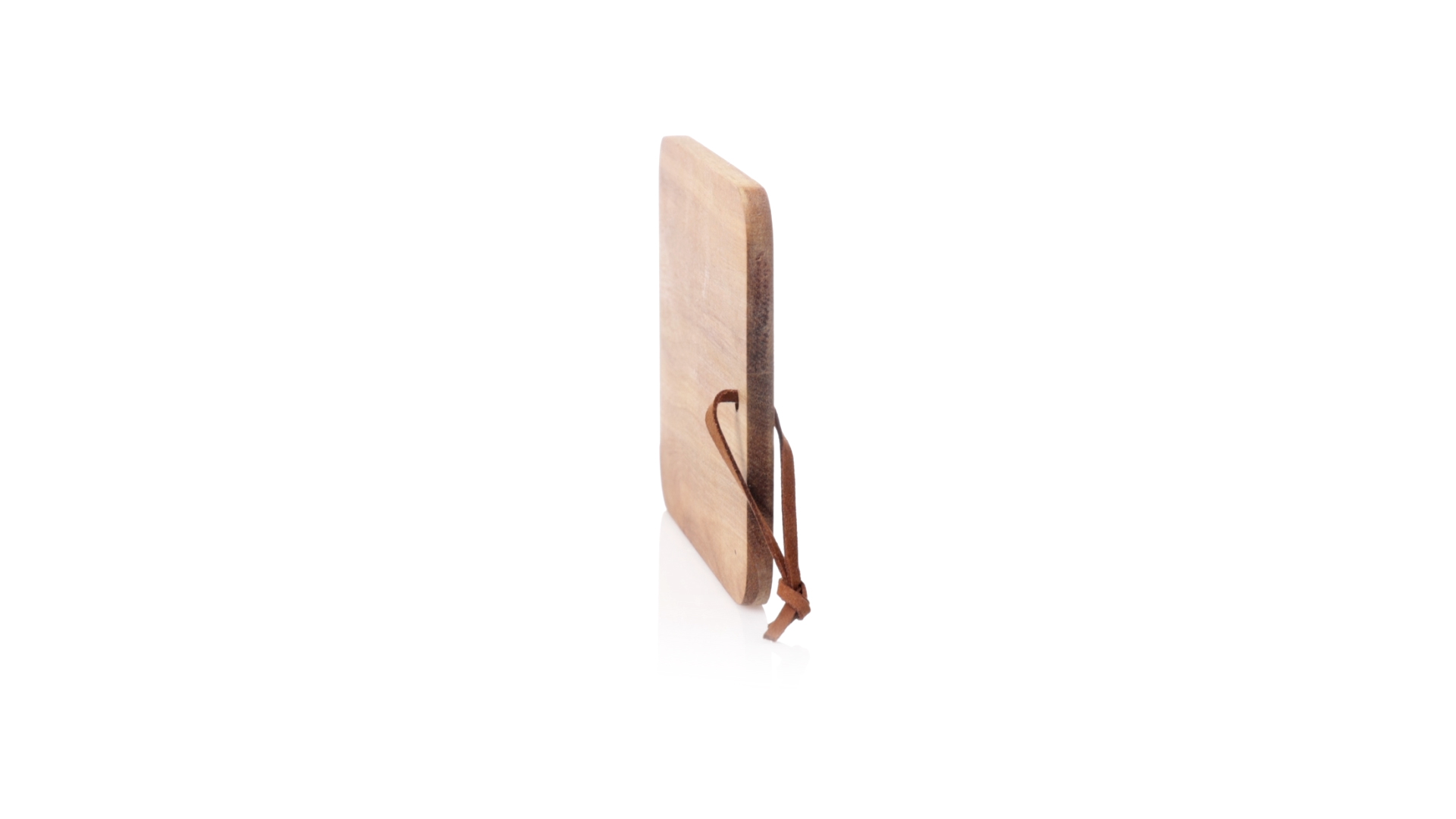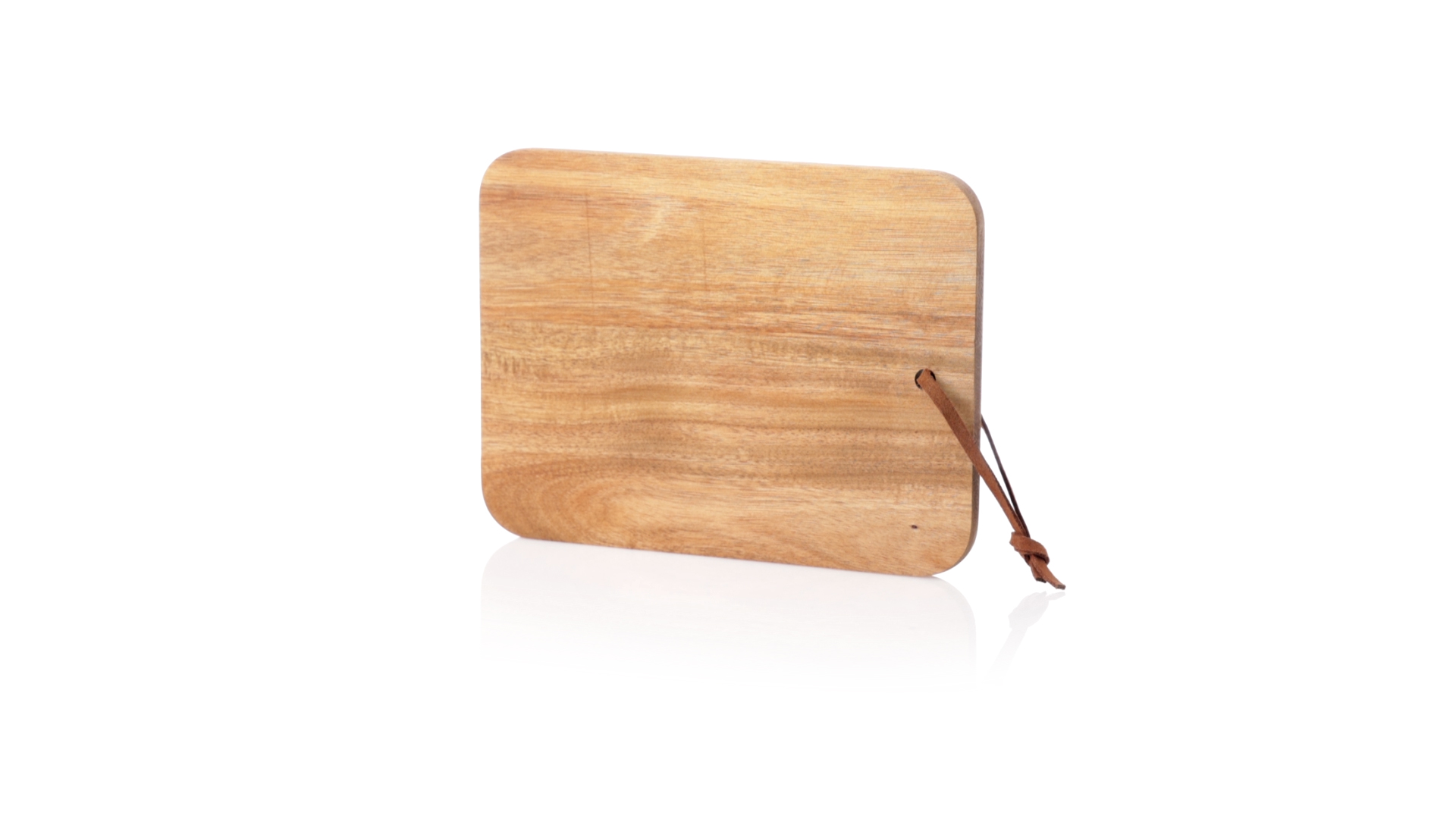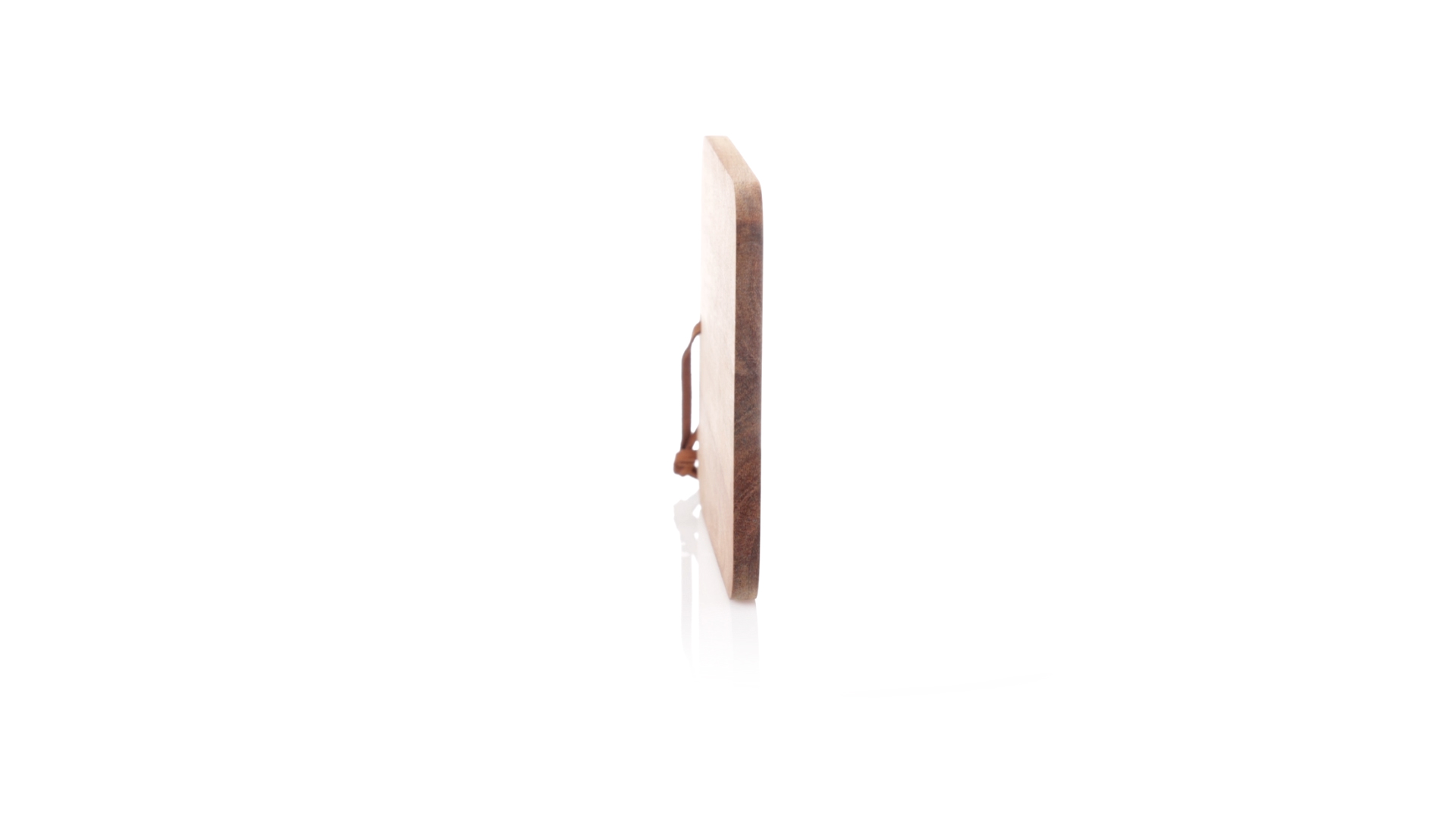 Schneide- und Präsentationsbrett aus Naturholz. Im rechteckigen Format, mit passender Kordel aus strapazierfähigem Kunstleder.