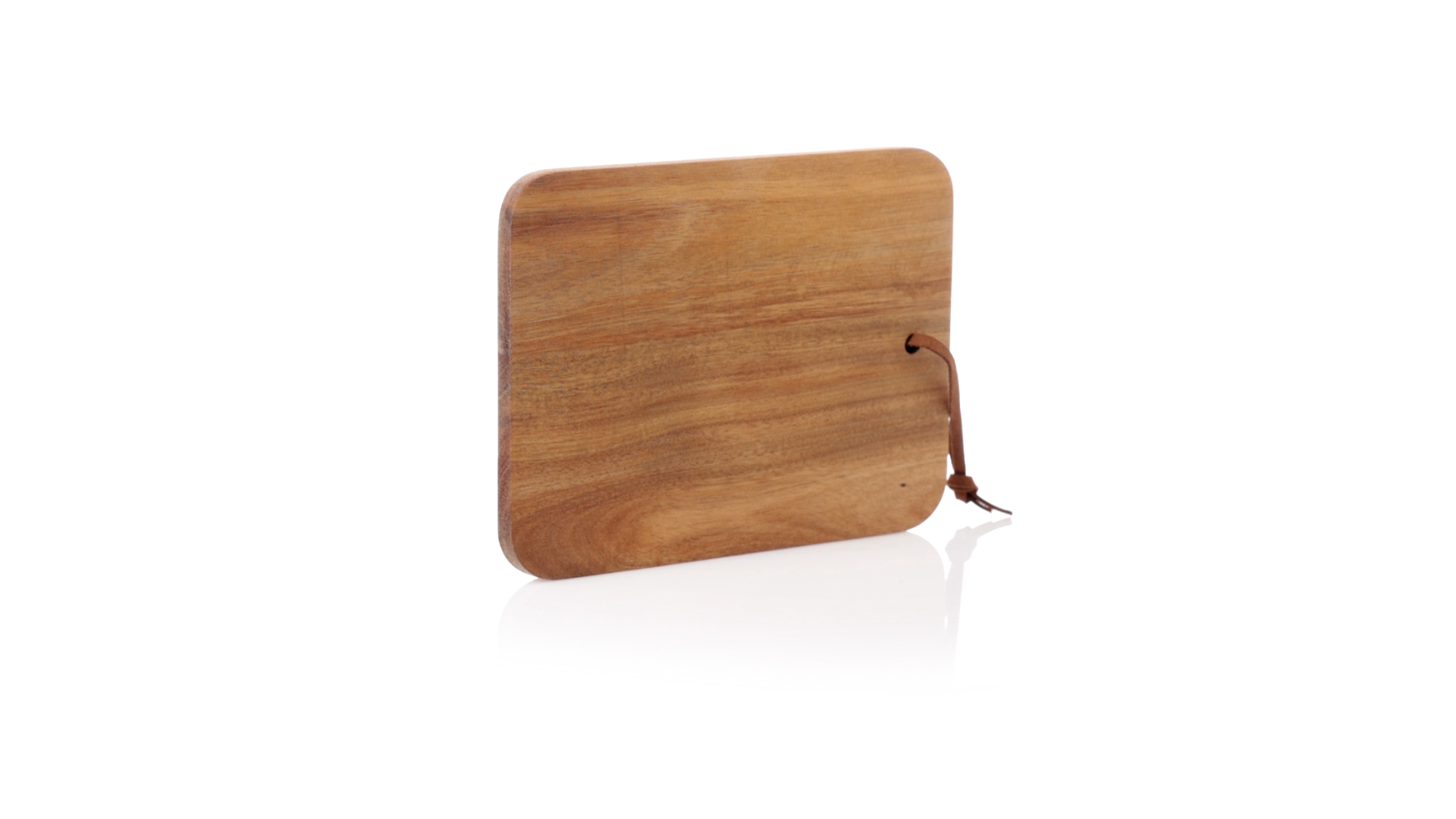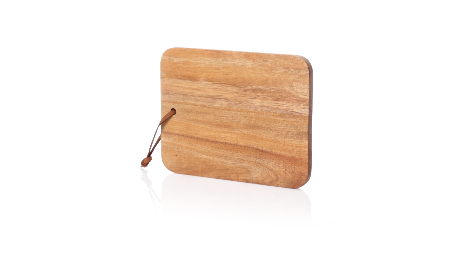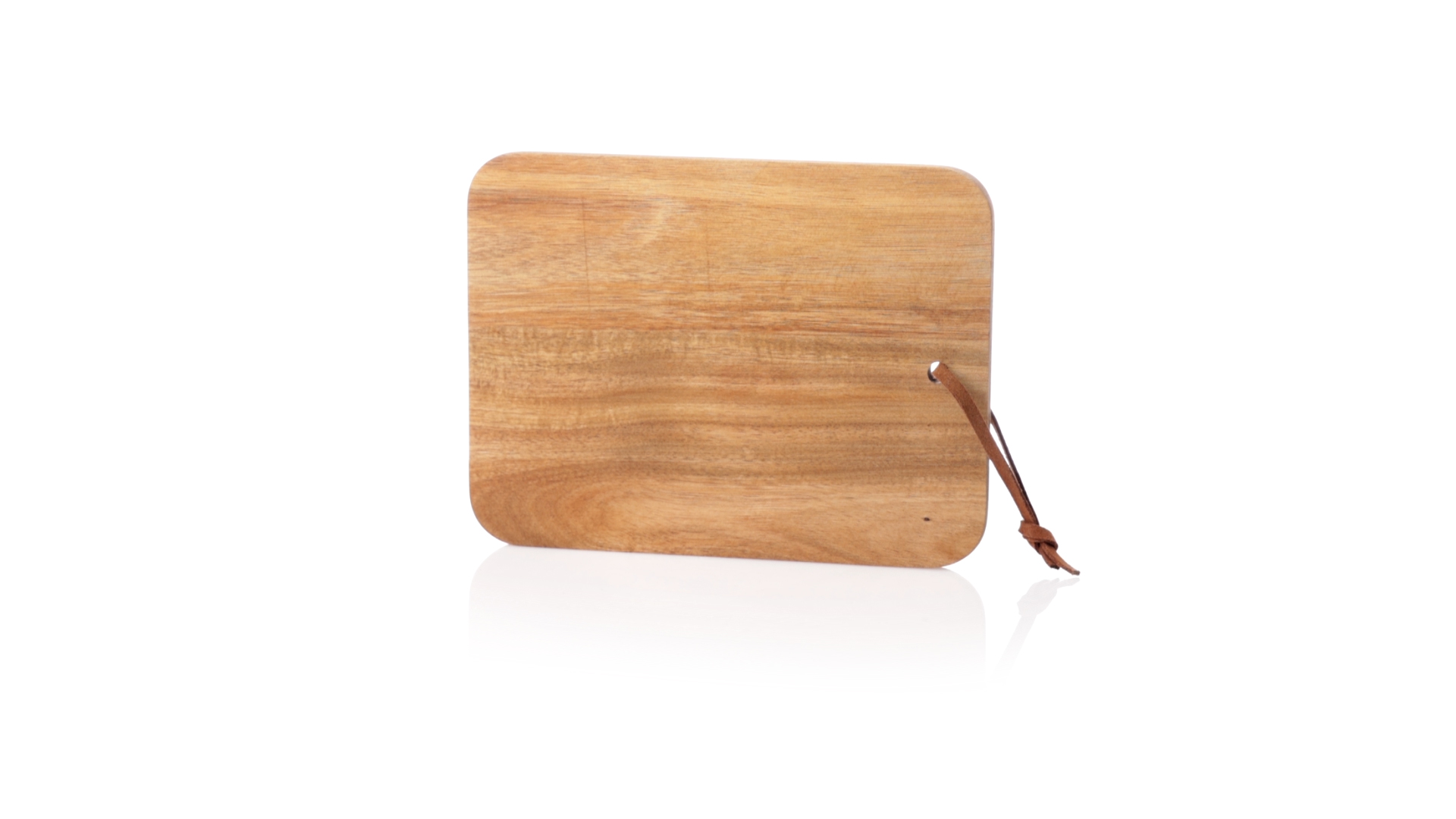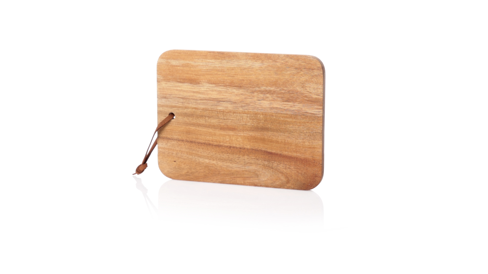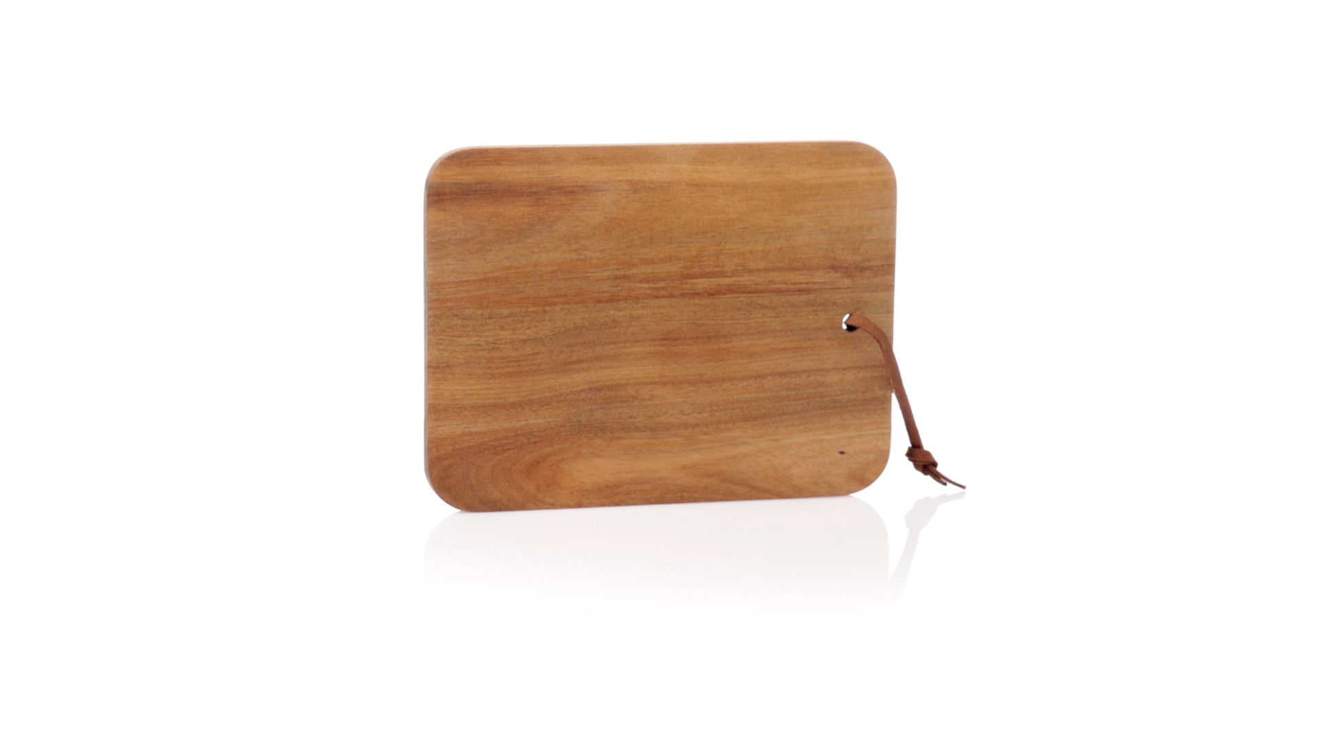 Schneide- und Präsentationsbrett aus Naturholz. Im rechteckigen Format, mit passender Kordel aus strapazierfähigem Kunstleder.