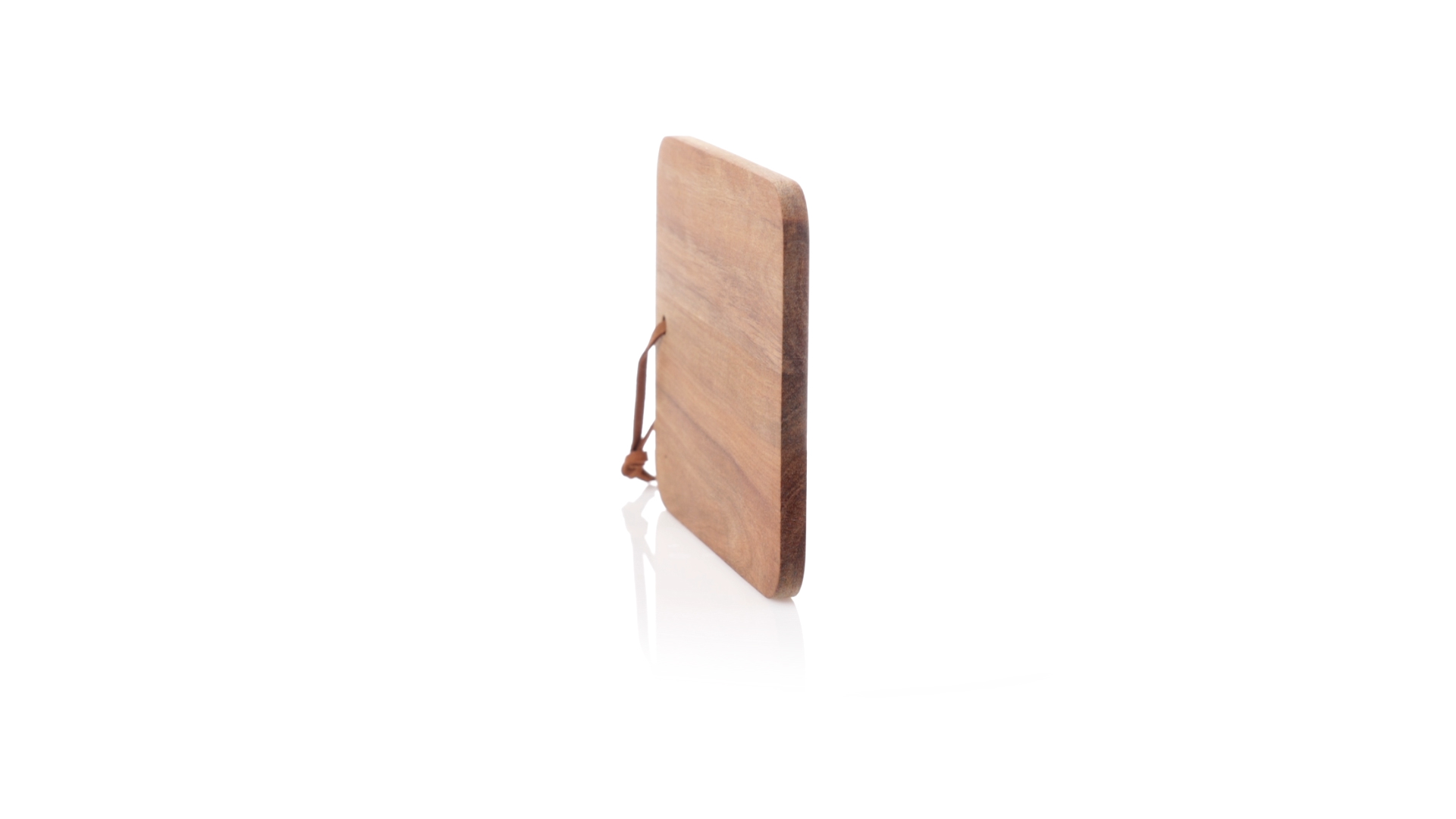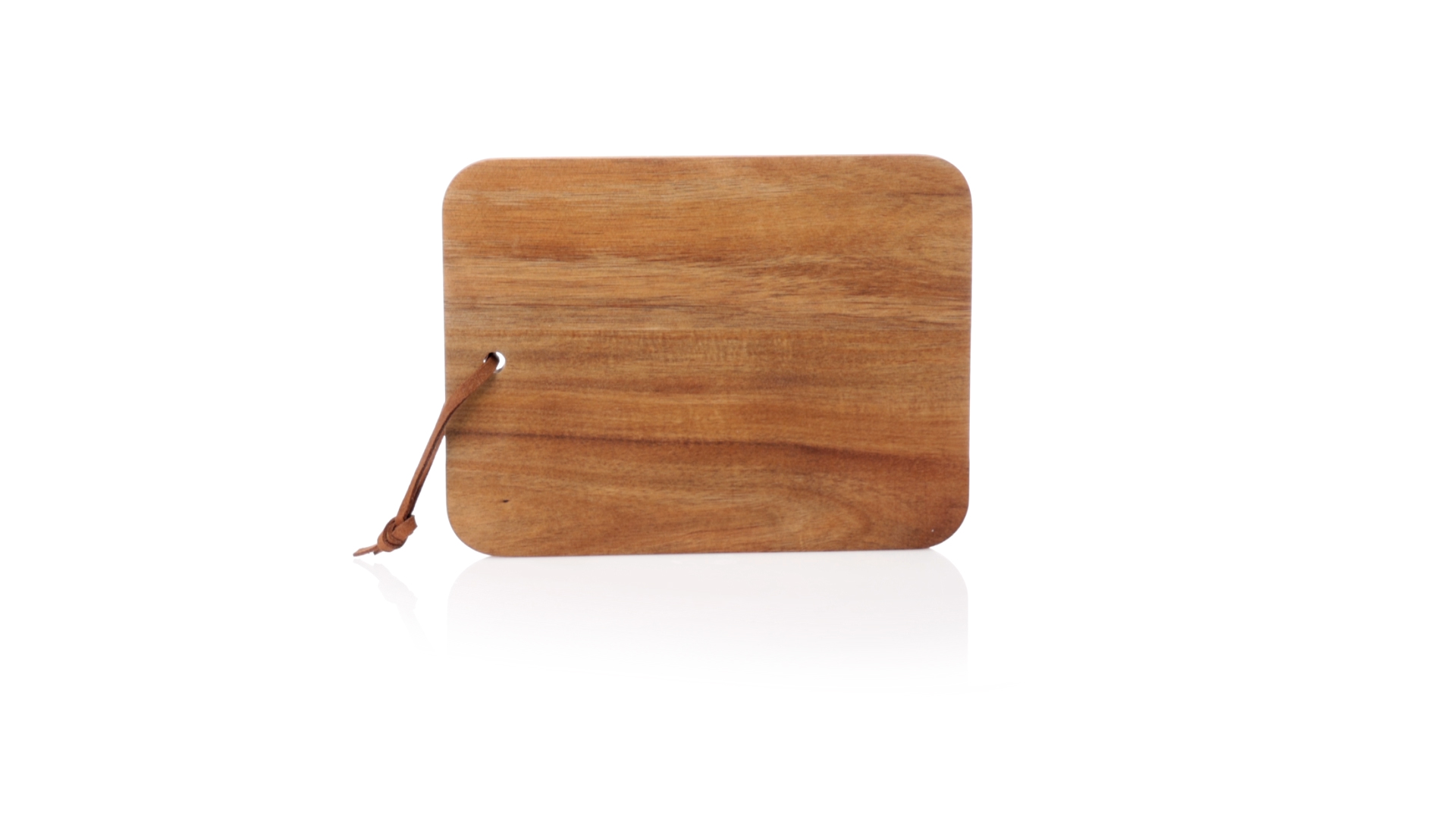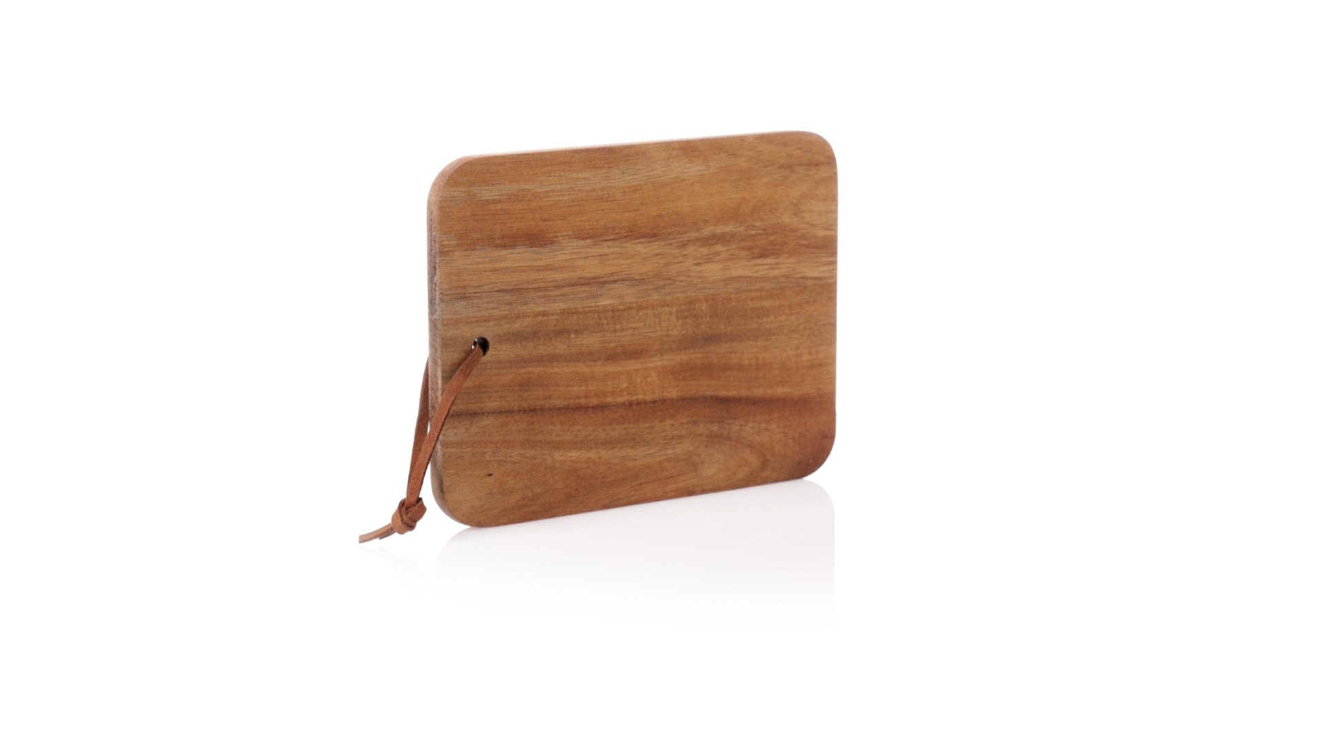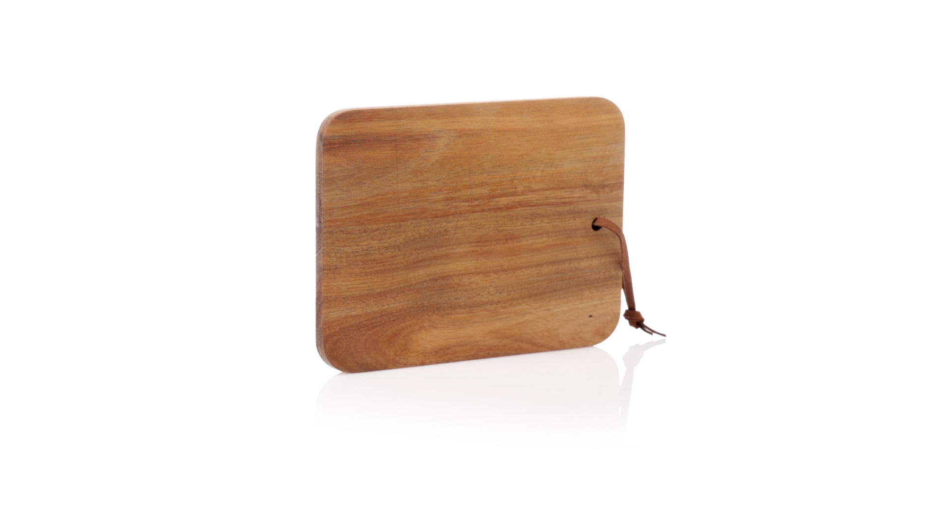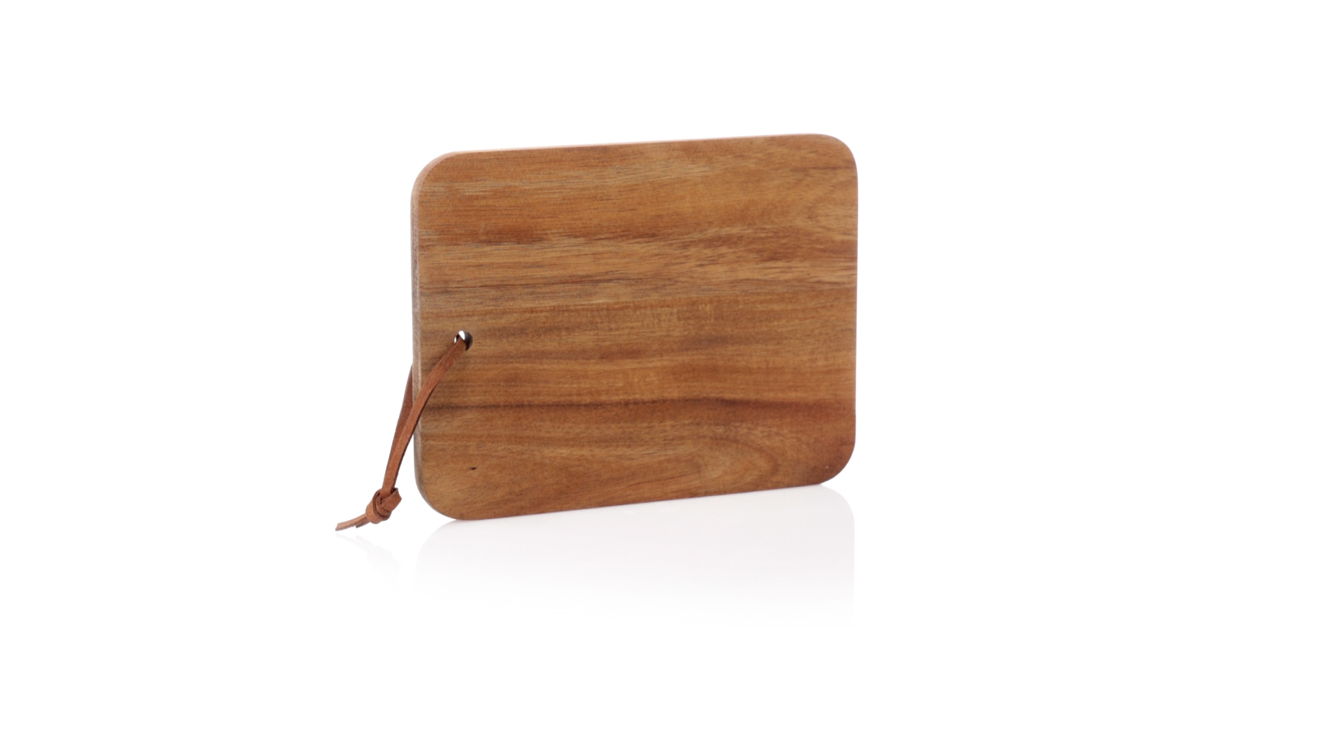 Schneide- und Präsentationsbrett aus Naturholz. Im rechteckigen Format, mit passender Kordel aus strapazierfähigem Kunstleder.