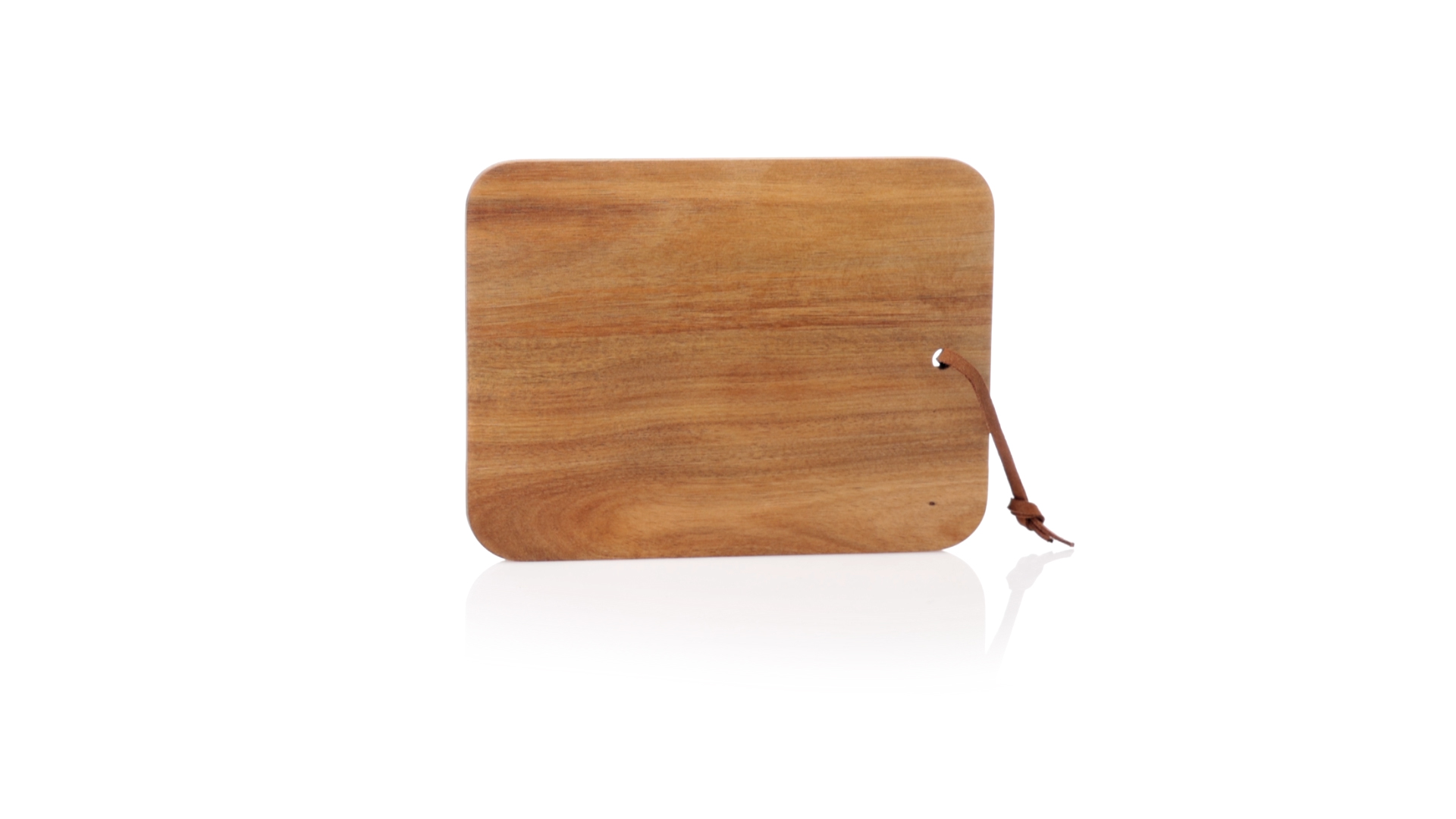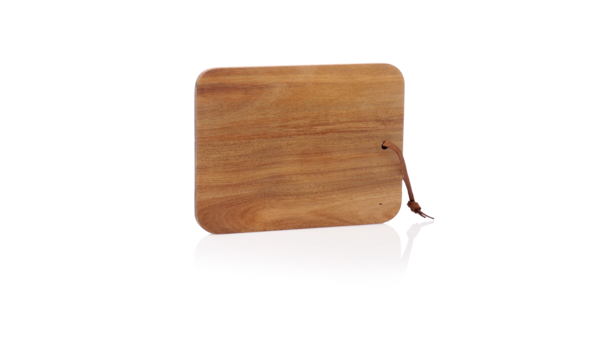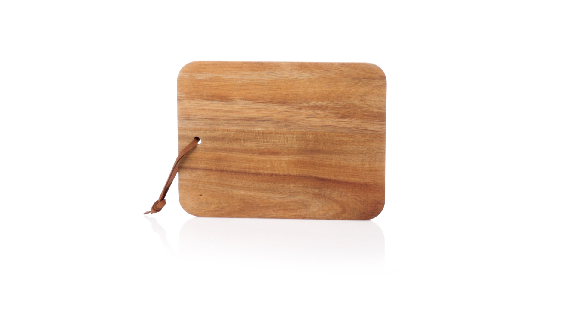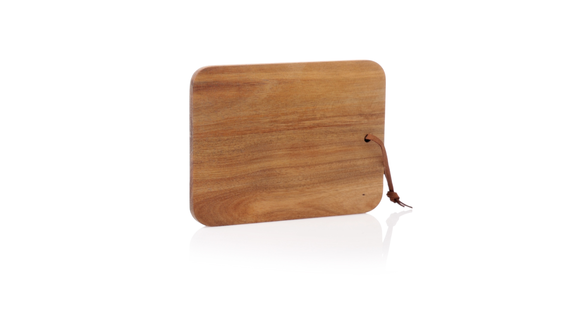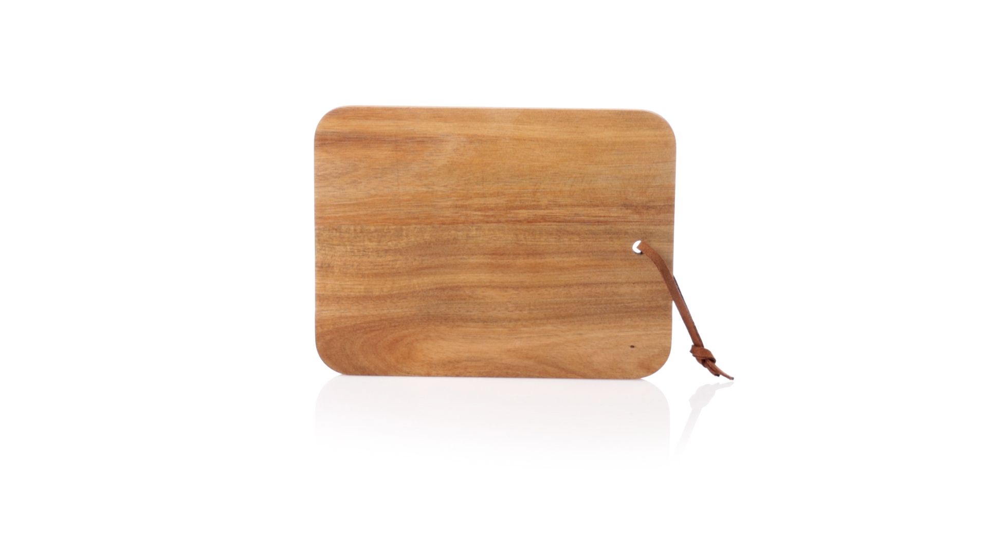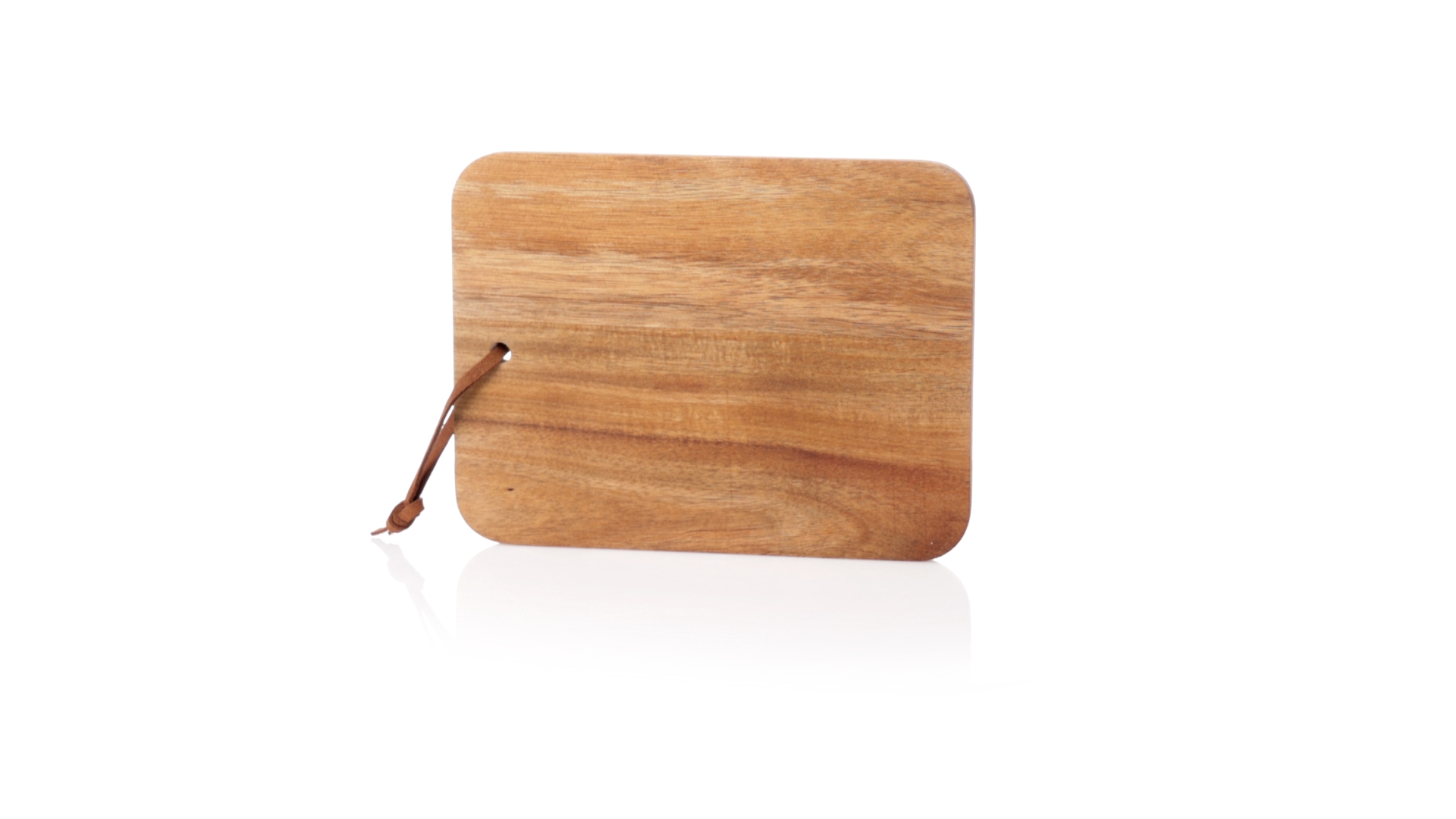 Schneide- und Präsentationsbrett aus Naturholz. Im rechteckigen Format, mit passender Kordel aus strapazierfähigem Kunstleder.