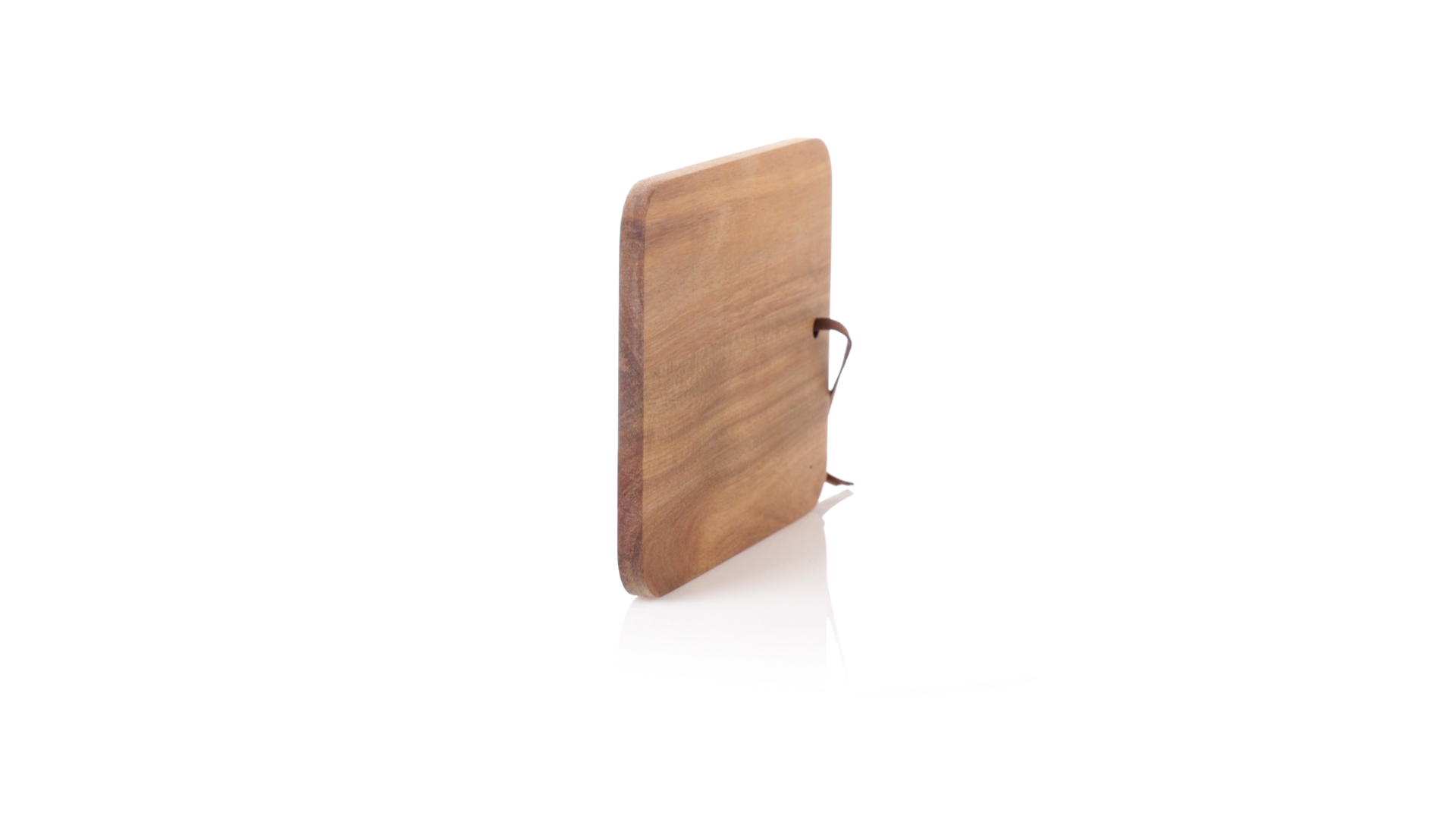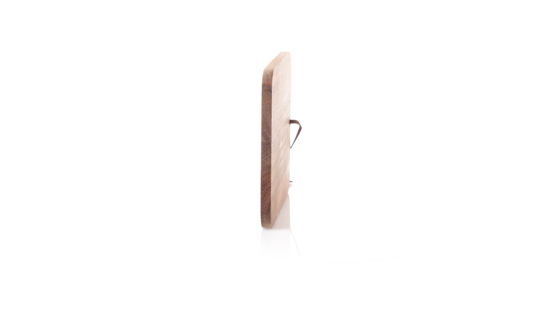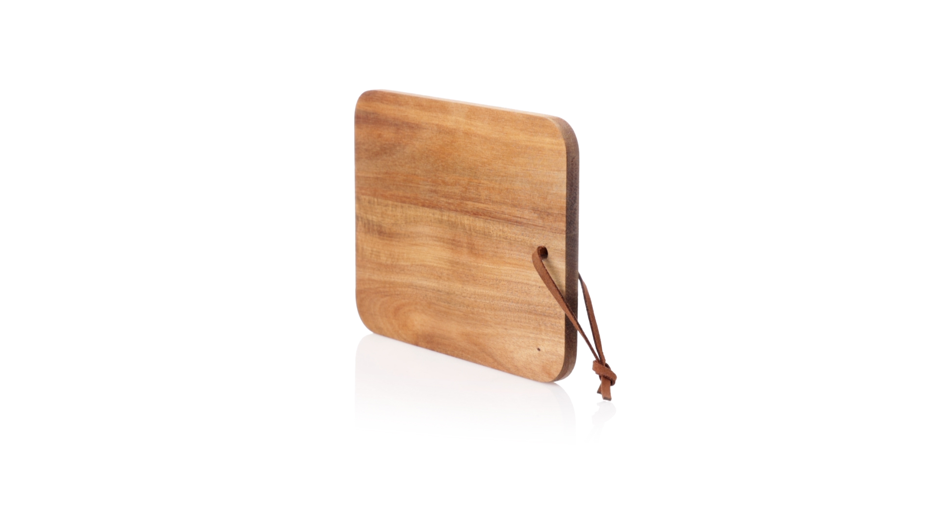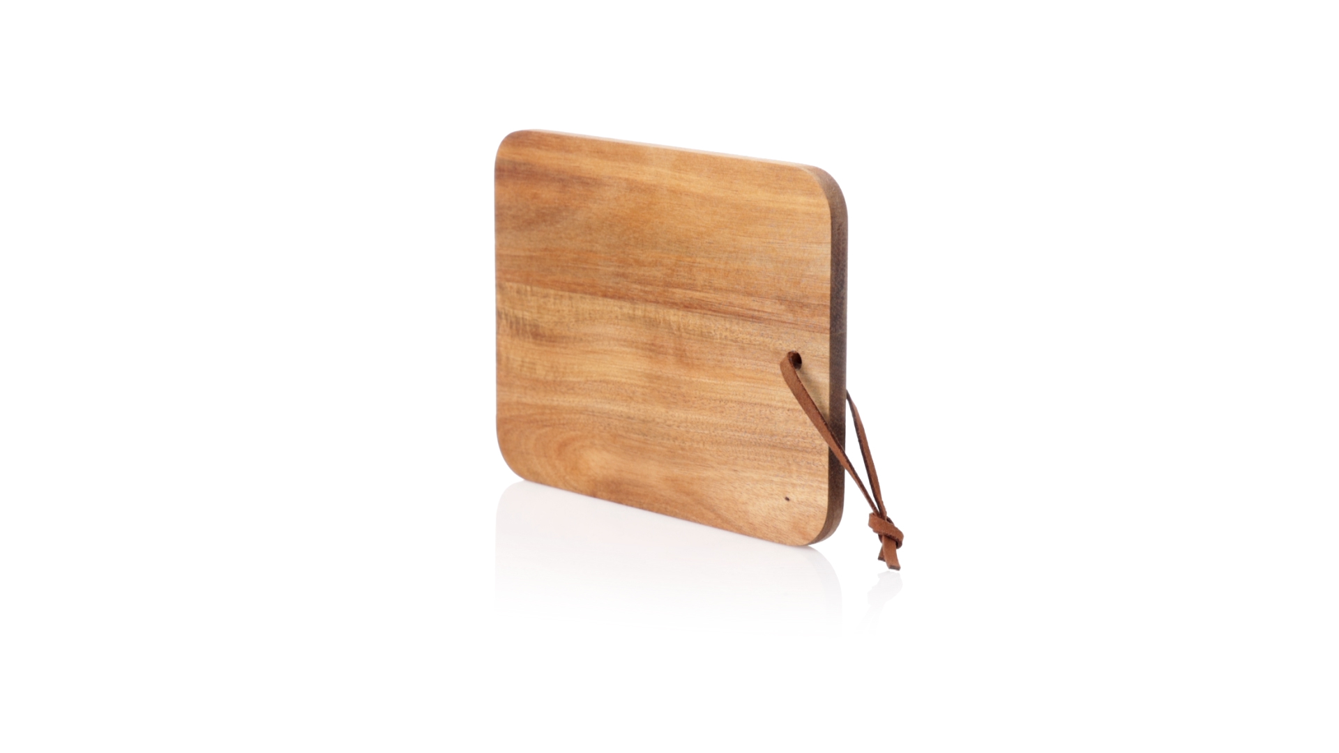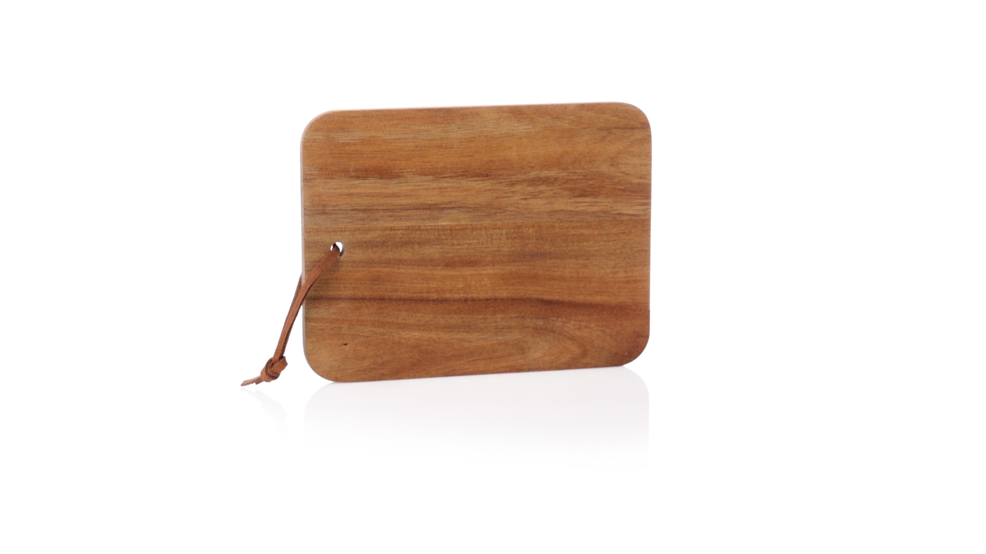 Schneide- und Präsentationsbrett aus Naturholz. Im rechteckigen Format, mit passender Kordel aus strapazierfähigem Kunstleder.