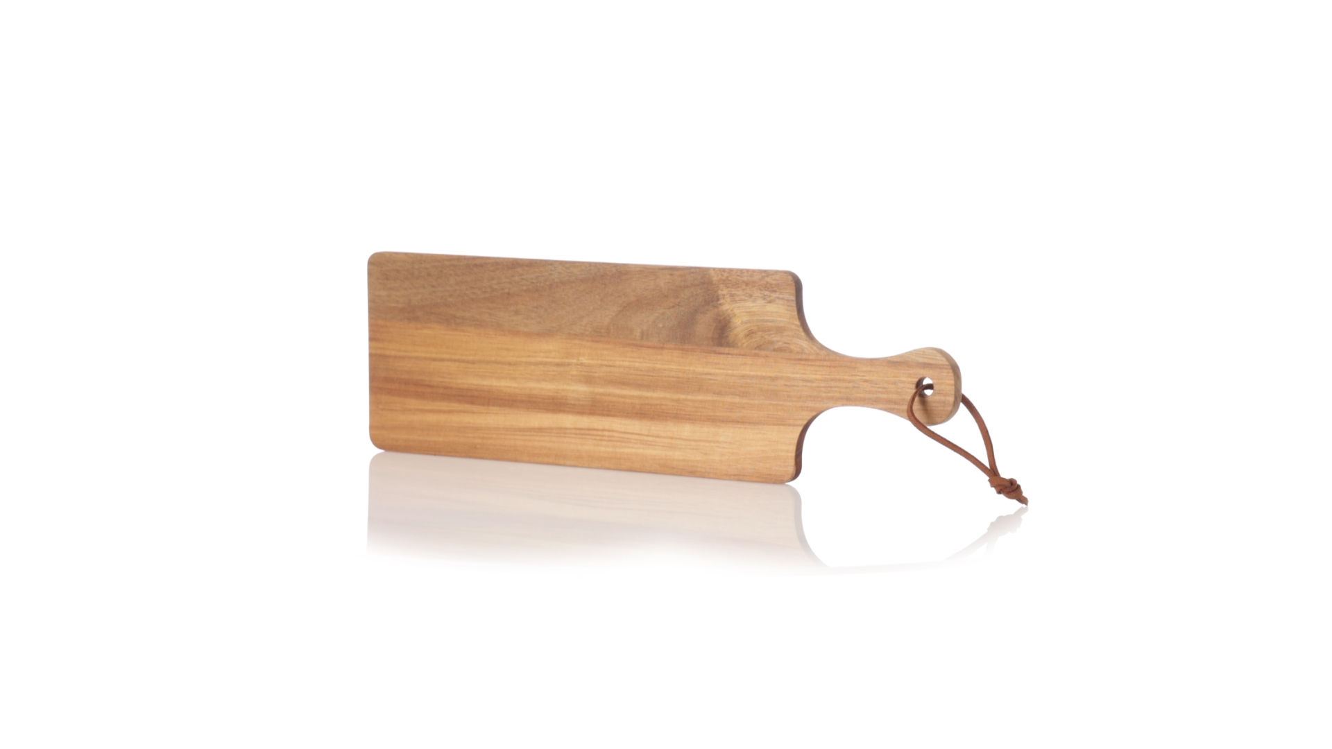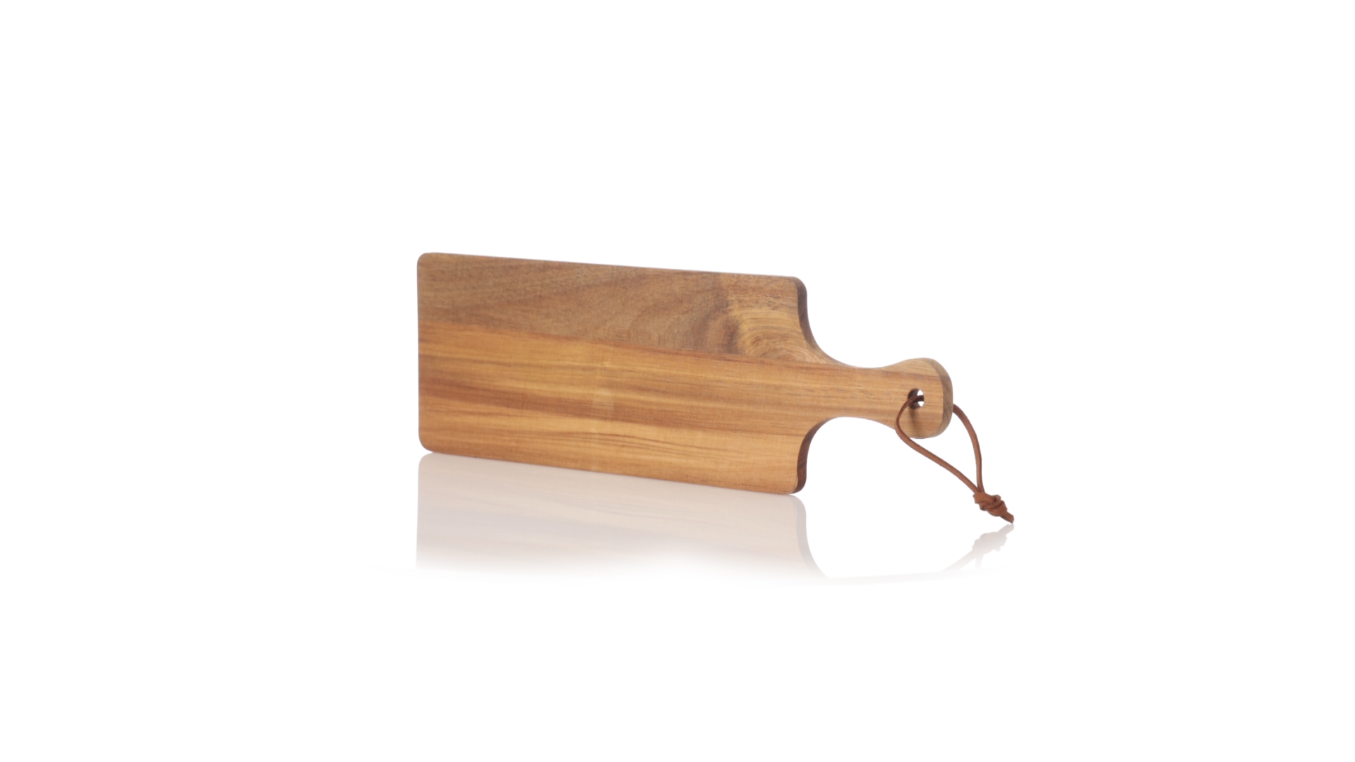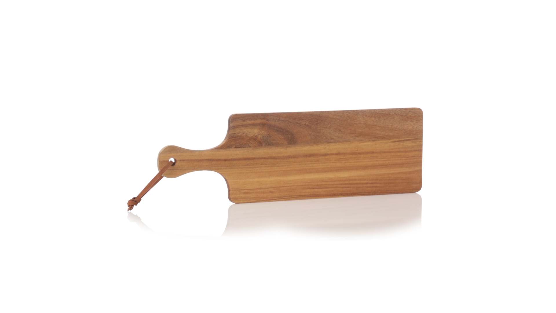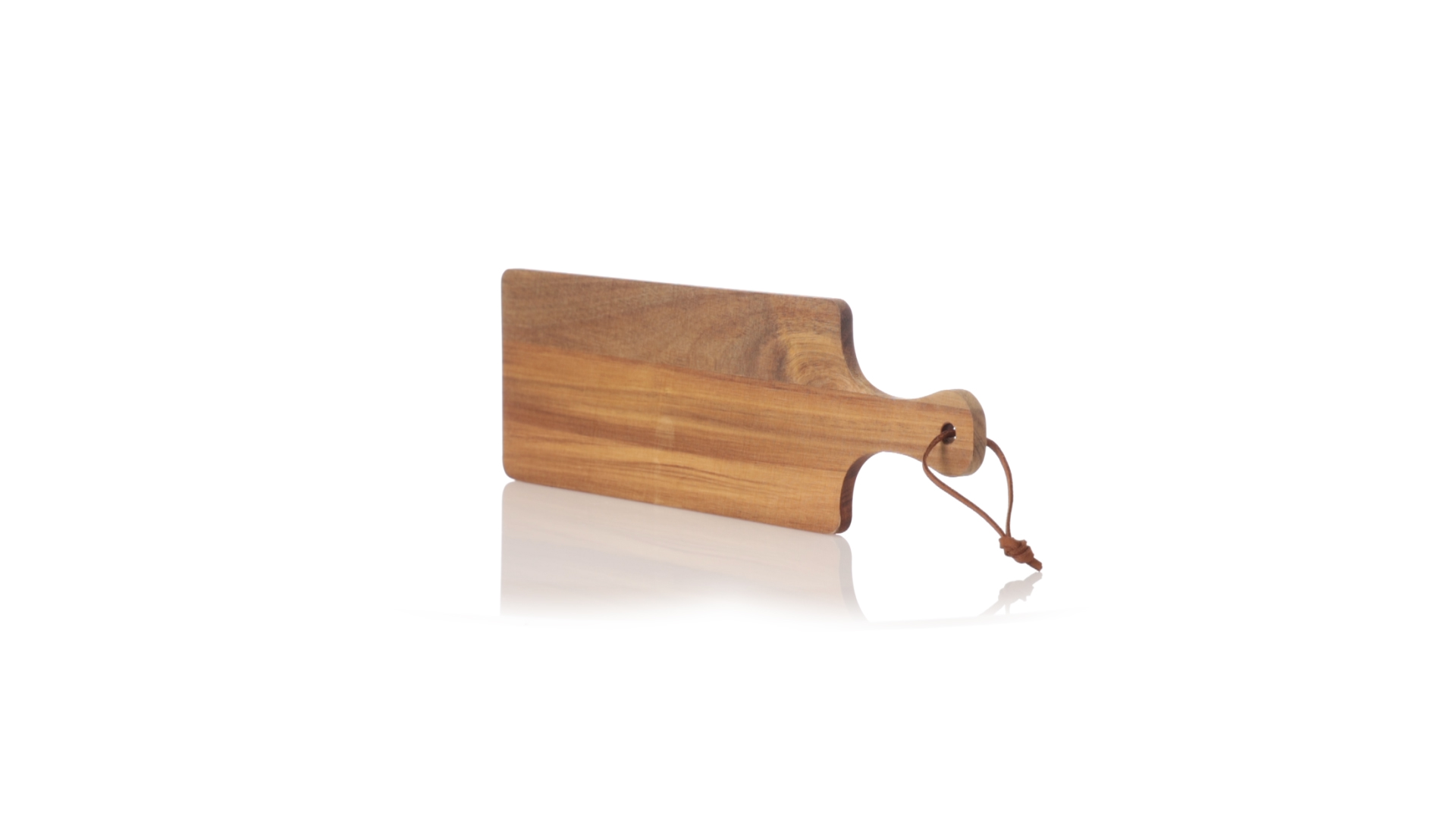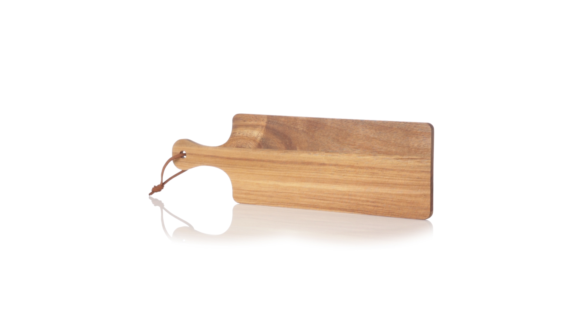 Schneide- und Präsentationsbrett aus Naturholz. In rechteckigem Format, mit passendem Griff und Kordel aus widerstandsfähigem Kunstleder.
