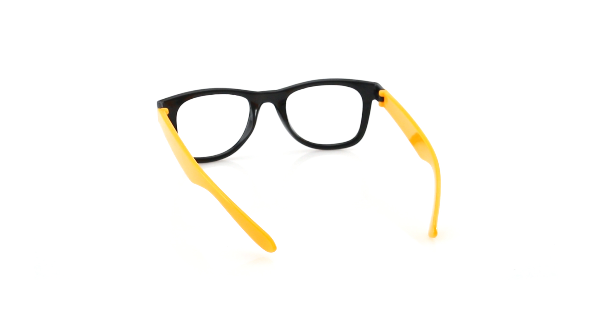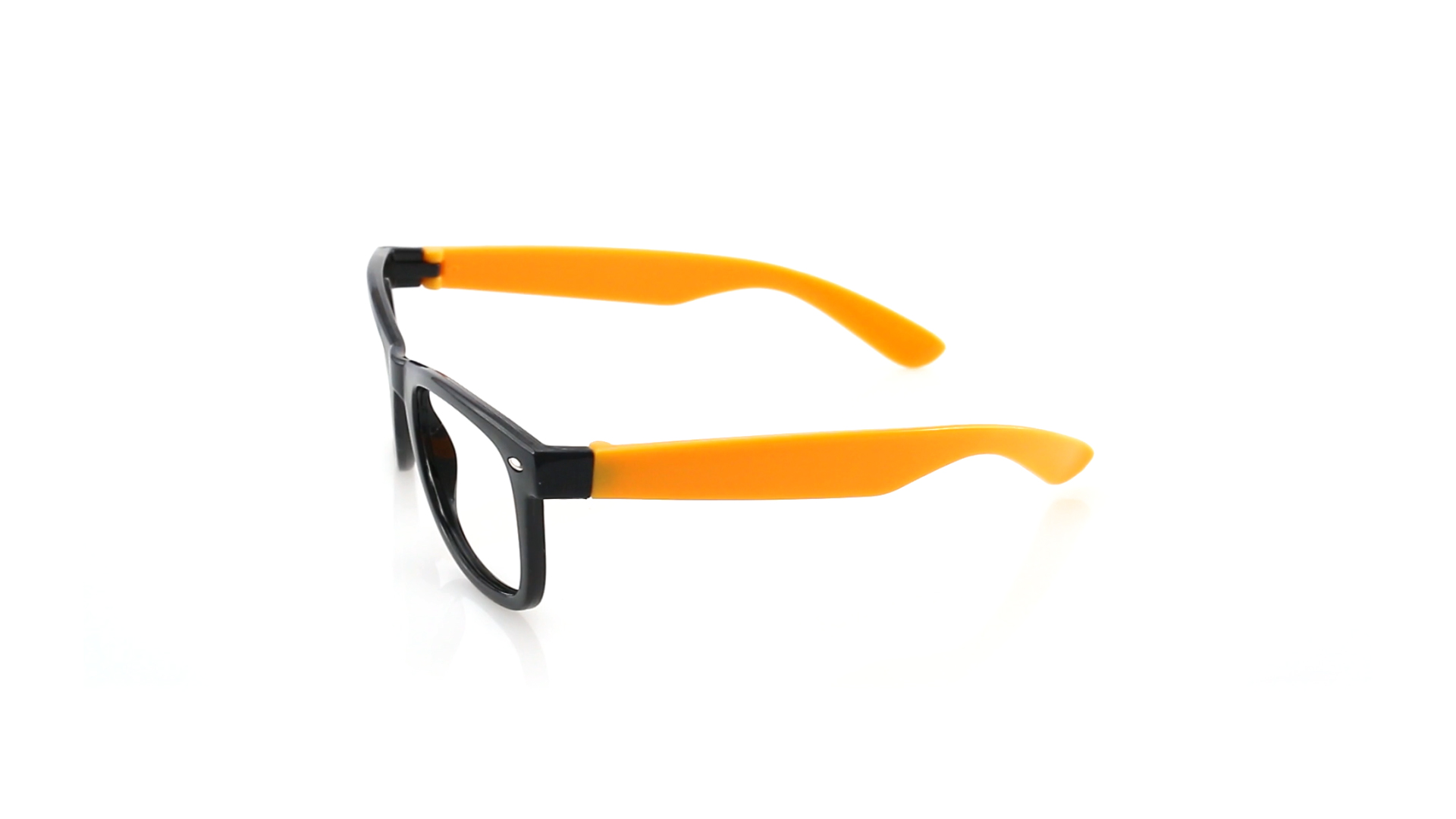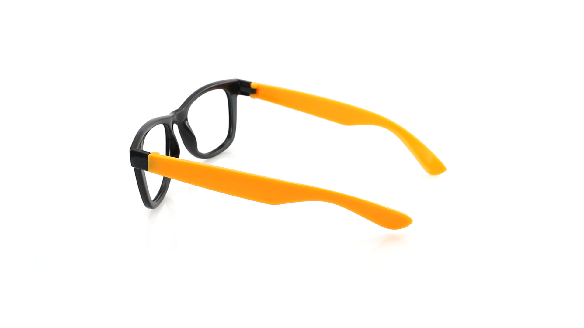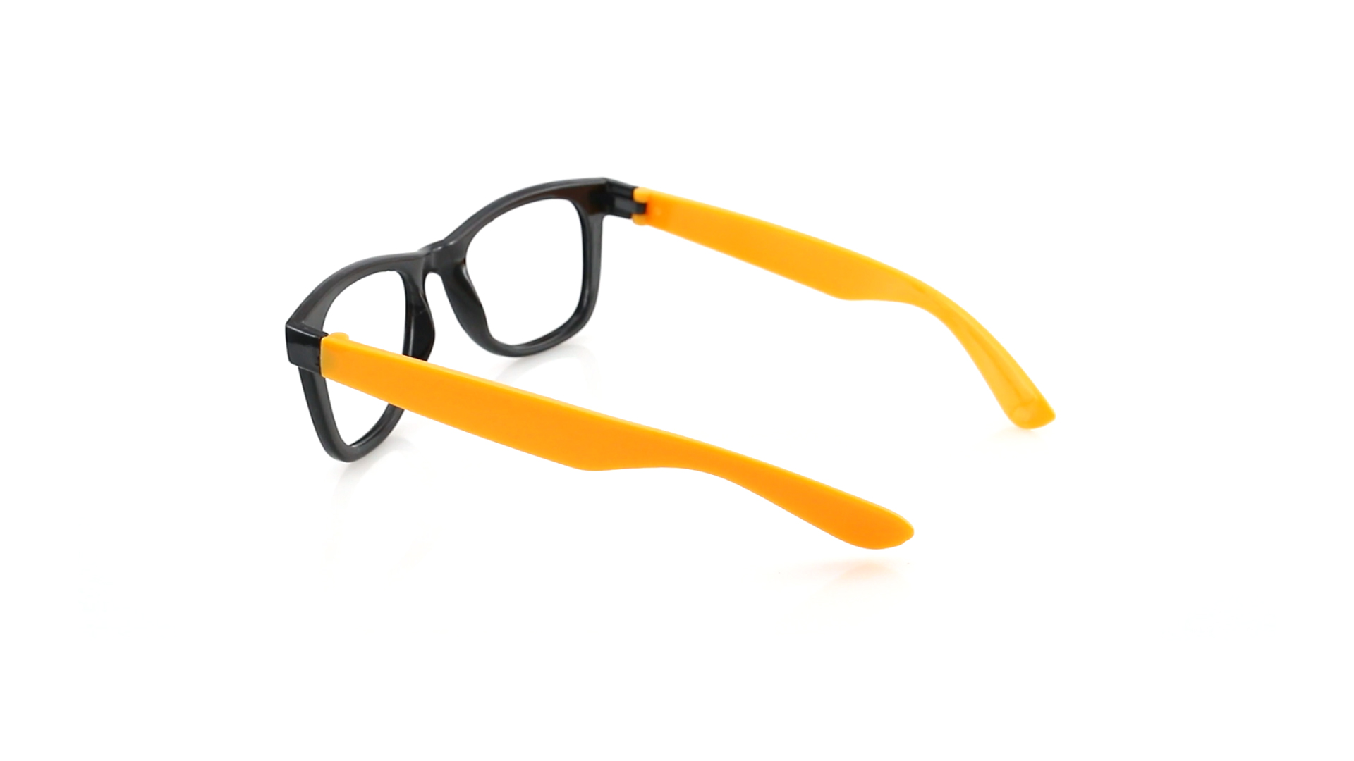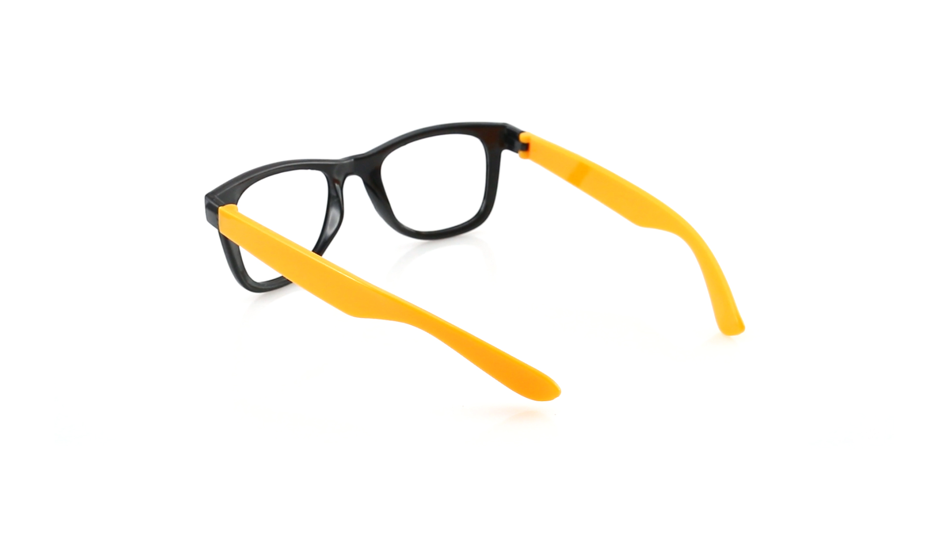 Brillengestell ohne Gläser mit originellem, zweifarbigem Design in verschiedenen Farben.