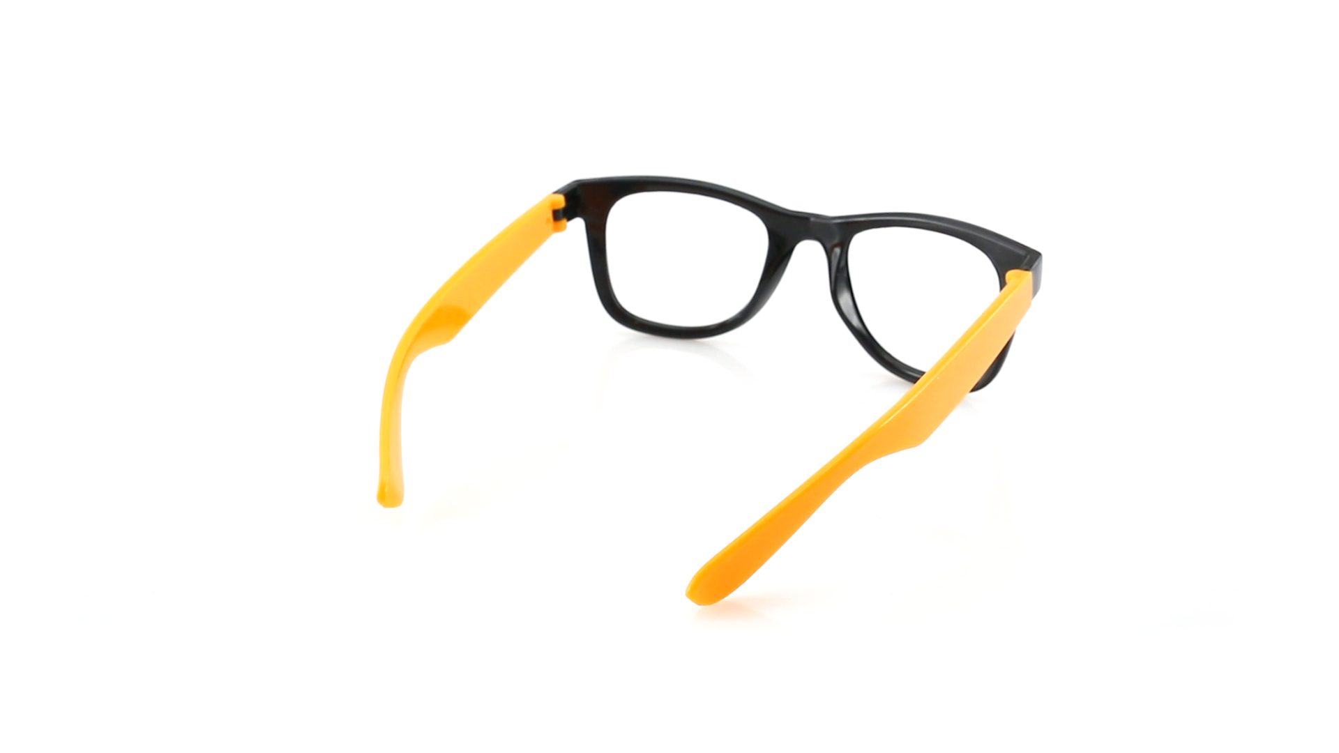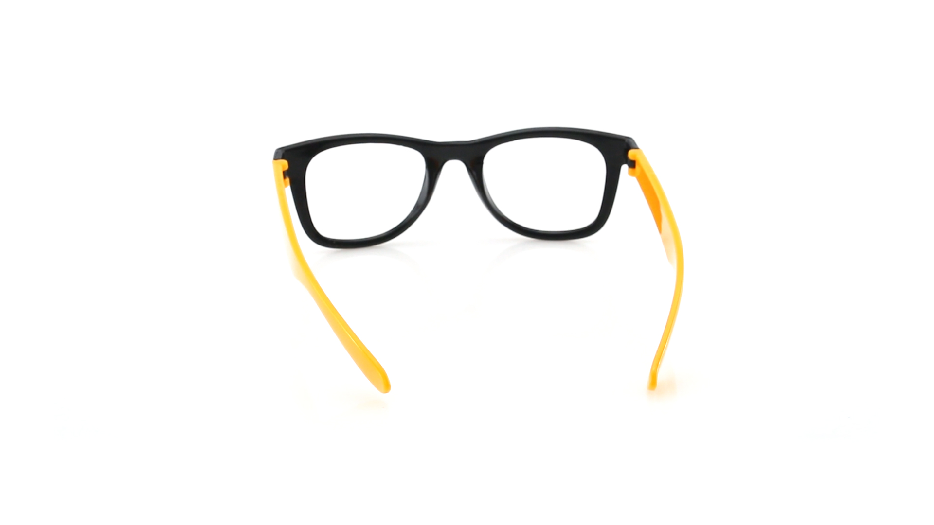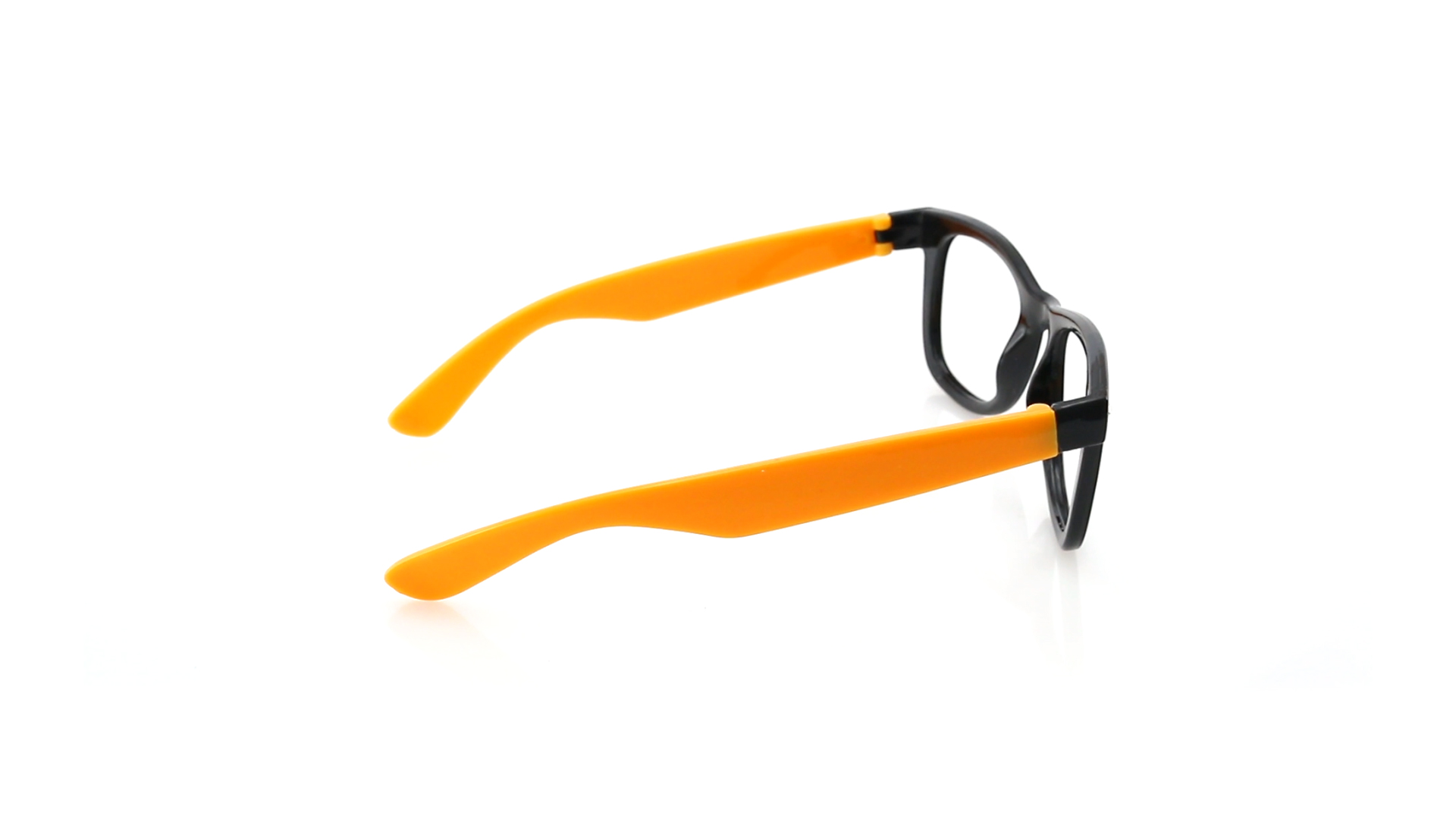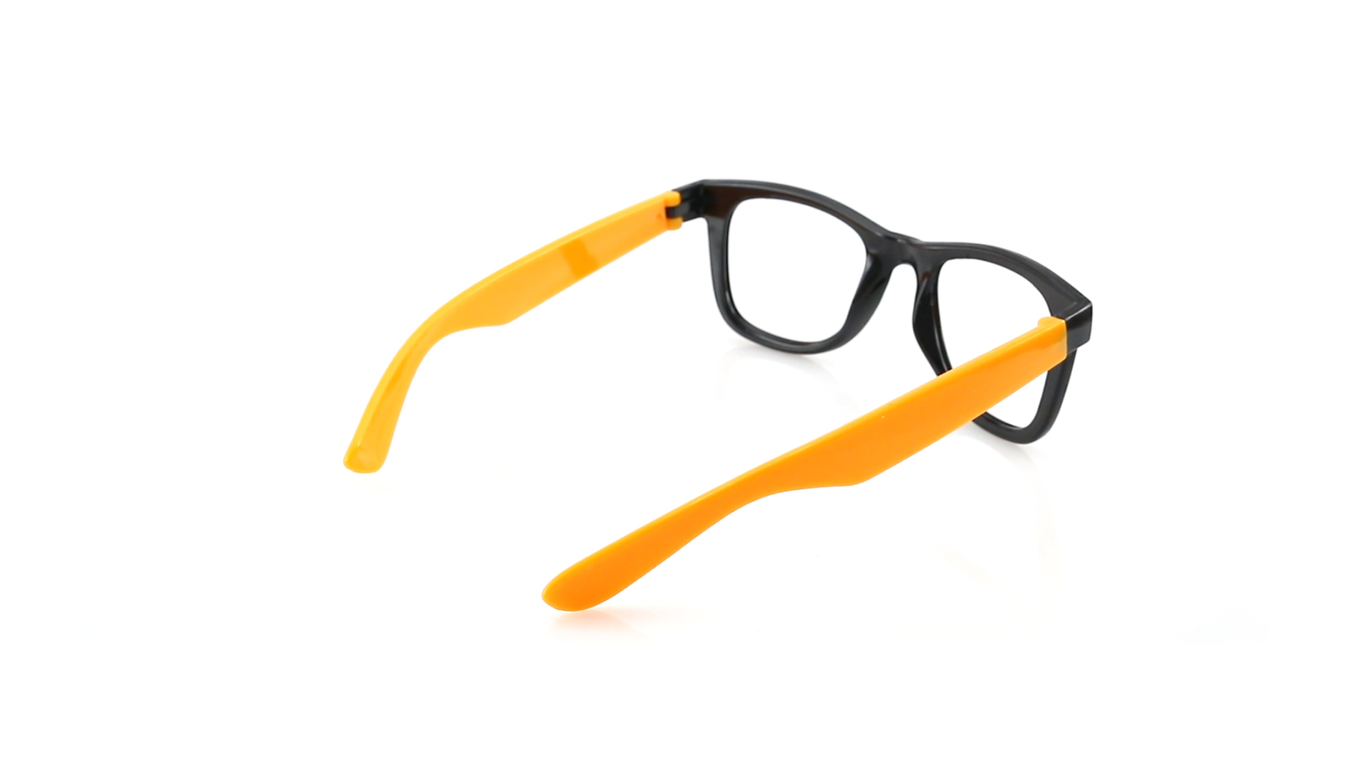 Brillengestell ohne Gläser mit originellem, zweifarbigem Design in verschiedenen Farben.