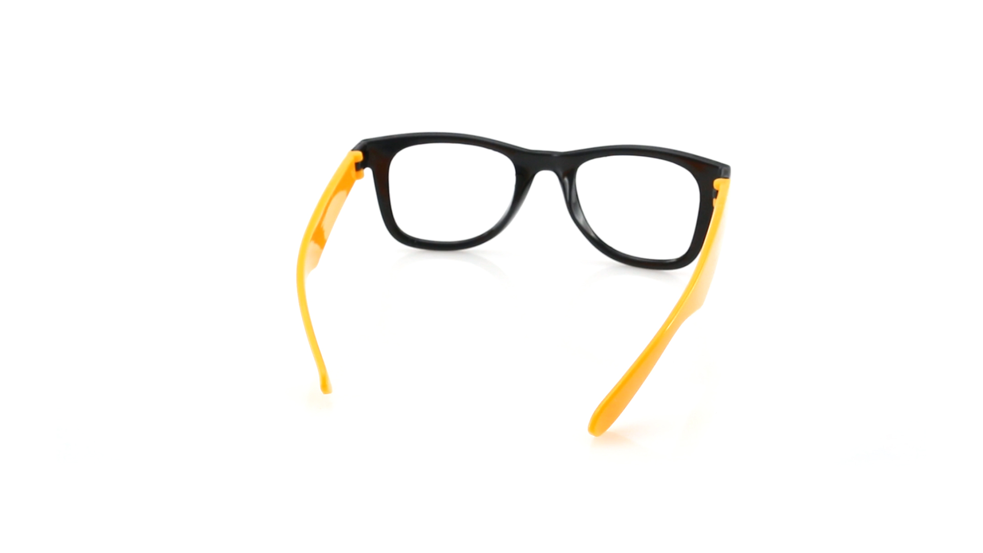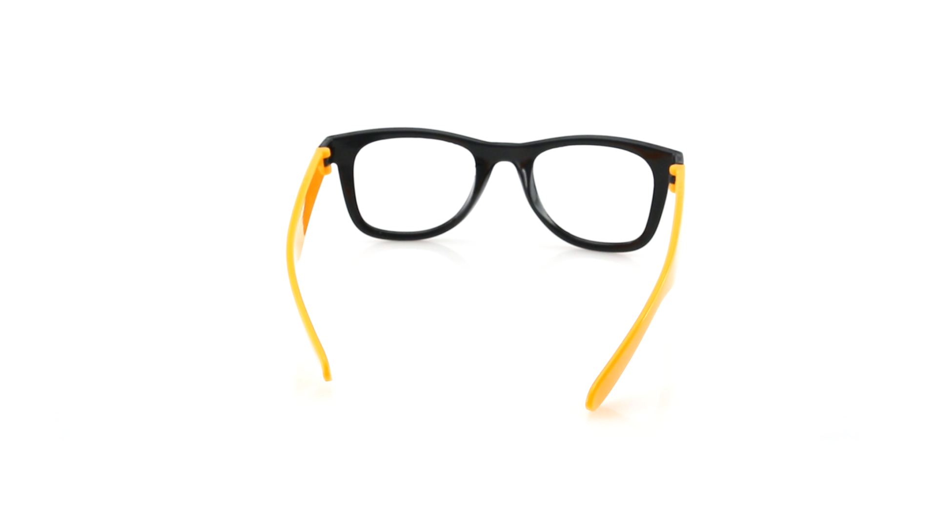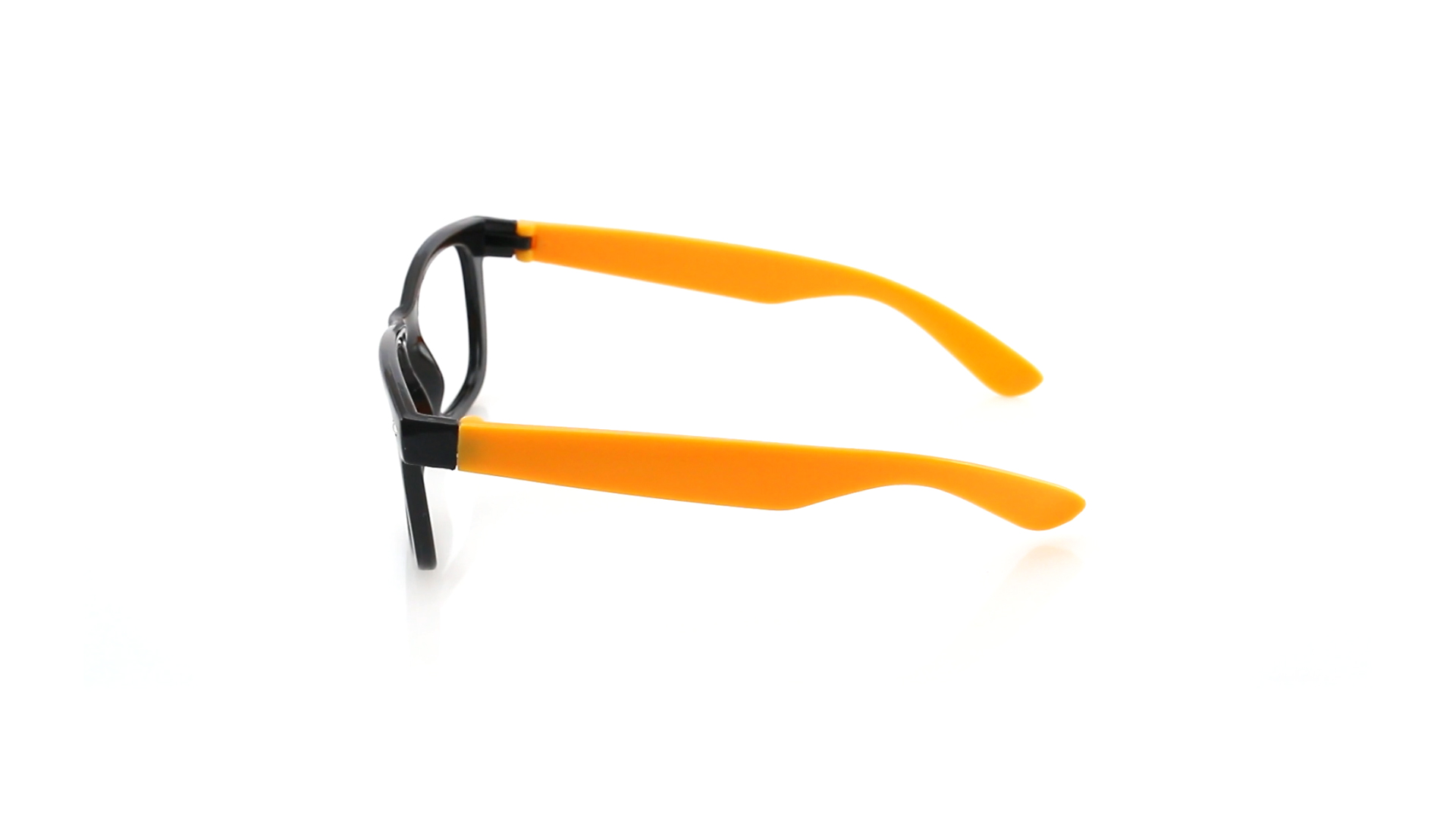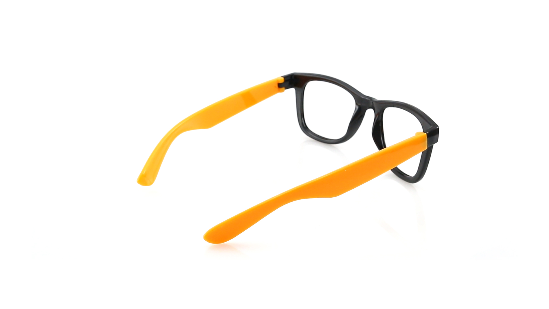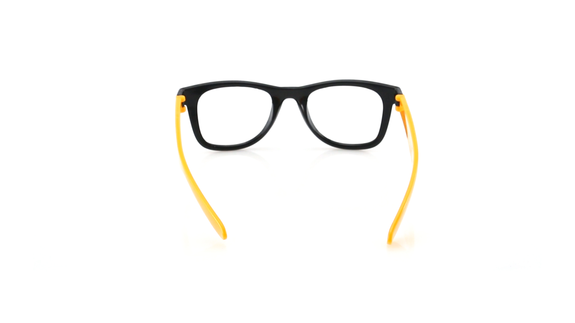 Brillengestell ohne Gläser mit originellem, zweifarbigem Design in verschiedenen Farben.
