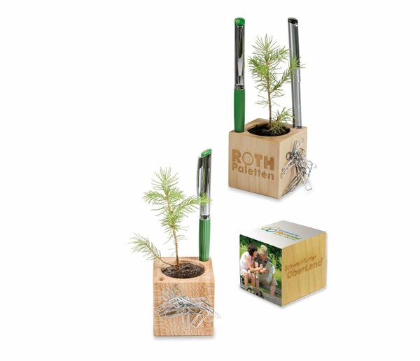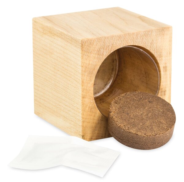 Ein maximales Naturerlebnis bietet der grosse Holz-Würfel aus hellem, europäischem Holz, gefüllt mit Fichtensamen. Die Banderole kann komplett individuell gestaltet werden und eine mögliche Lasergravur auf dem Holz bietet permanente Werbewirkung.