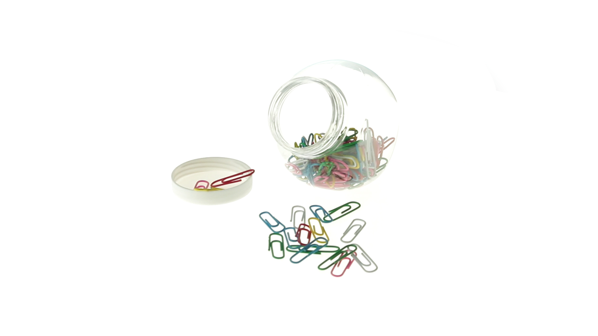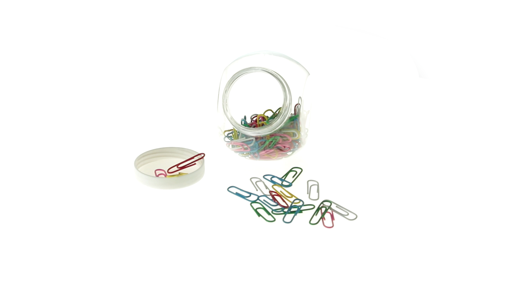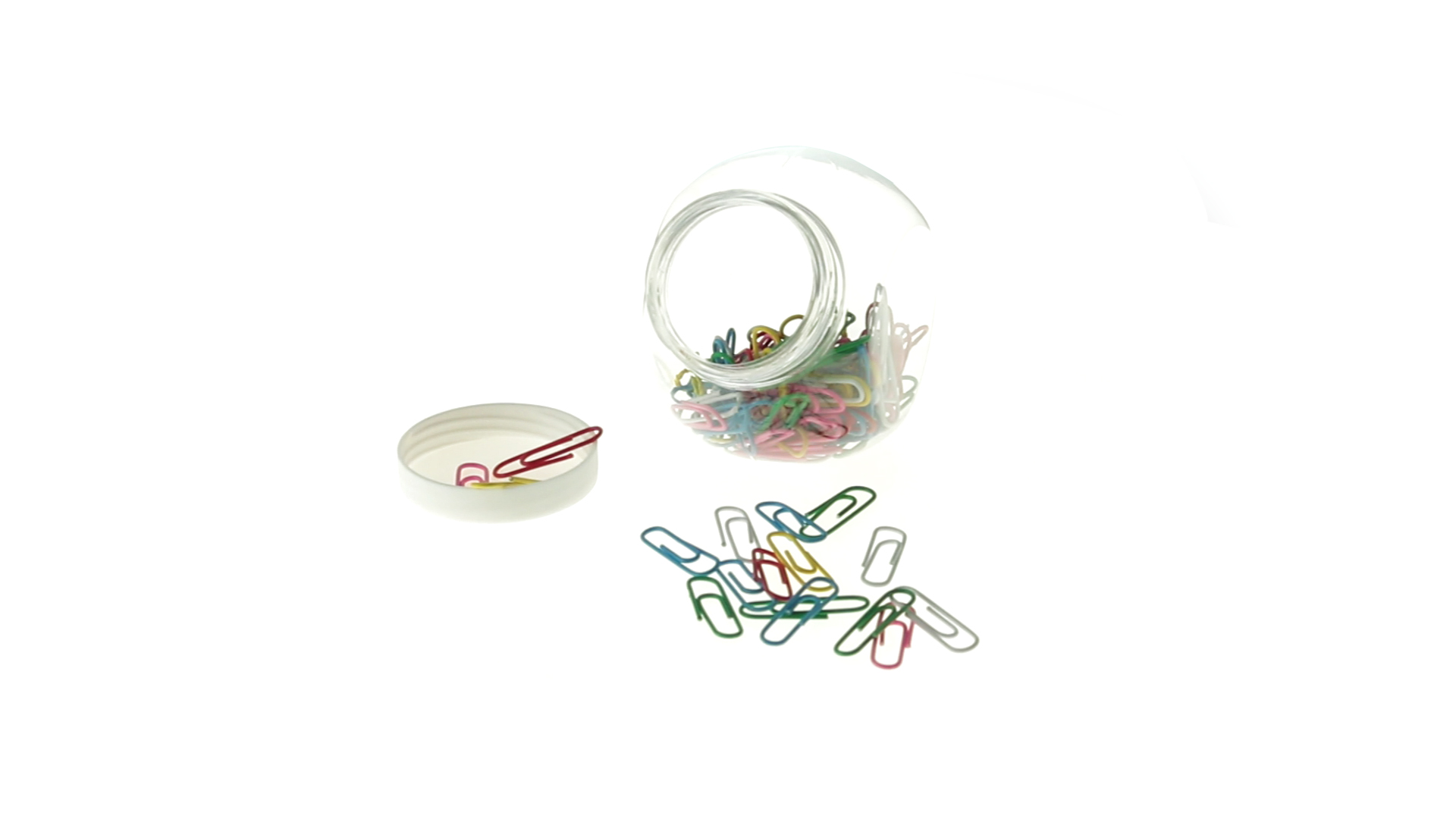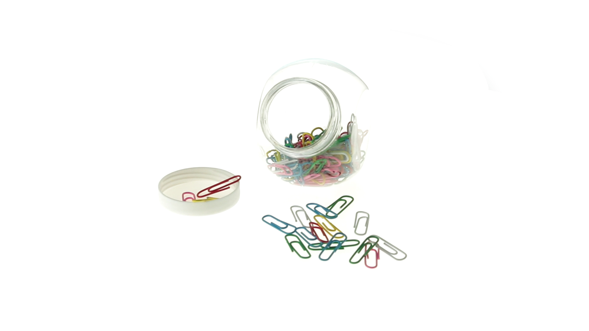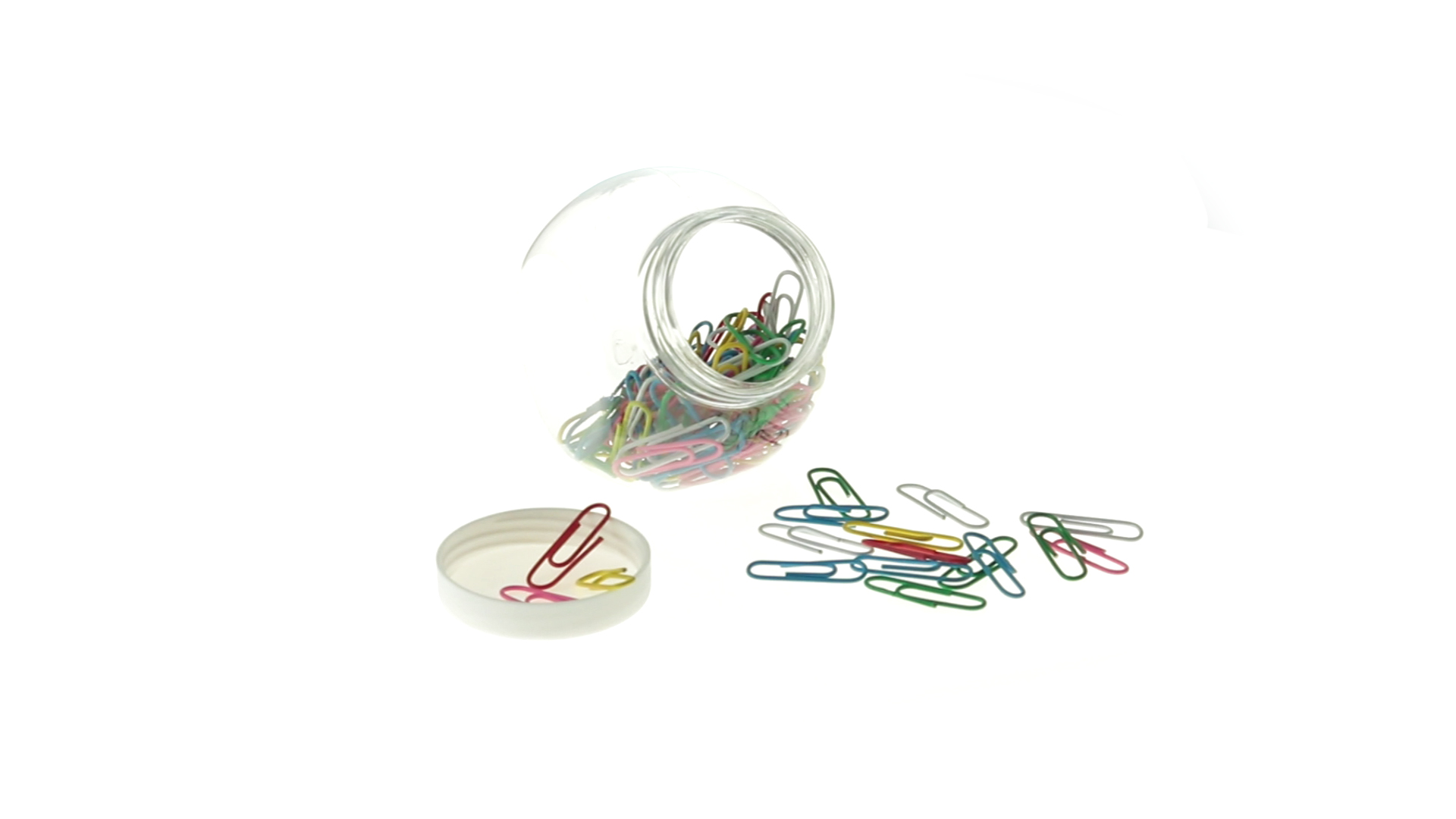 Originelles Büroklammern-Glas mit weissem Schraubverschluss und glatter Oberfläche zum Bedrucken. Mit 100 Clips mit PVC-Überzug in vielen verschiedenen Farben.