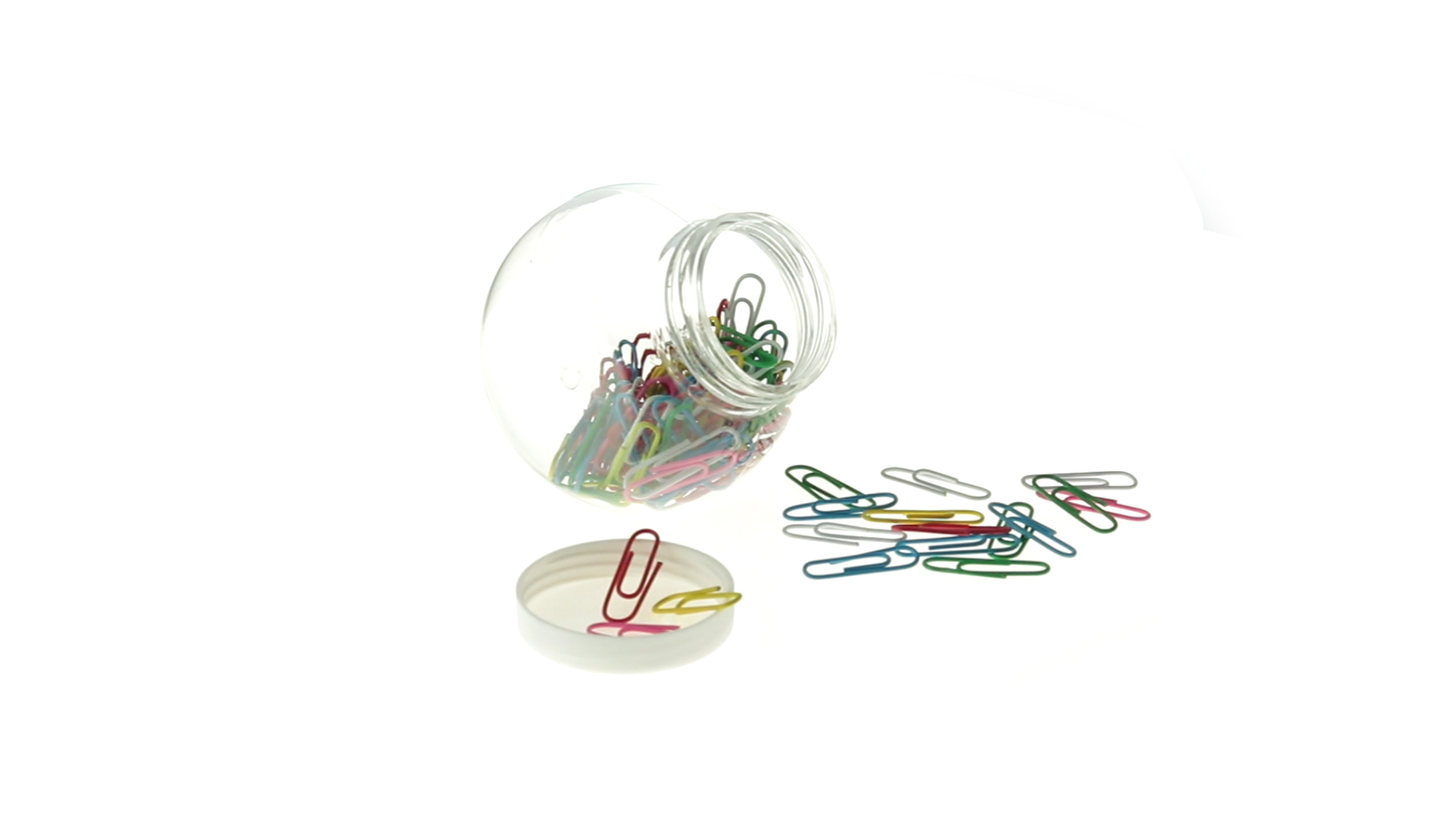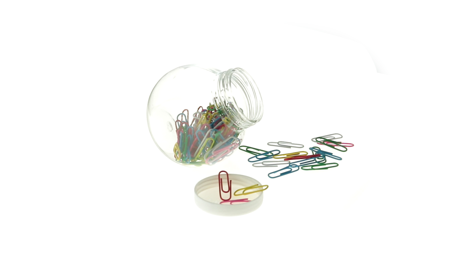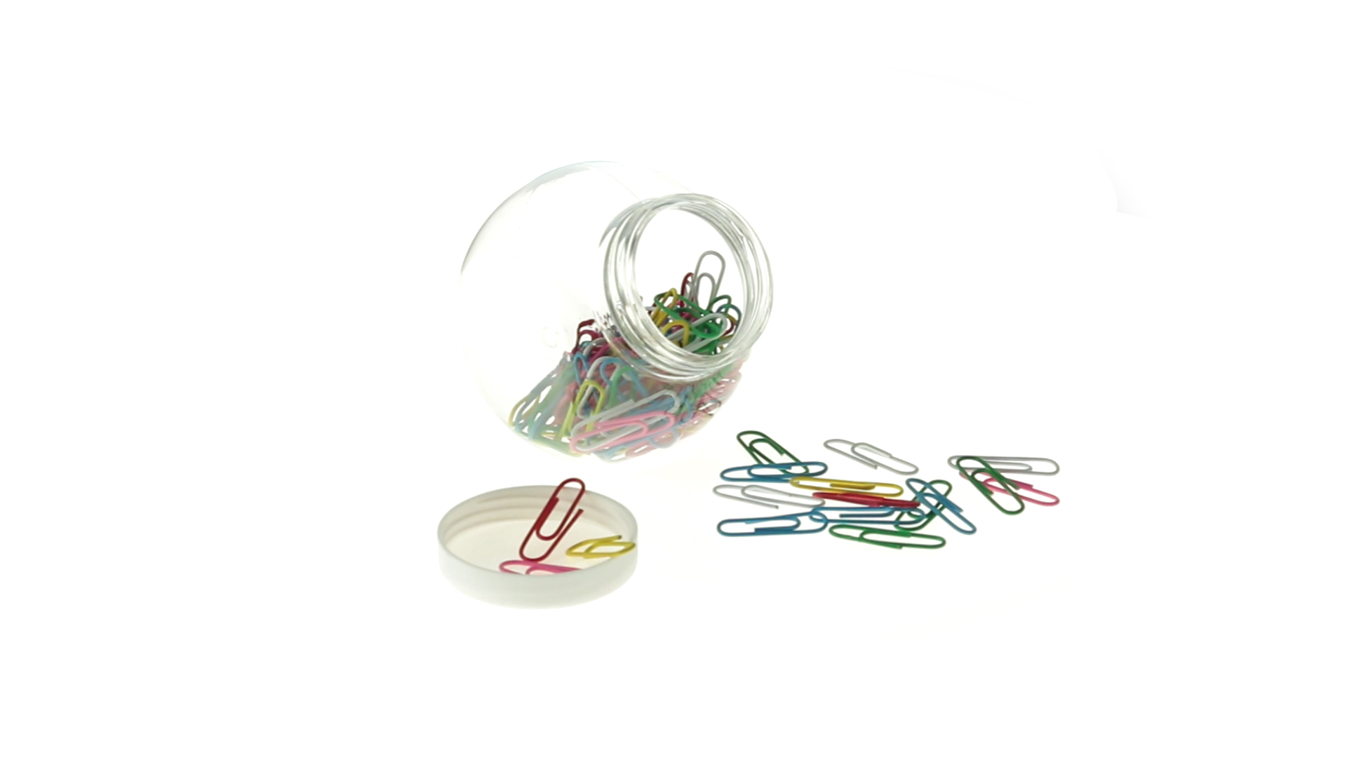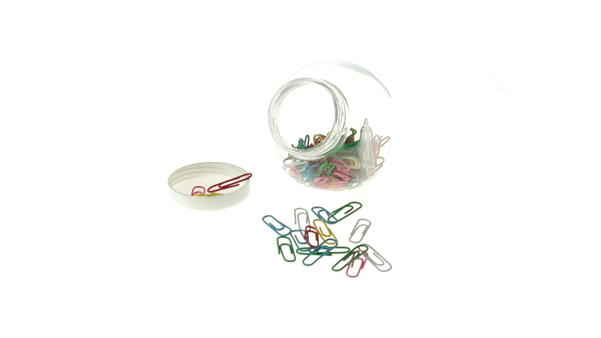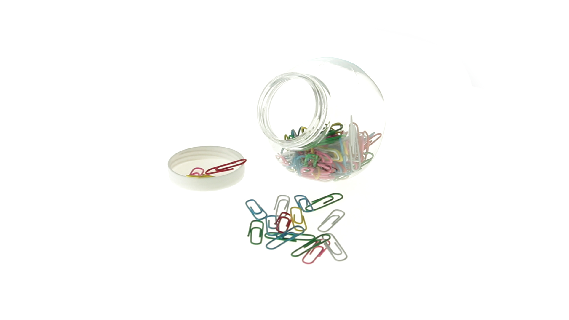 Originelles Büroklammern-Glas mit weissem Schraubverschluss und glatter Oberfläche zum Bedrucken. Mit 100 Clips mit PVC-Überzug in vielen verschiedenen Farben.
