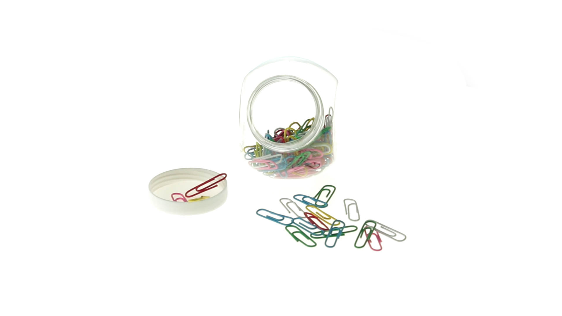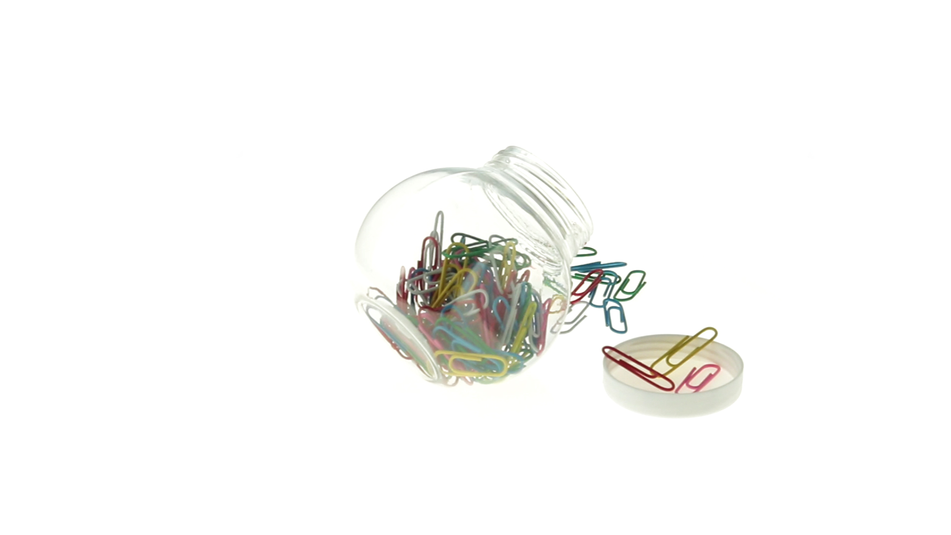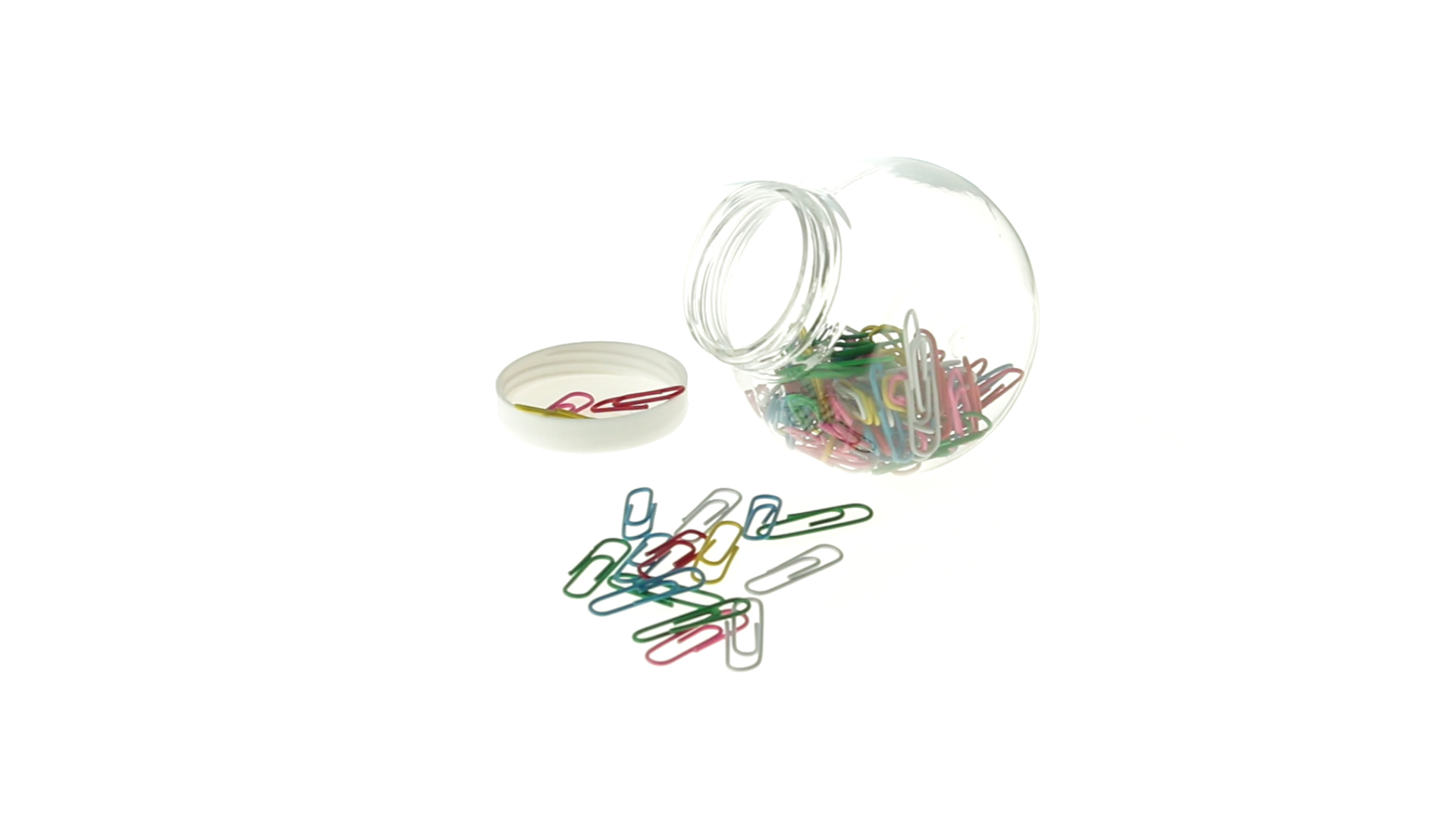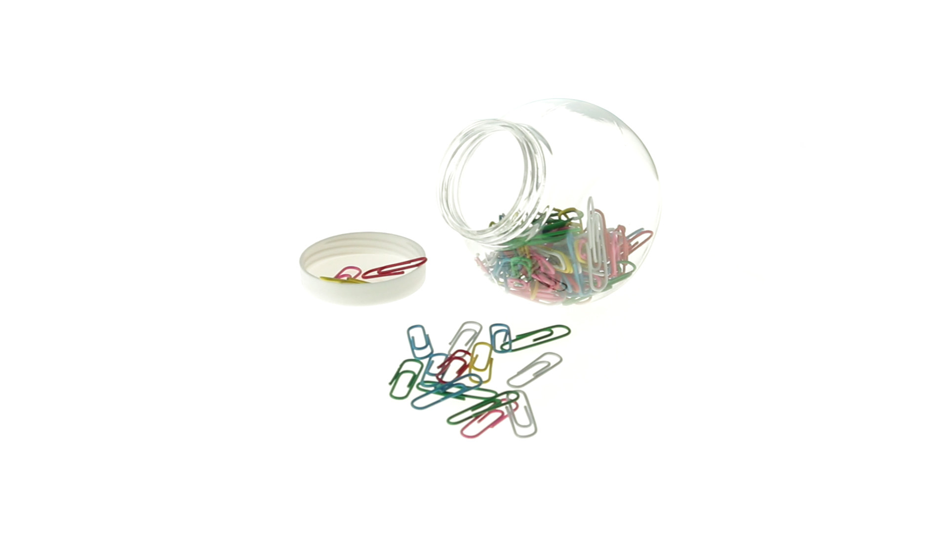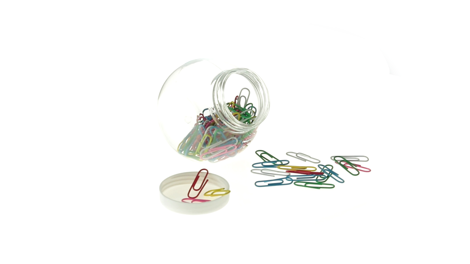 Originelles Büroklammern-Glas mit weissem Schraubverschluss und glatter Oberfläche zum Bedrucken. Mit 100 Clips mit PVC-Überzug in vielen verschiedenen Farben.