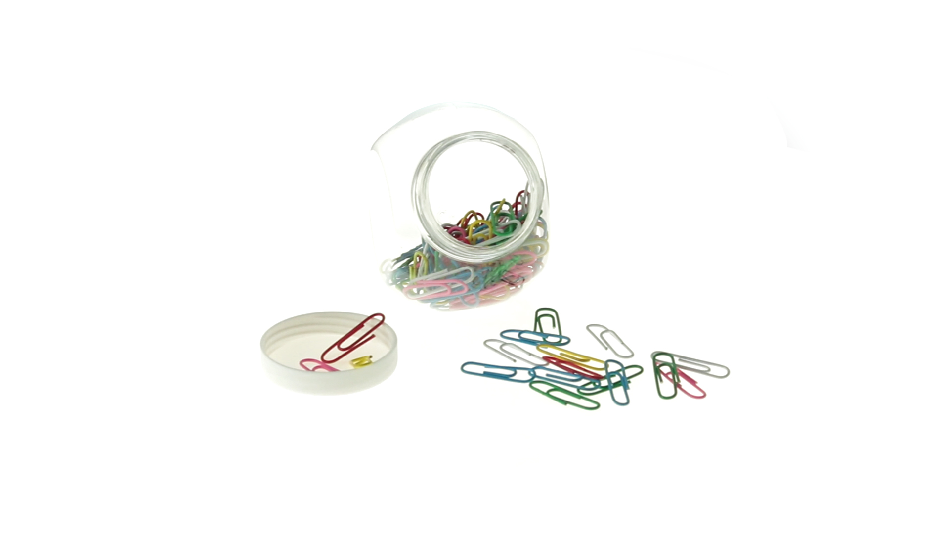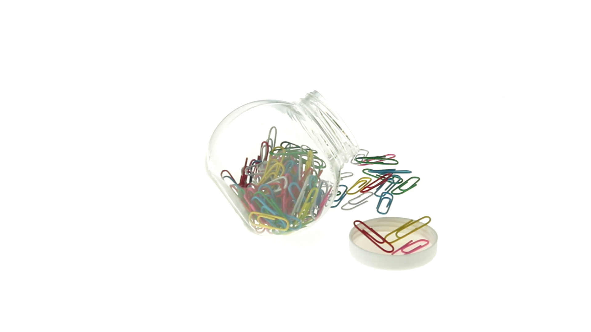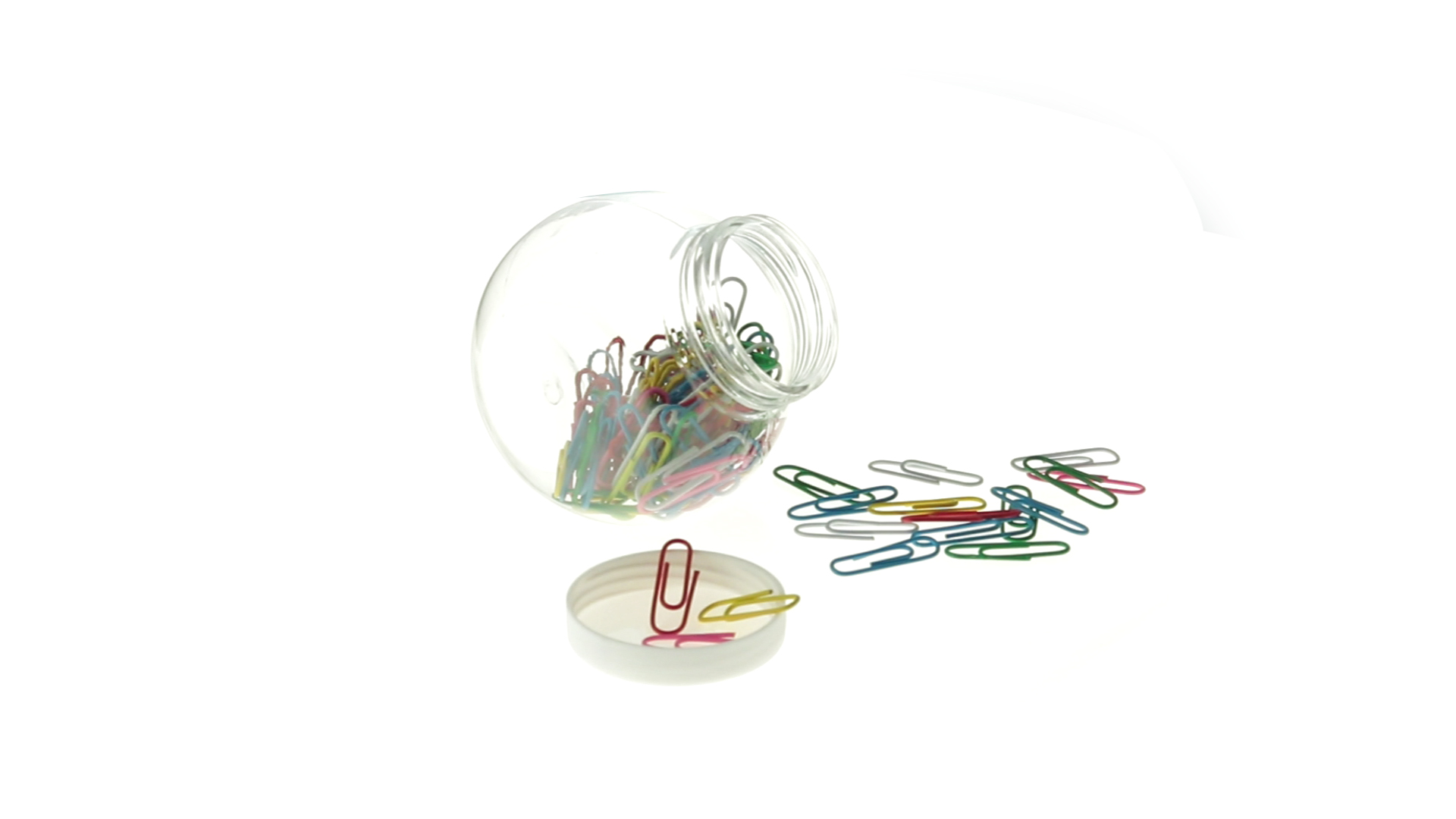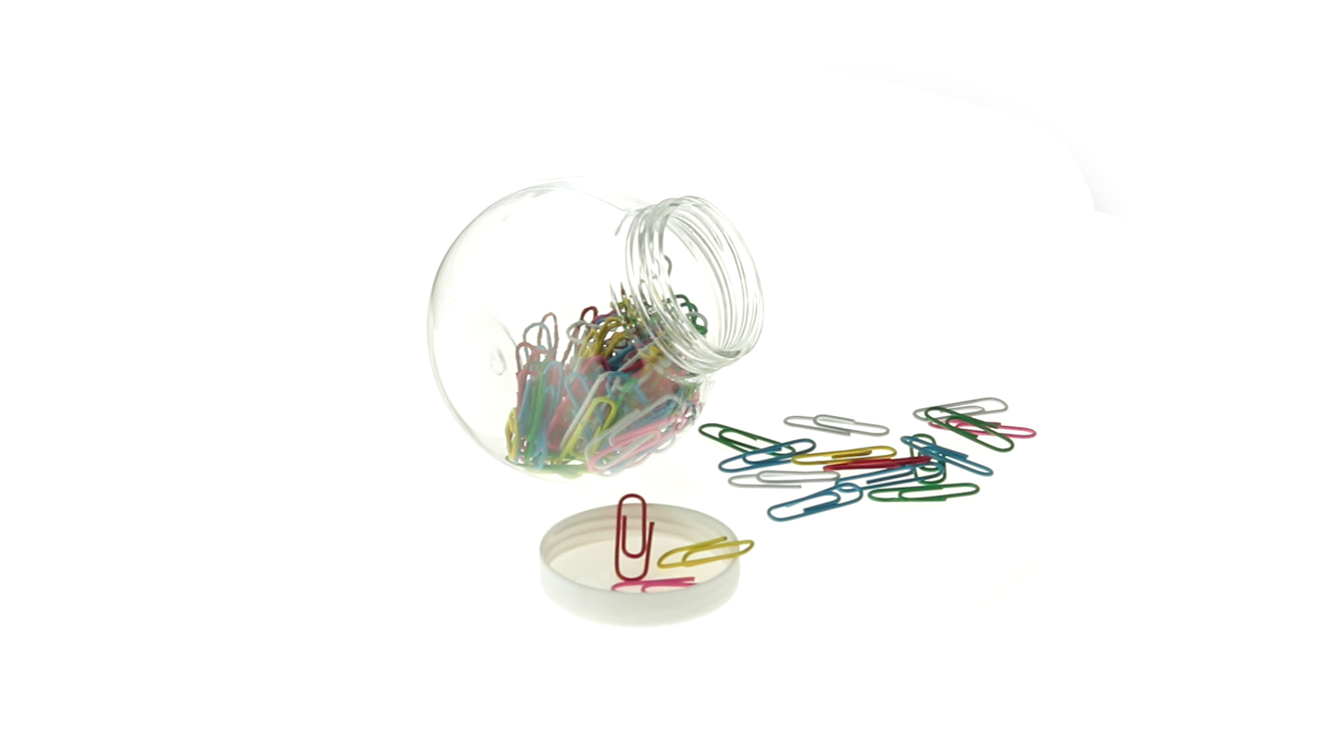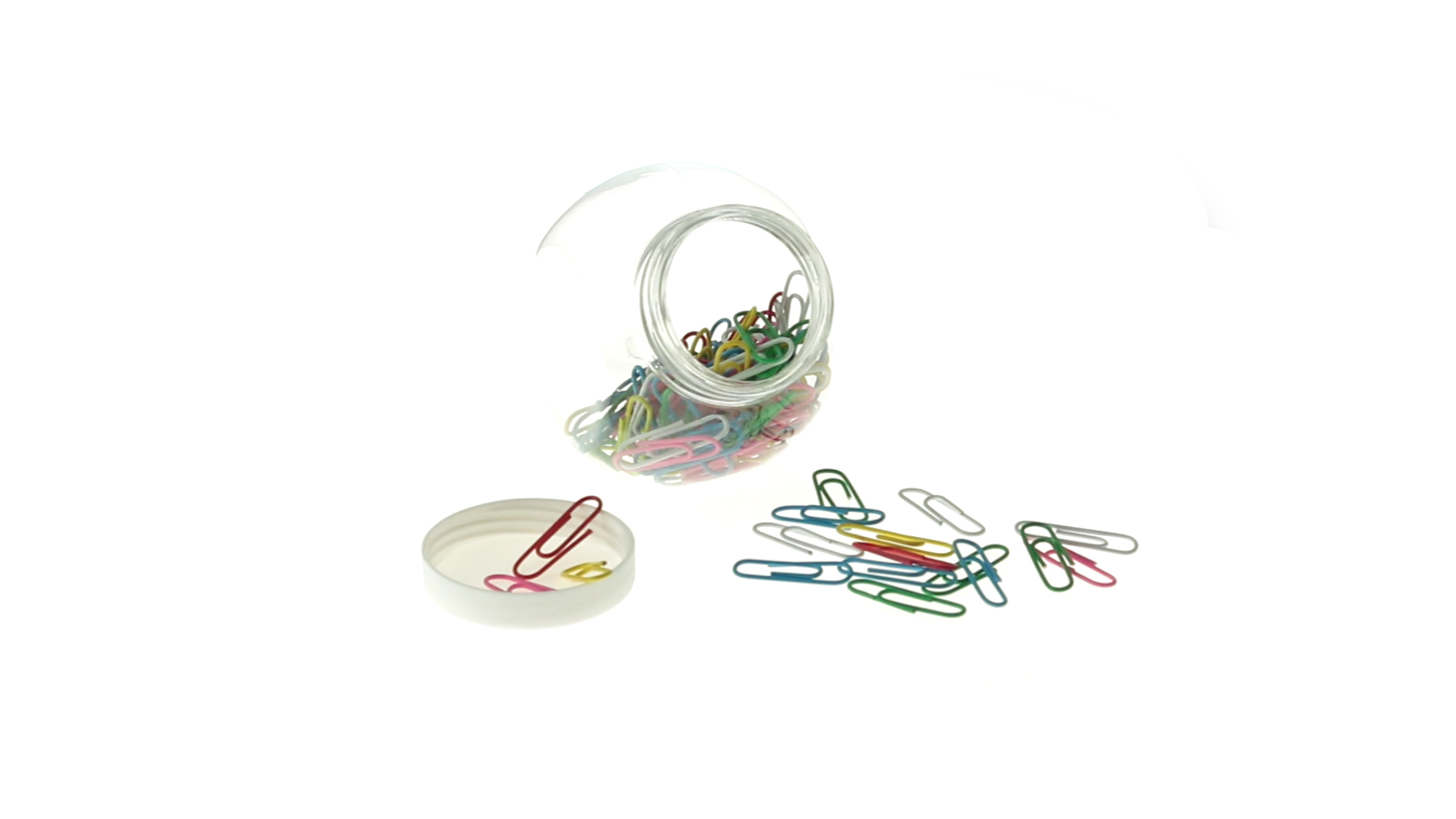 Originelles Büroklammern-Glas mit weissem Schraubverschluss und glatter Oberfläche zum Bedrucken. Mit 100 Clips mit PVC-Überzug in vielen verschiedenen Farben.