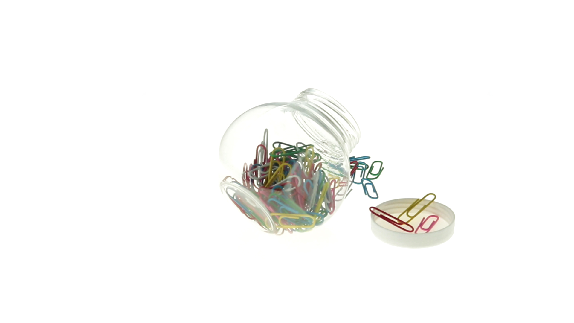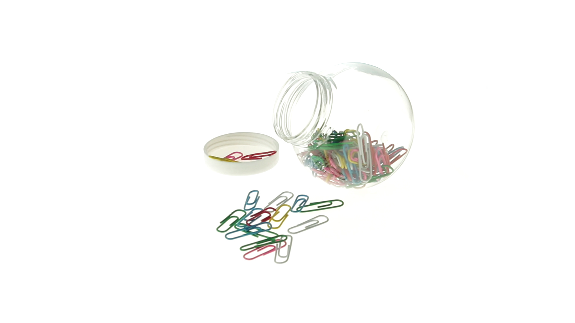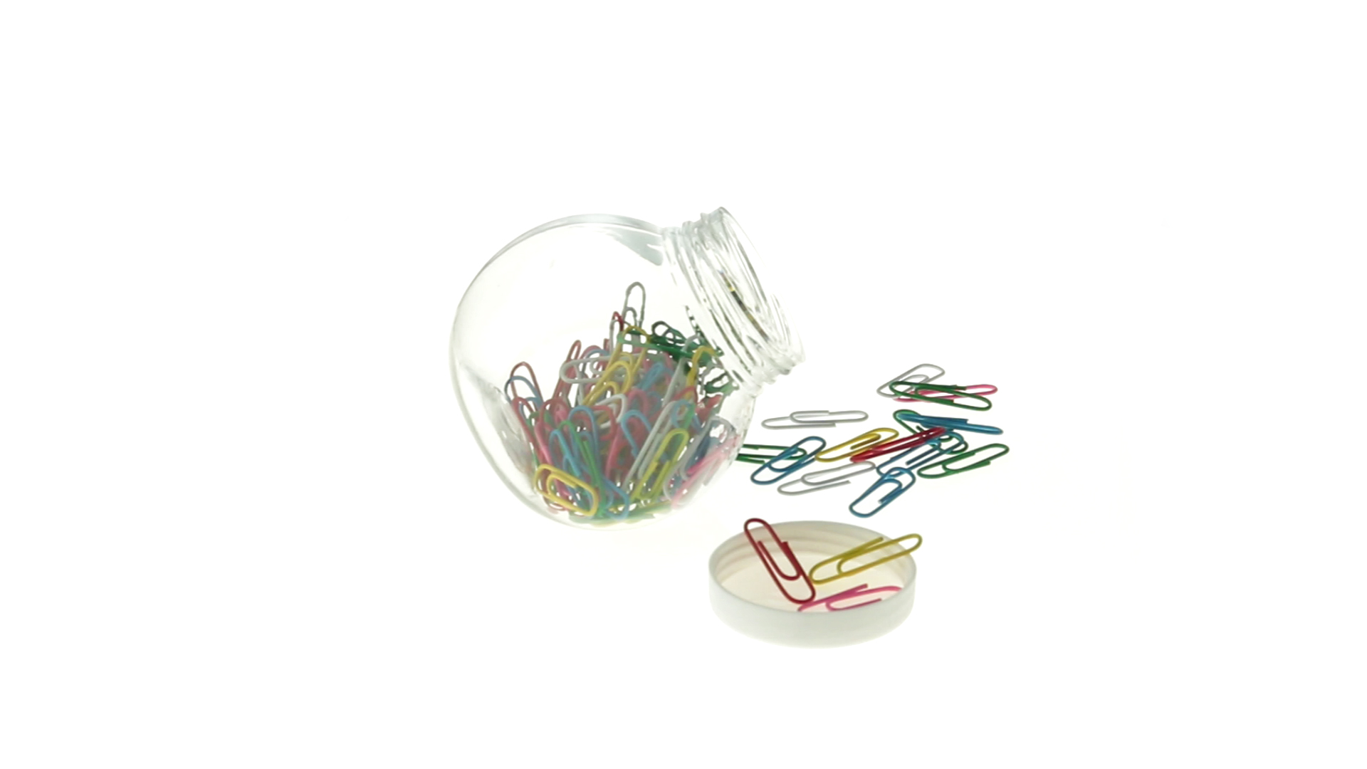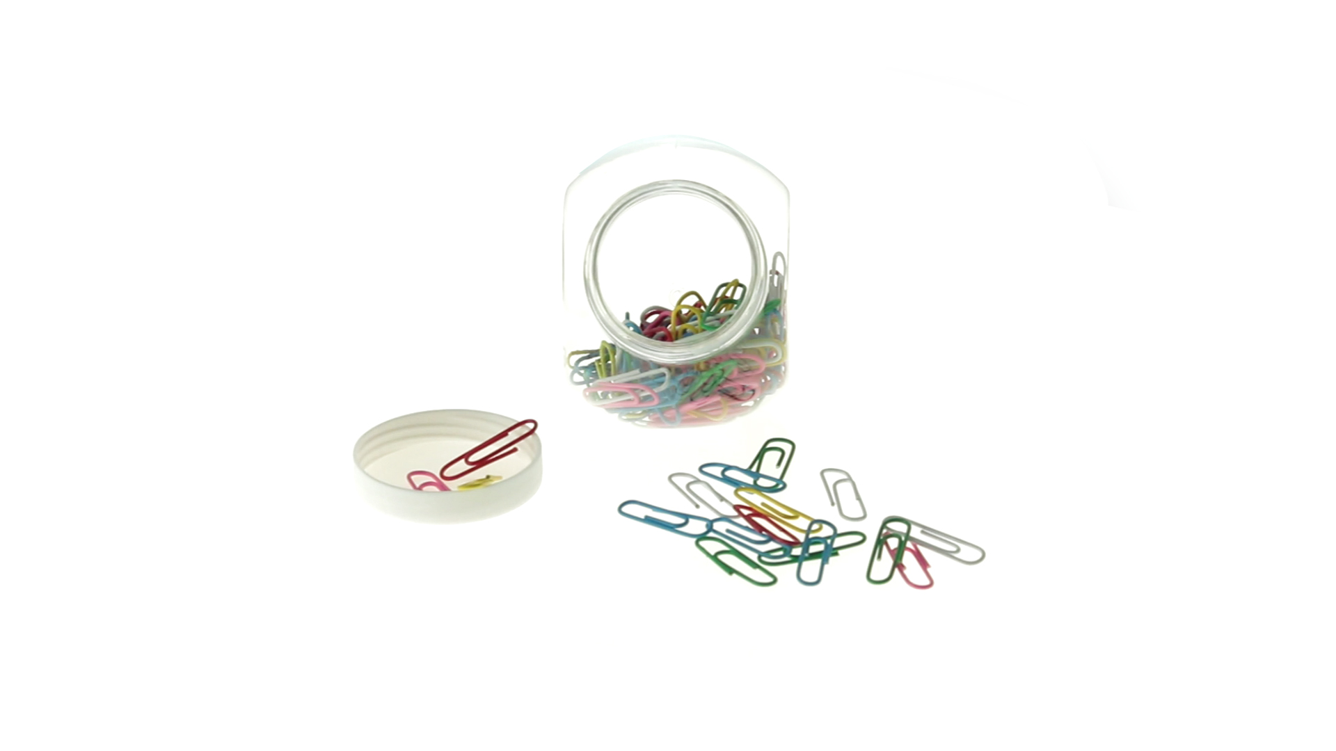 Originelles Büroklammern-Glas mit weissem Schraubverschluss und glatter Oberfläche zum Bedrucken. Mit 100 Clips mit PVC-Überzug in vielen verschiedenen Farben.