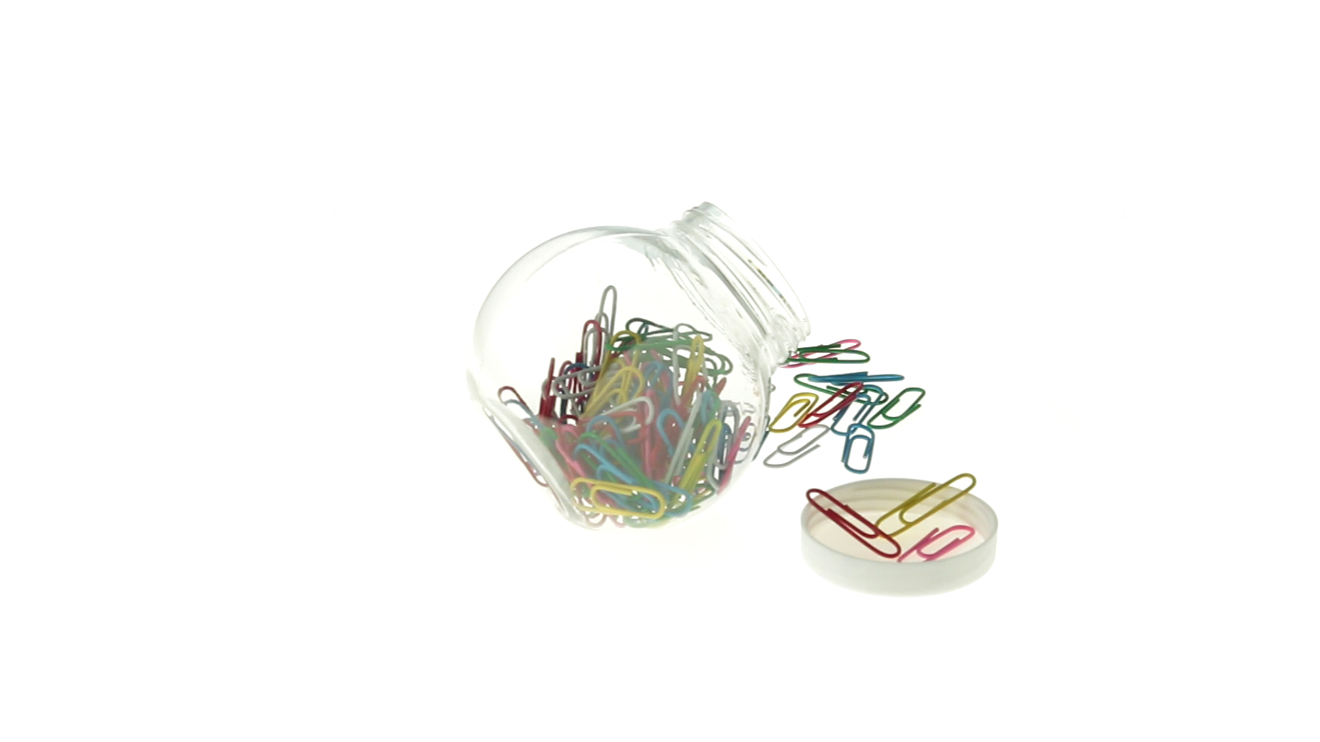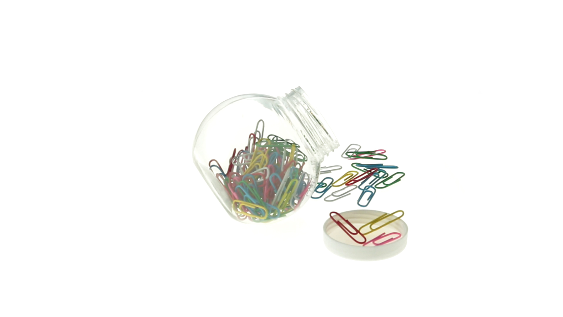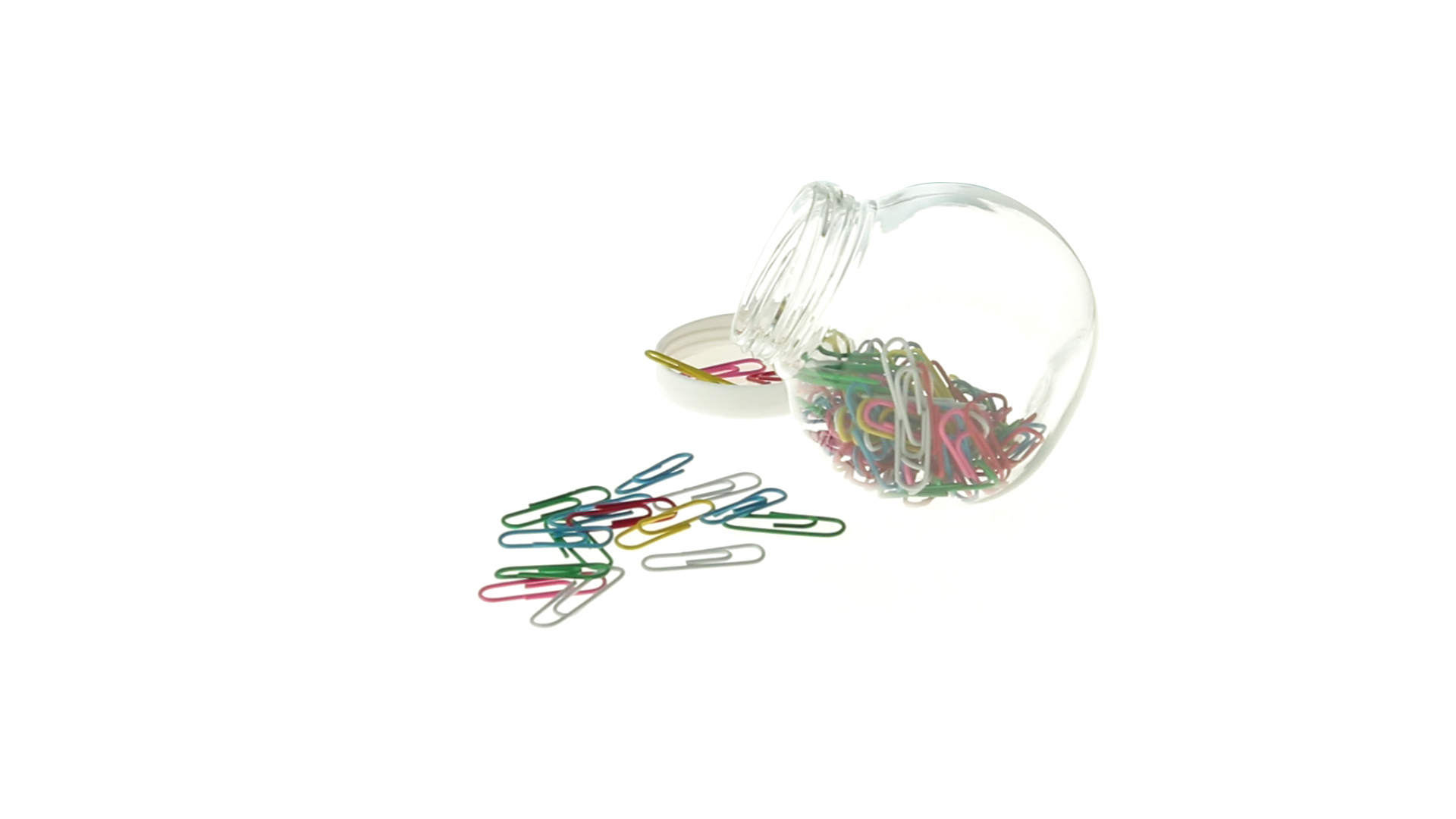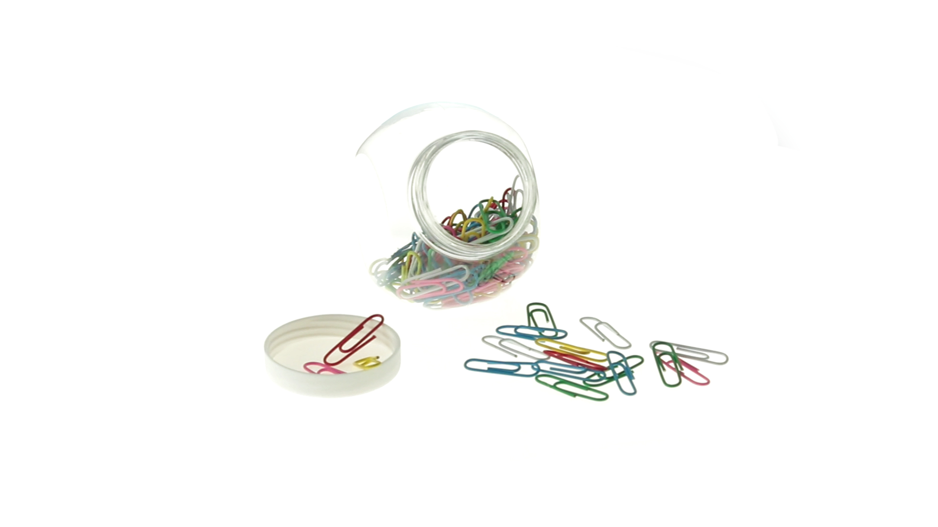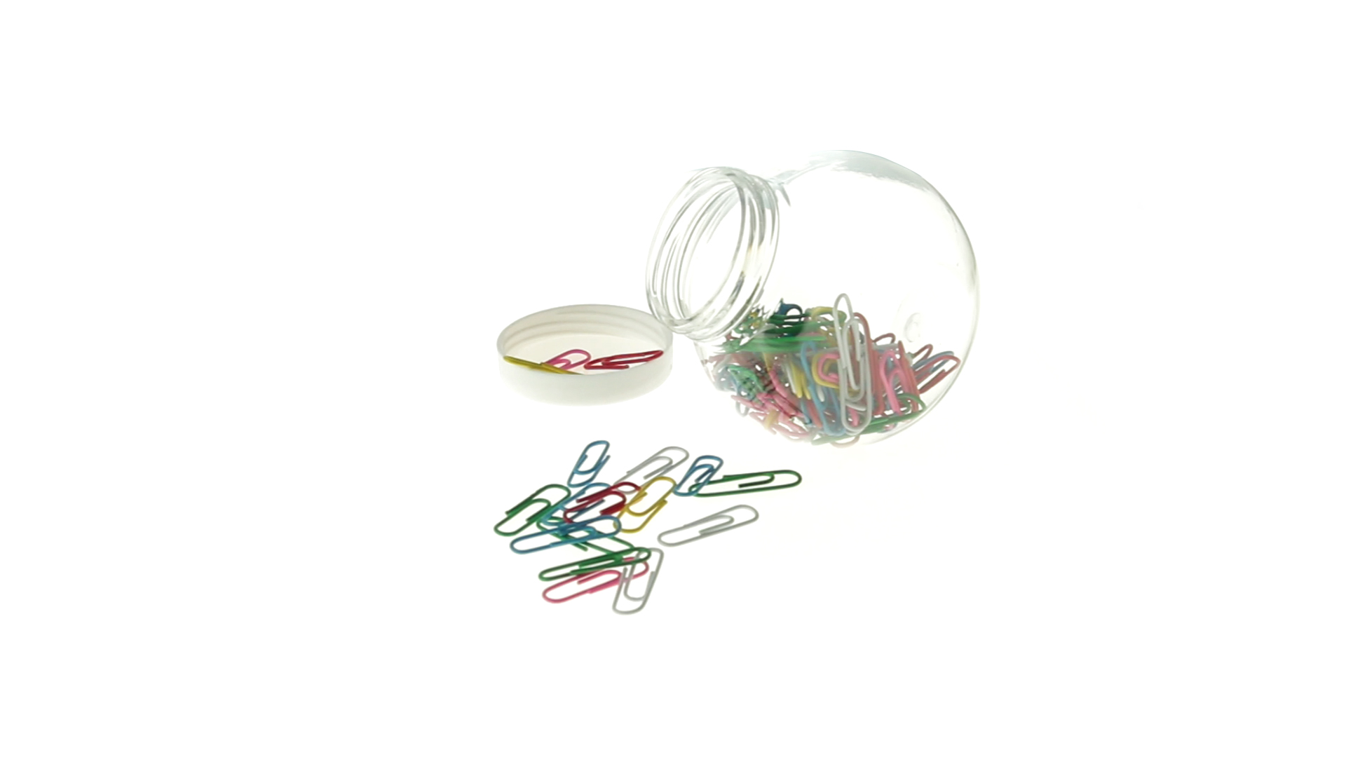 Originelles Büroklammern-Glas mit weissem Schraubverschluss und glatter Oberfläche zum Bedrucken. Mit 100 Clips mit PVC-Überzug in vielen verschiedenen Farben.
