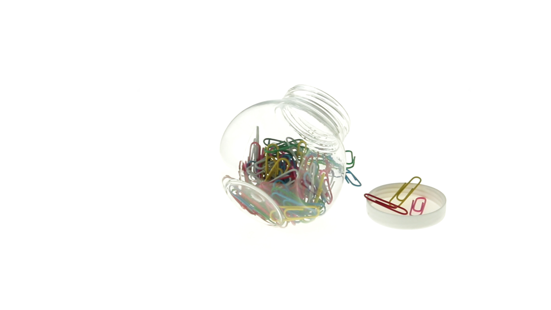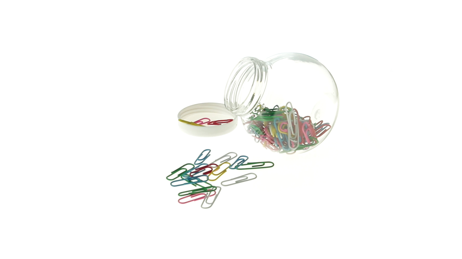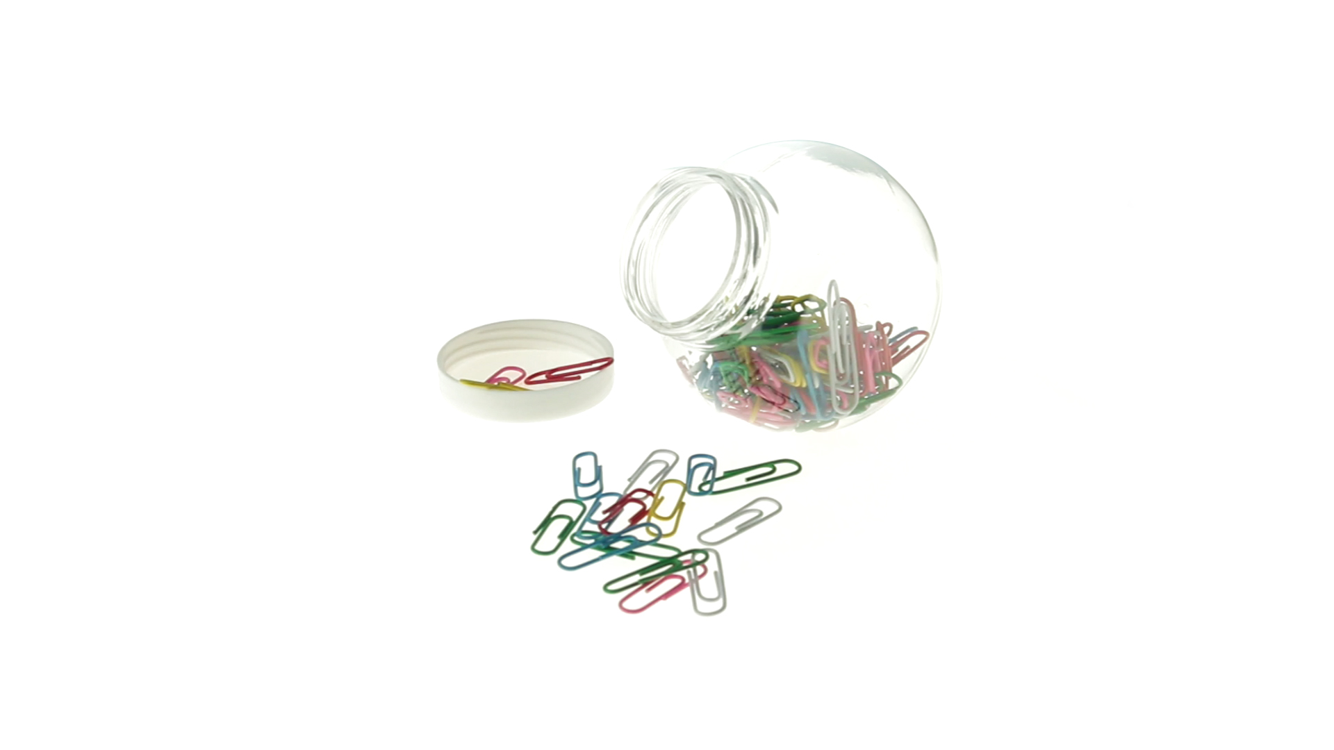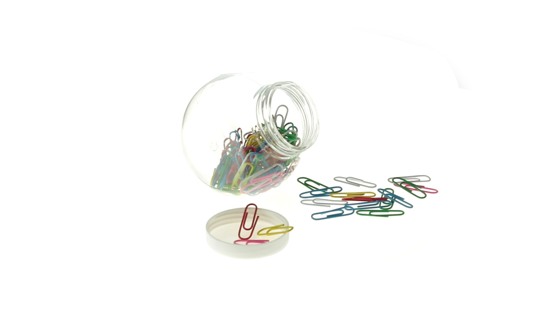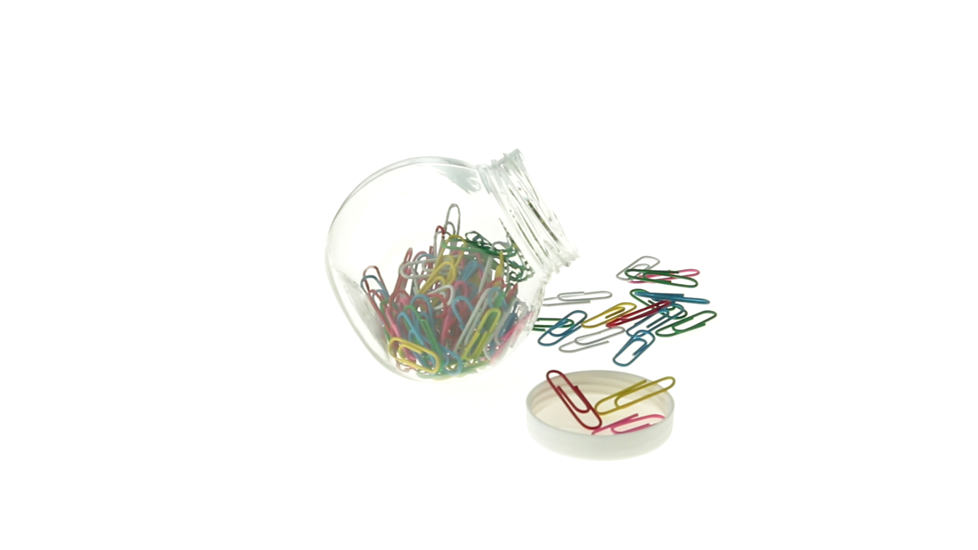 Originelles Büroklammern-Glas mit weissem Schraubverschluss und glatter Oberfläche zum Bedrucken. Mit 100 Clips mit PVC-Überzug in vielen verschiedenen Farben.