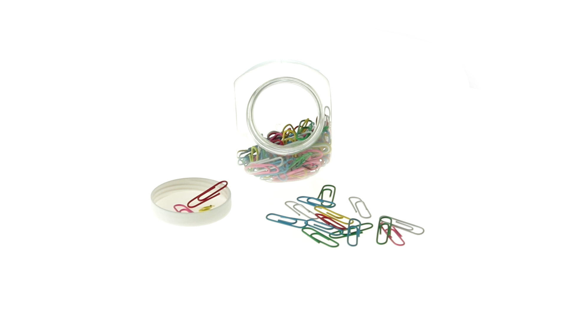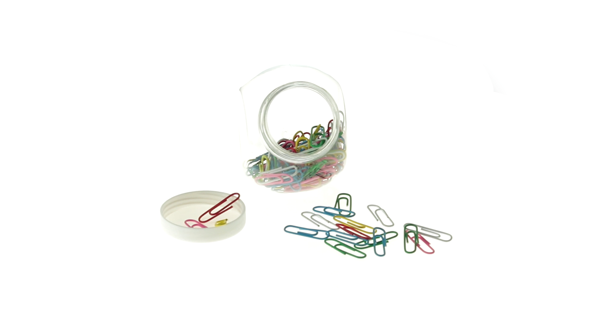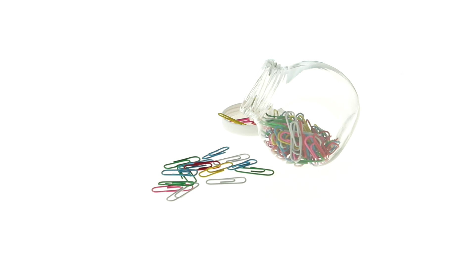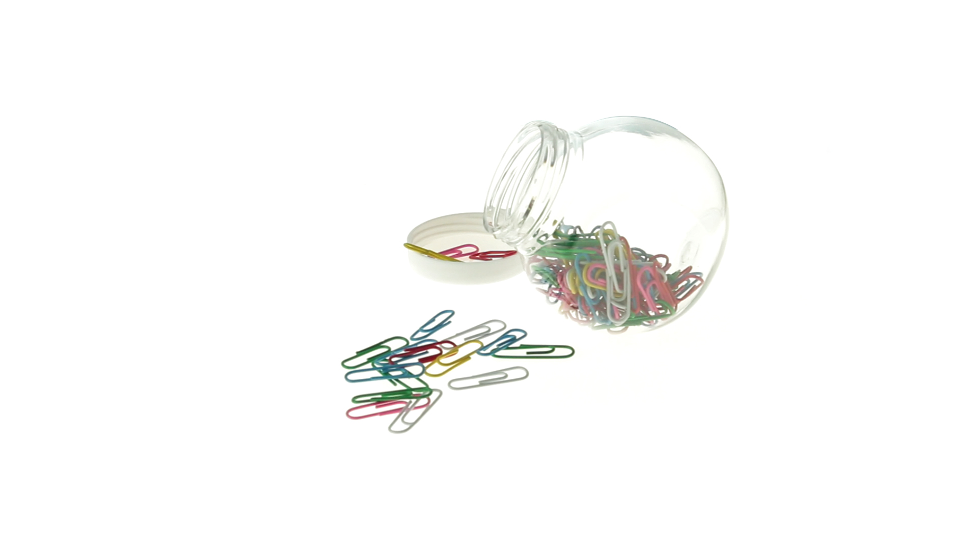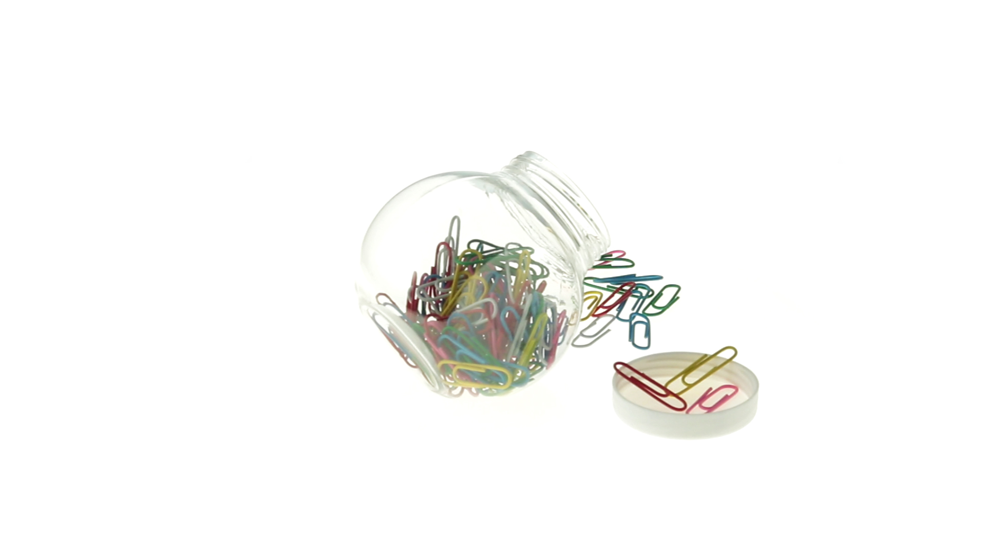 Originelles Büroklammern-Glas mit weissem Schraubverschluss und glatter Oberfläche zum Bedrucken. Mit 100 Clips mit PVC-Überzug in vielen verschiedenen Farben.
