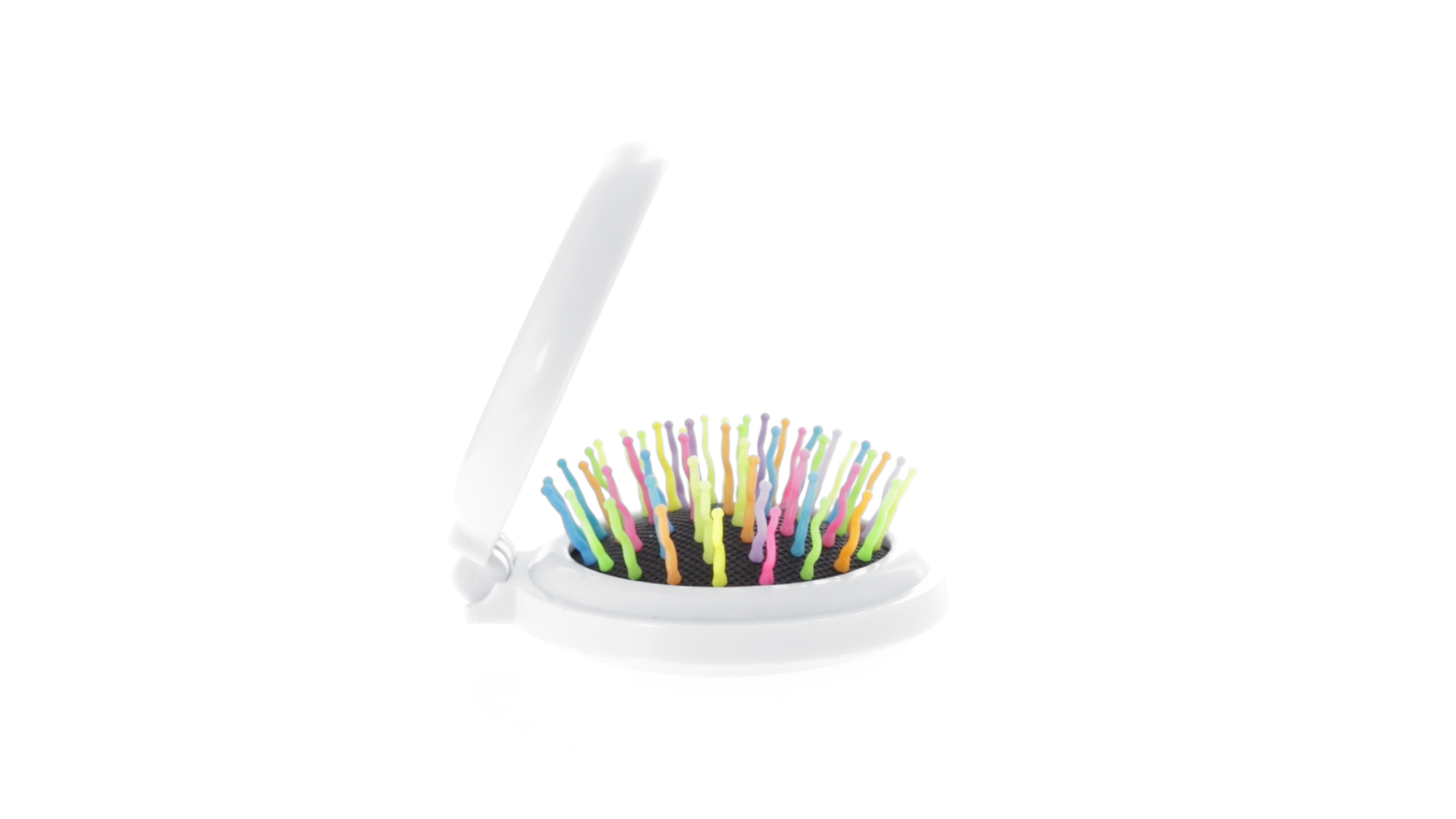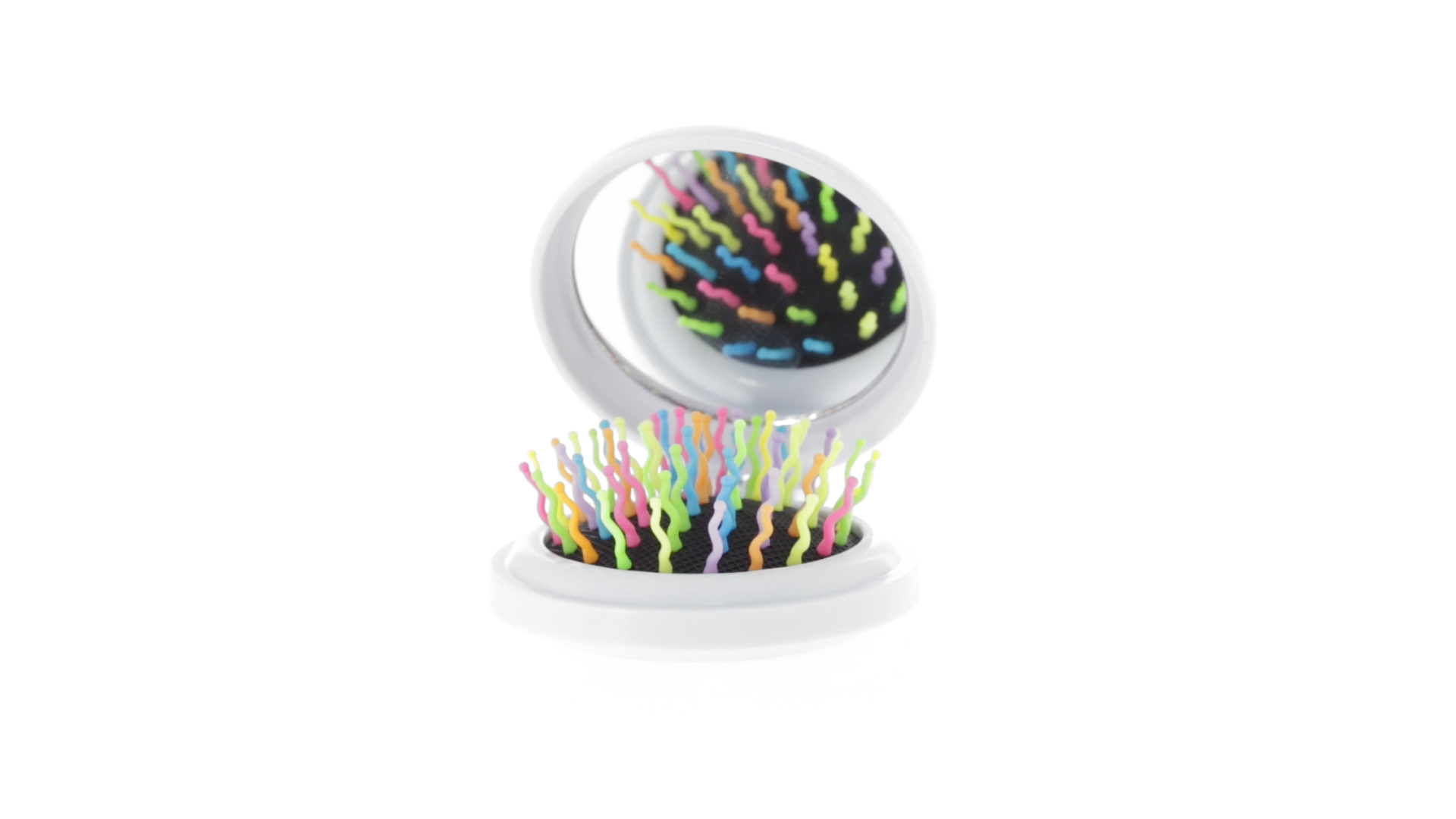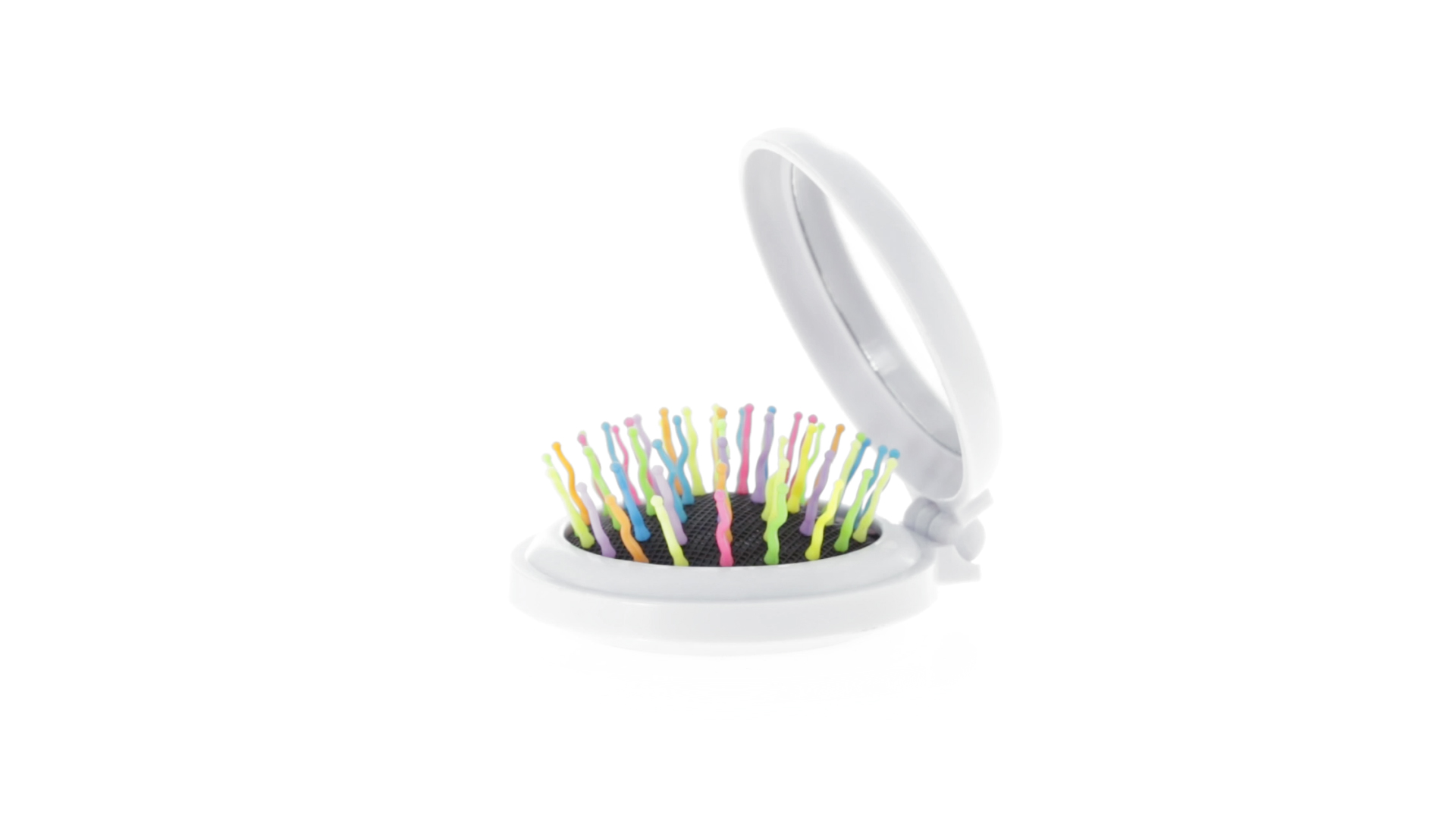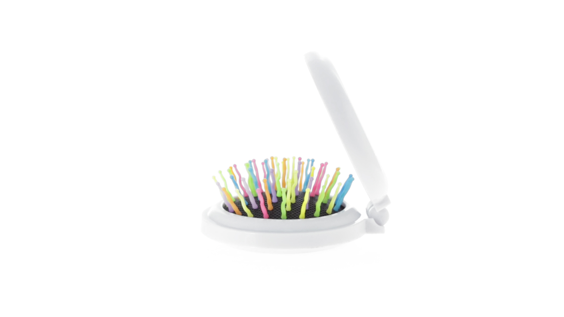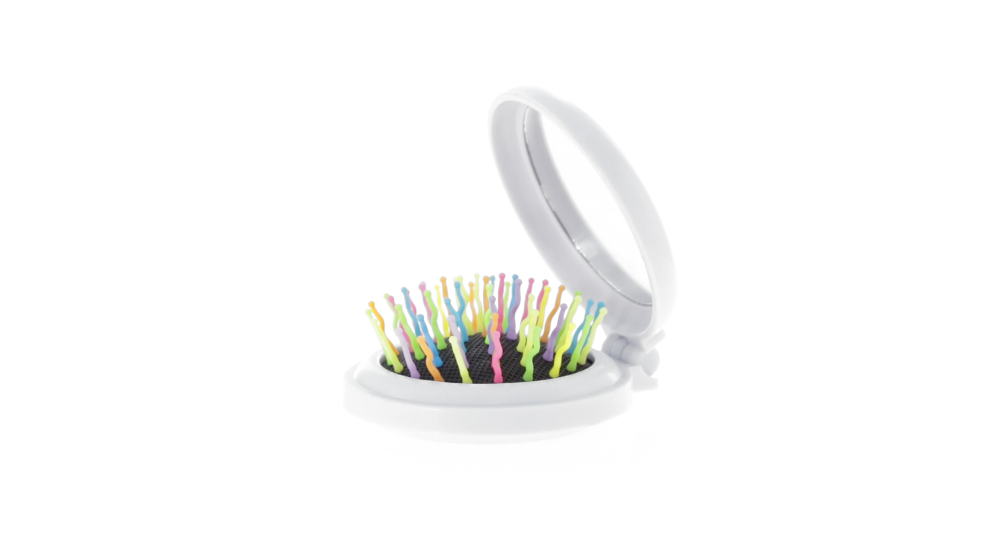 Originelle Klappbürste in Weiss mit bunten Borsten und integriertem Spiegel.