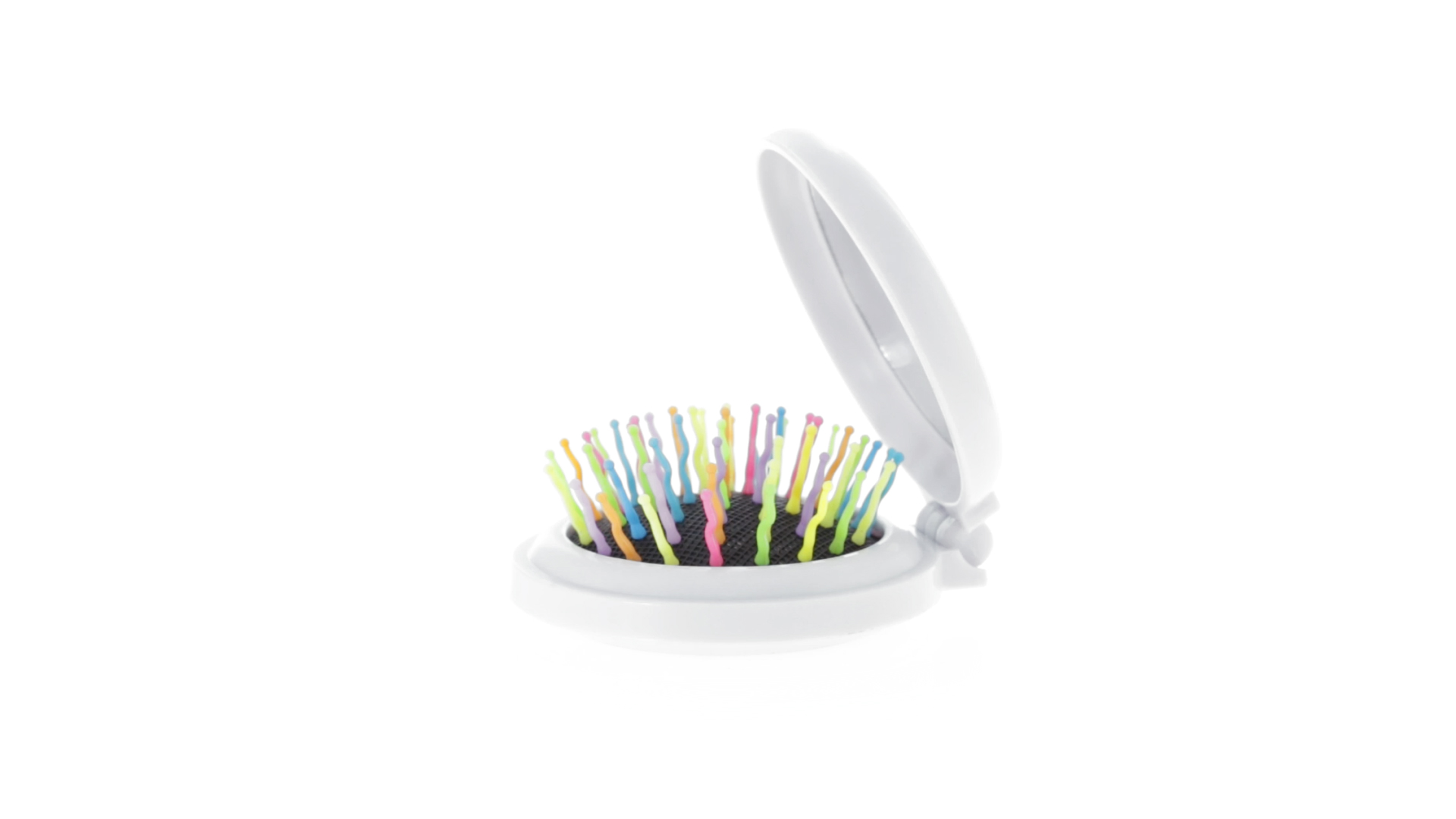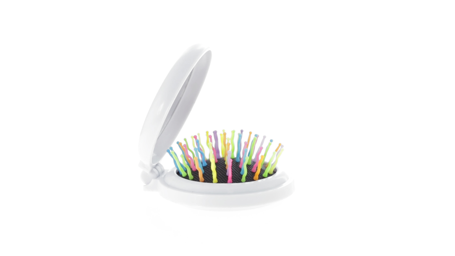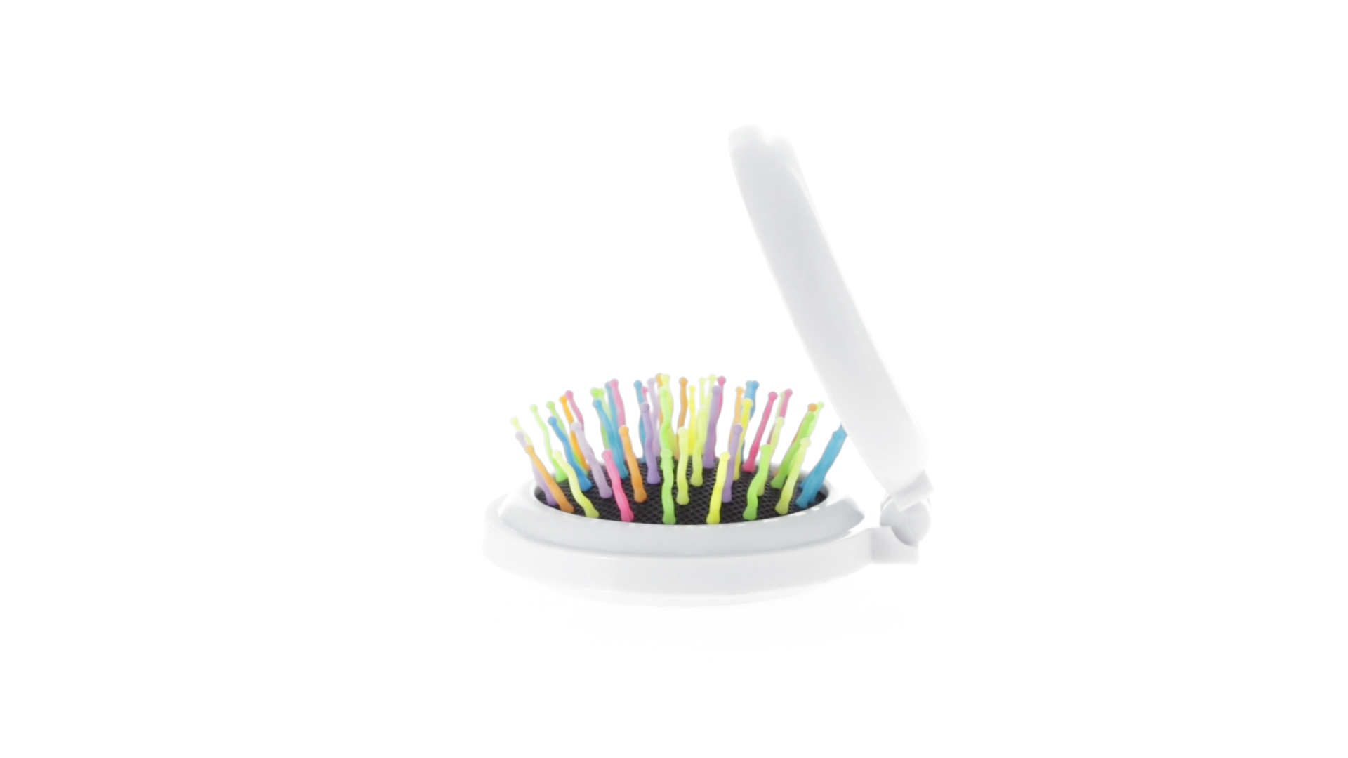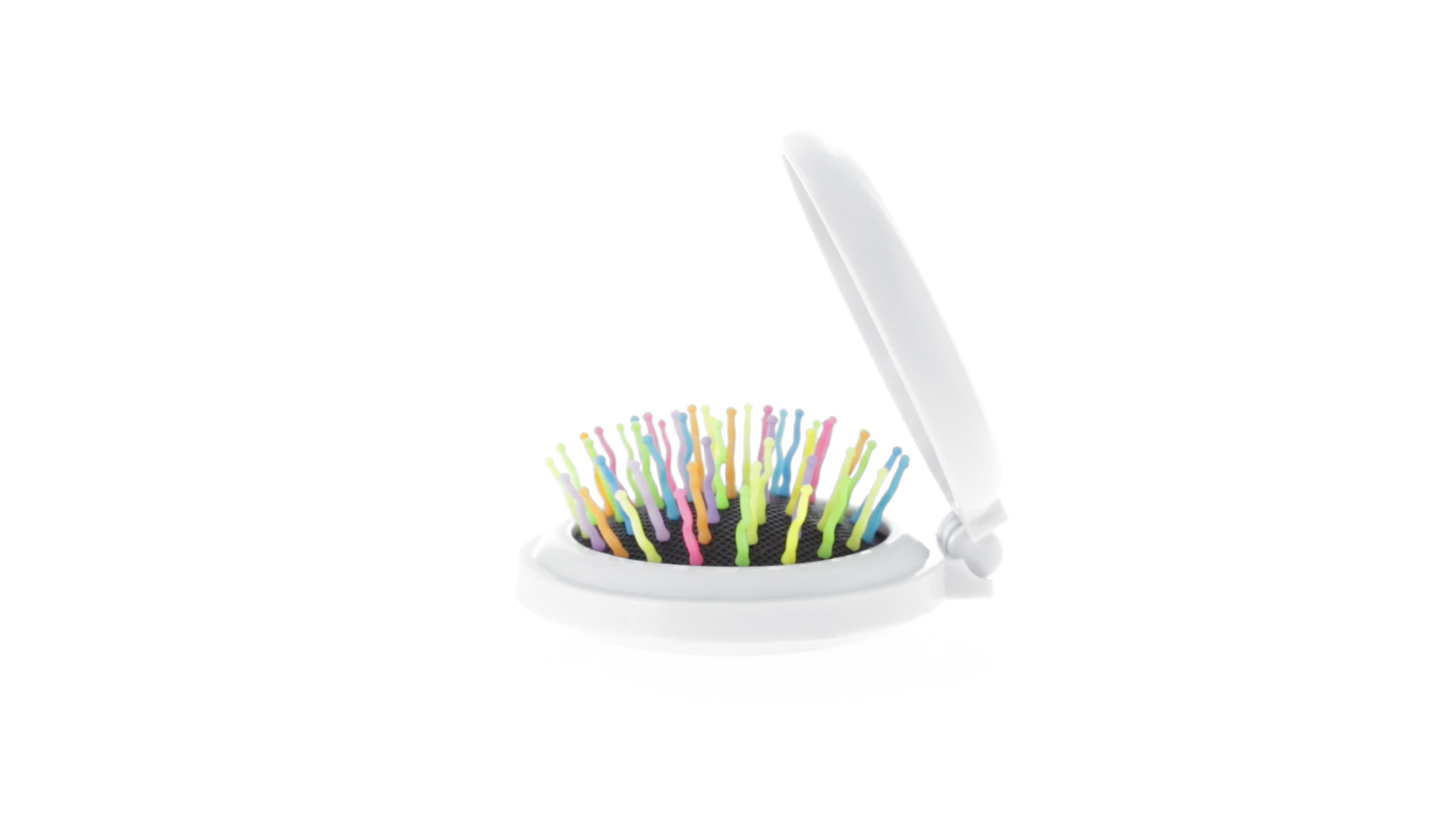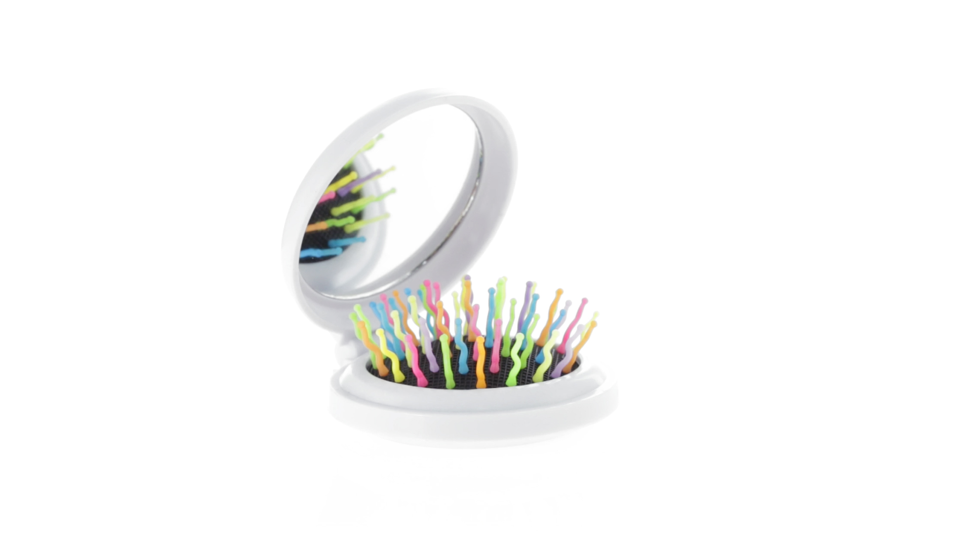 Originelle Klappbürste in Weiss mit bunten Borsten und integriertem Spiegel.