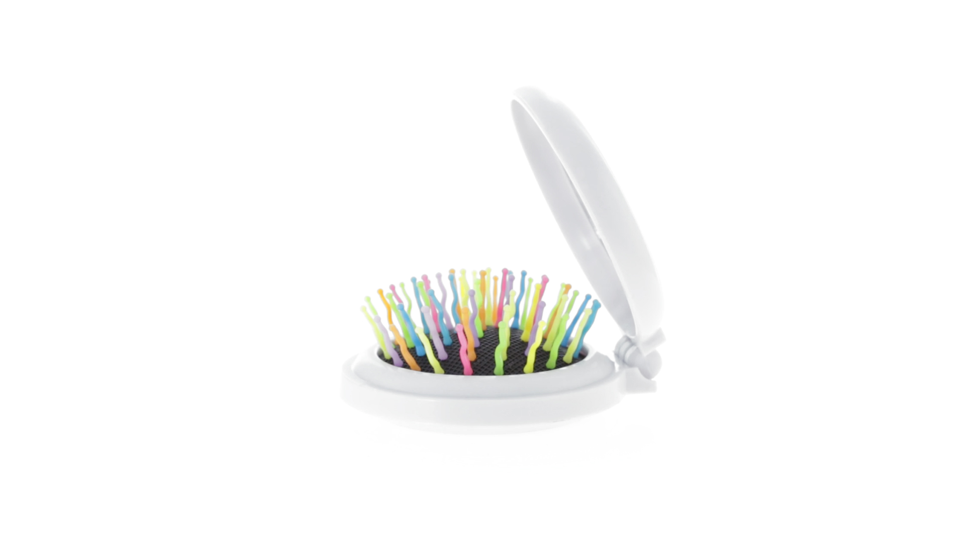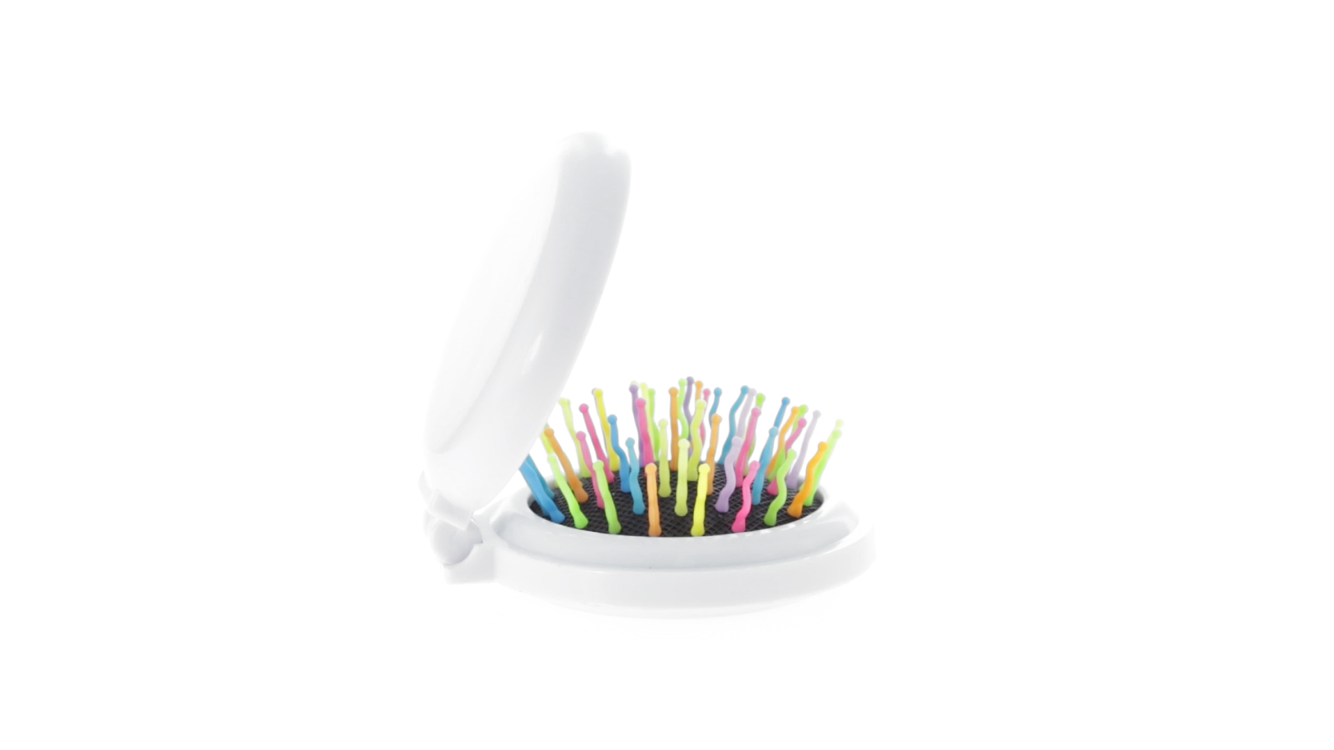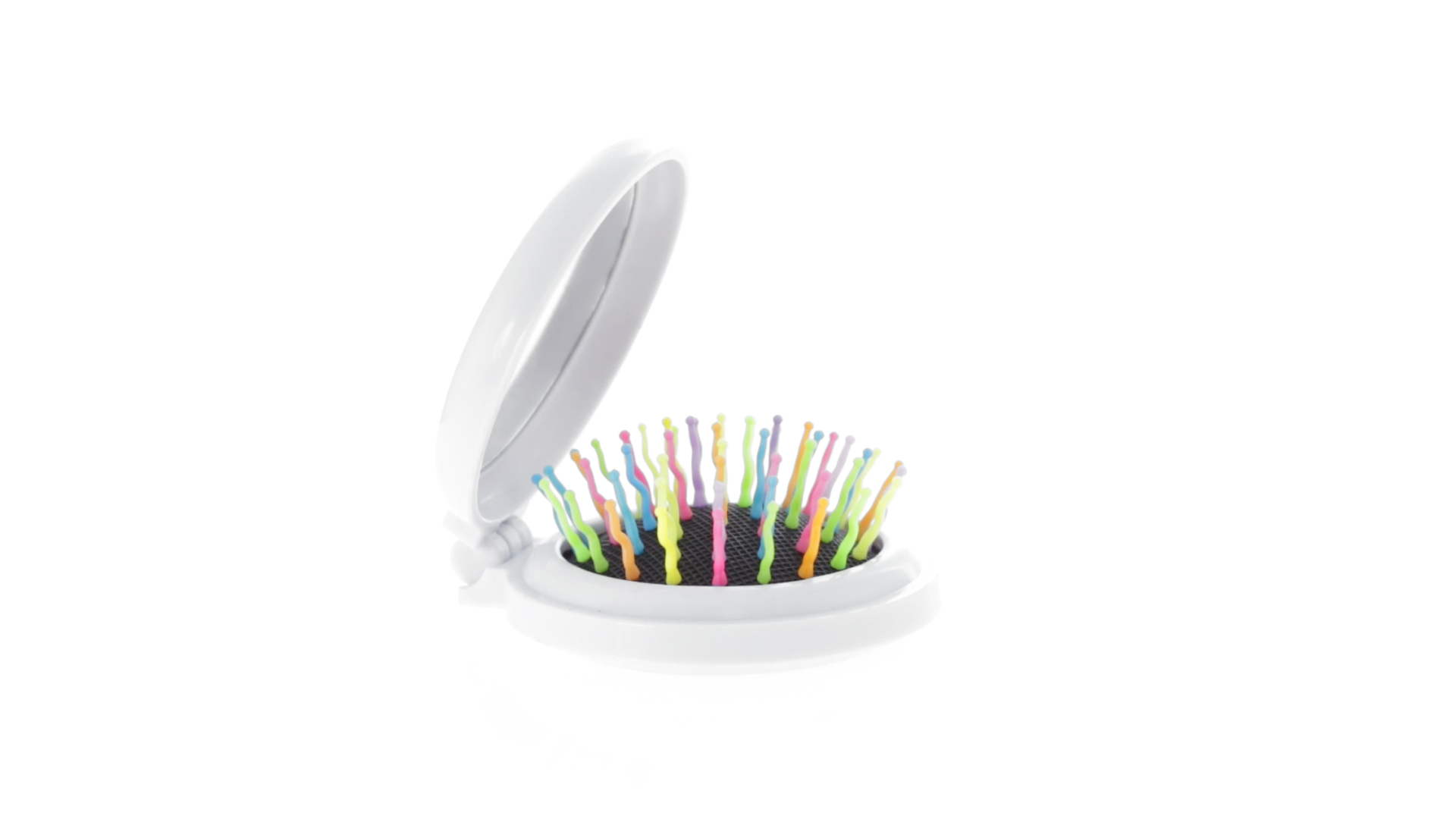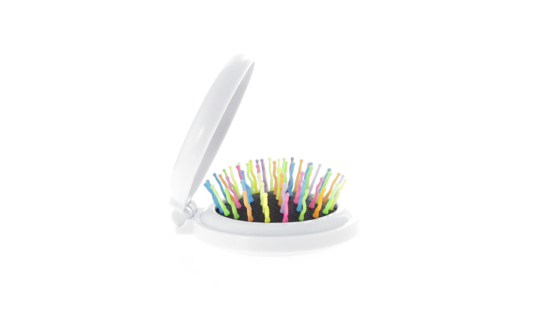 Originelle Klappbürste in Weiss mit bunten Borsten und integriertem Spiegel.