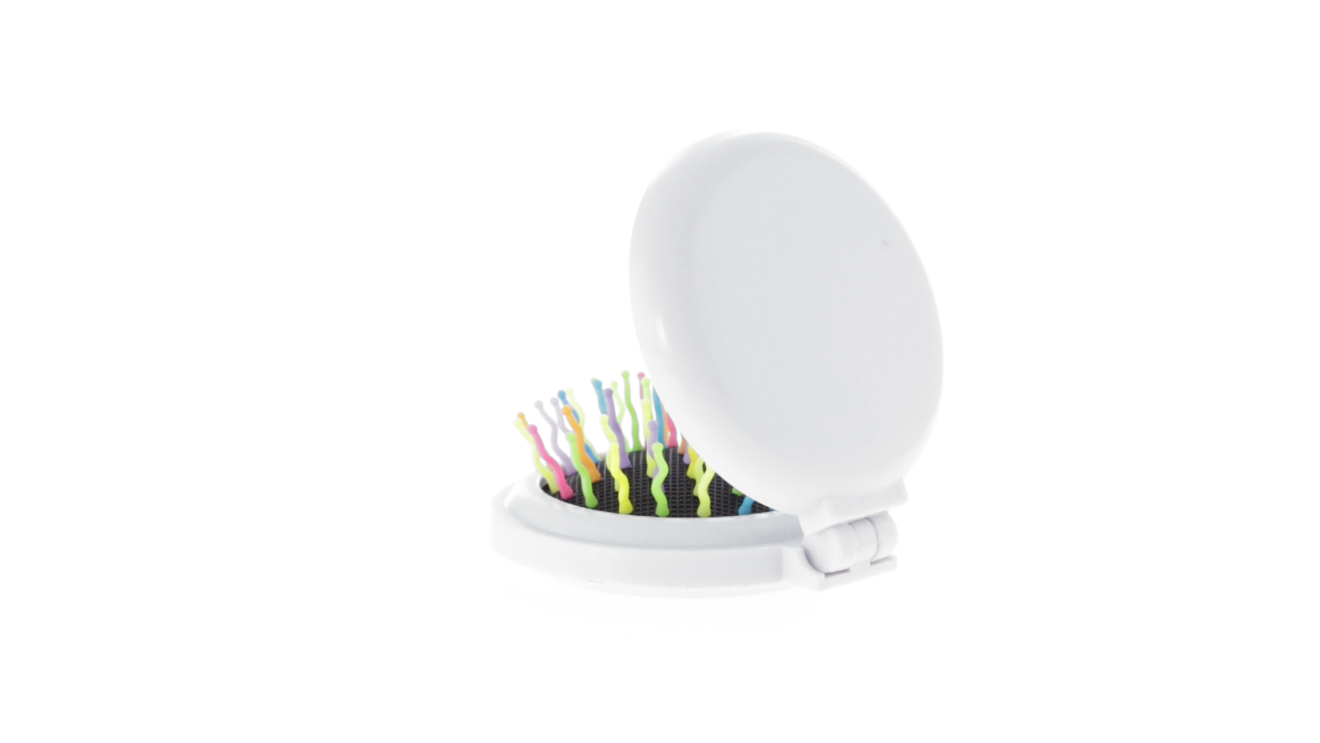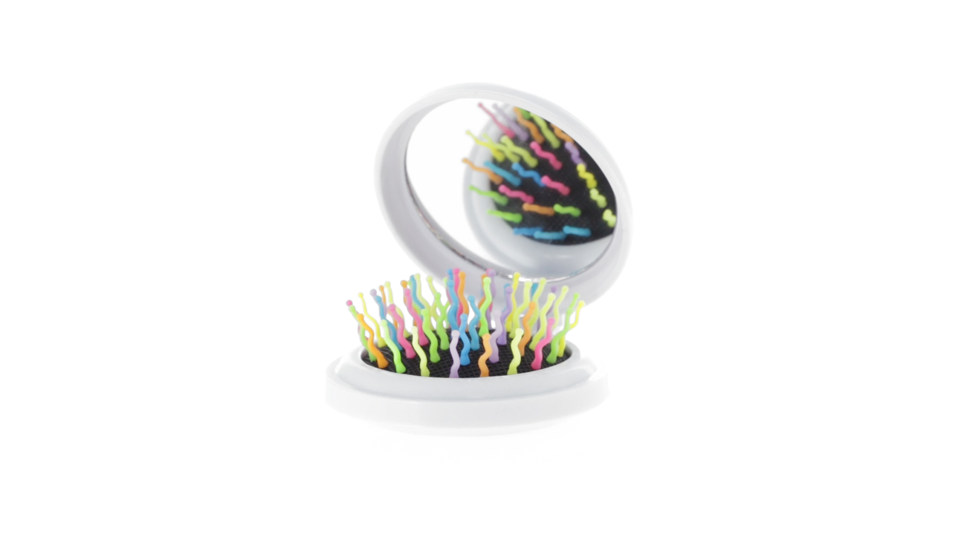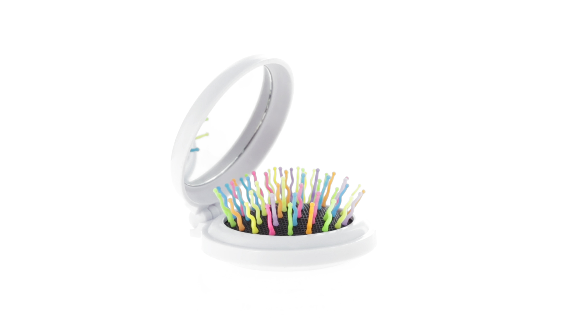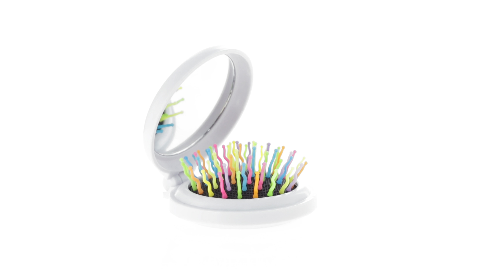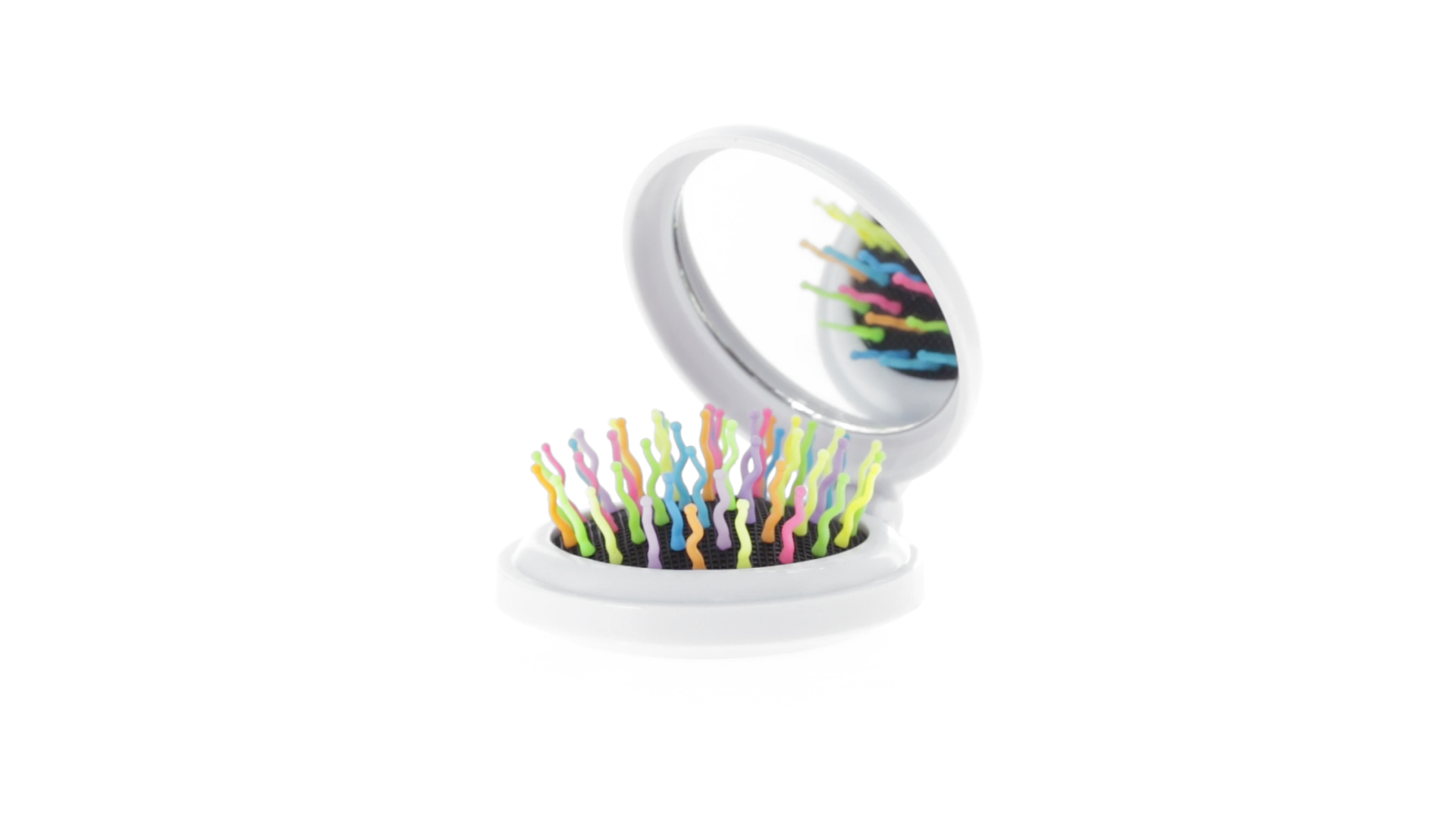 Originelle Klappbürste in Weiss mit bunten Borsten und integriertem Spiegel.