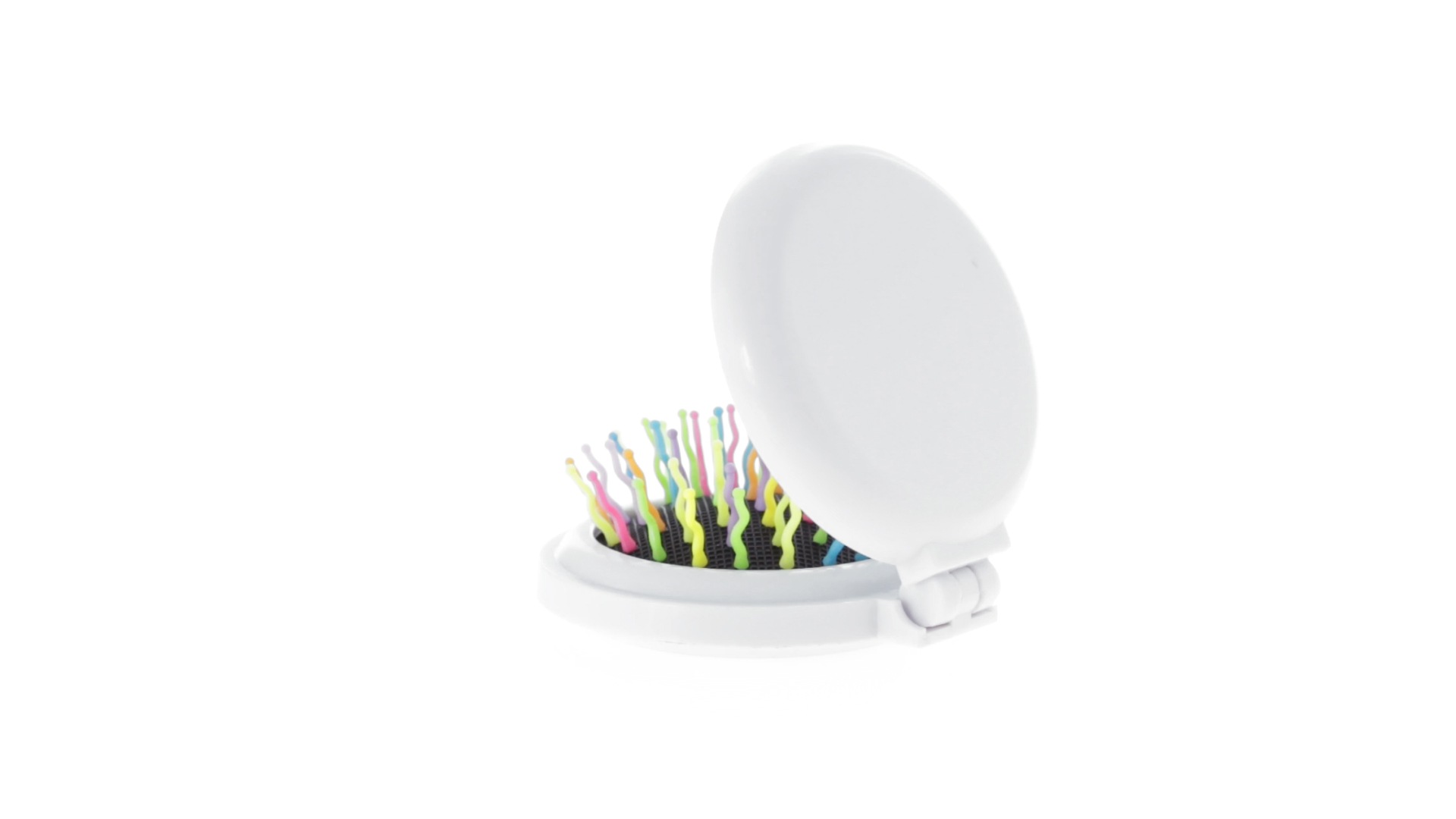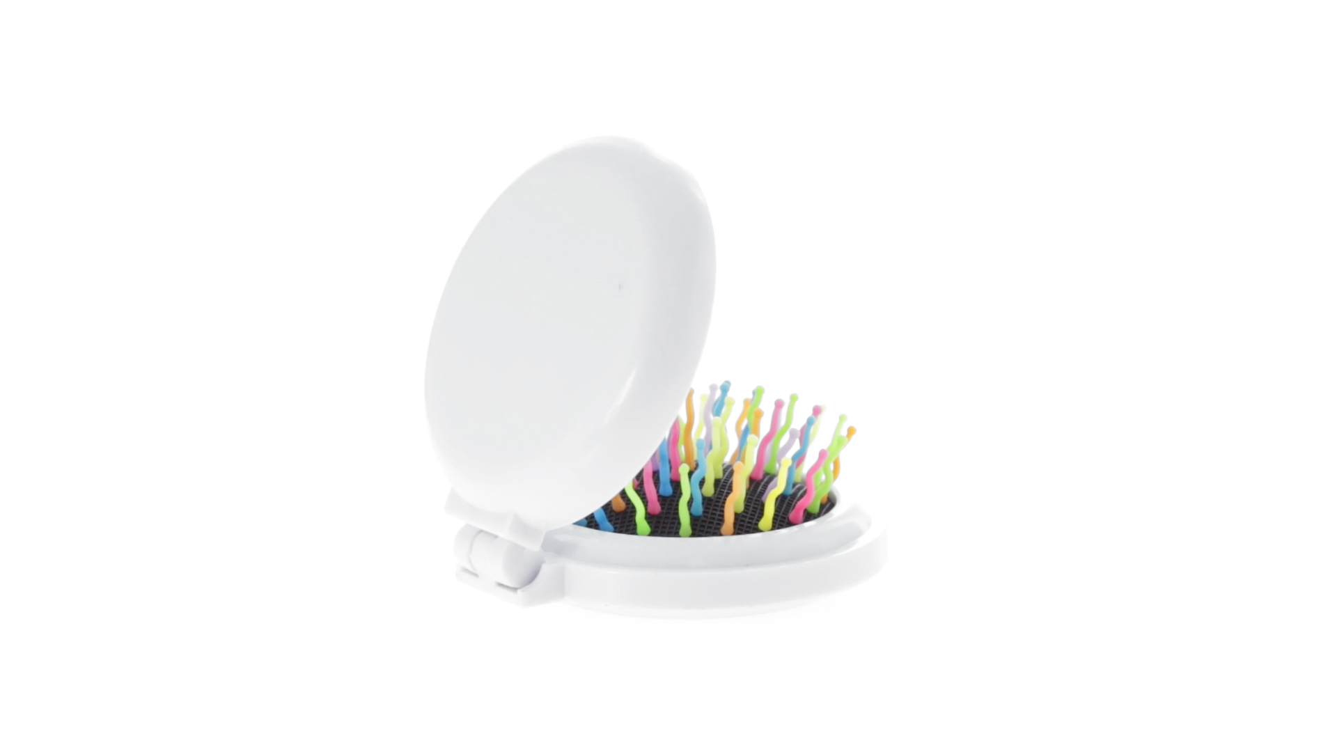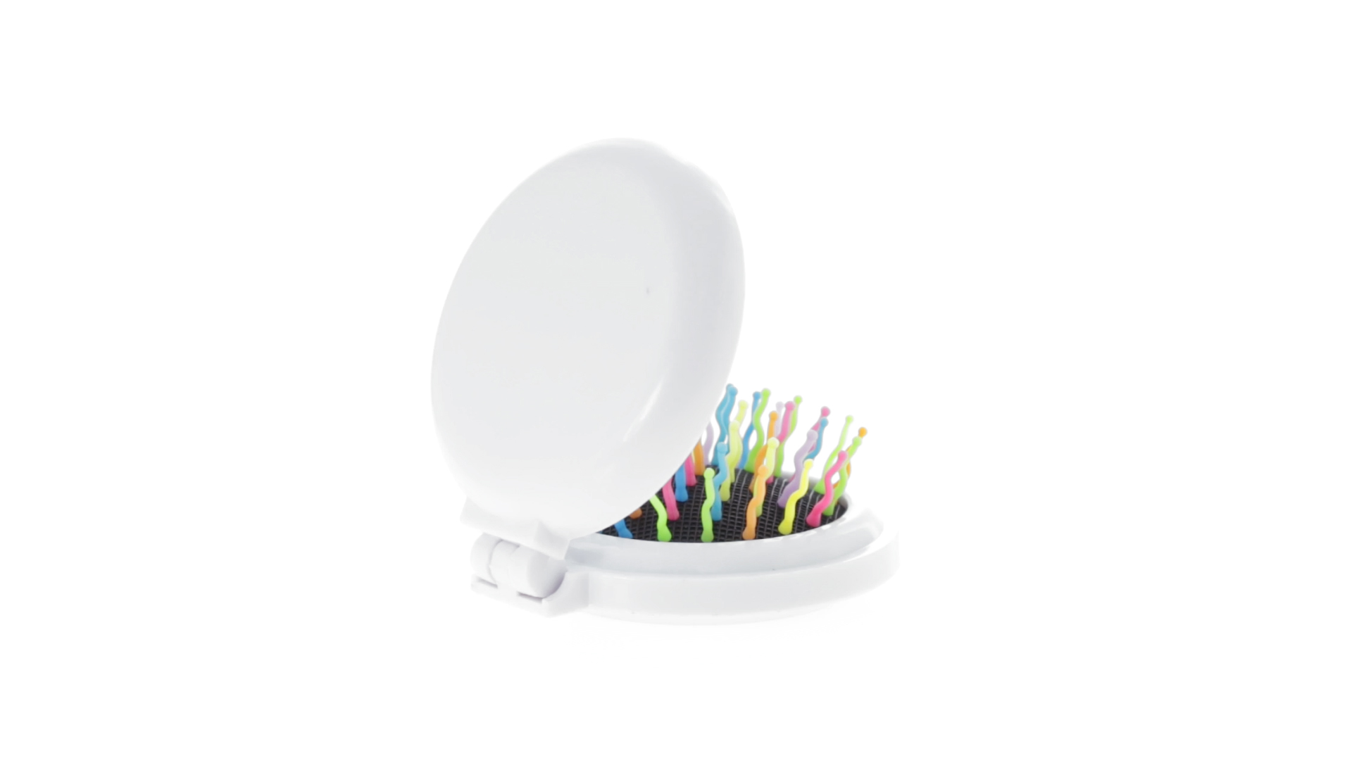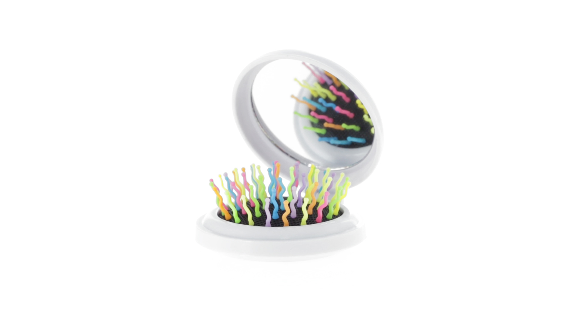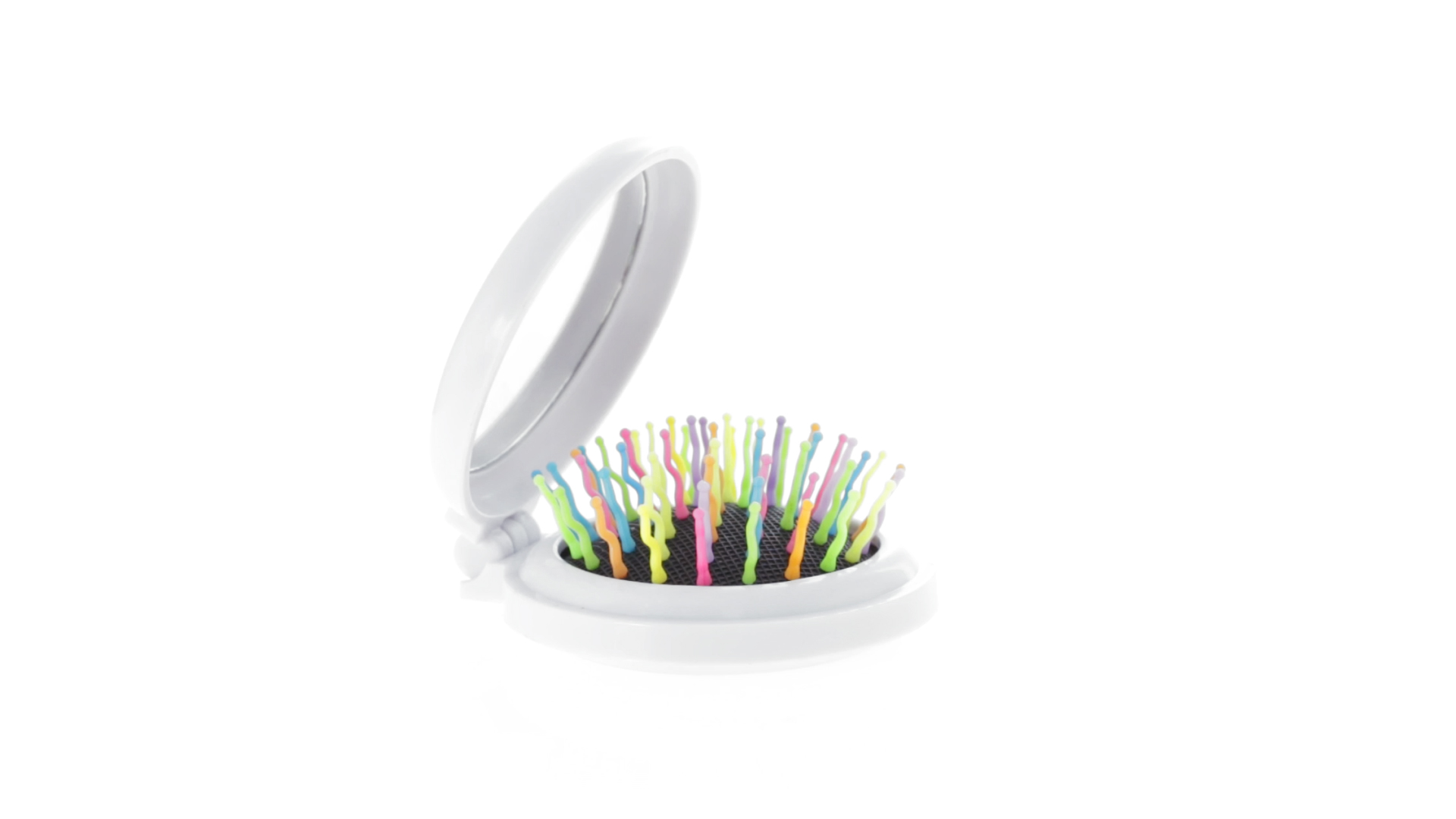 Originelle Klappbürste in Weiss mit bunten Borsten und integriertem Spiegel.