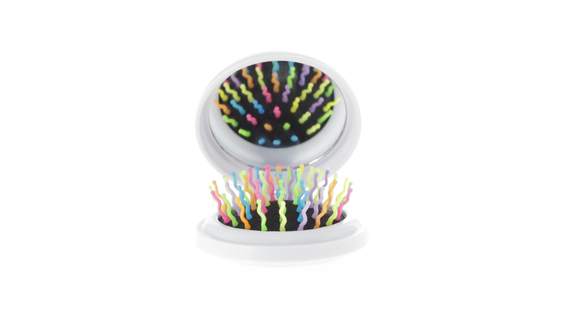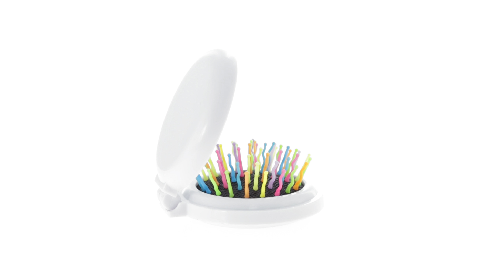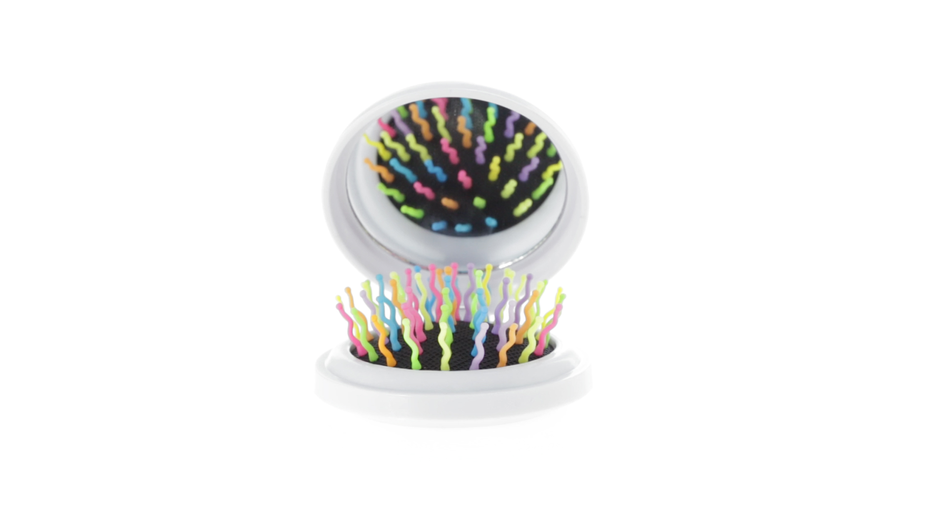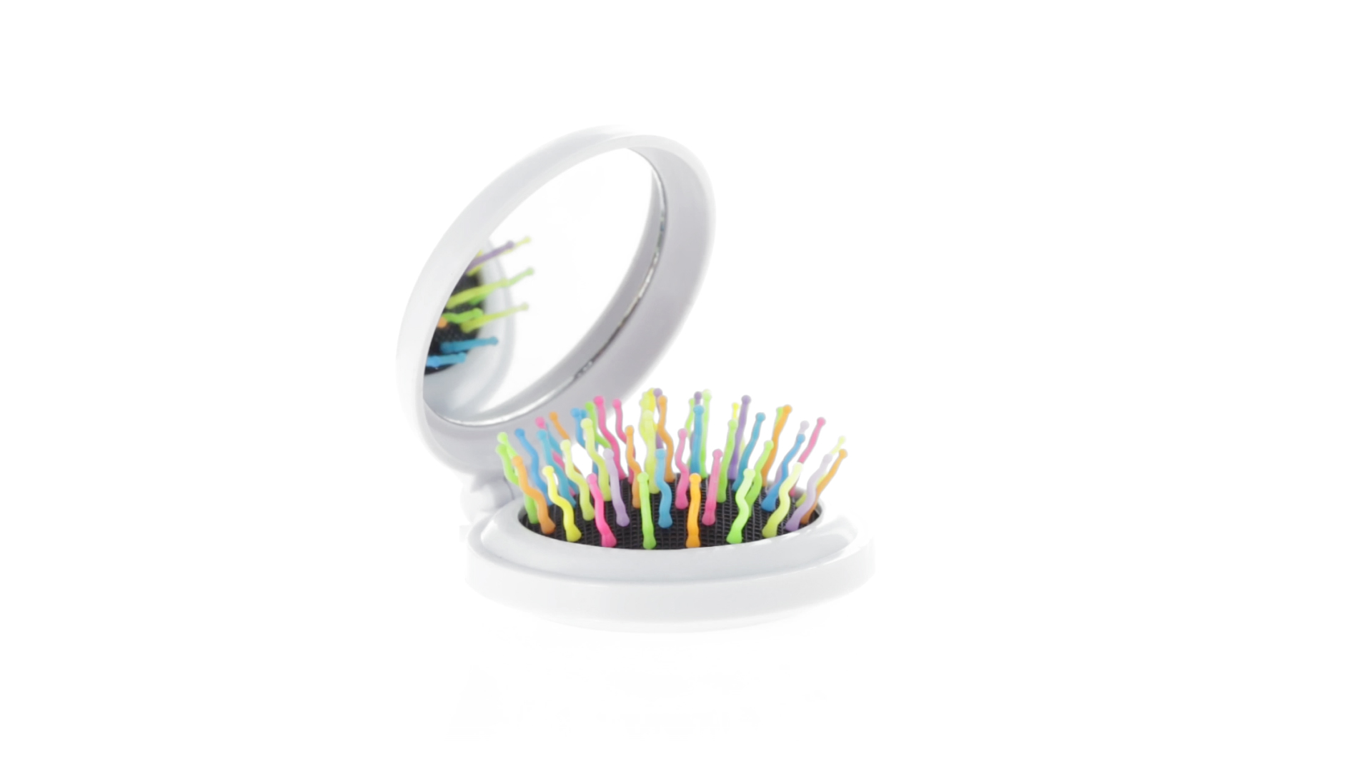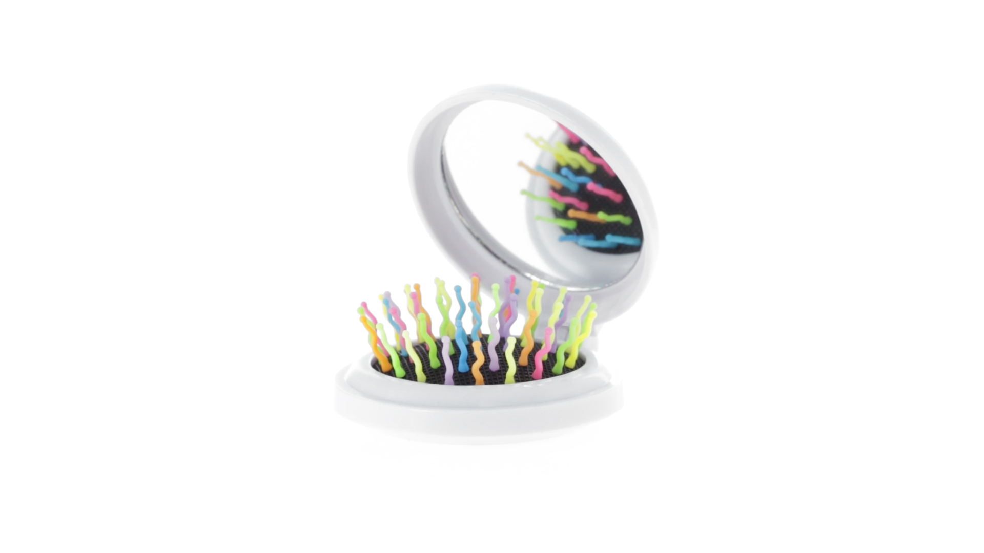 Originelle Klappbürste in Weiss mit bunten Borsten und integriertem Spiegel.