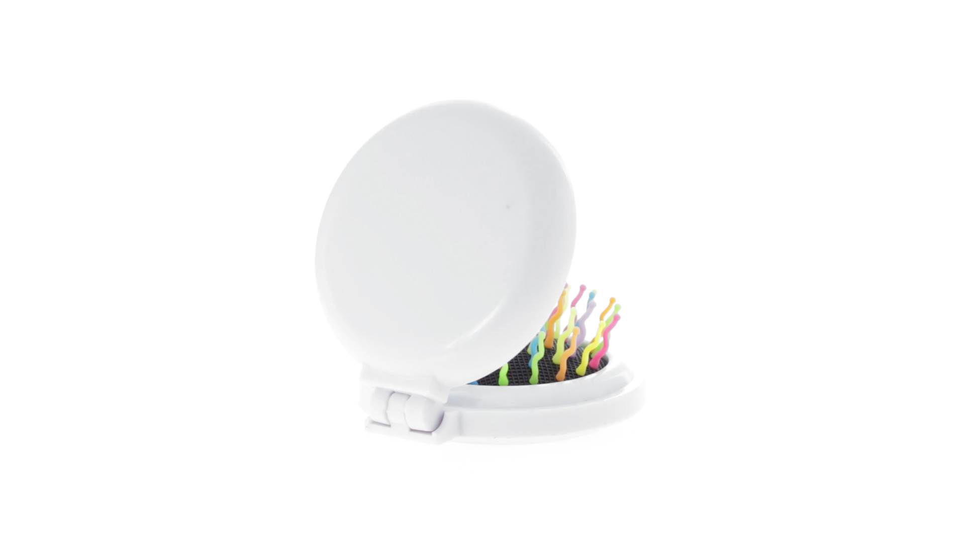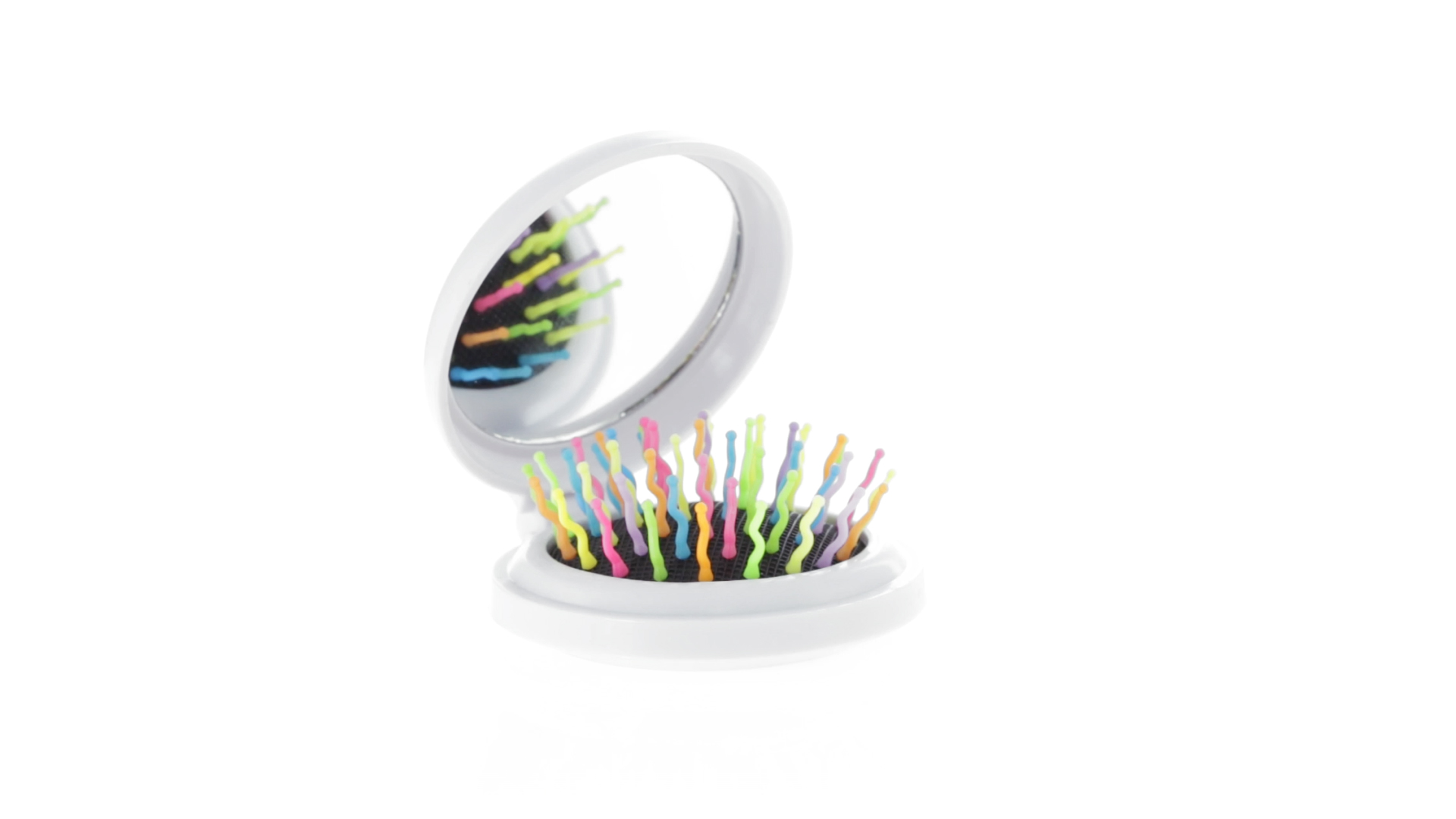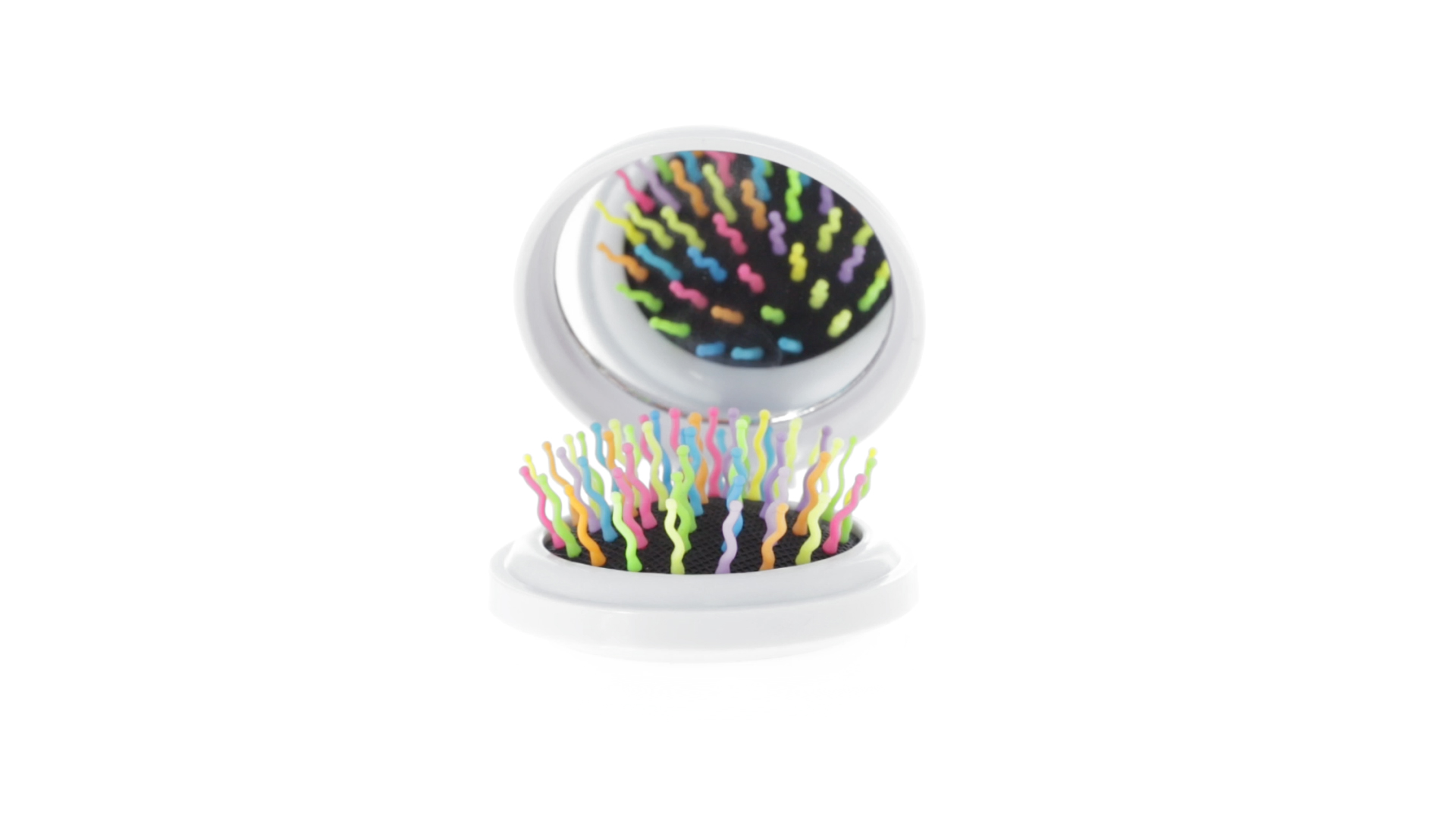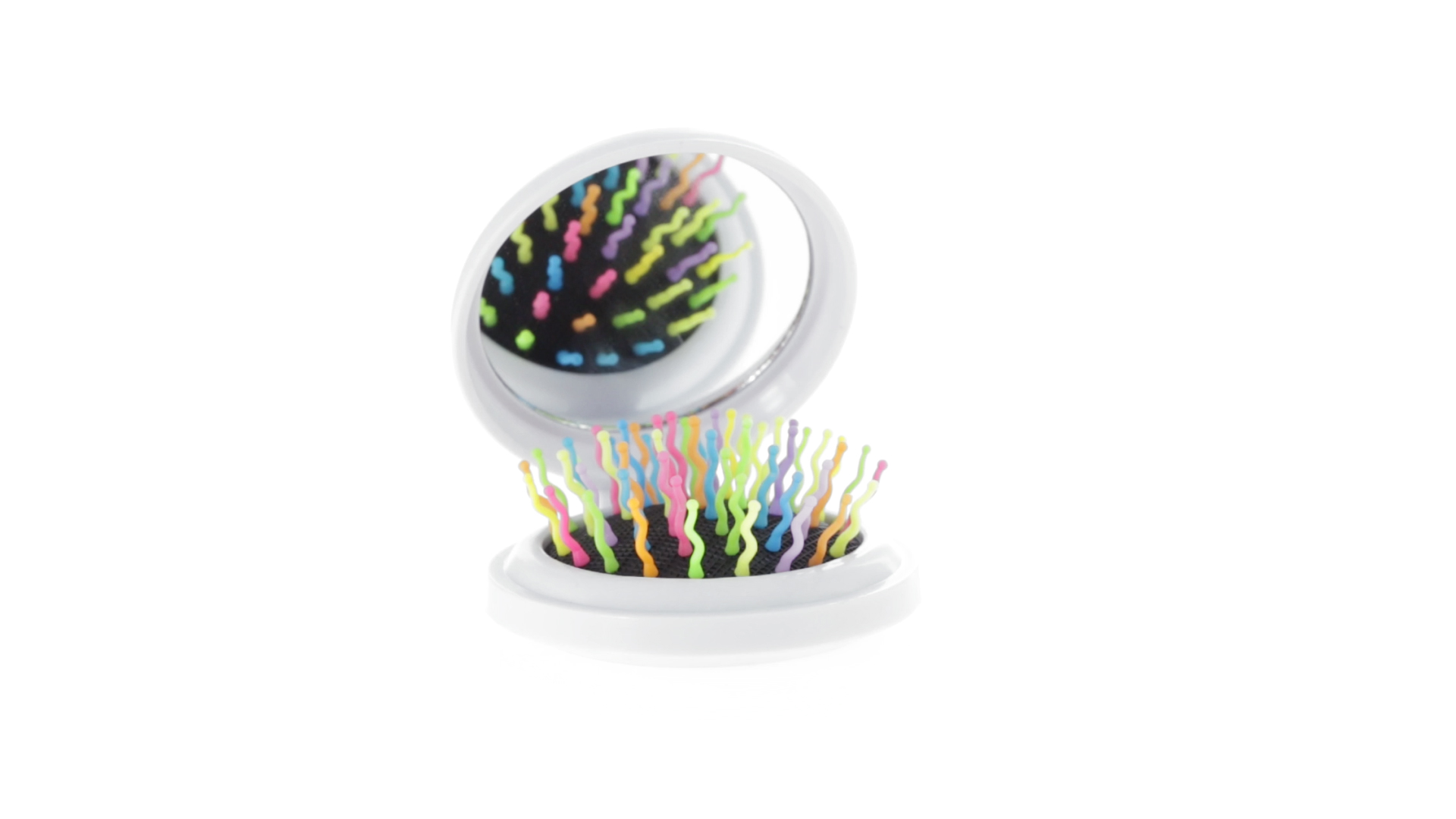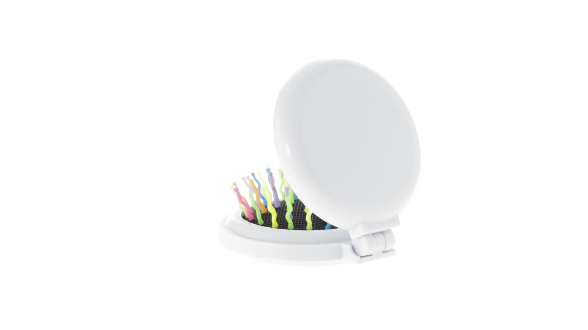 Originelle Klappbürste in Weiss mit bunten Borsten und integriertem Spiegel.