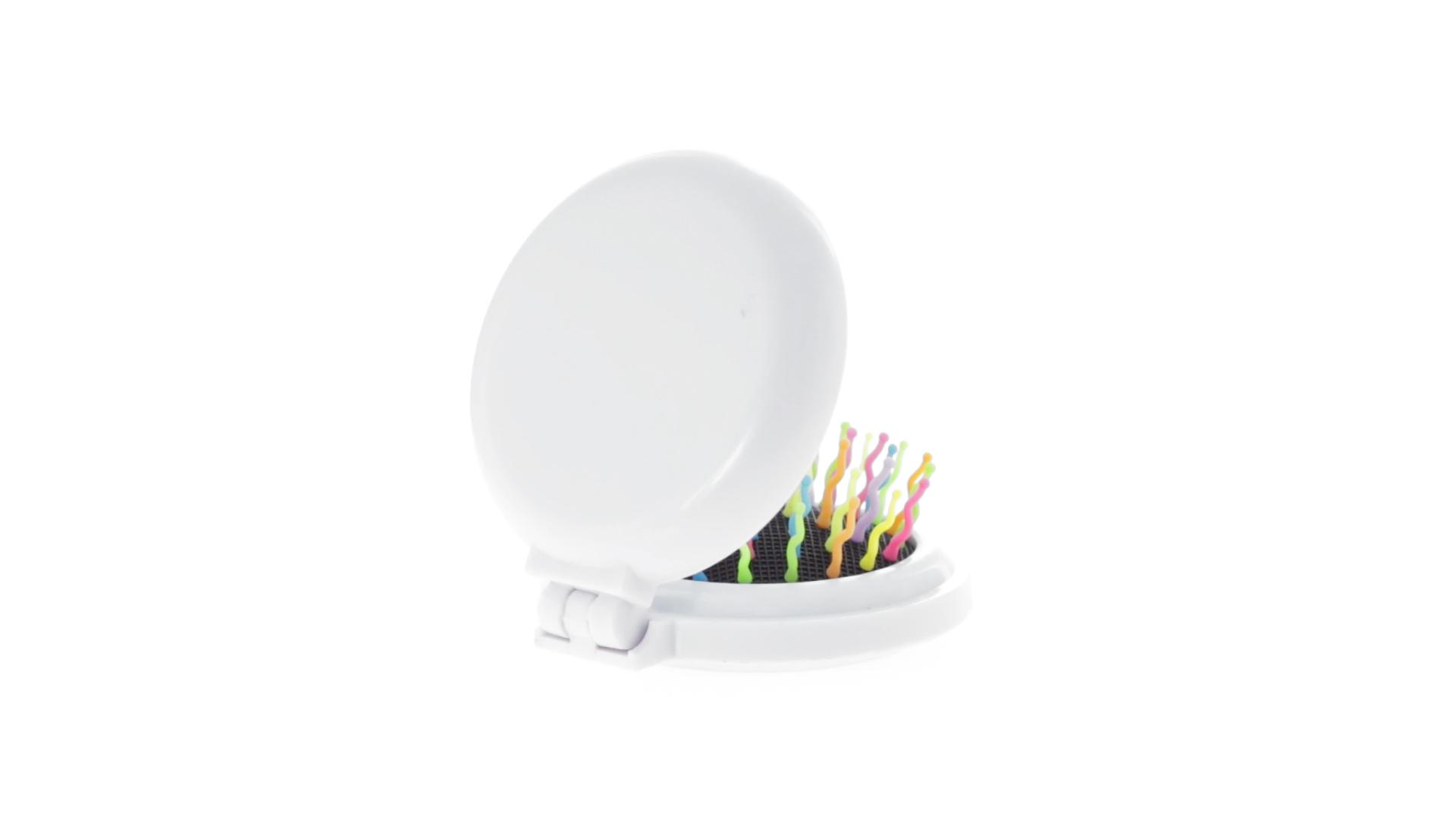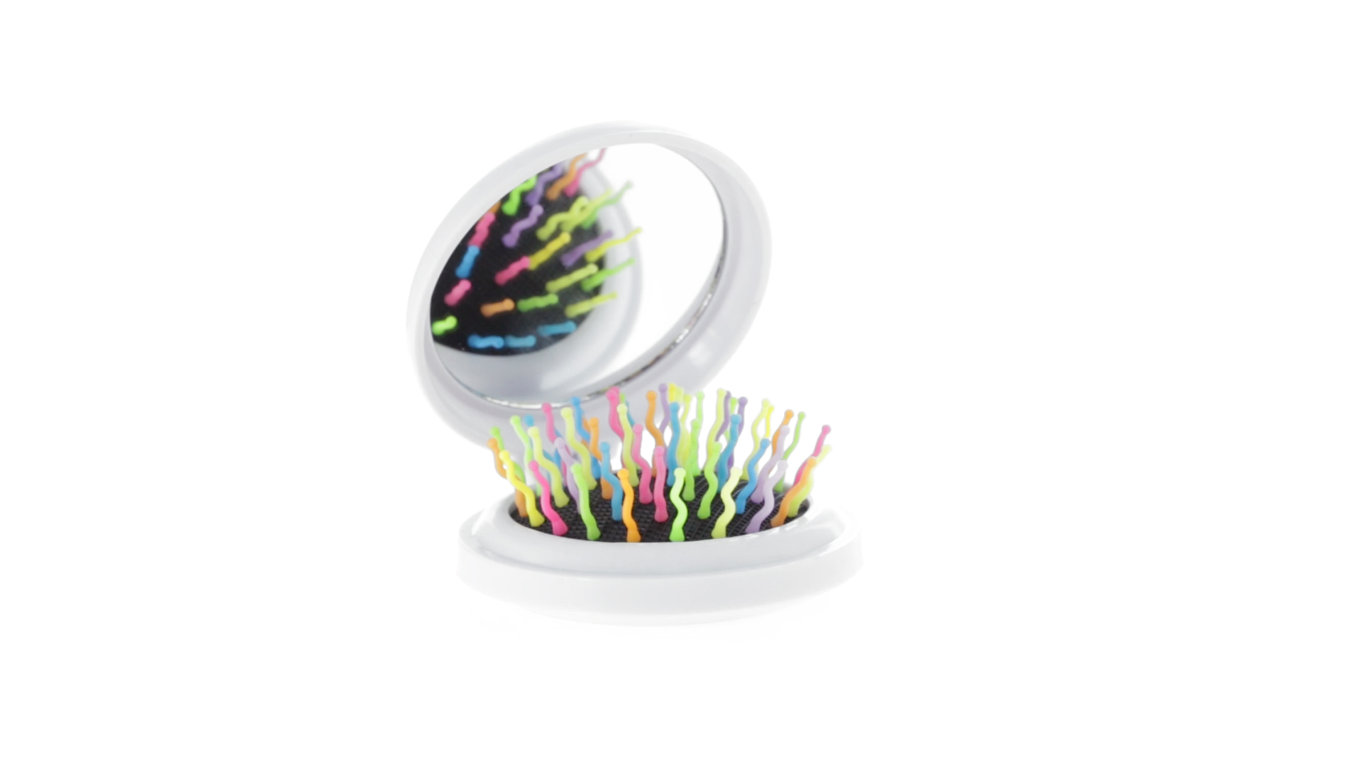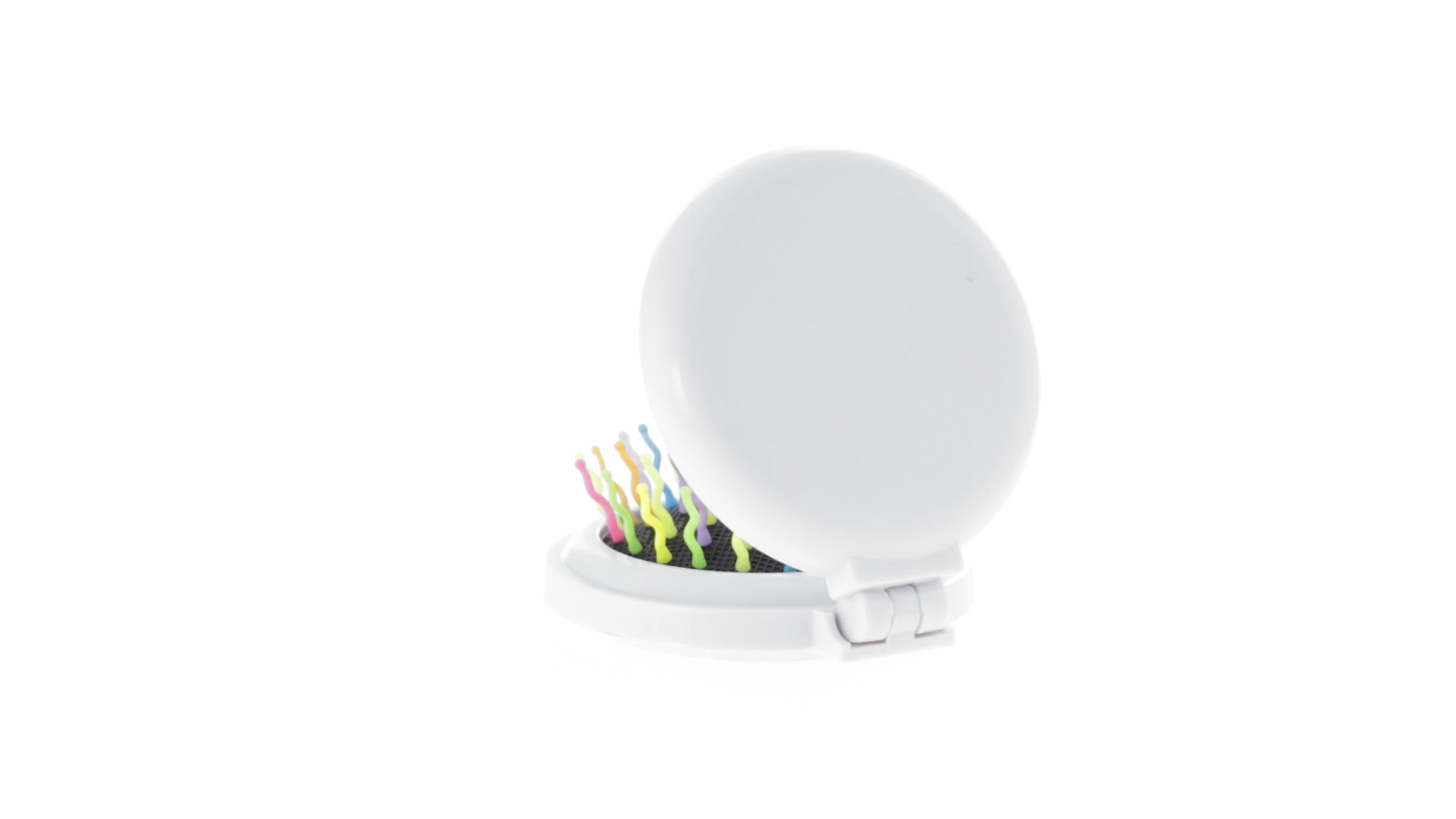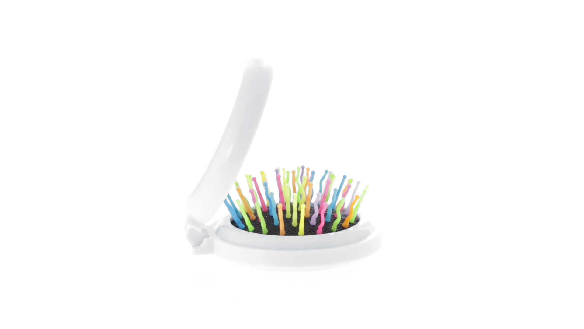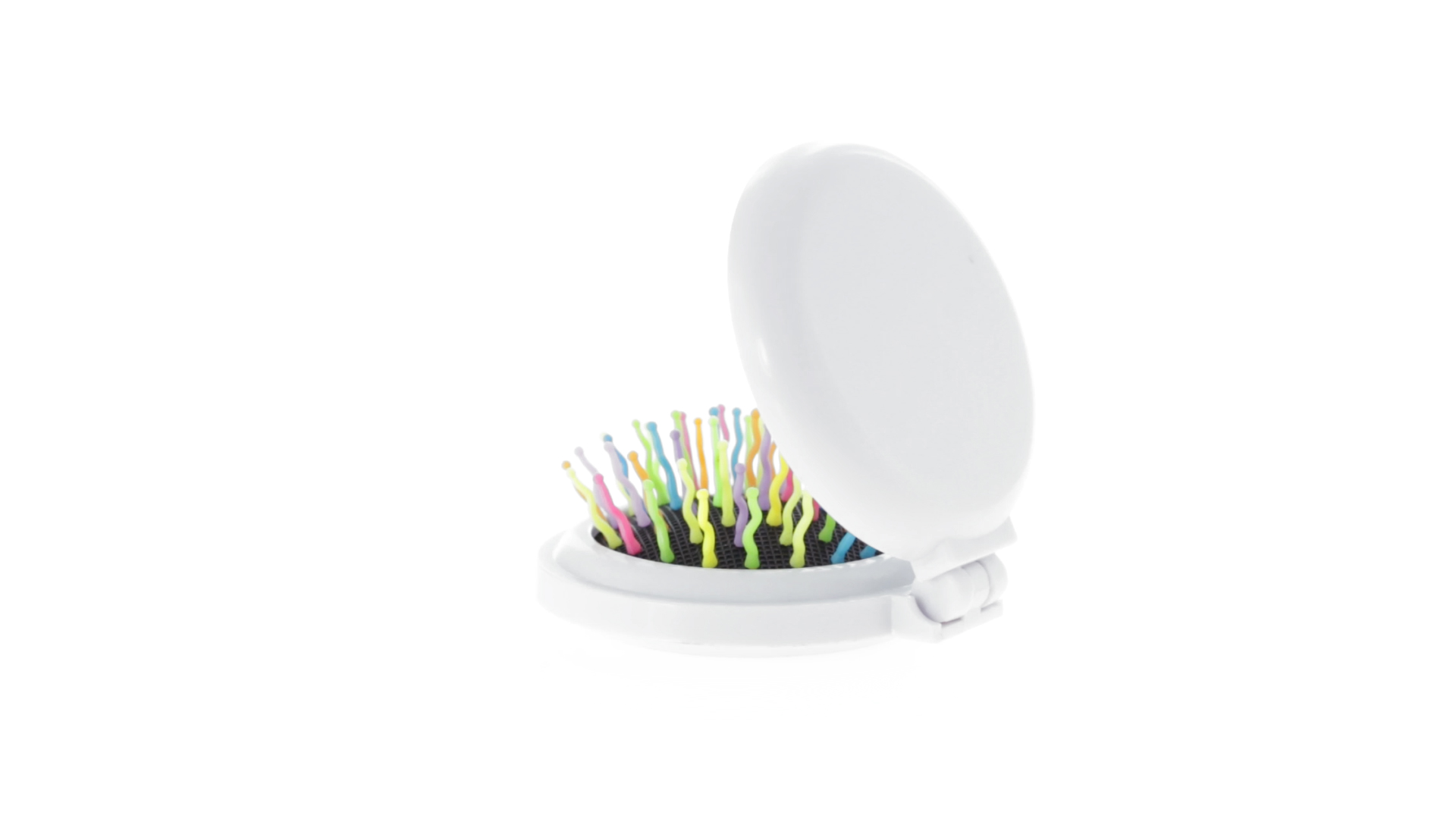 Originelle Klappbürste in Weiss mit bunten Borsten und integriertem Spiegel.