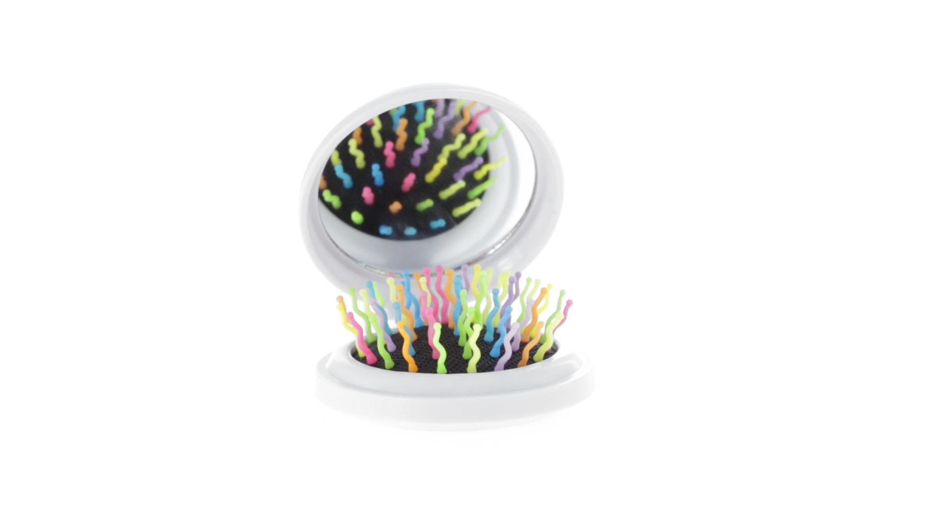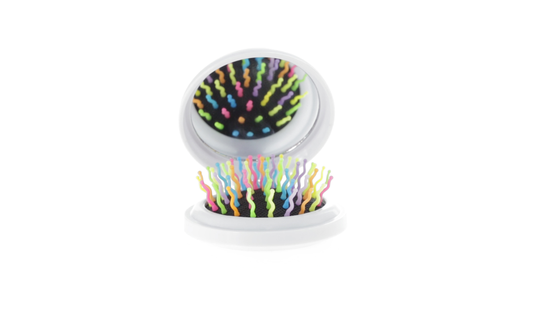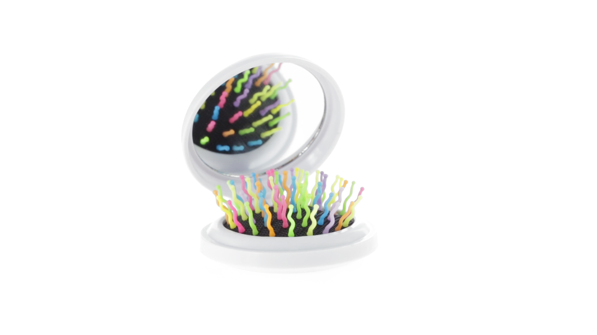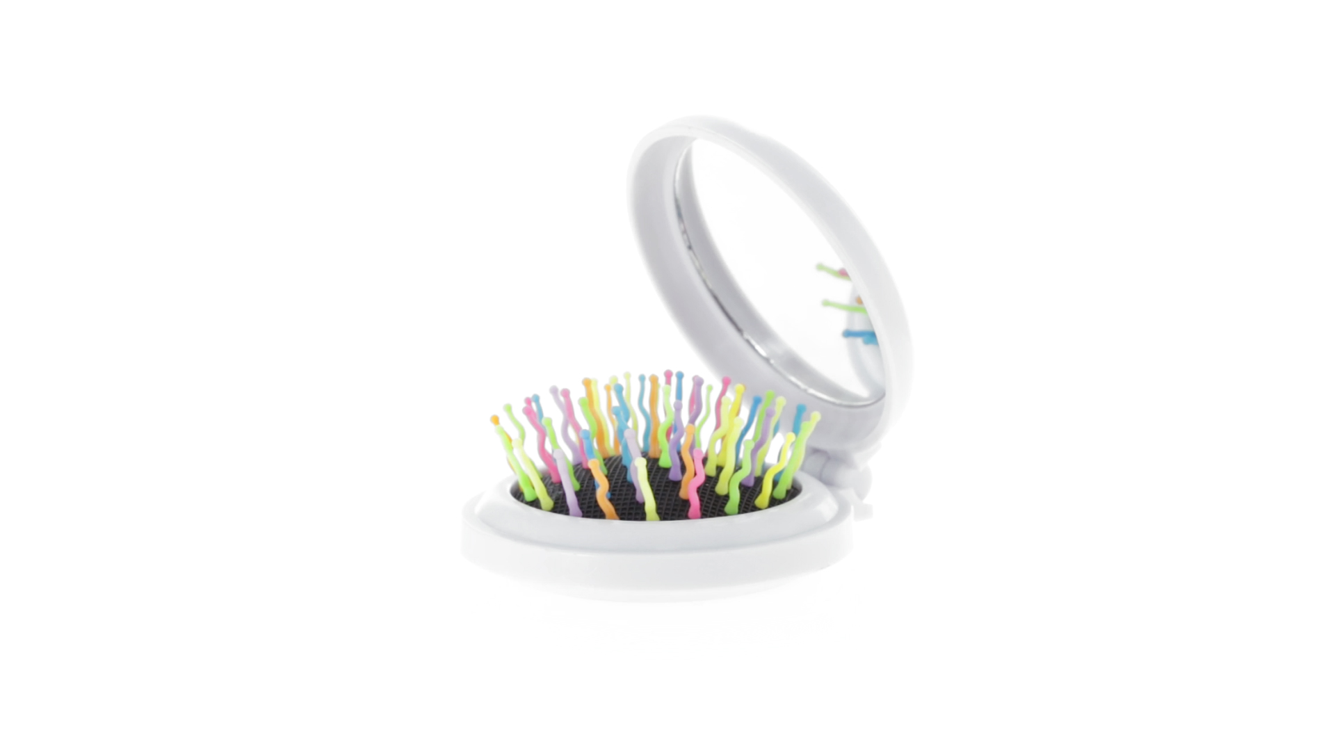 Originelle Klappbürste in Weiss mit bunten Borsten und integriertem Spiegel.