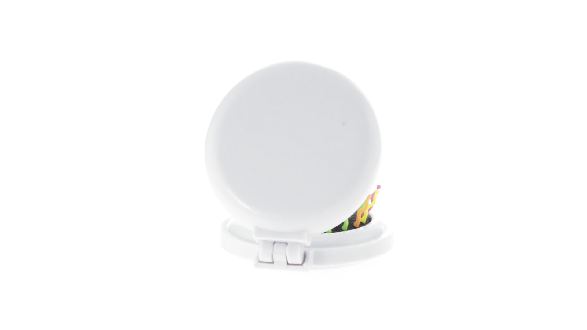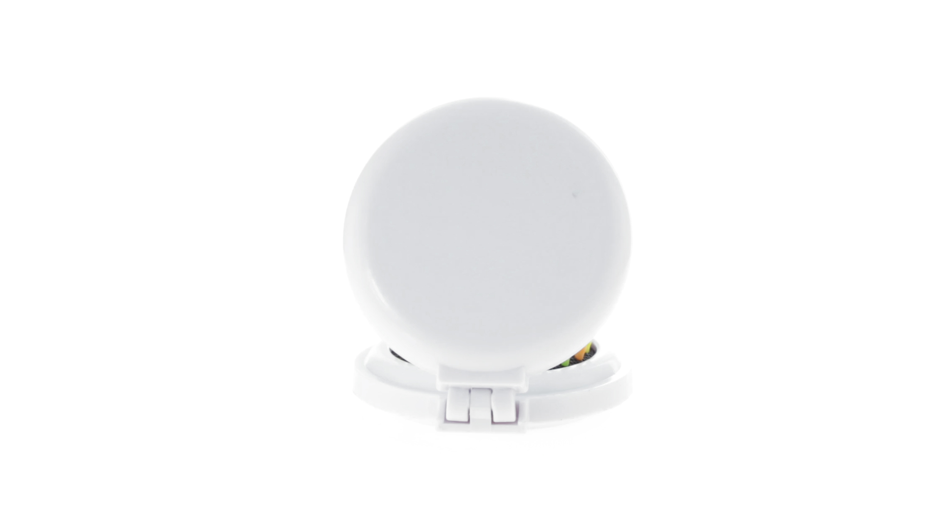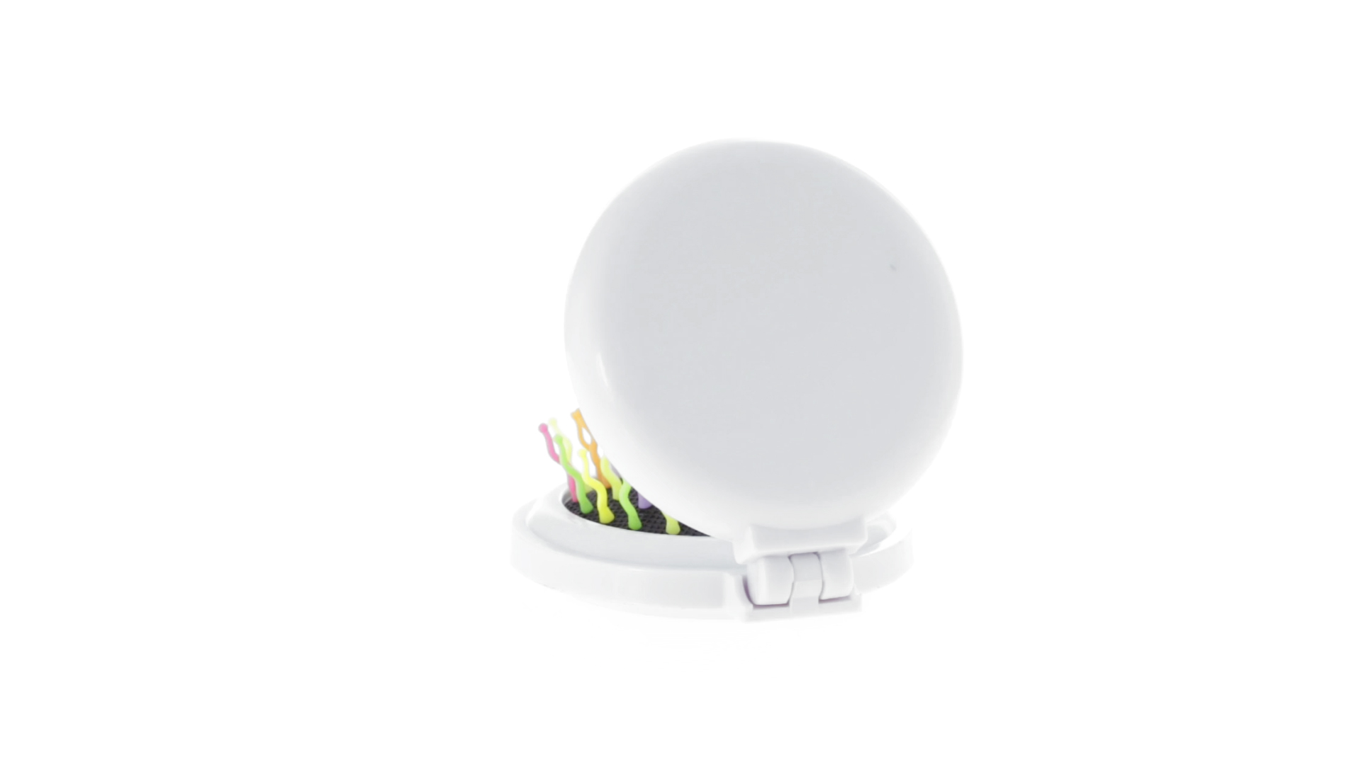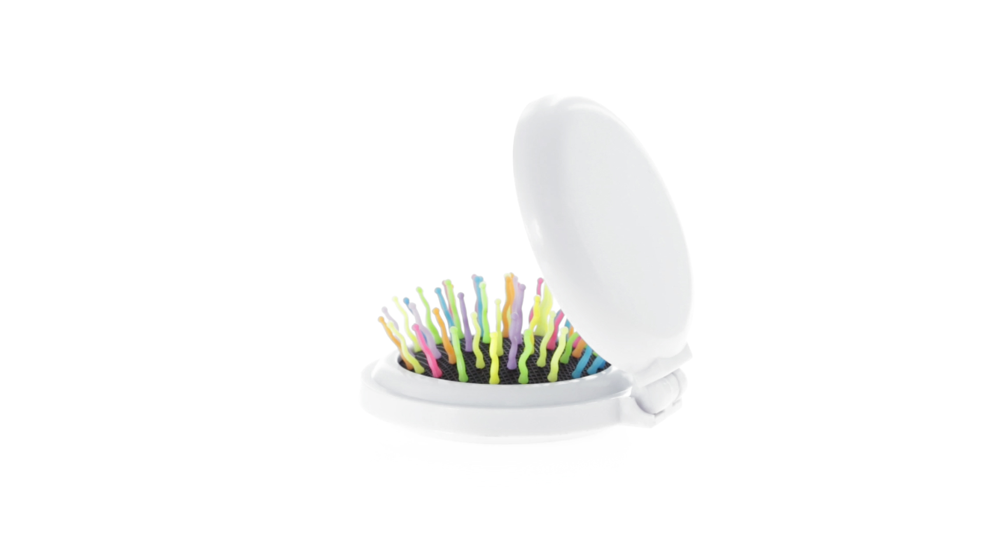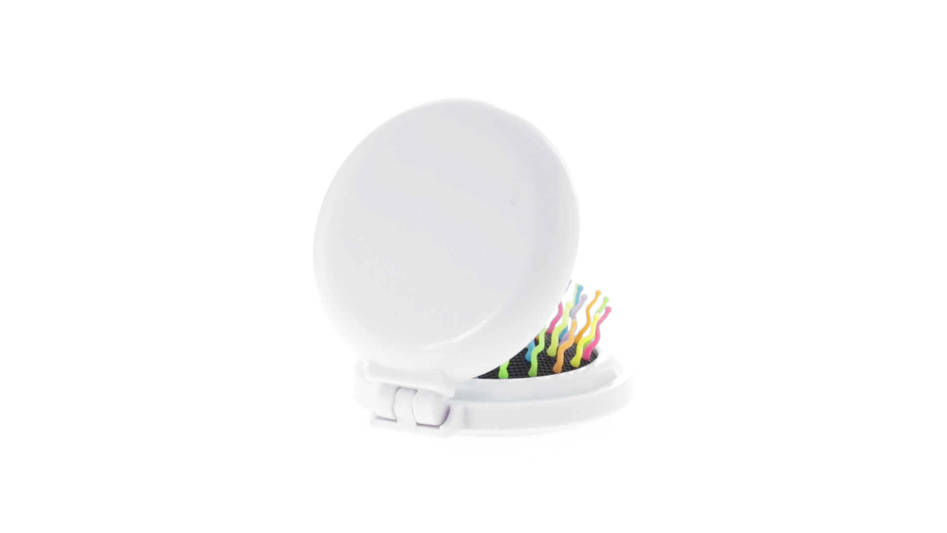 Originelle Klappbürste in Weiss mit bunten Borsten und integriertem Spiegel.