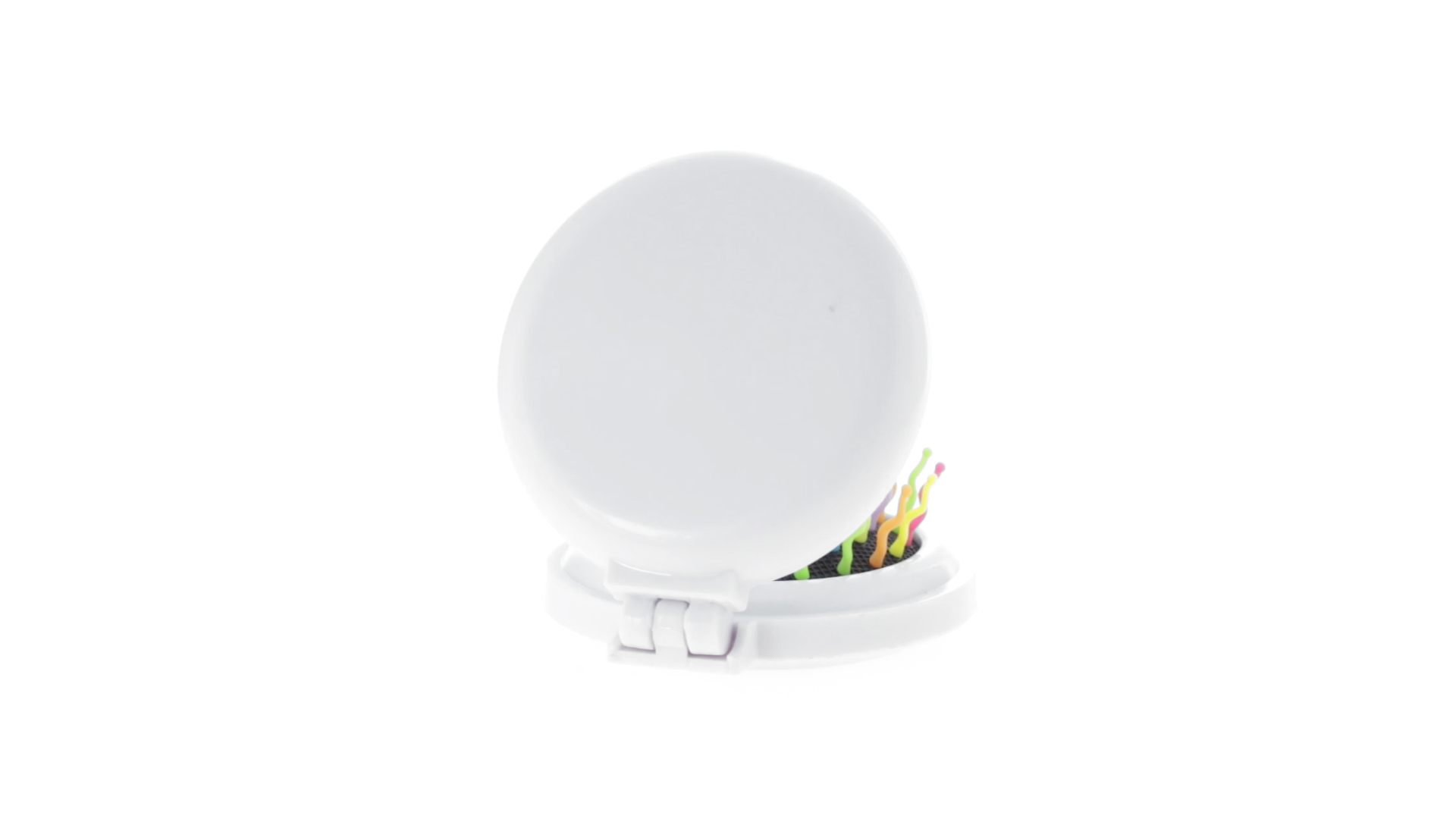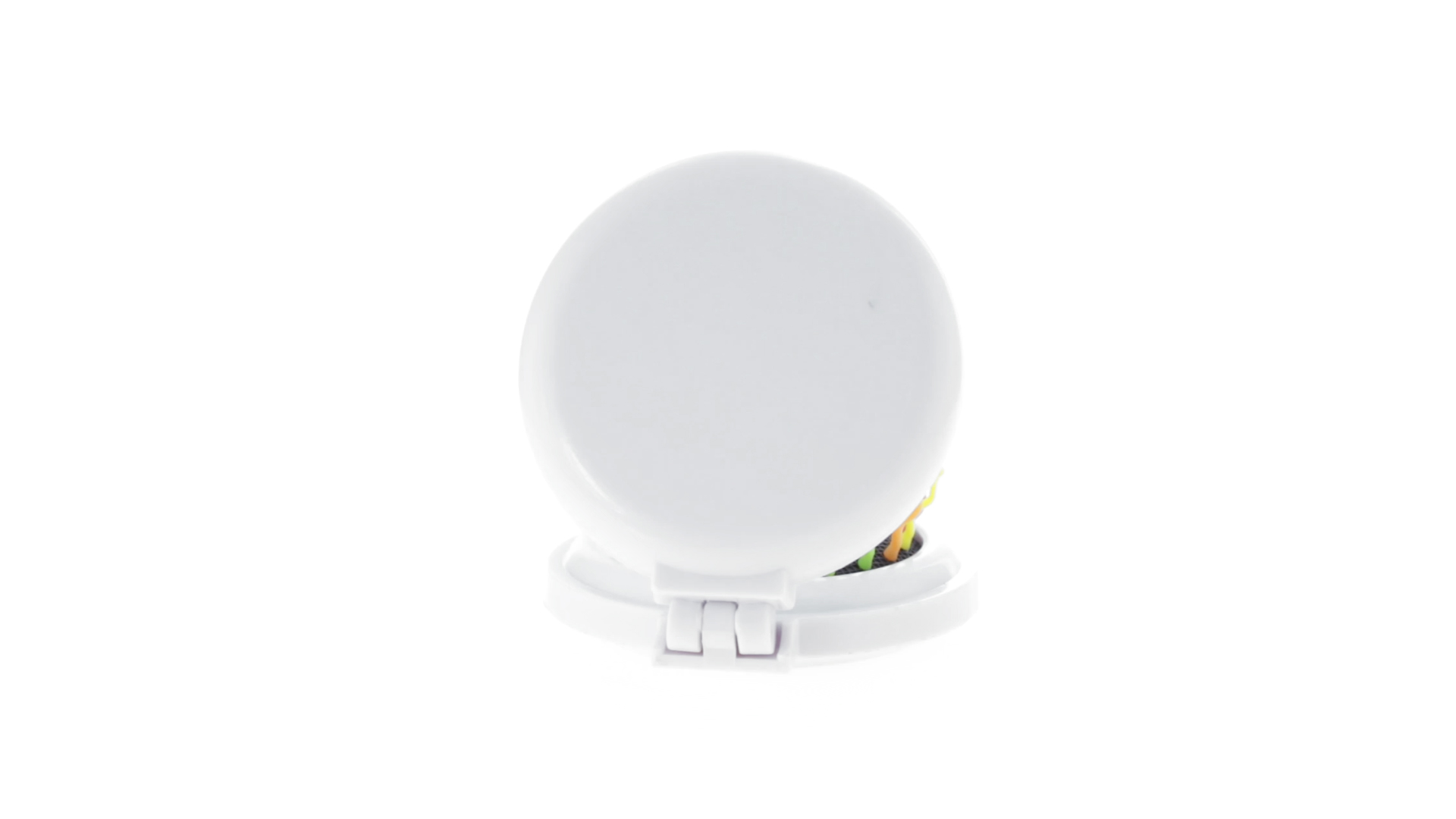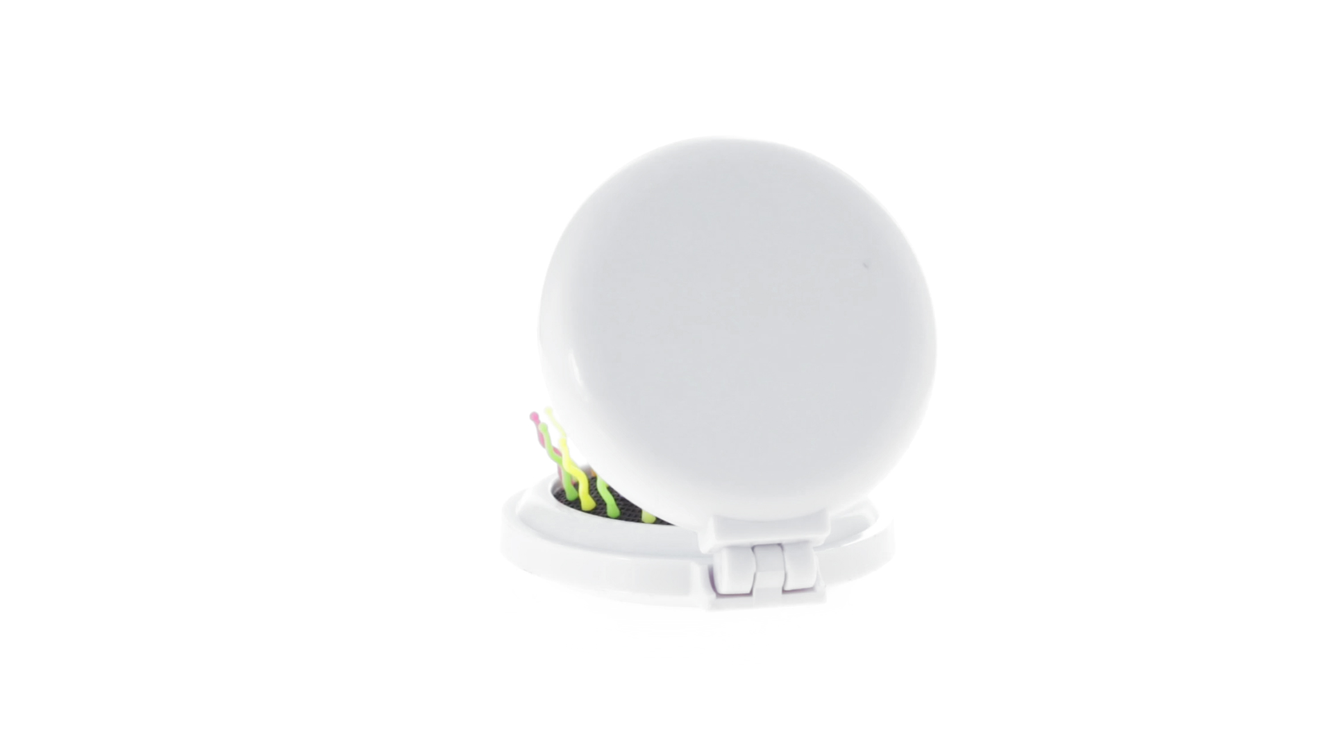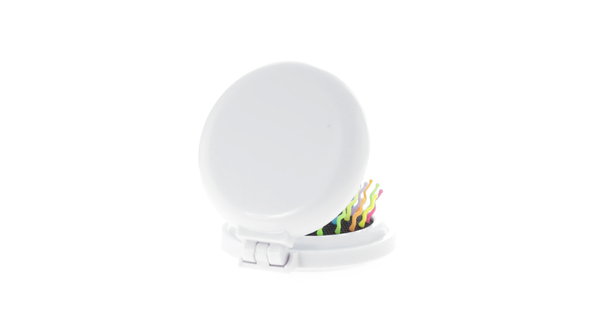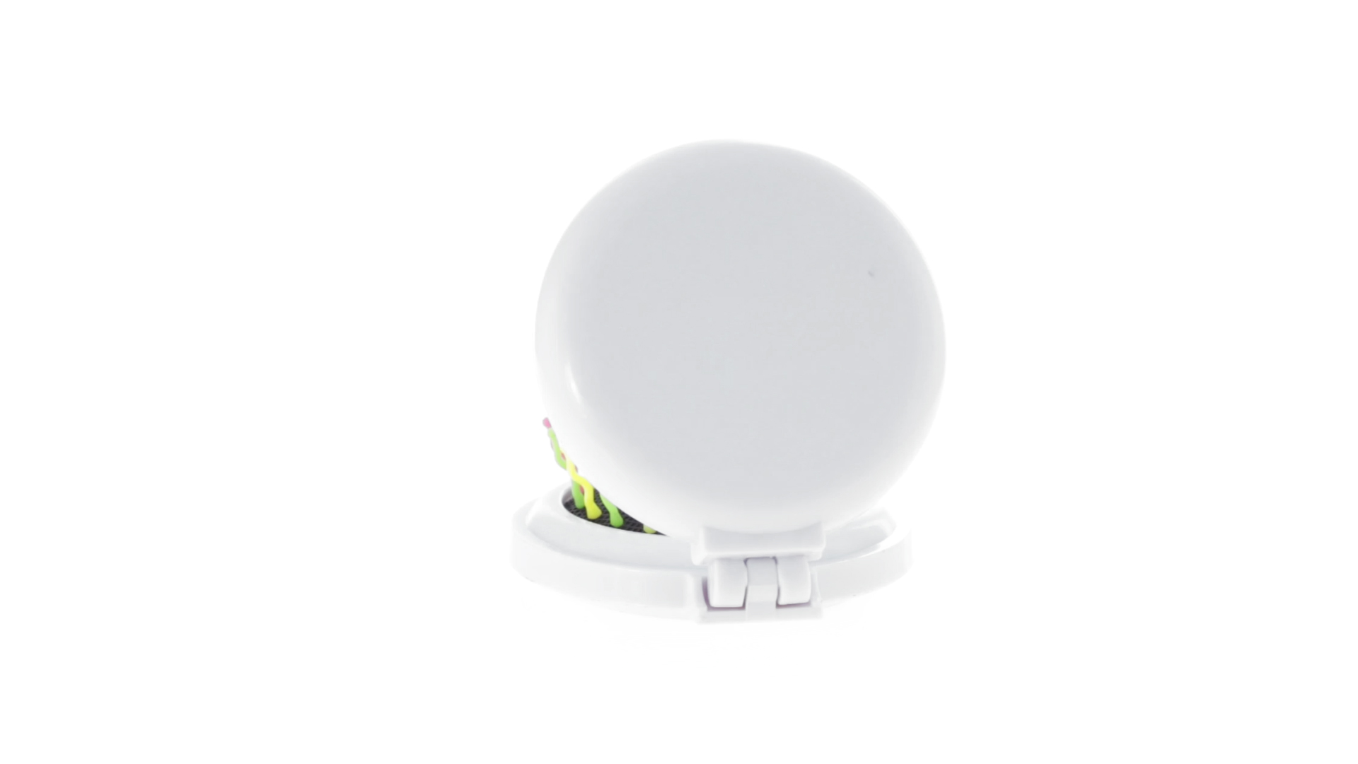 Originelle Klappbürste in Weiss mit bunten Borsten und integriertem Spiegel.