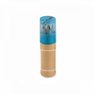 6 Holzbuntstifte in einer runden Kartonschachtel mit einem im Kunstoffdeckel integriertem Anspitzer. ø26 x 106 mm